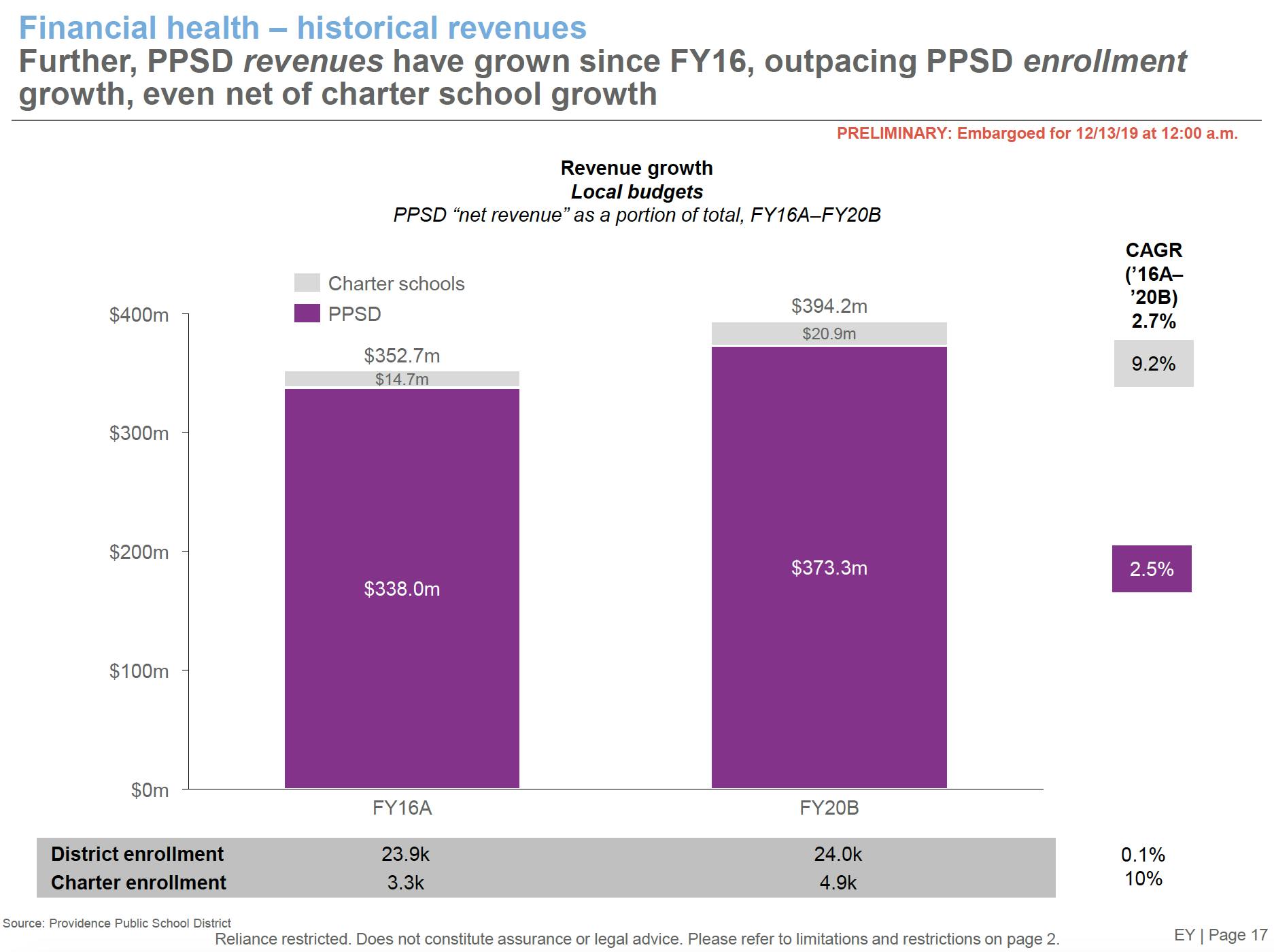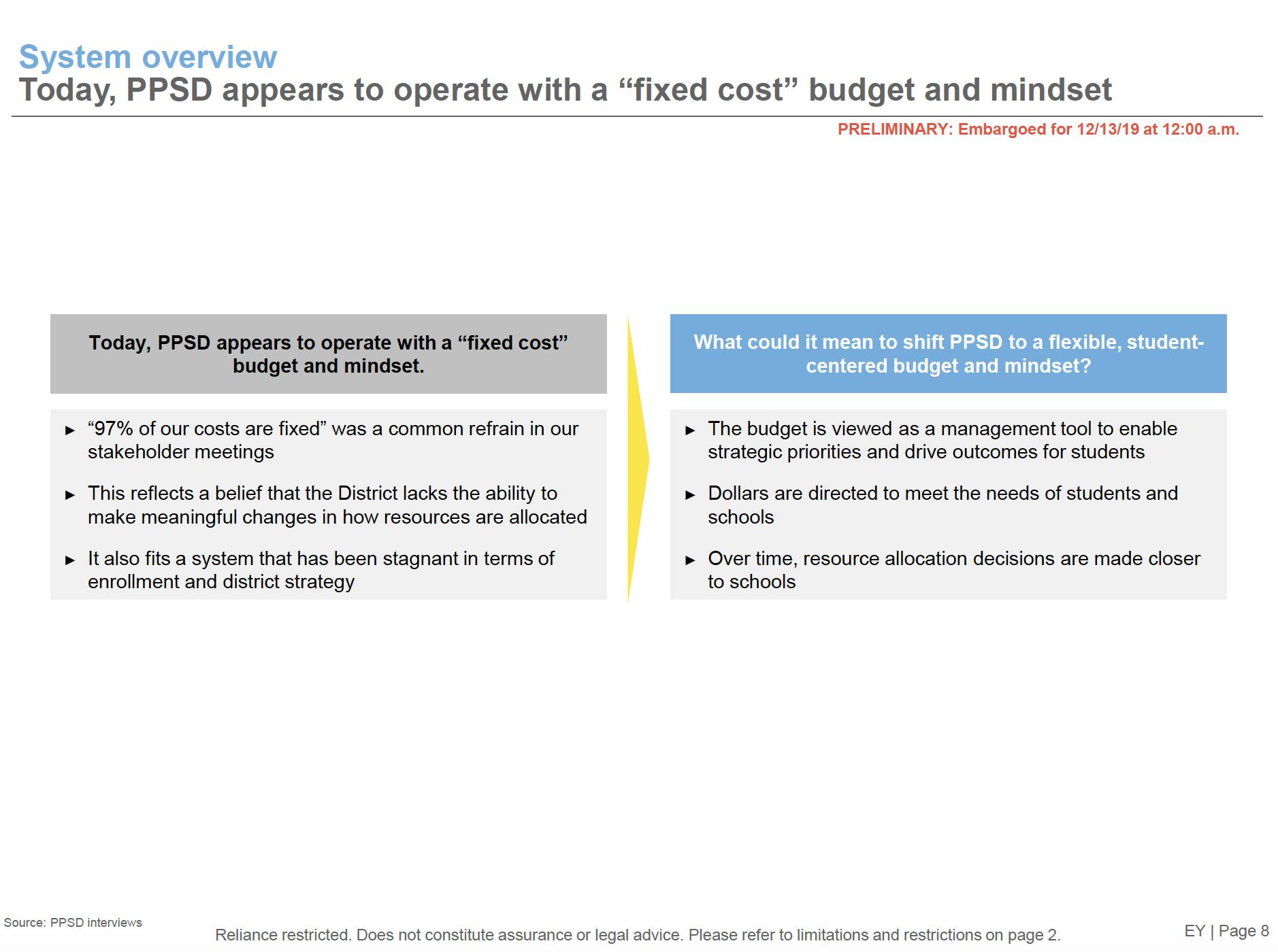 Ernest & Young study cost $295,000An analysis released at 12:00 AM Friday morning by the Rhode Island Department of Education conducted by the national consulting group Ernst and Young (EY) analyzed the Providence School system’s budget and identified that there may be more flexibility in how dollars are deployed than previously identified.