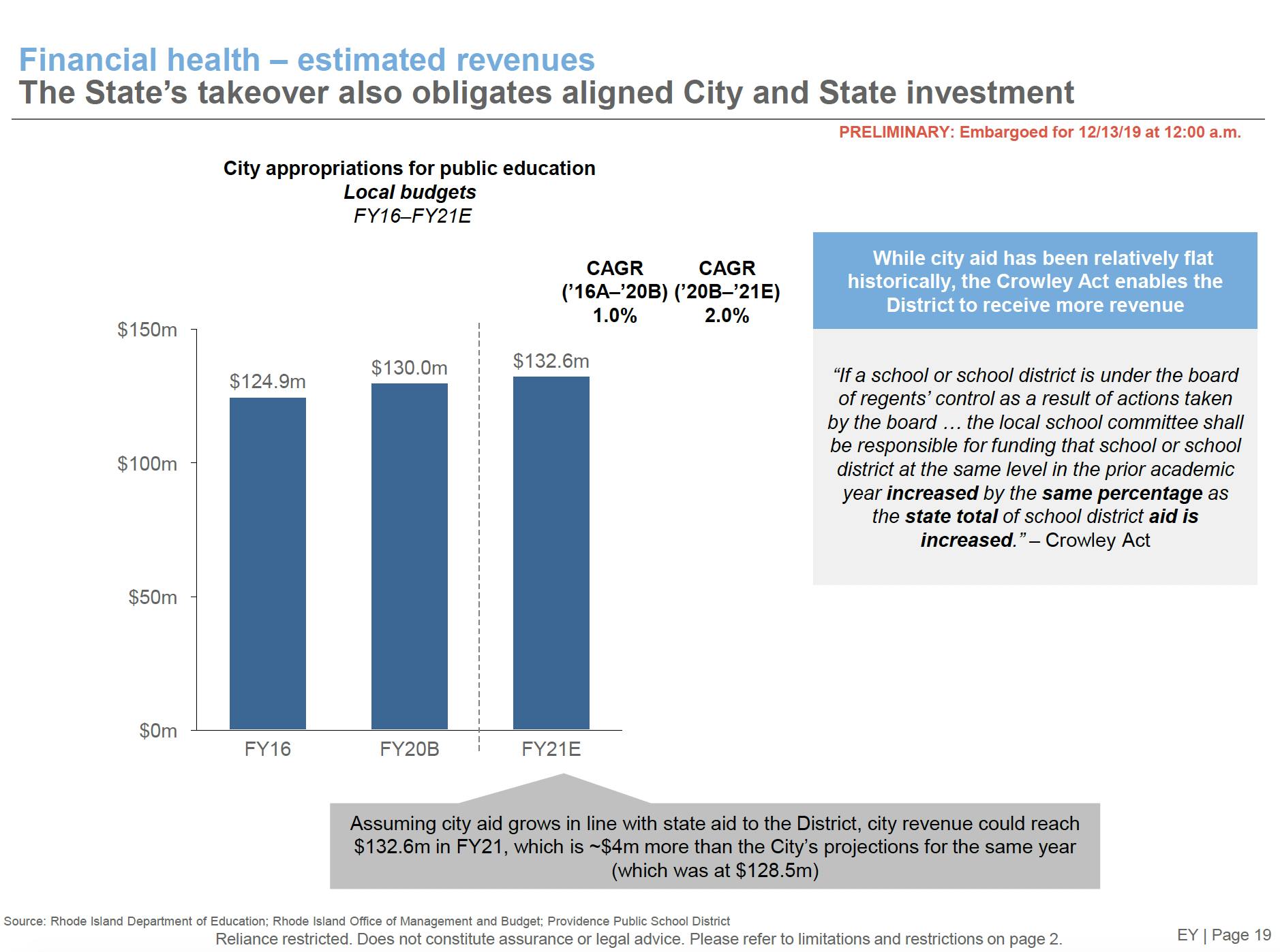 Providence taxpayers are not off the hook. The study reminds Providence decision-makers while city aid has been relatively flat historically, the Crowley Act enables the District to receive more revenue.