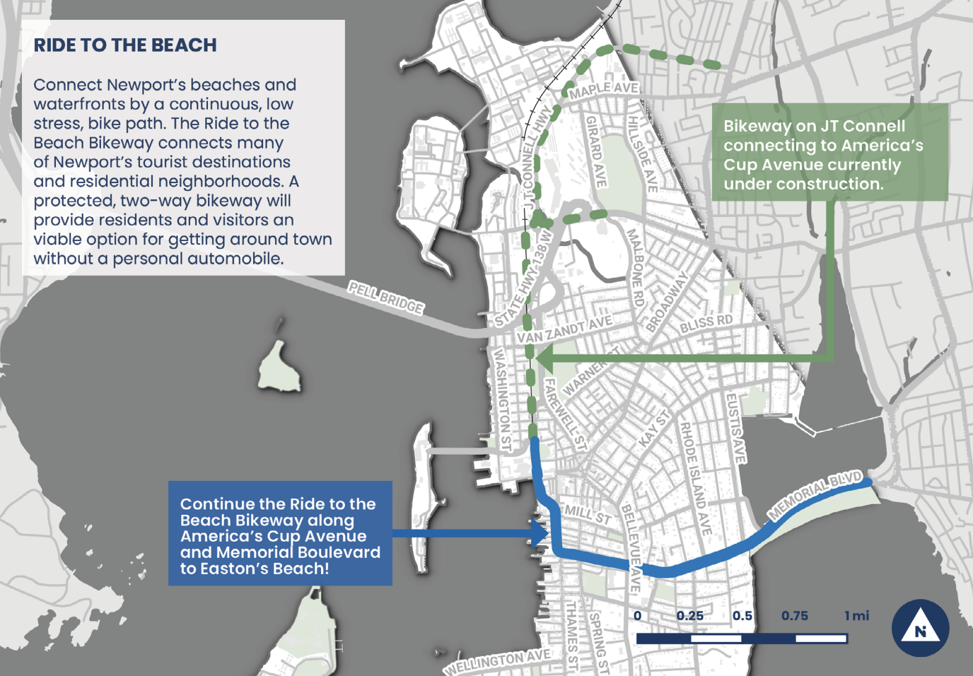 The rationale for the proposal, which will now be considered by the Newport City Council for approval, is to replace the vehicle lanes with a bike lane winding through downtown Newport to First (Easton’s) Beach.