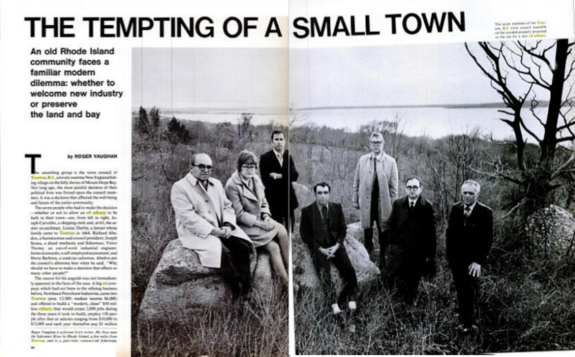 “To the Council, the Northeast (Oil Refinery) proposal sounded enticing — as it indeed did to the people of Tiverton when they went to their mail boxes last August and found a 24-page four-color brochure from Northeast describing the benefits of a refinery,” wrote Life reporter Roger Vaughn in the July 30, 1971 issue.