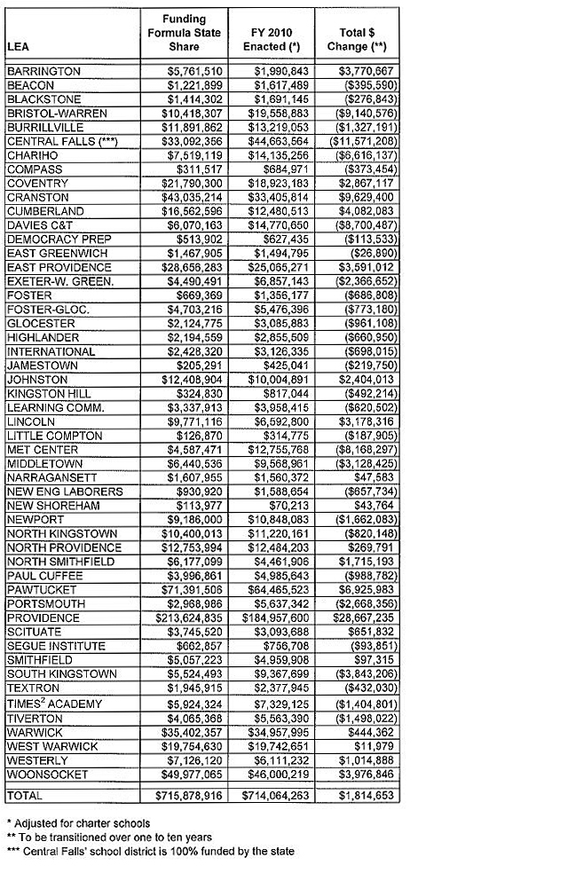 The column on the left shows the total amount the districts will get from the state—that will be phased in over five to ten years. The middle column lists the amounts of aid they have this year. The column on the right is the difference between current and proposed funding. Numbers with a parenthesis are cuts in funding.