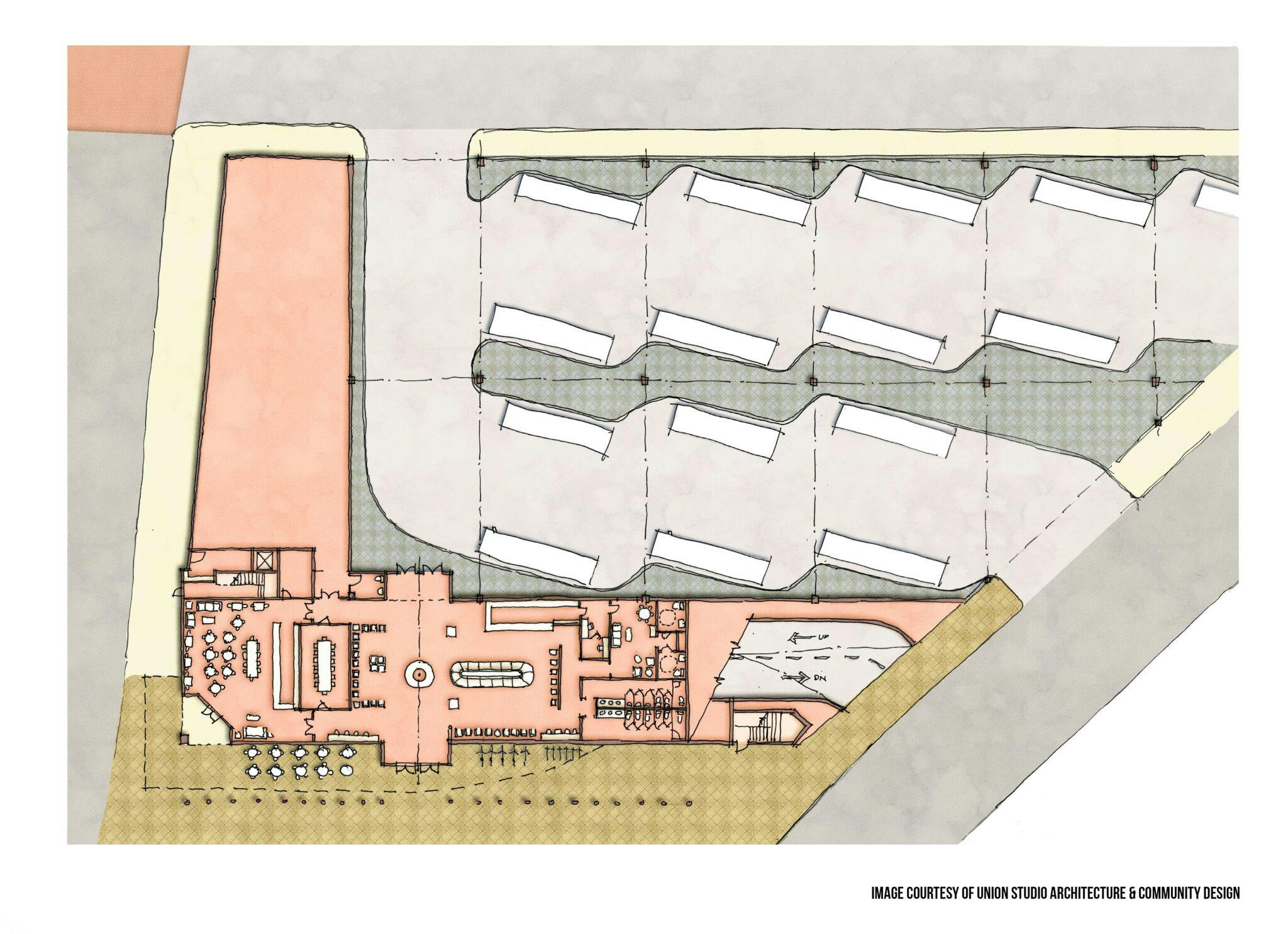 The new plan shifts much of the activity to be located near another new city hotel - the Aloft.