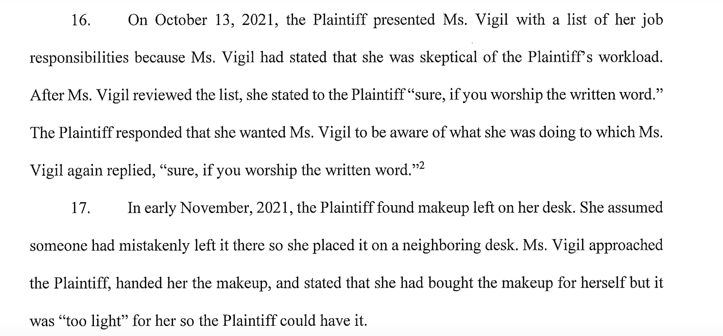 Moran alleges she was told by Chief Executive Officer Karla Vigil that she was denied an expected raise because “identity is an important part of money decisions and compensation” — and was told during a meeting that Moran was “using a low-inference observation due to her very white lens.”