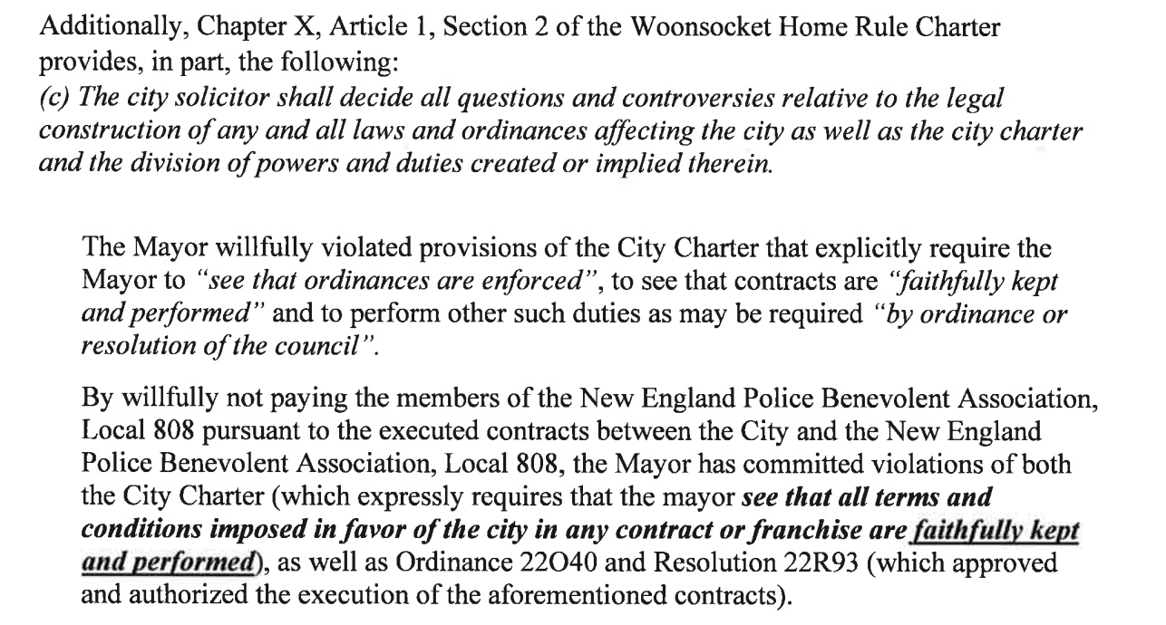 "As the complaint will require the city council to hold a hearing in order for the mayor to present any defense, I should tell you that though I am certainly familiar with each matter included in the complaint I should not pass judgment until the conclusion of any hearing," City Council Vice President John Ward told GoLocal. "The complaint speaks for itself rather well when combined with the exhibits provided."