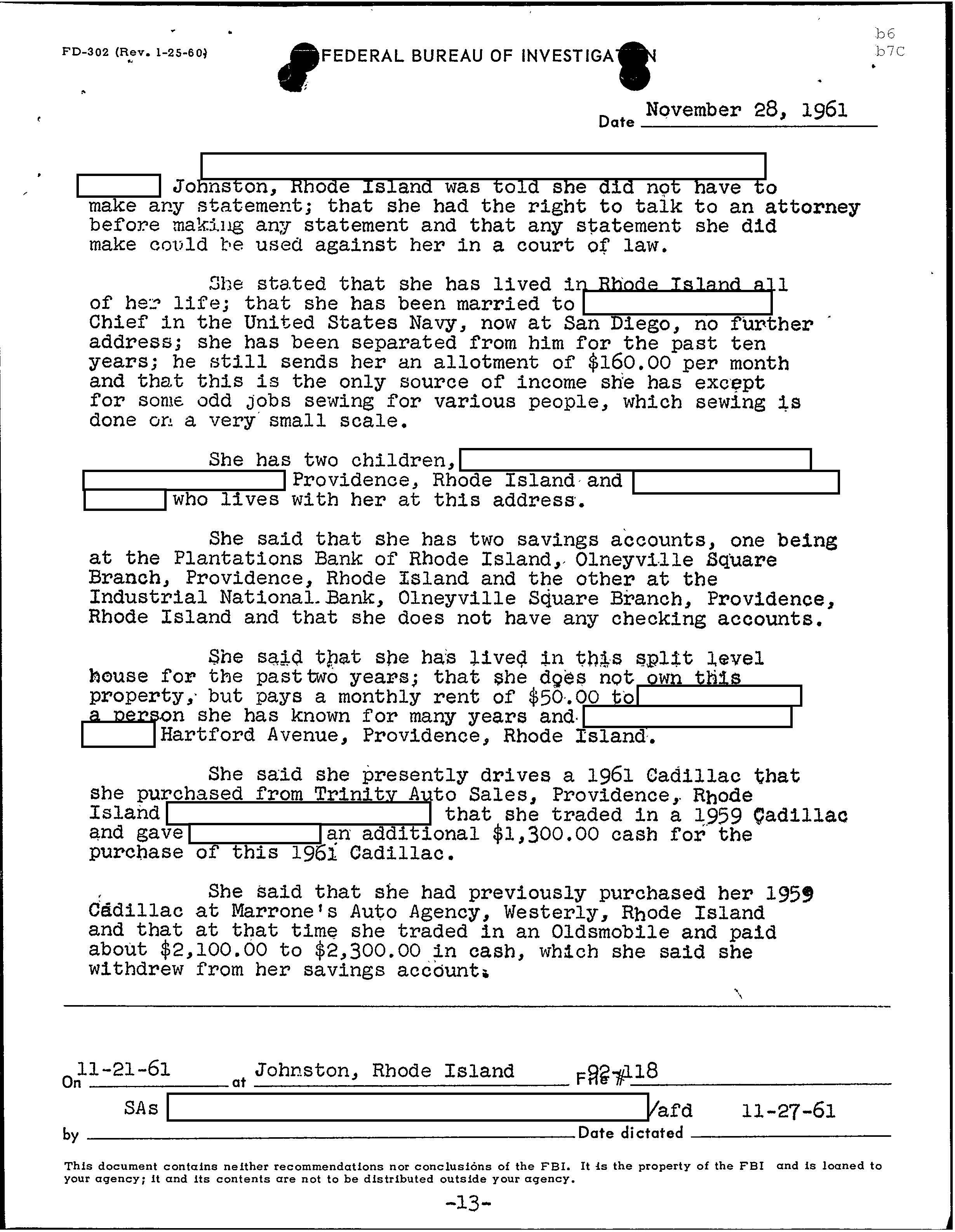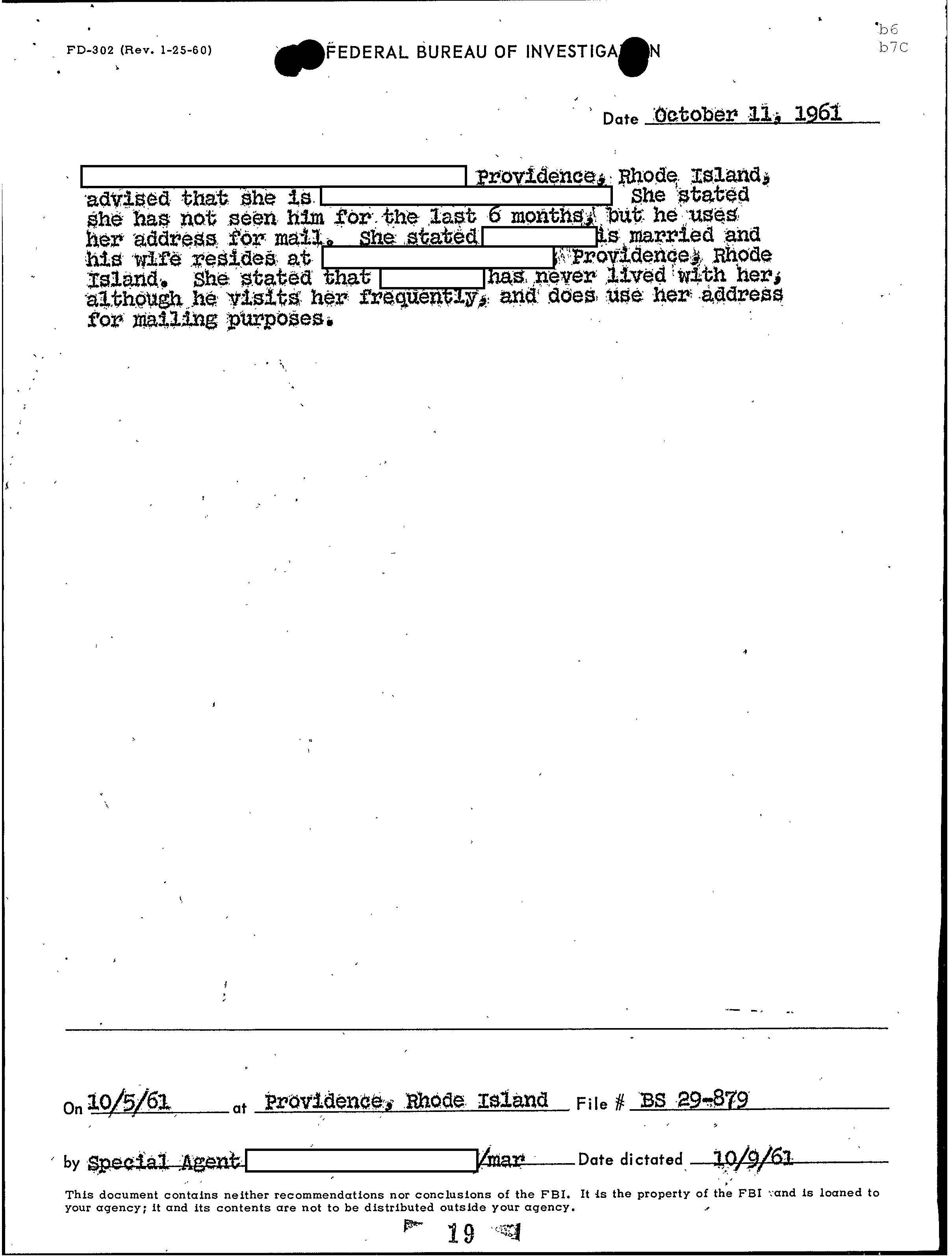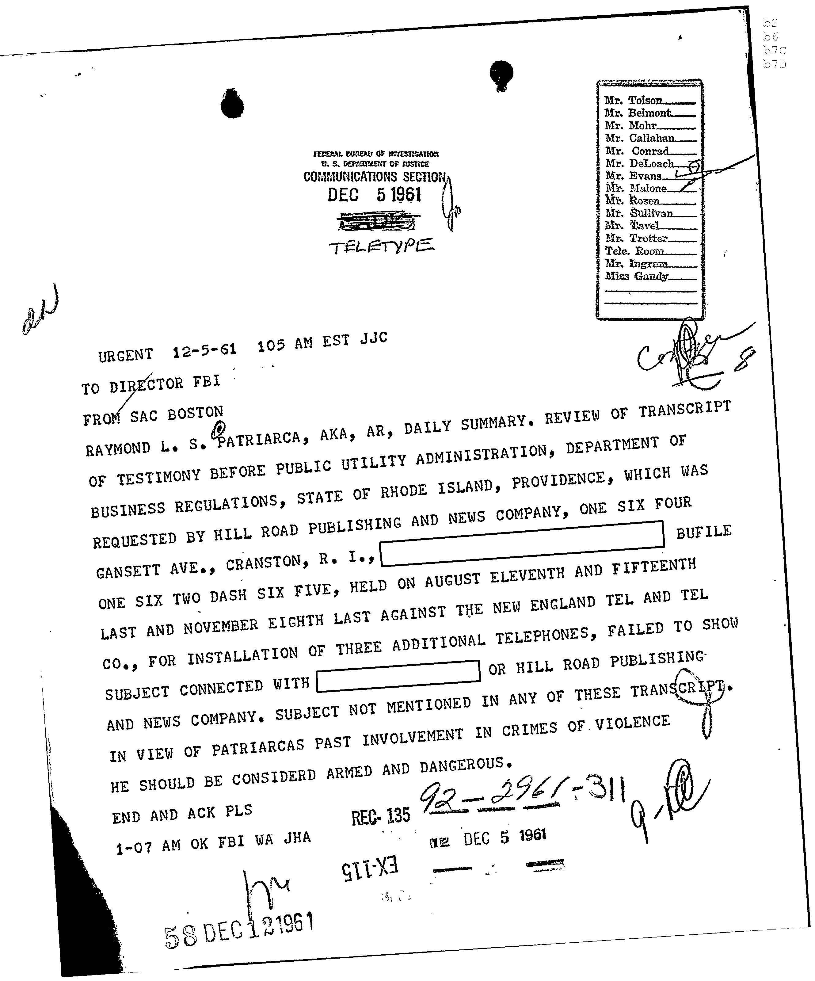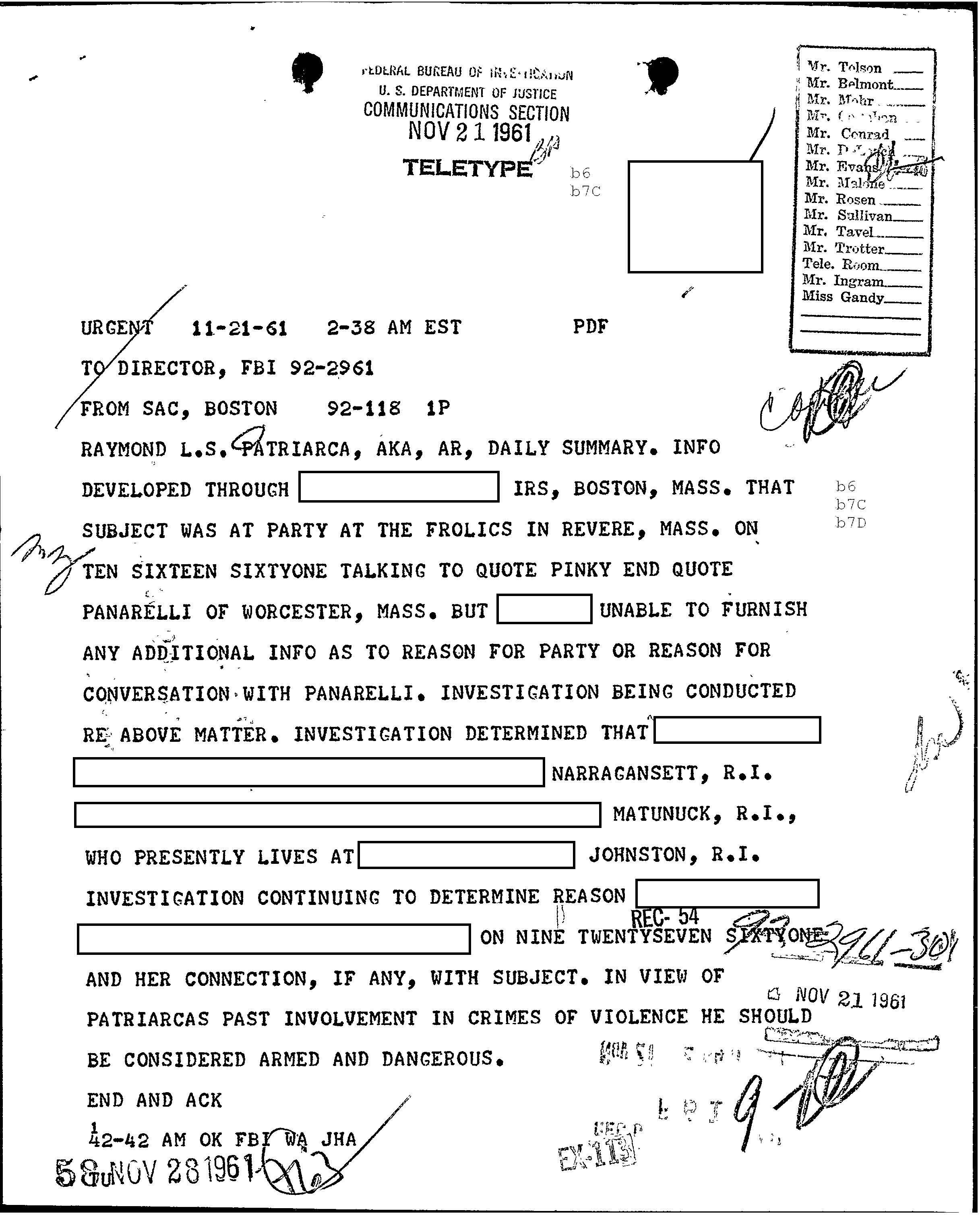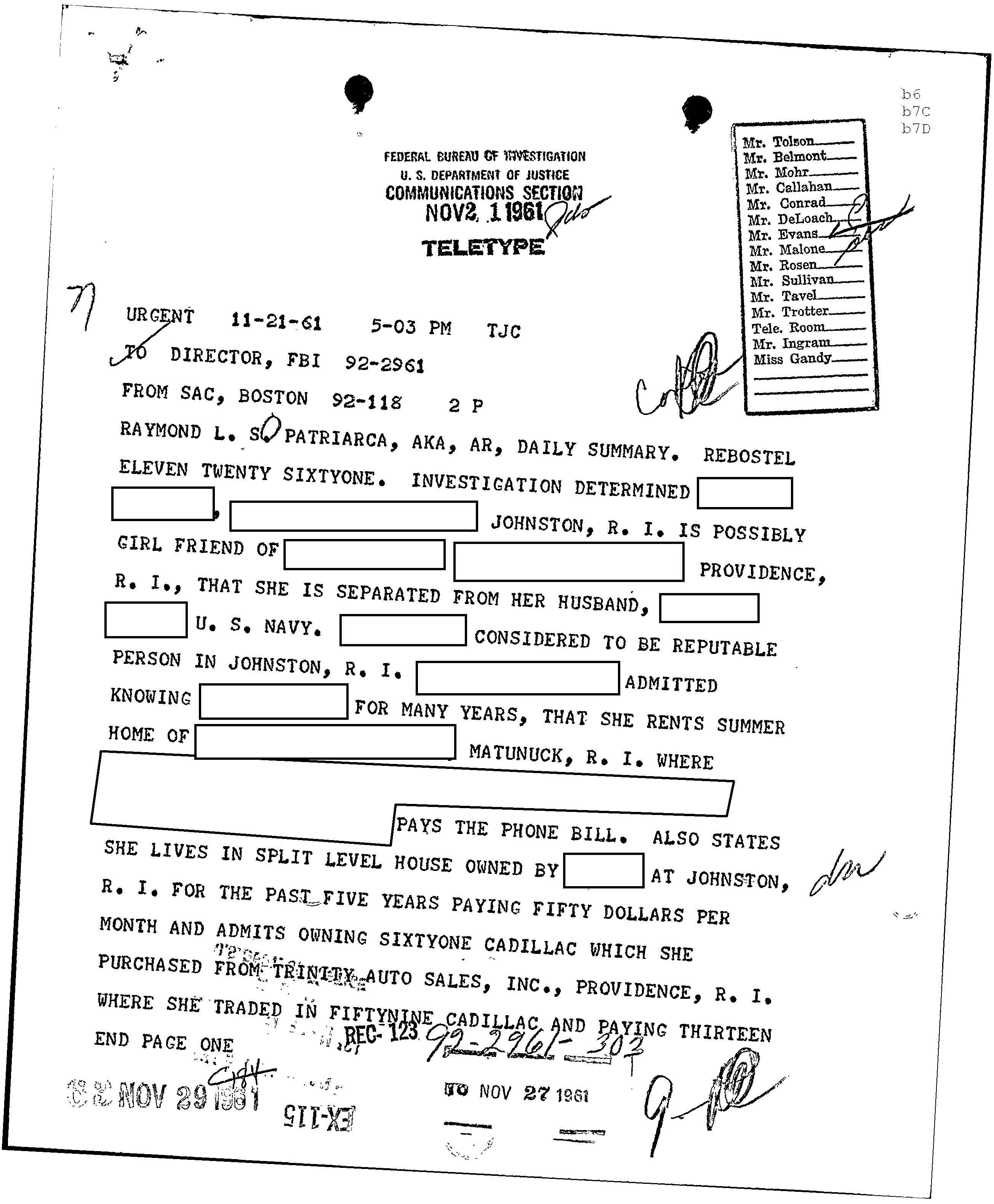 An FBI Teletype outlines that Patriarca’s girlfriend is separated from her husband and she is living in Johnston, RI.