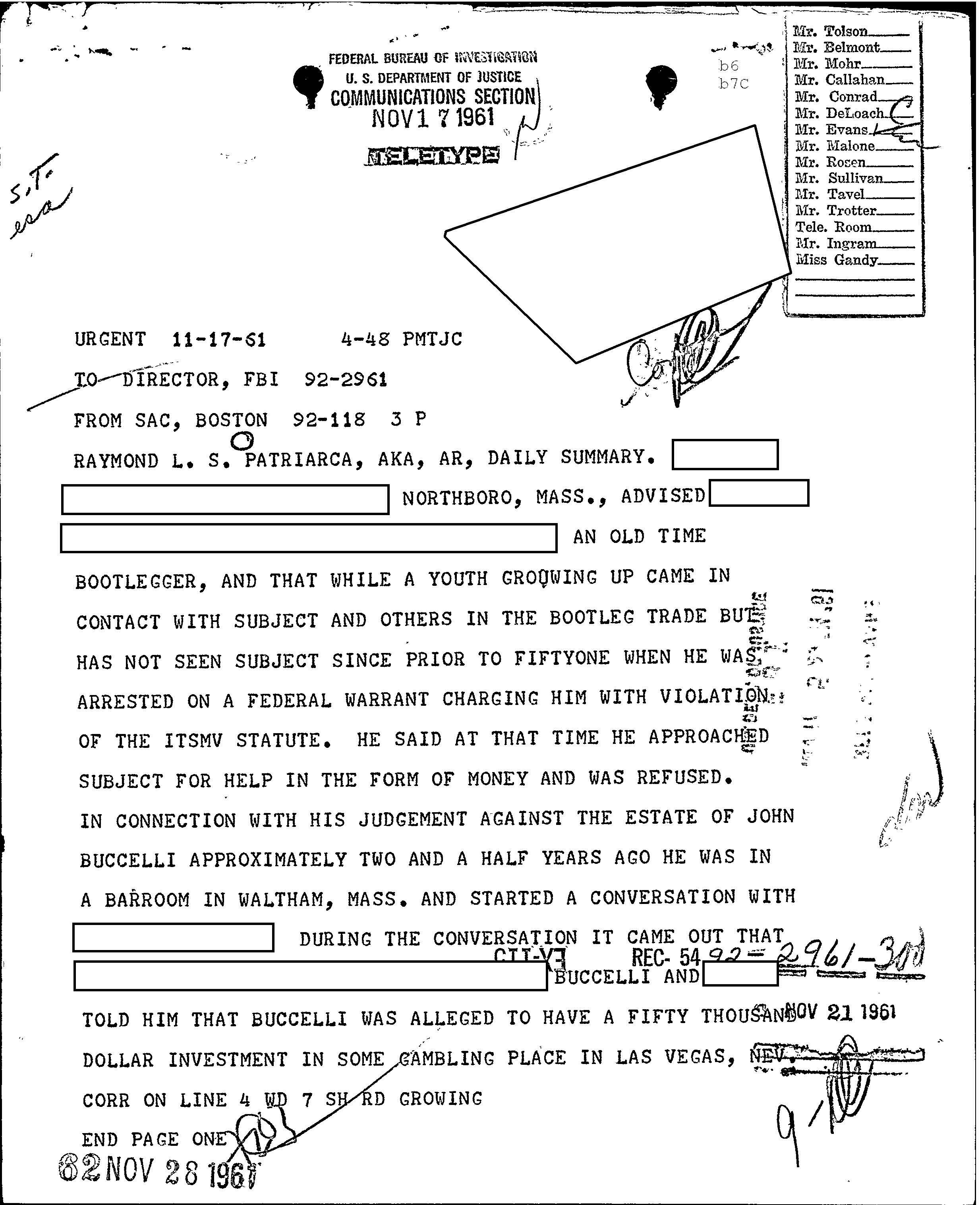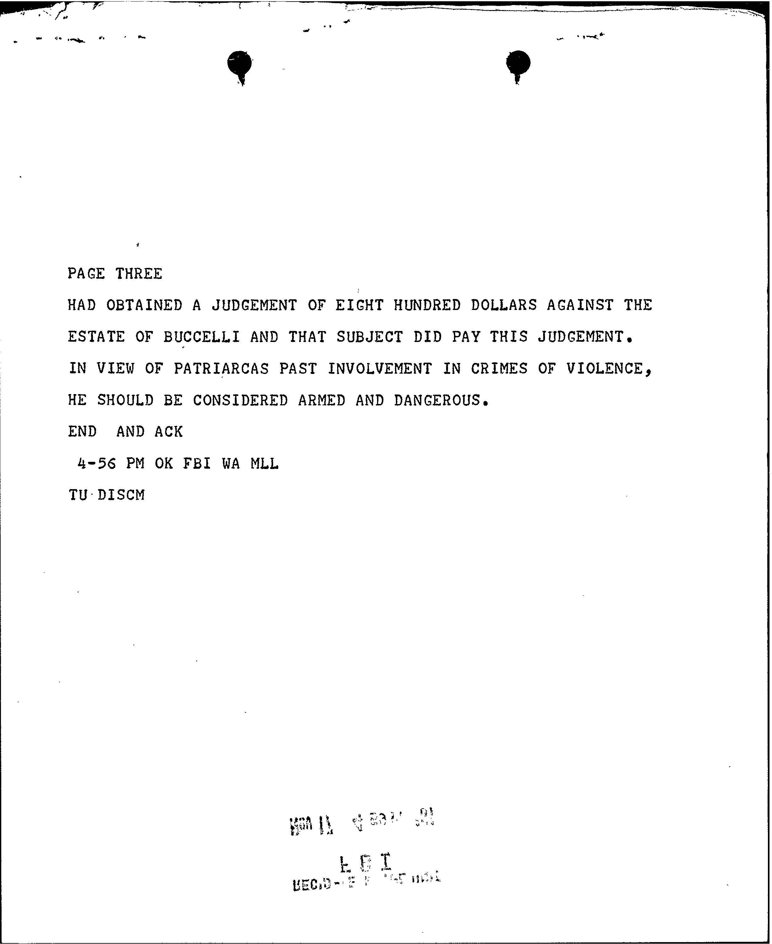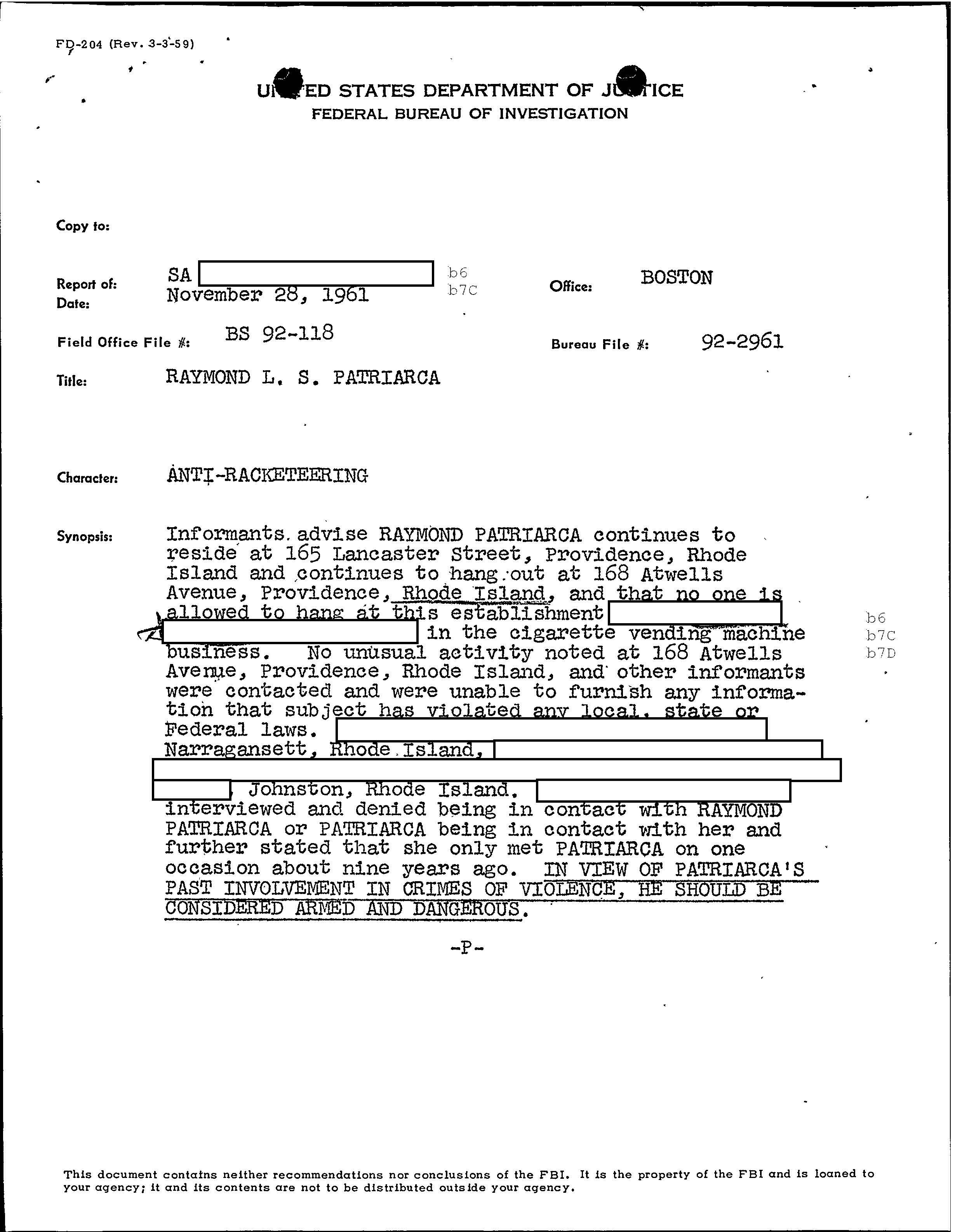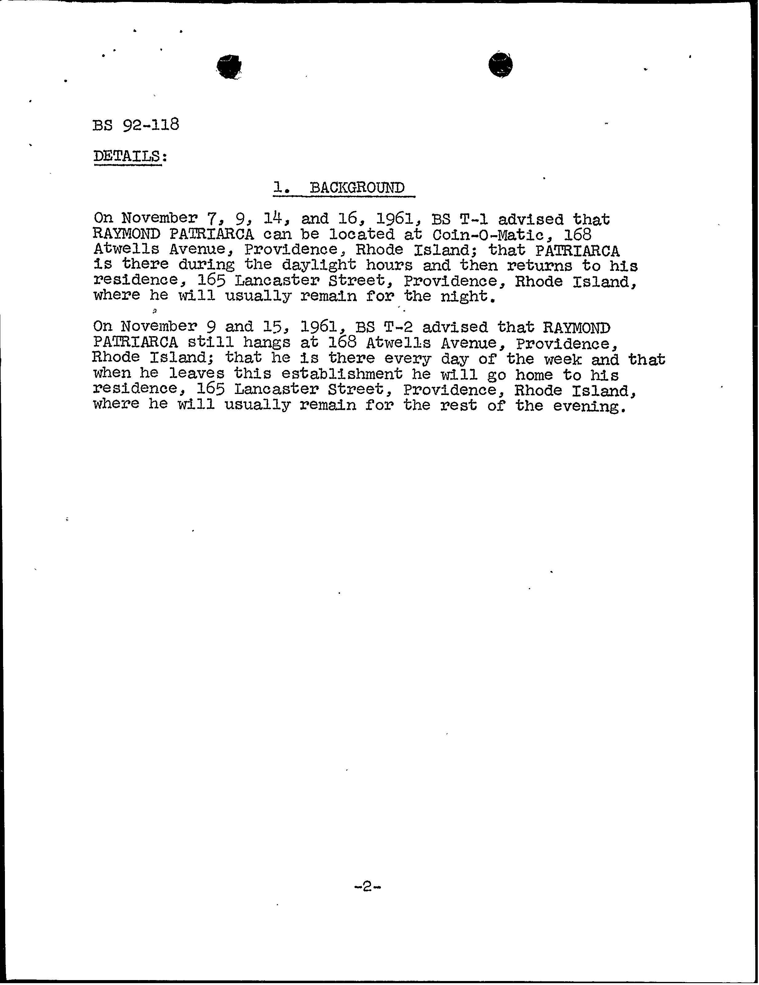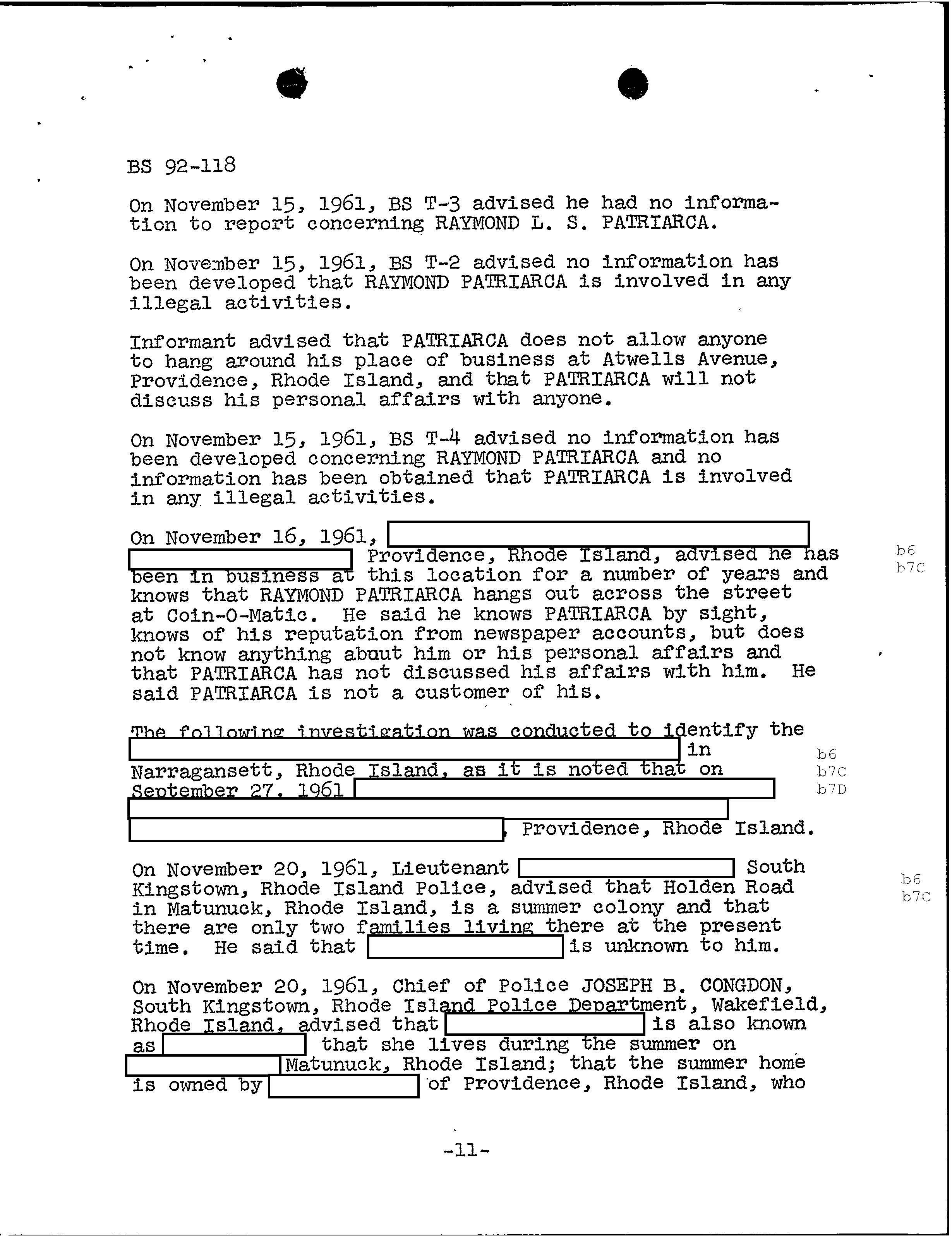An FBI Teletype outlines that Patriarca’s girlfriend is separated from her husband and she is living in Johnston, RI.