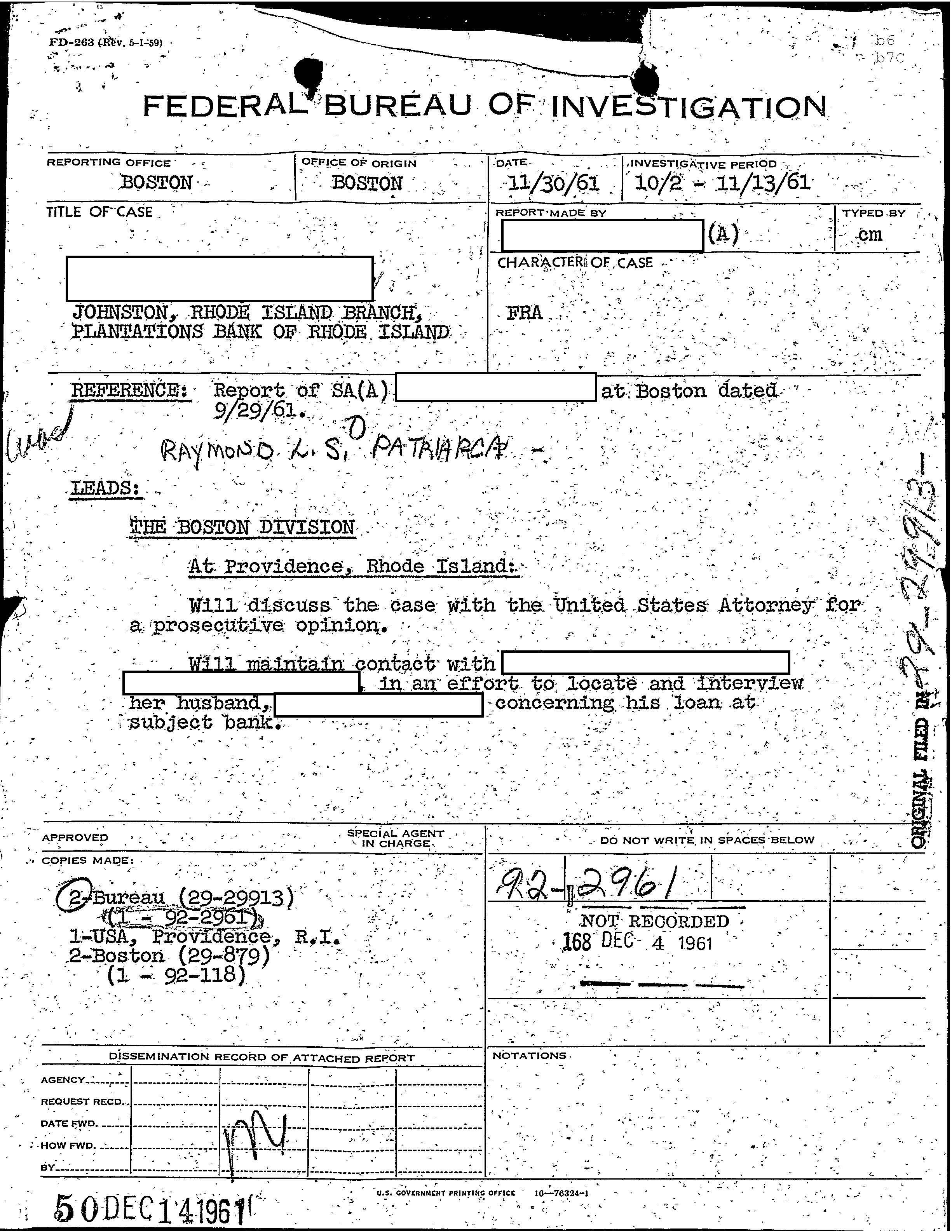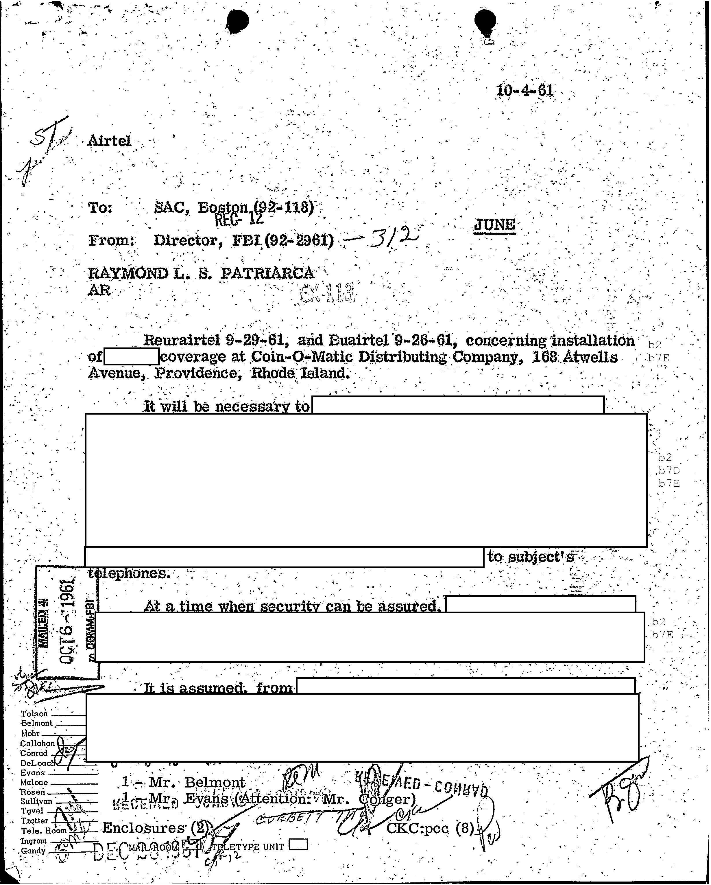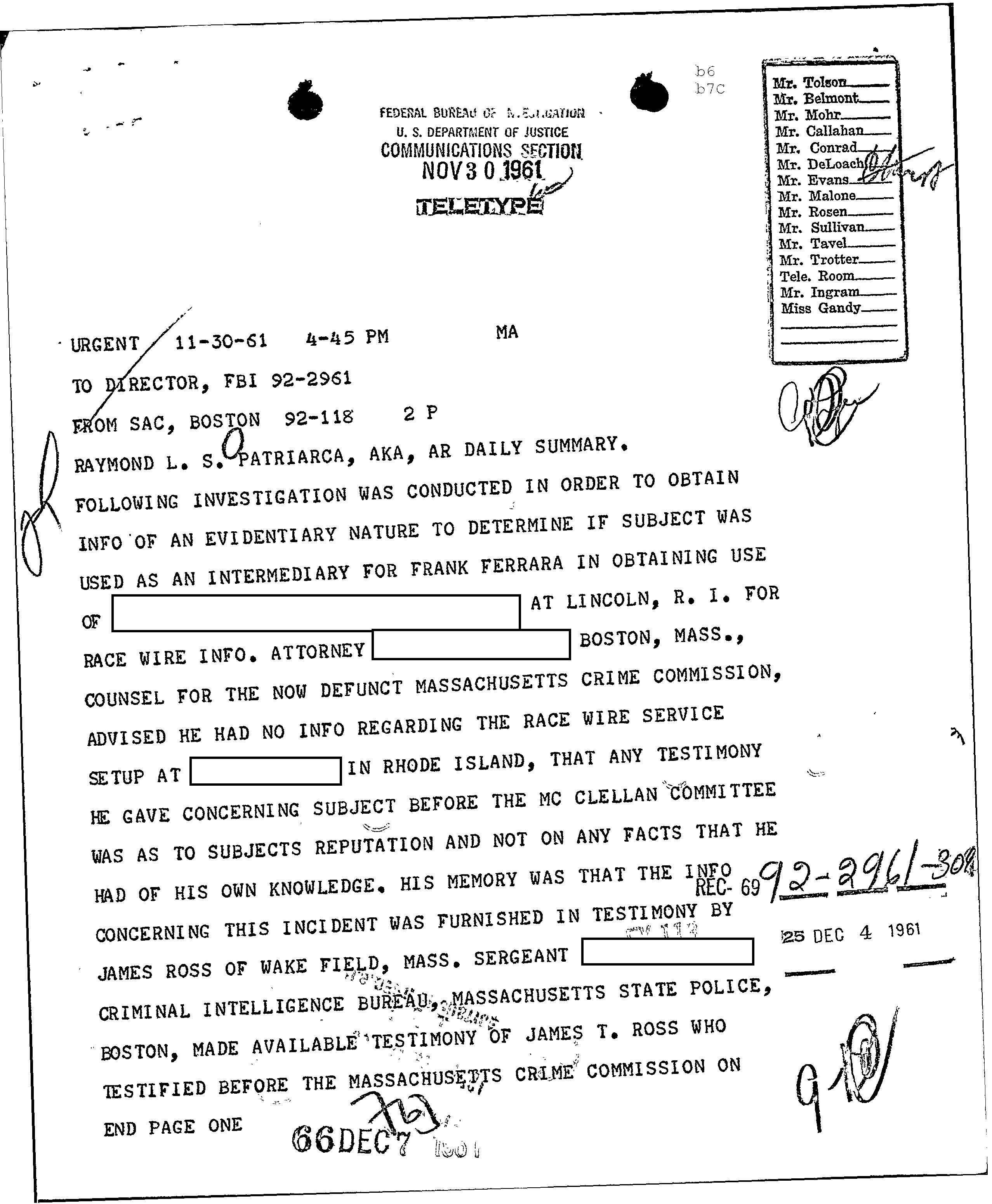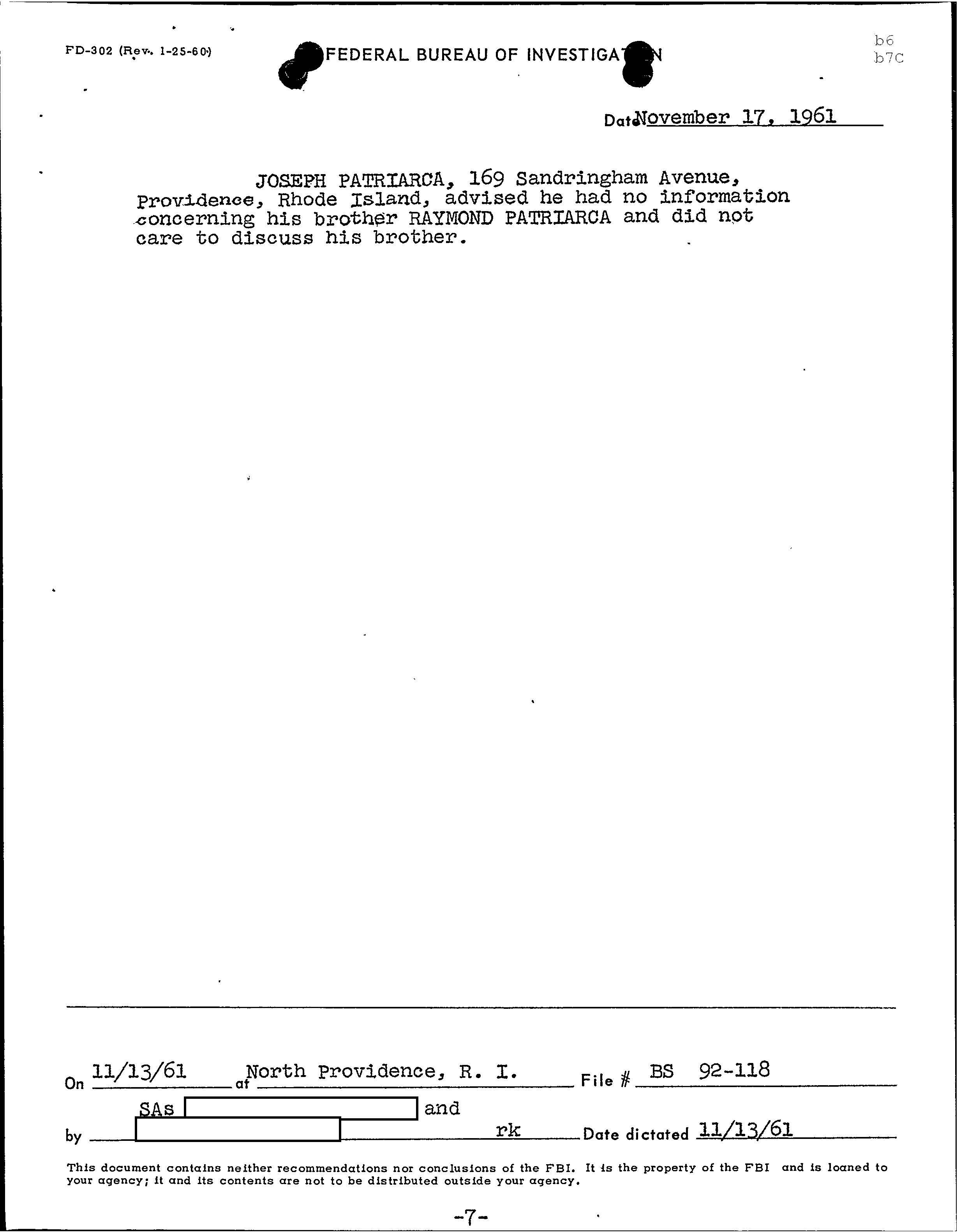 An FBI Teletype outlines that Patriarca’s girlfriend is separated from her husband and she is living in Johnston, RI.