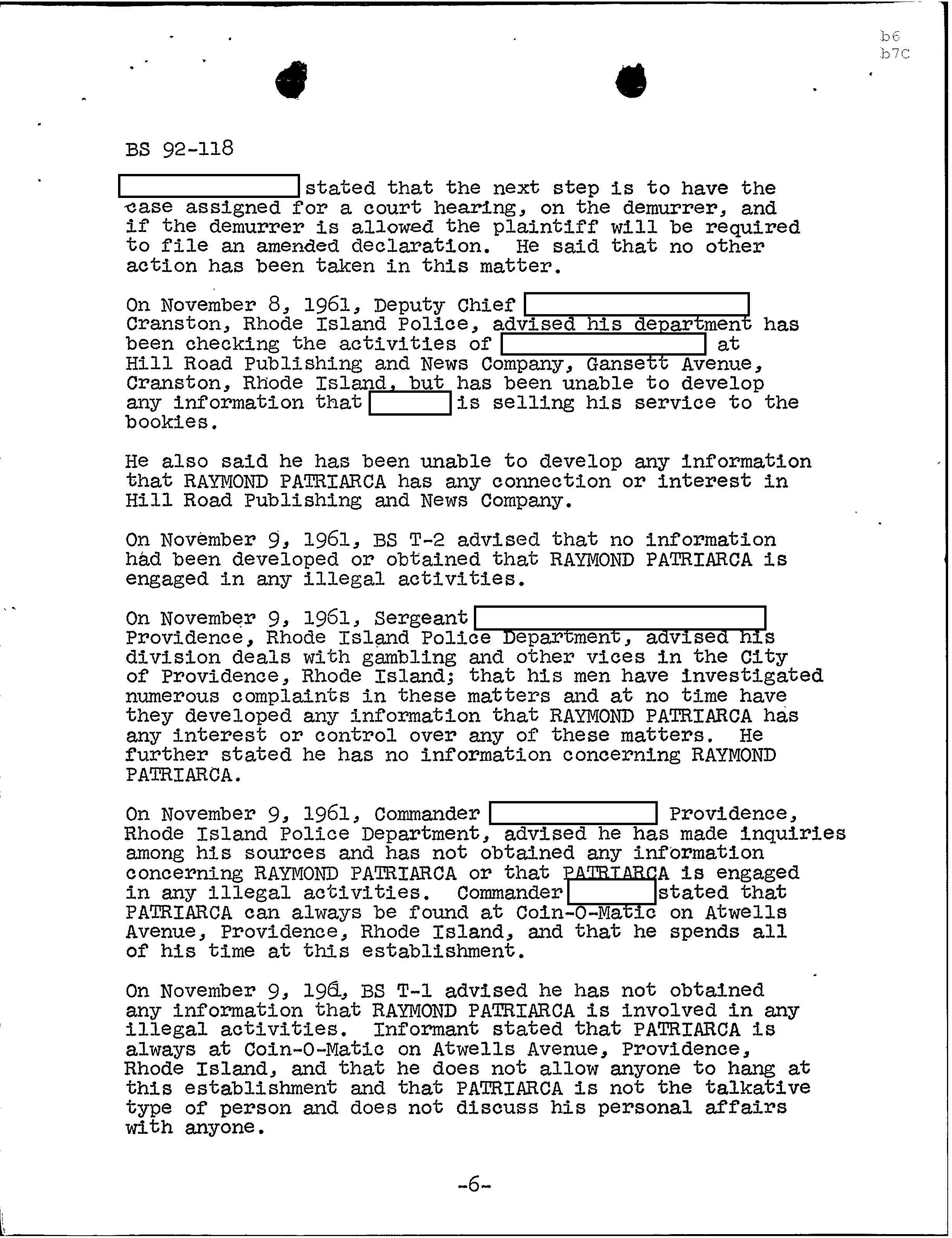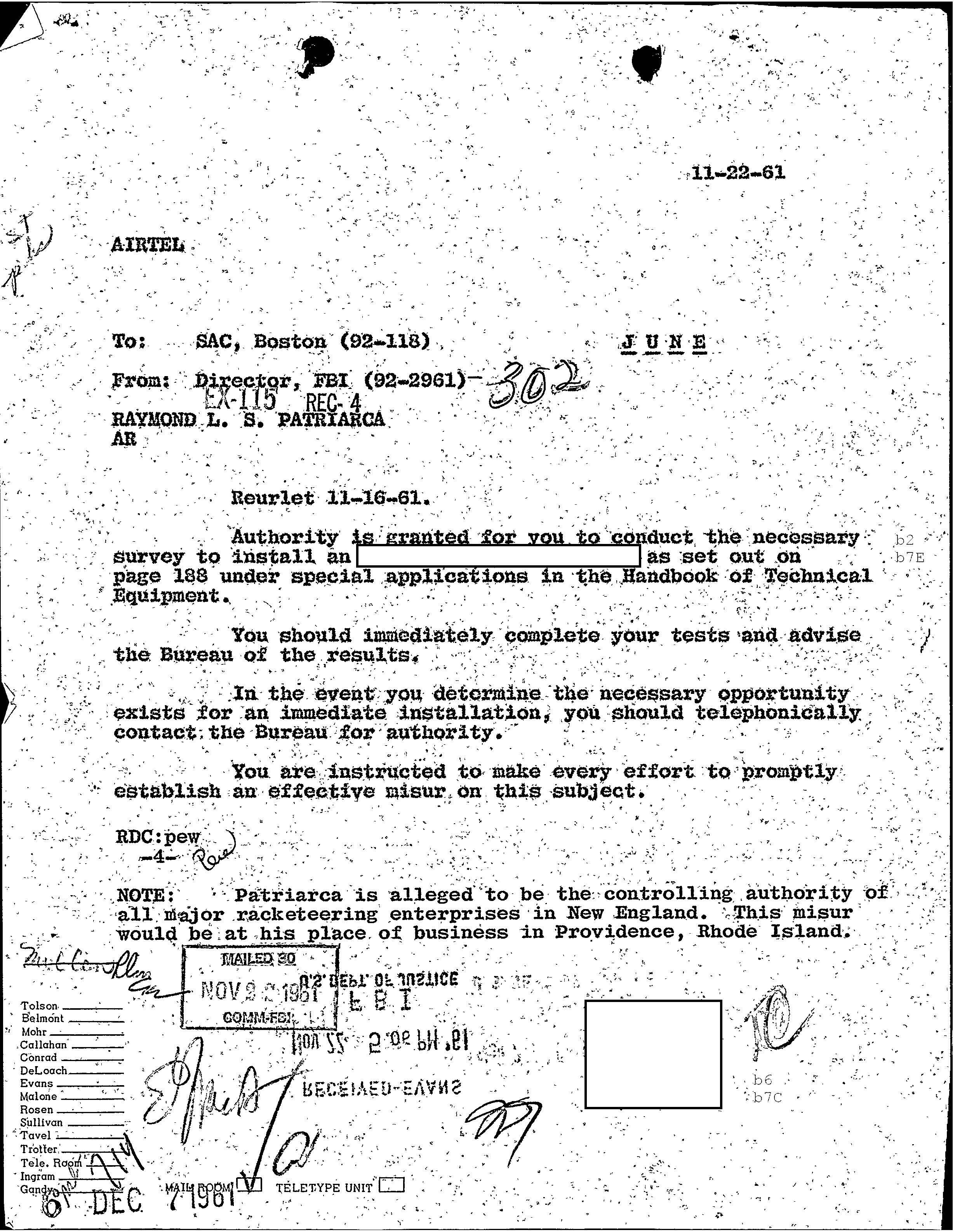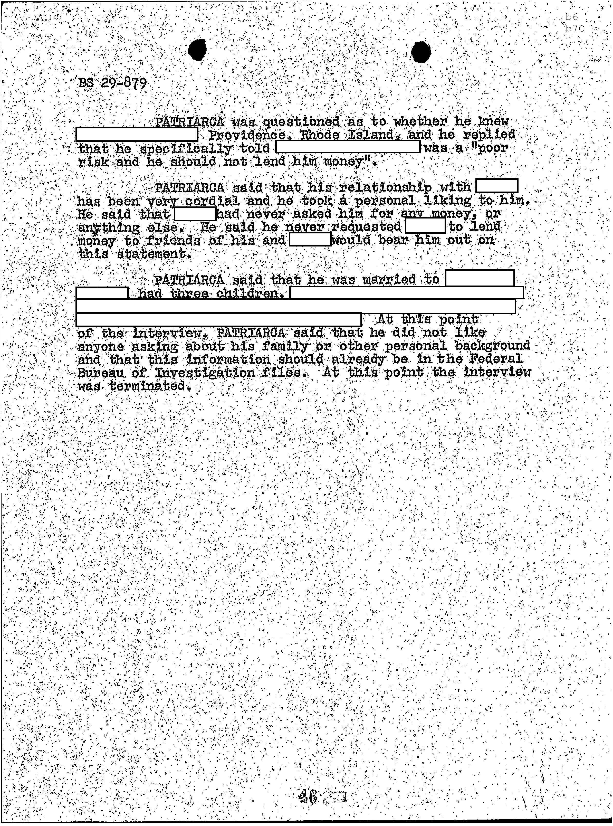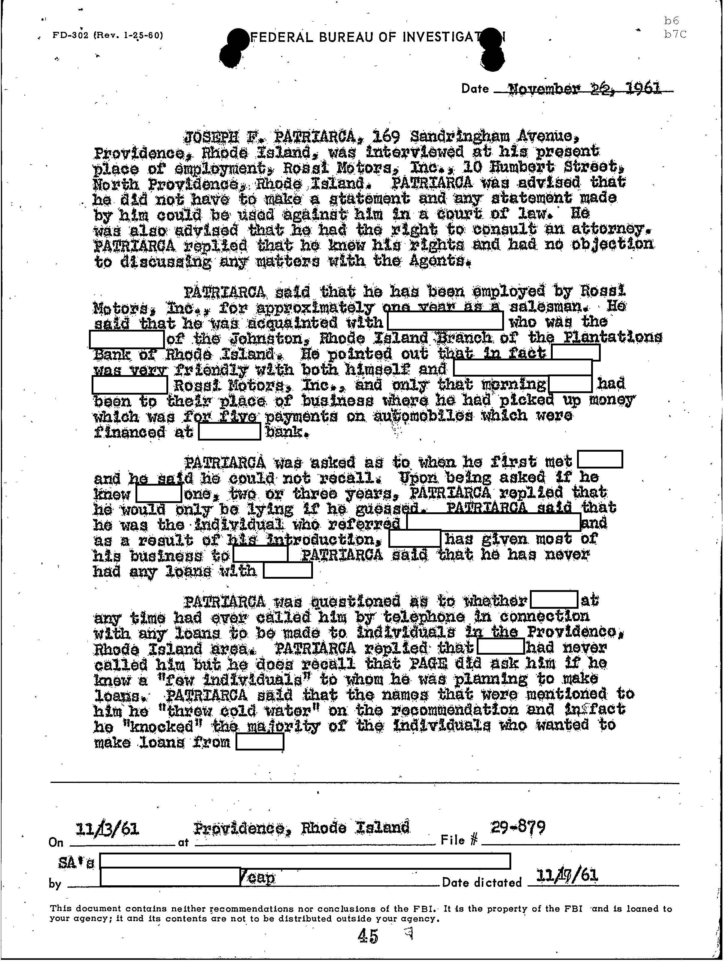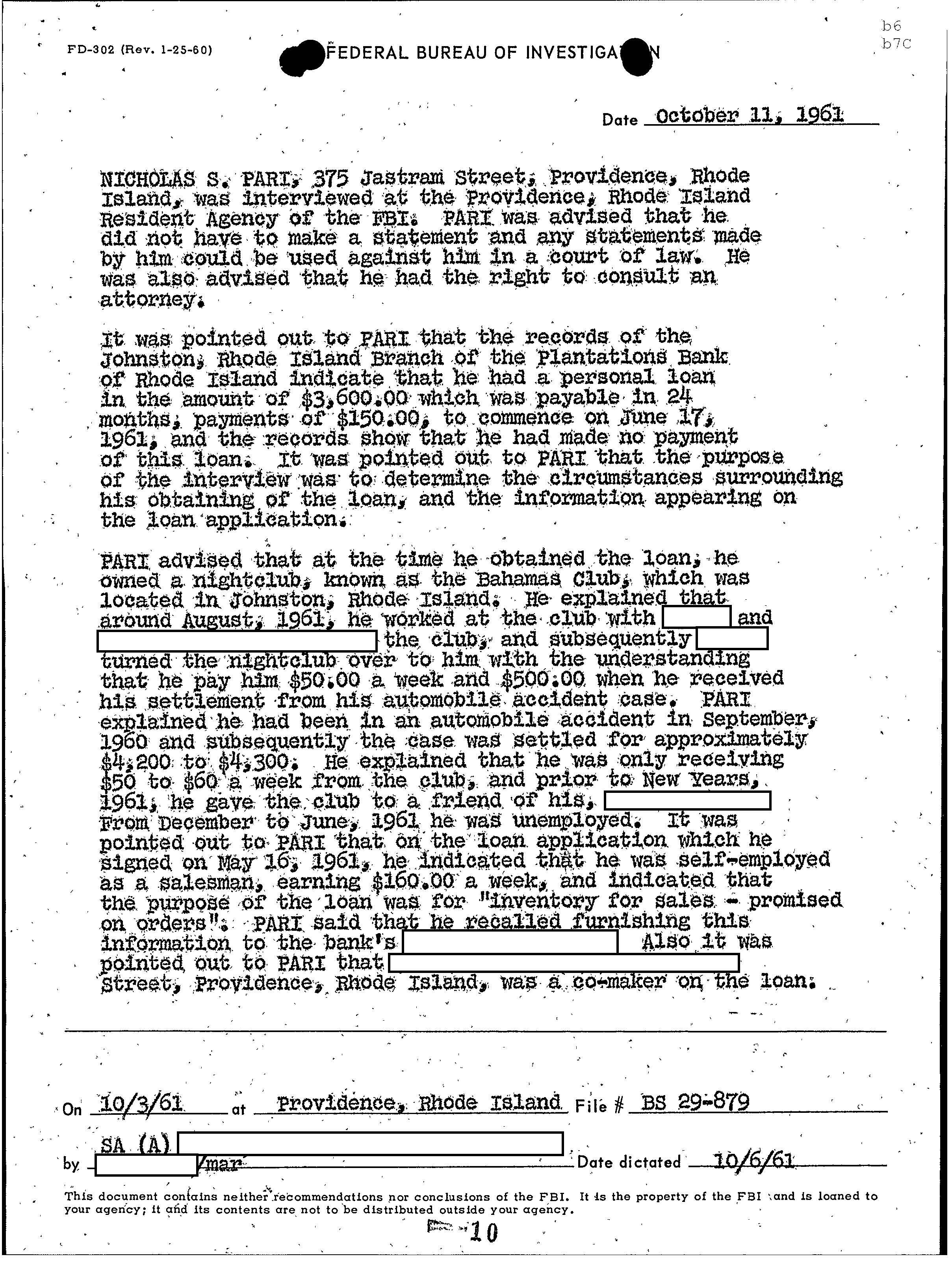 An FBI Teletype outlines that Patriarca’s girlfriend is separated from her husband and she is living in Johnston, RI.