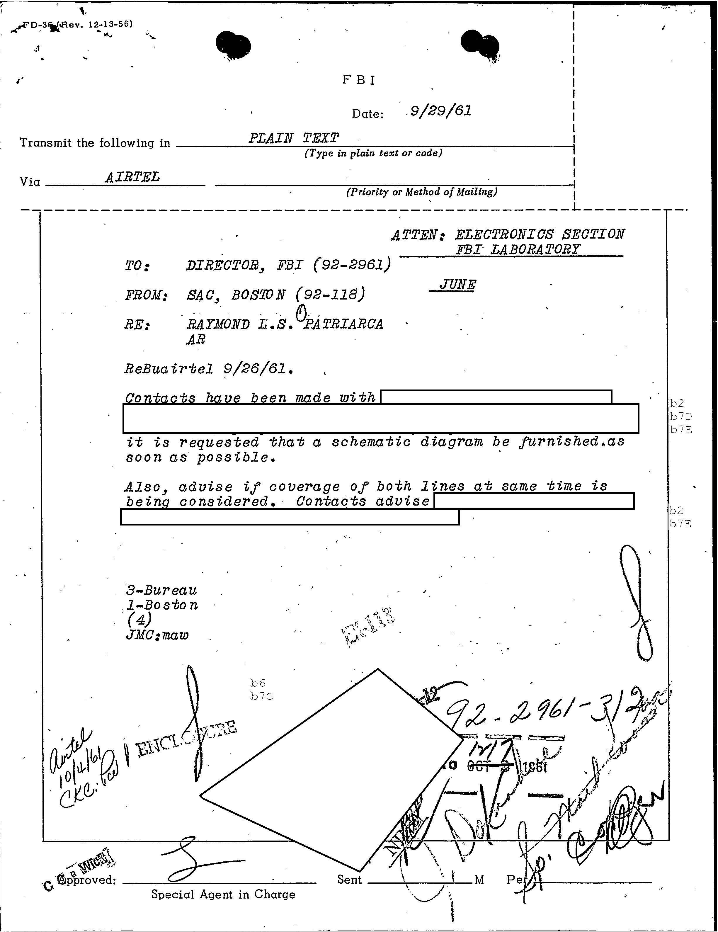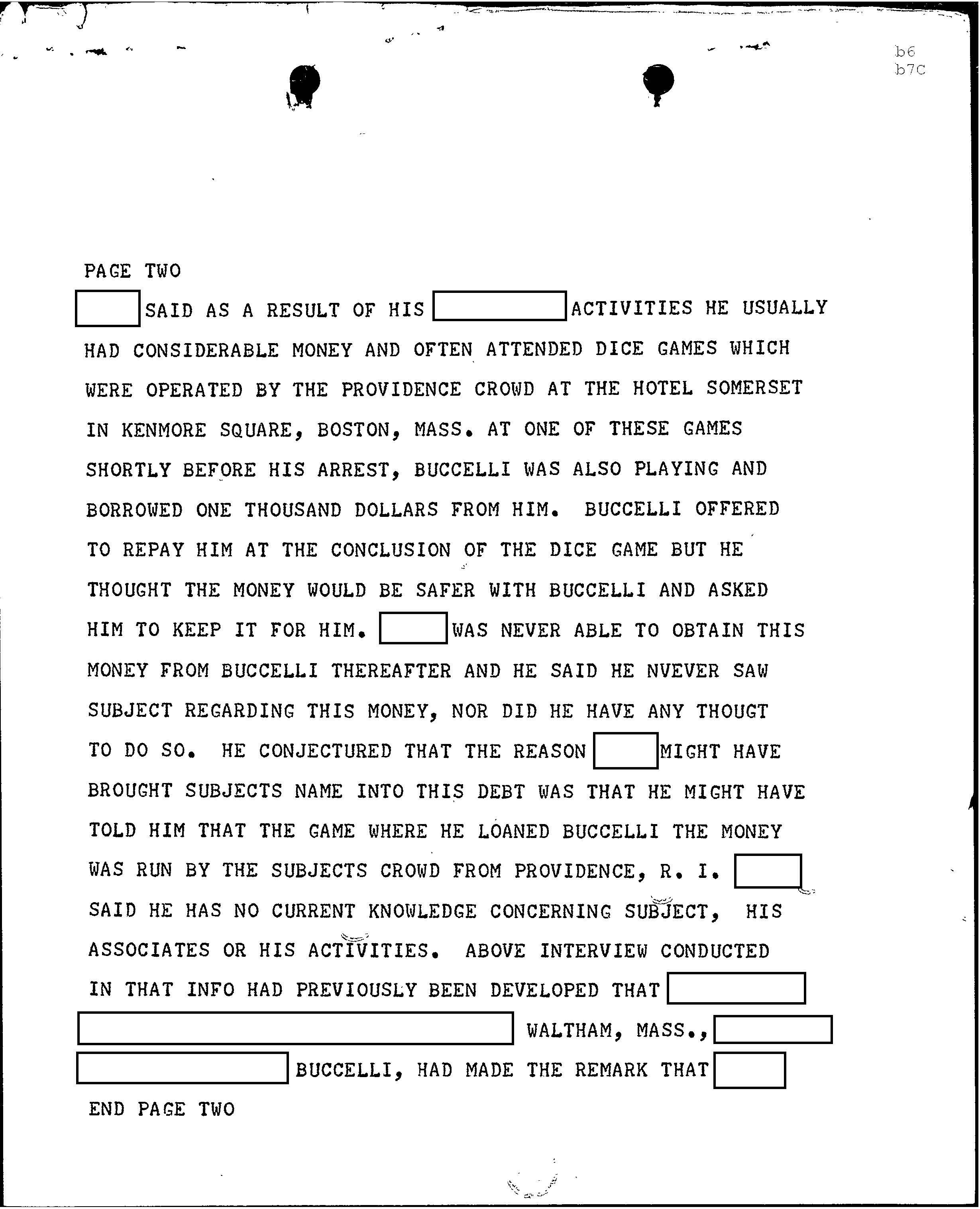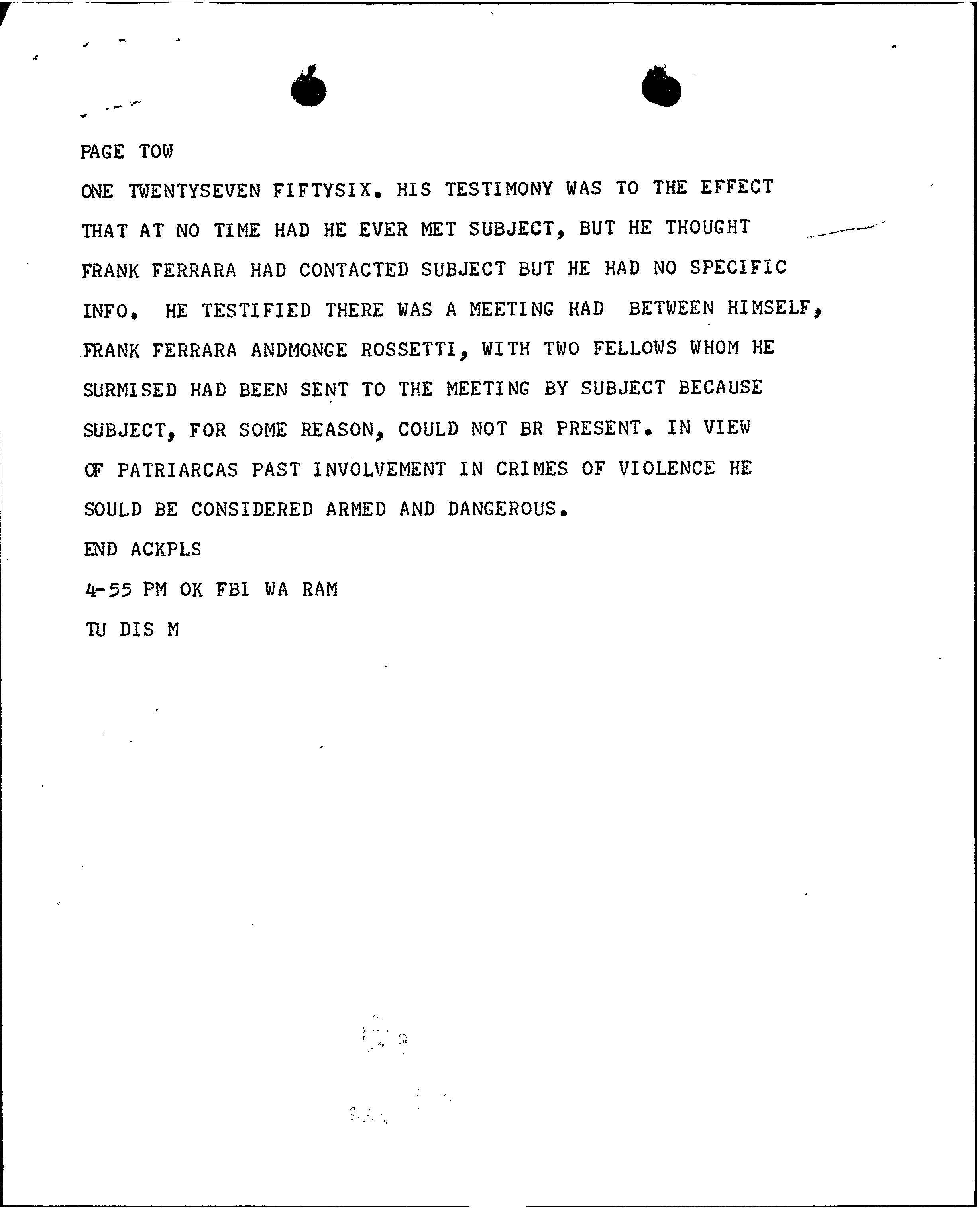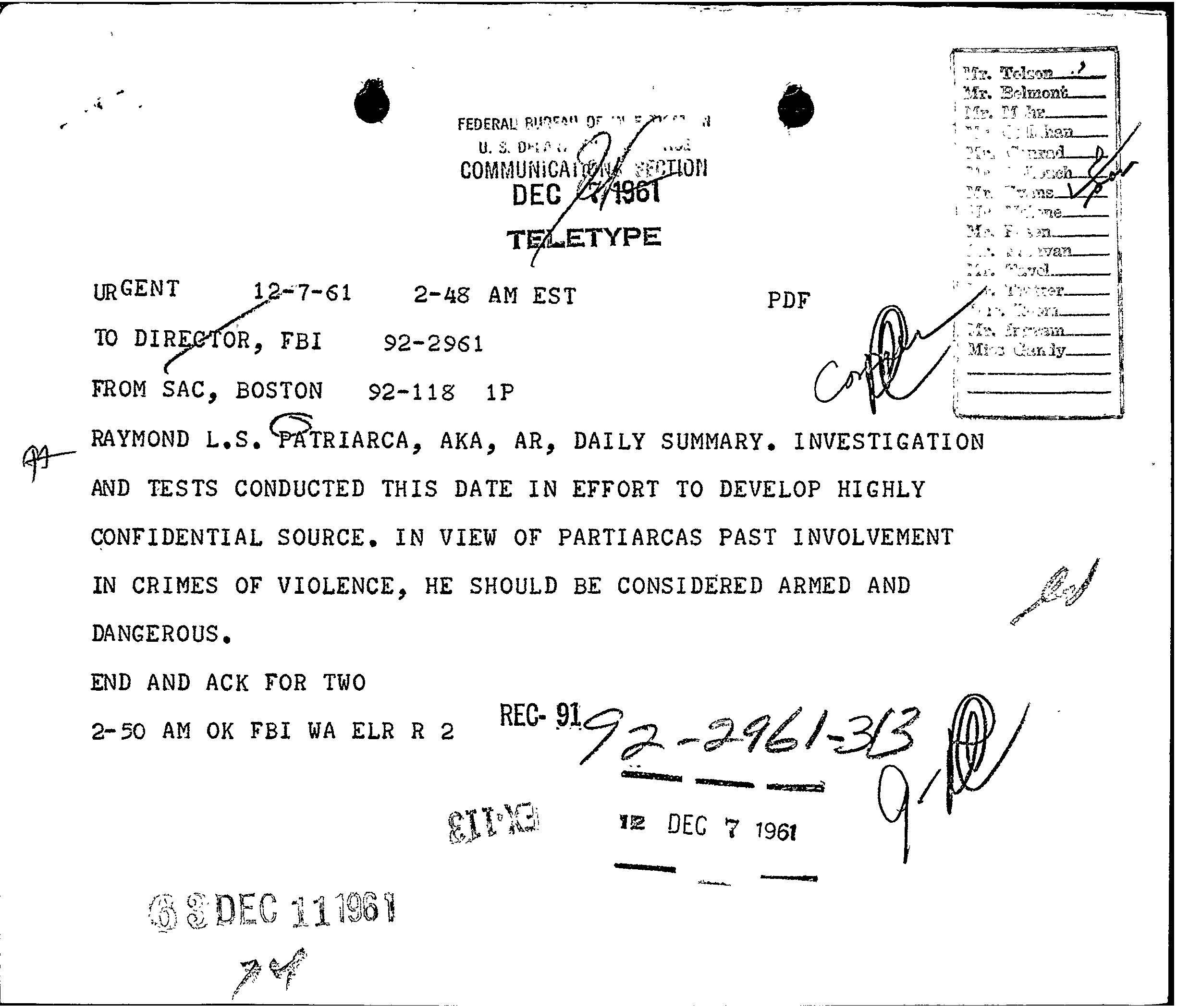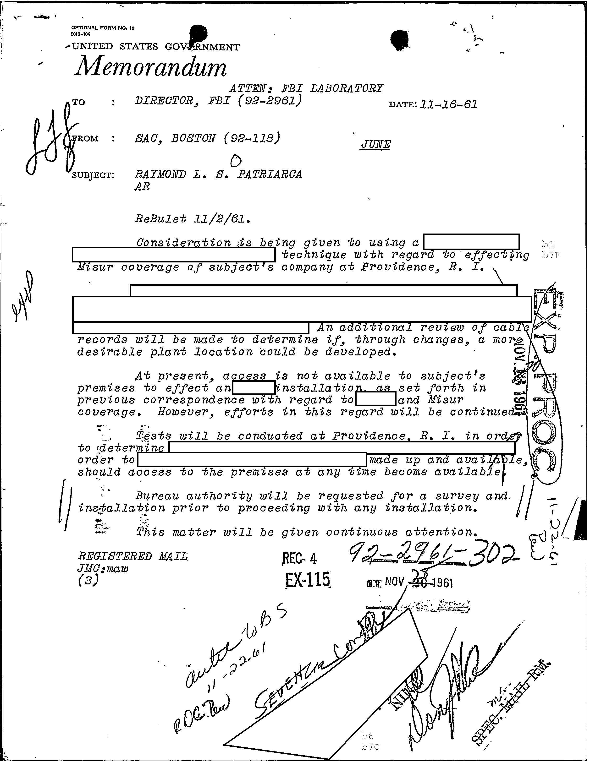 An FBI Teletype outlines that Patriarca’s girlfriend is separated from her husband and she is living in Johnston, RI.