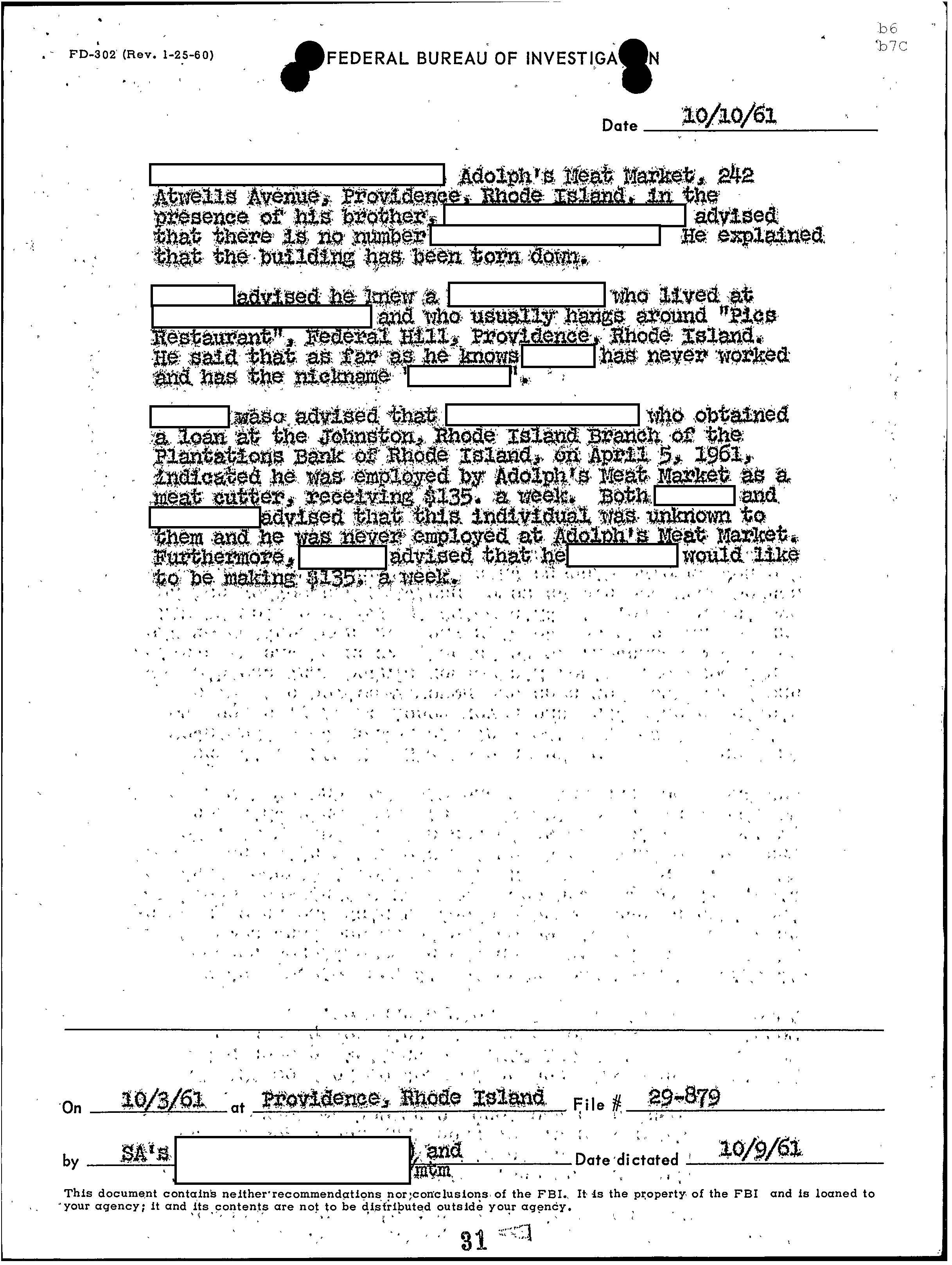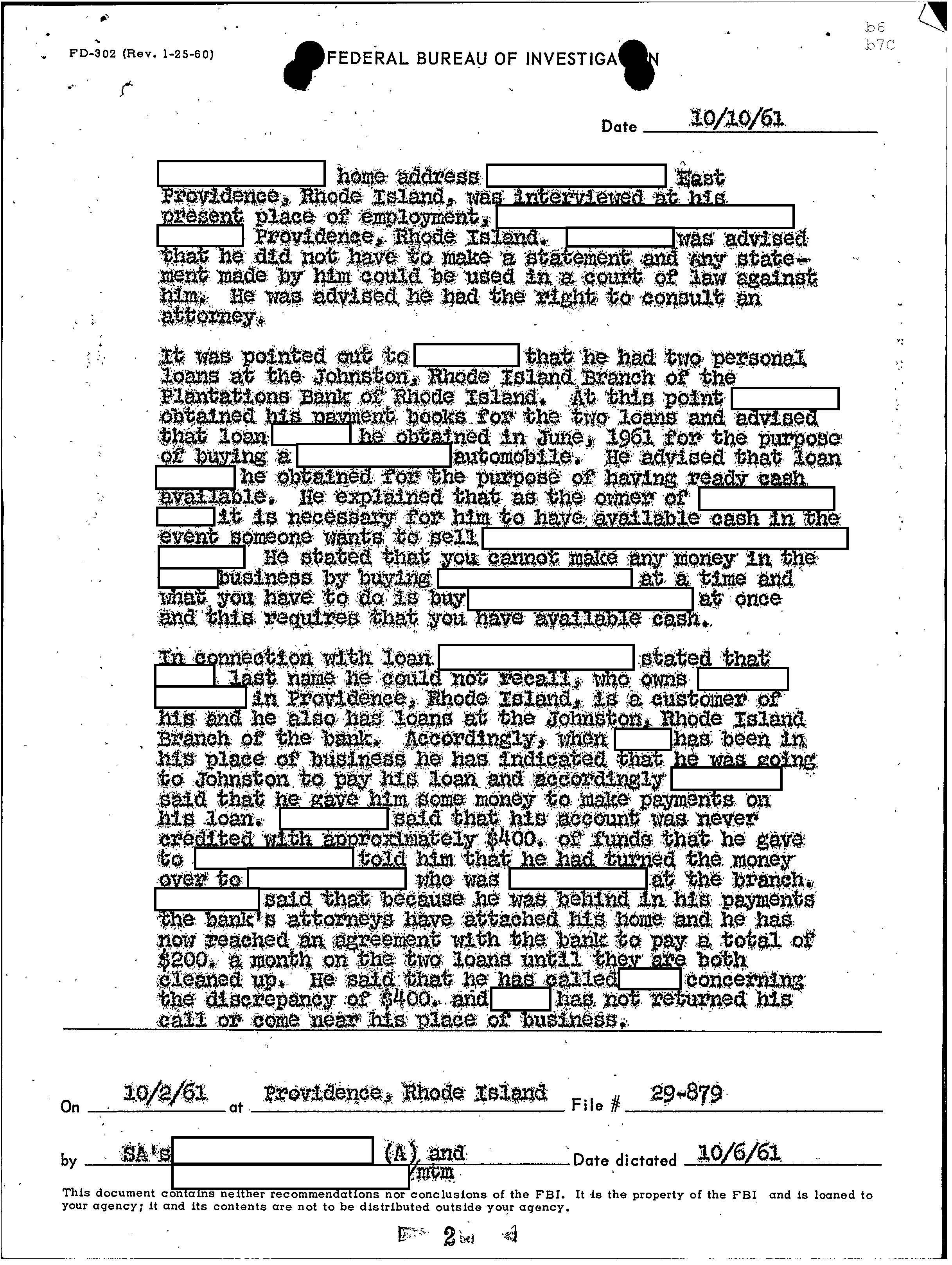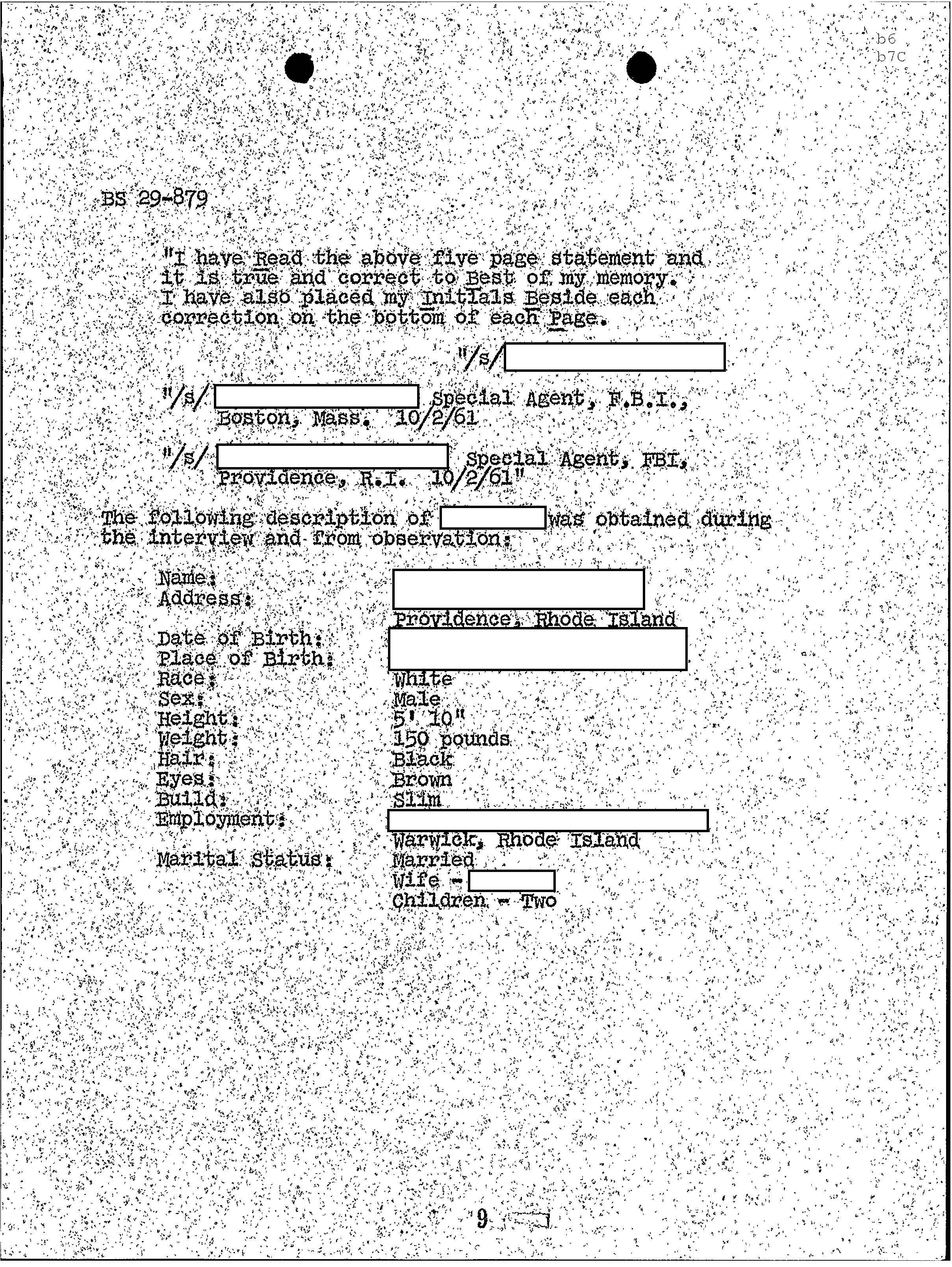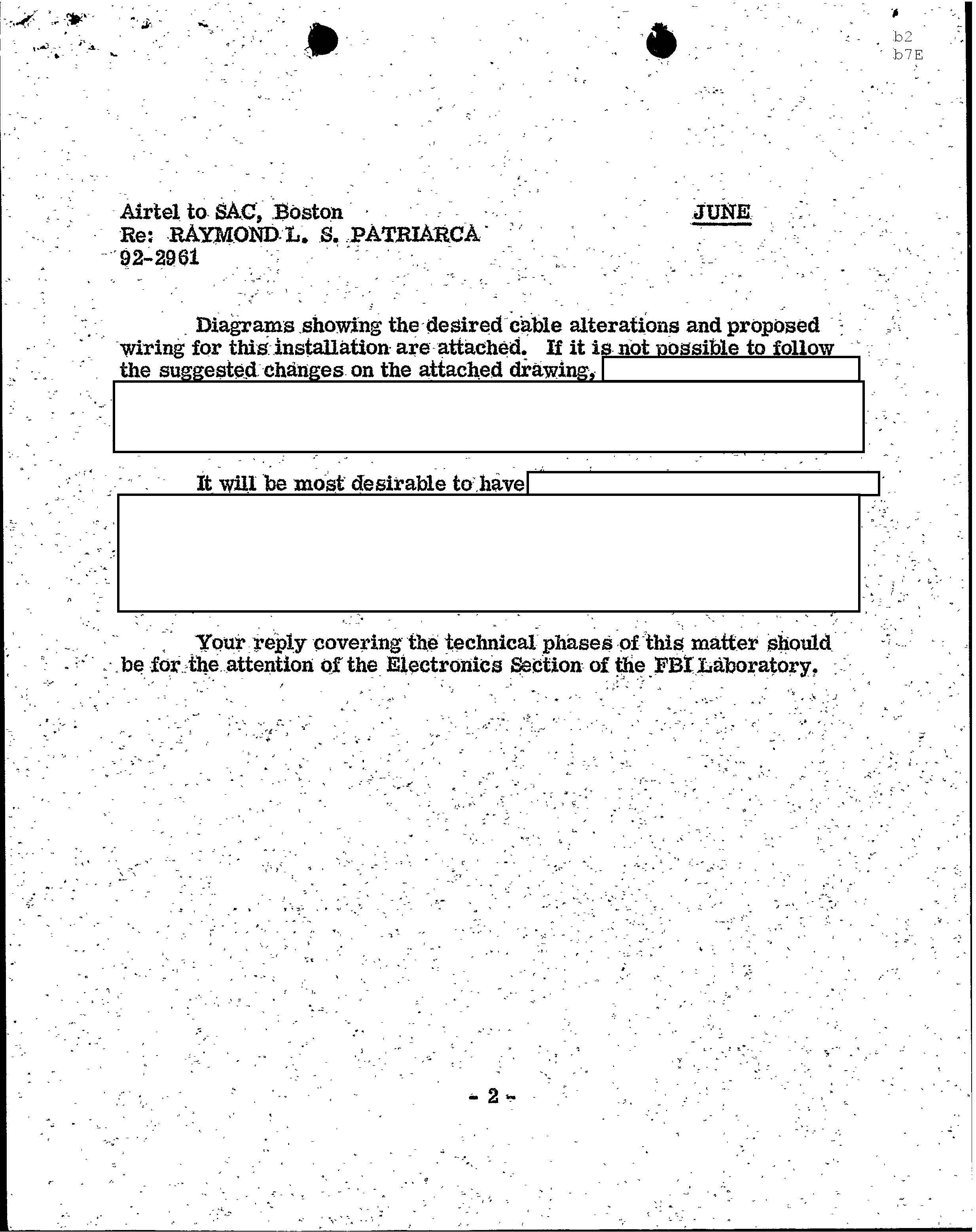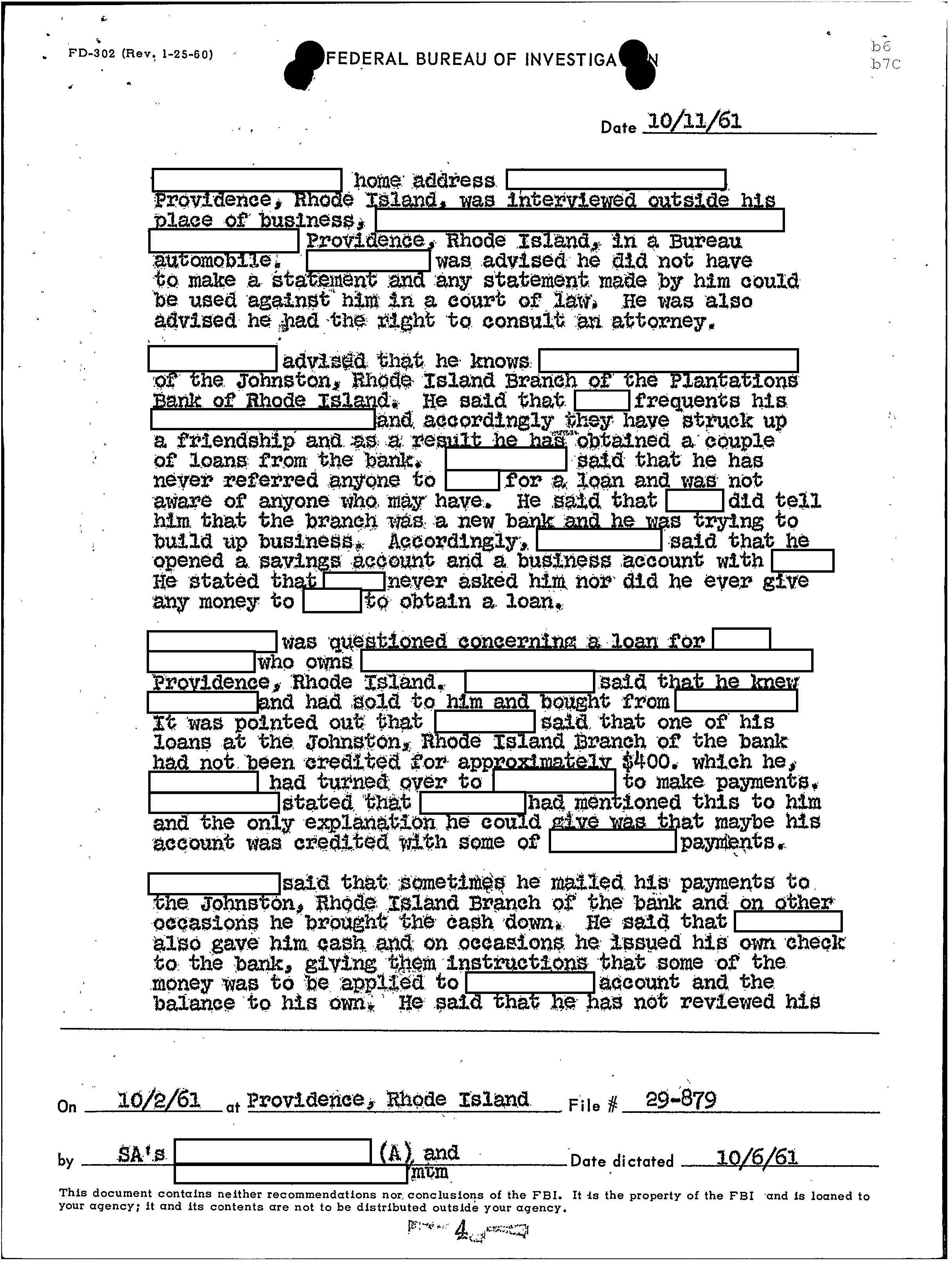 An FBI Teletype outlines that Patriarca’s girlfriend is separated from her husband and she is living in Johnston, RI.