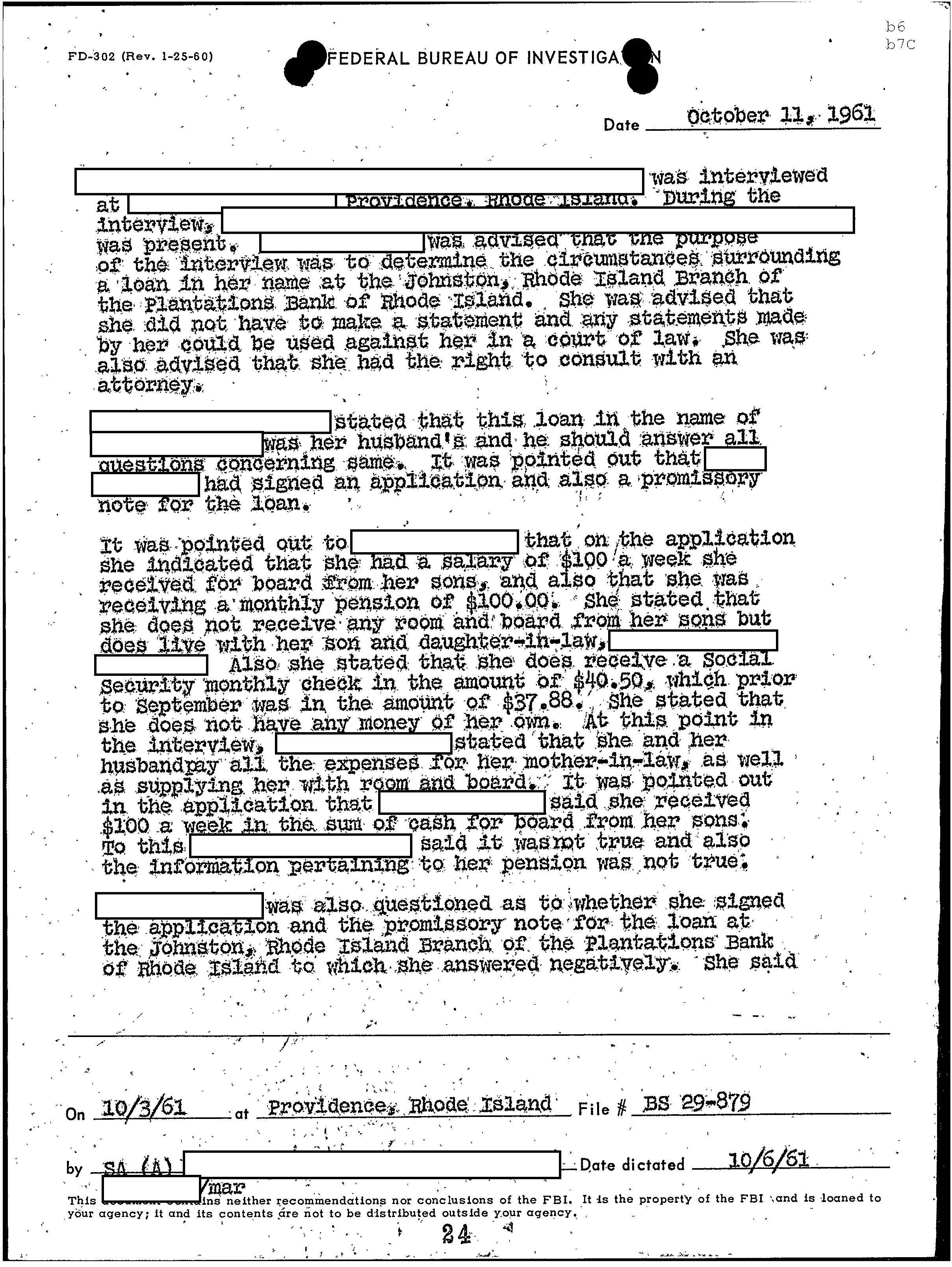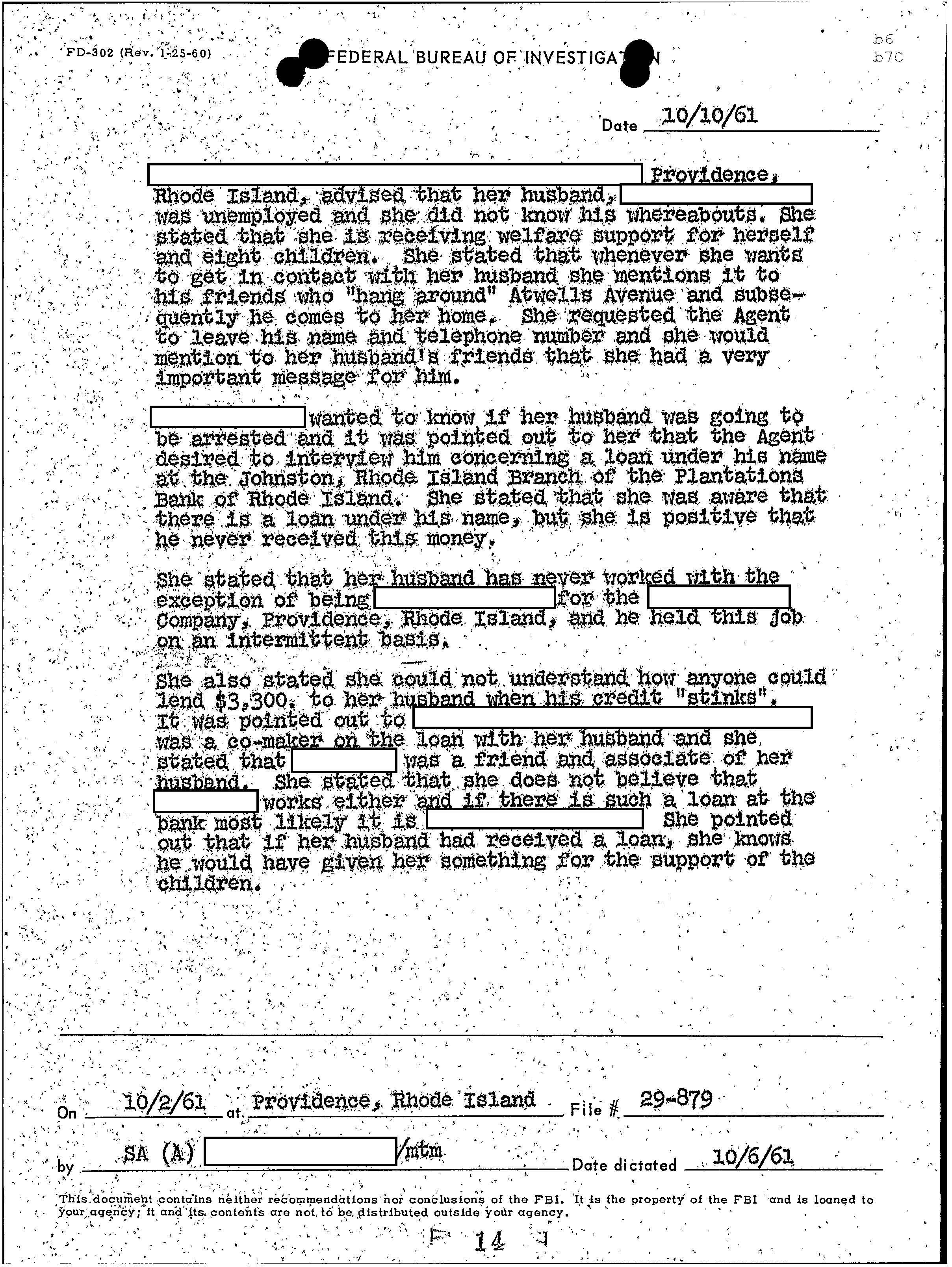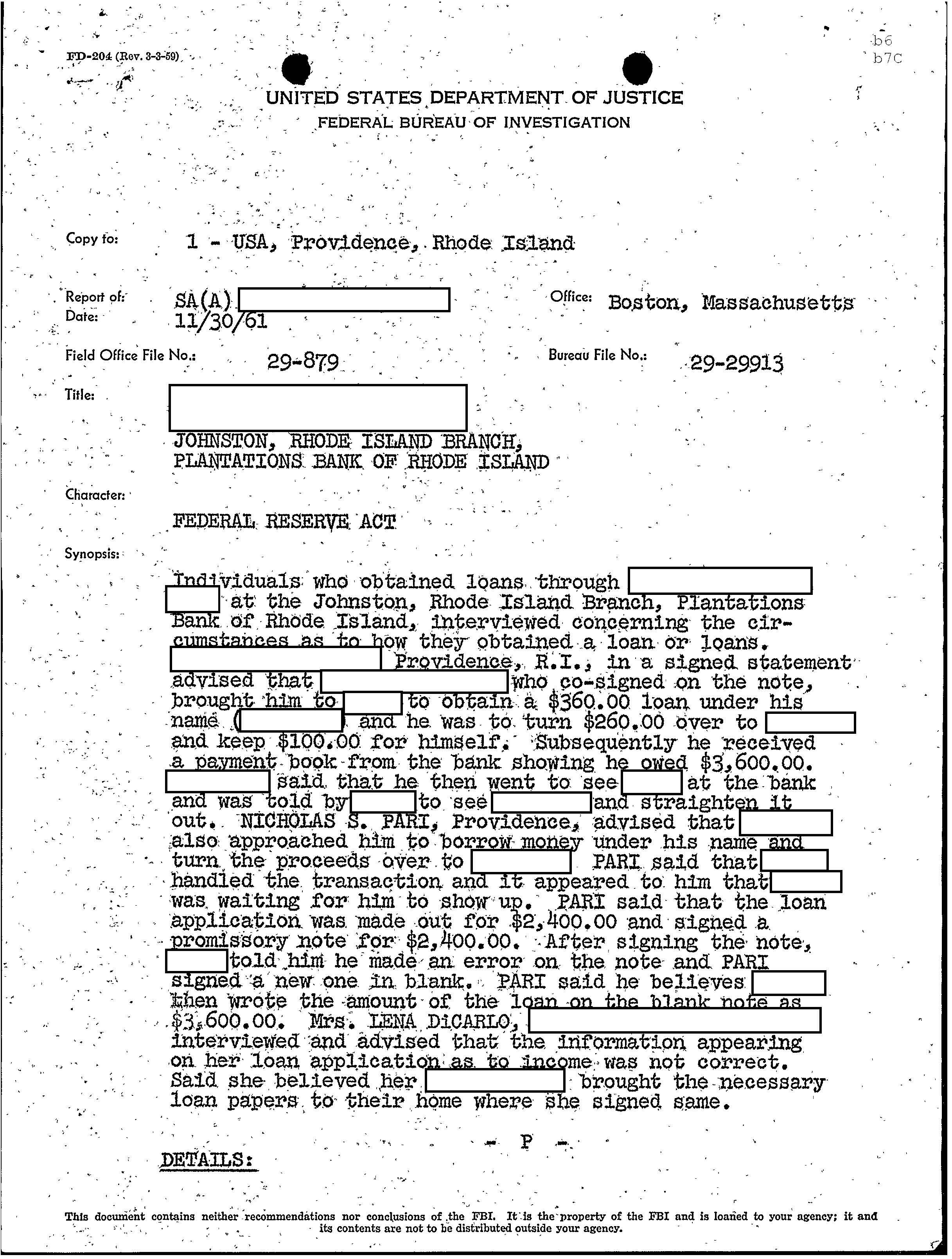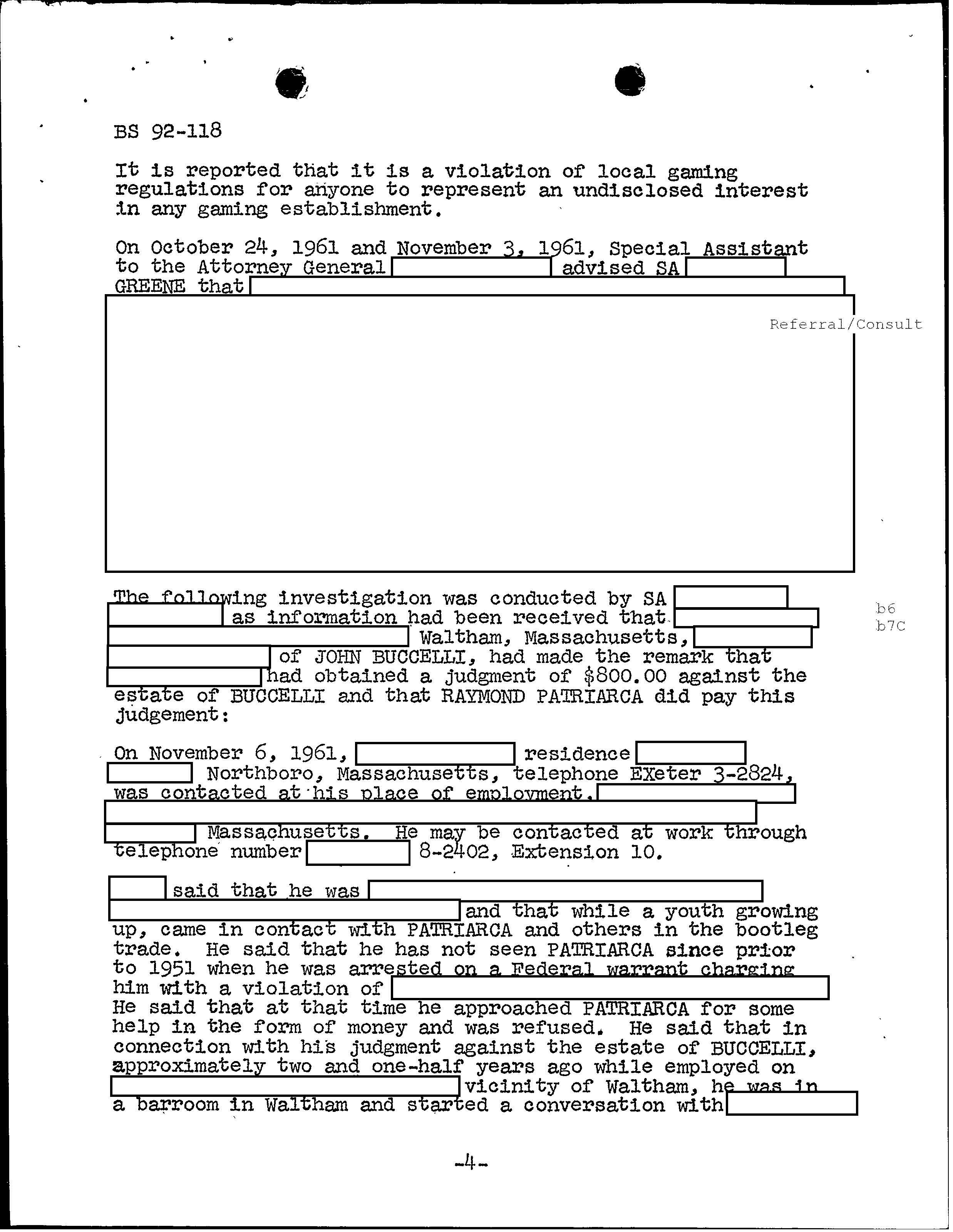 An FBI Teletype outlines that Patriarca’s girlfriend is separated from her husband and she is living in Johnston, RI.