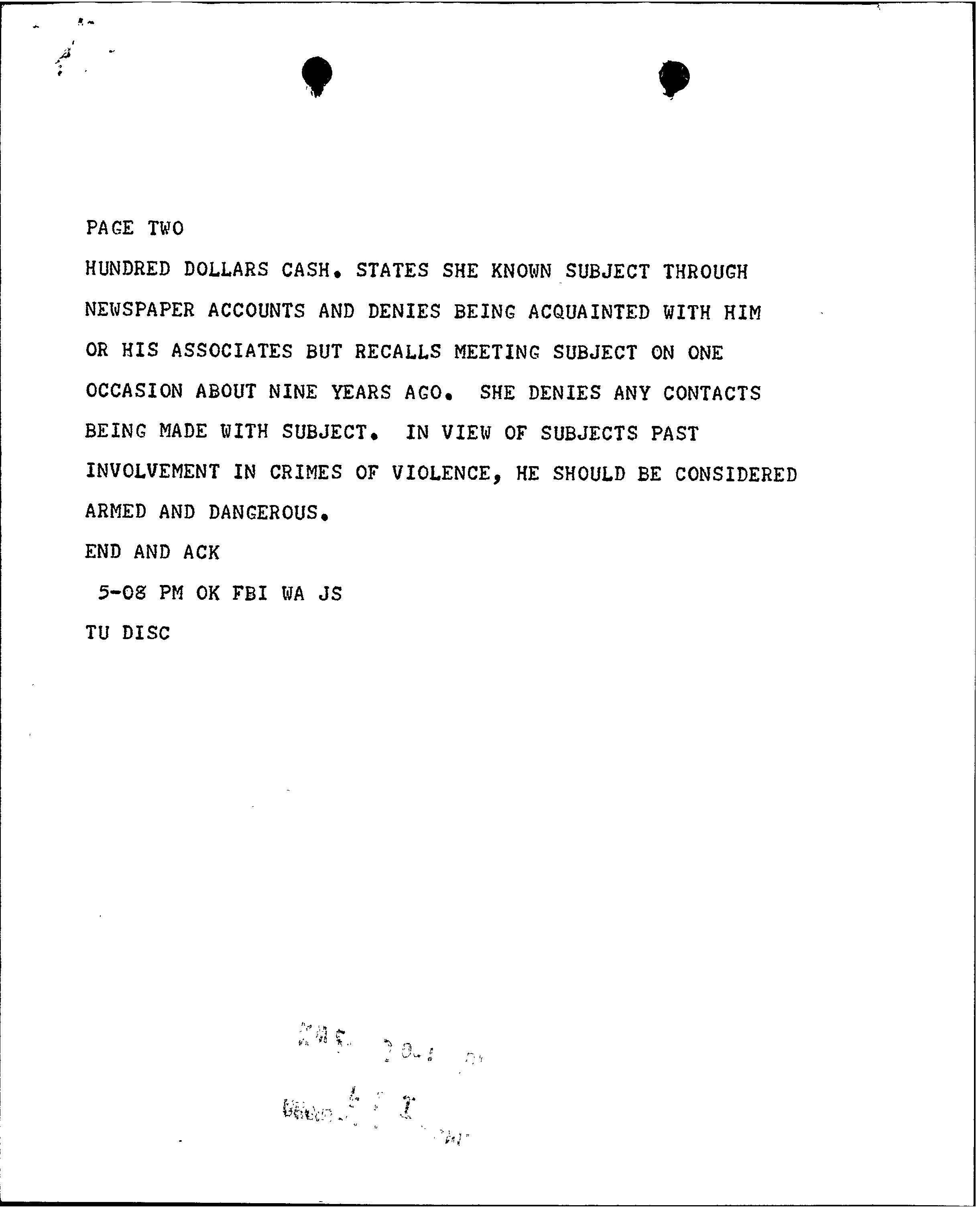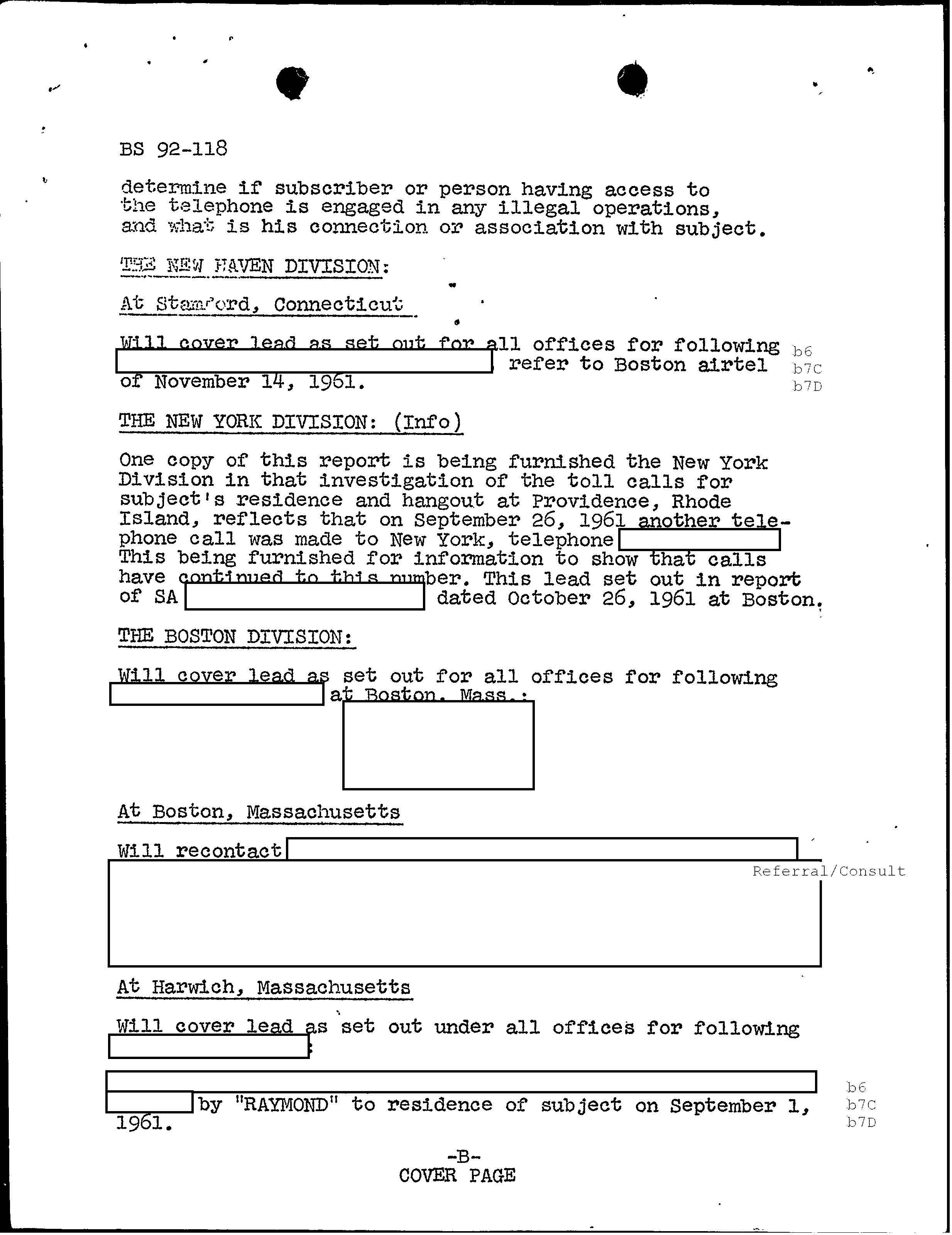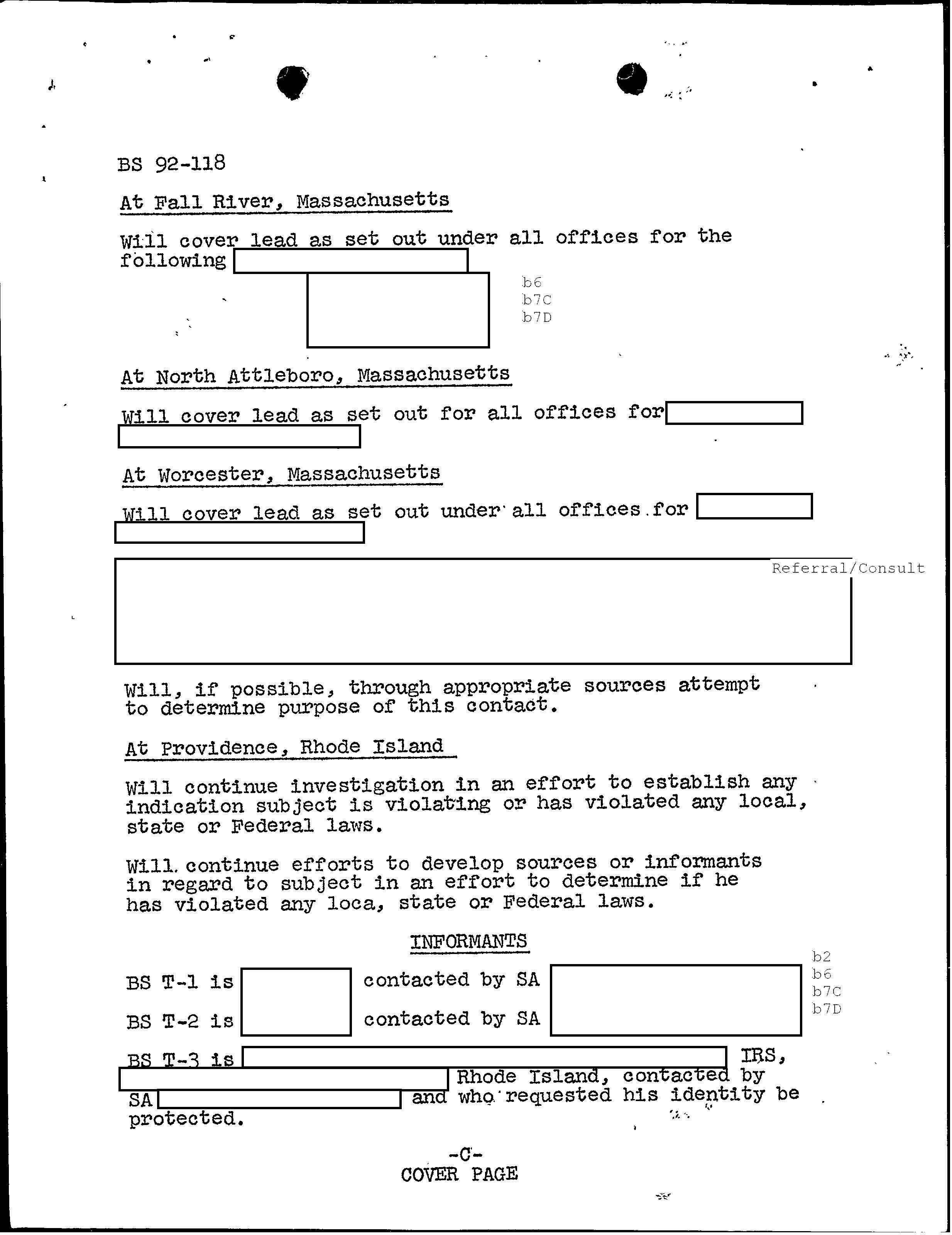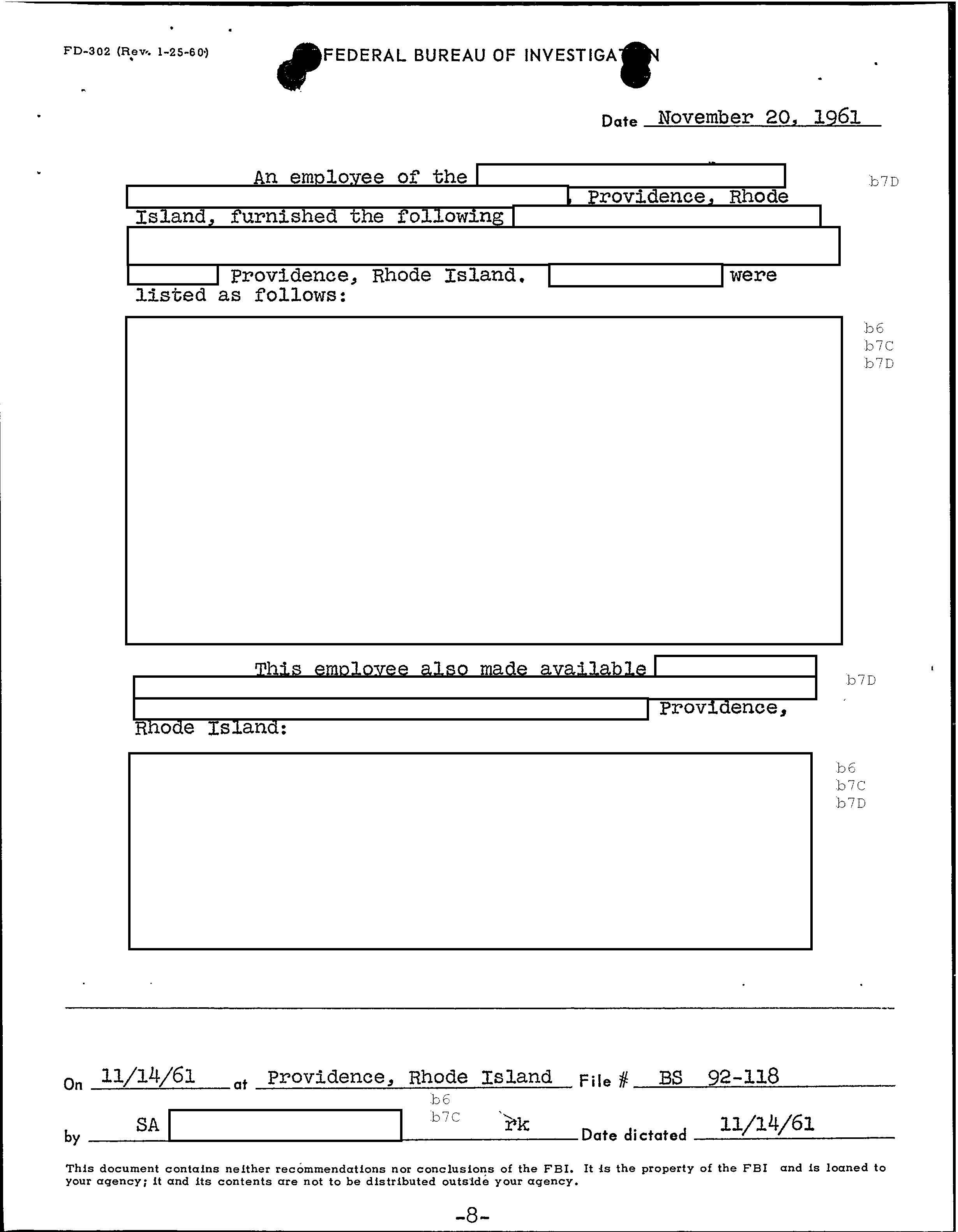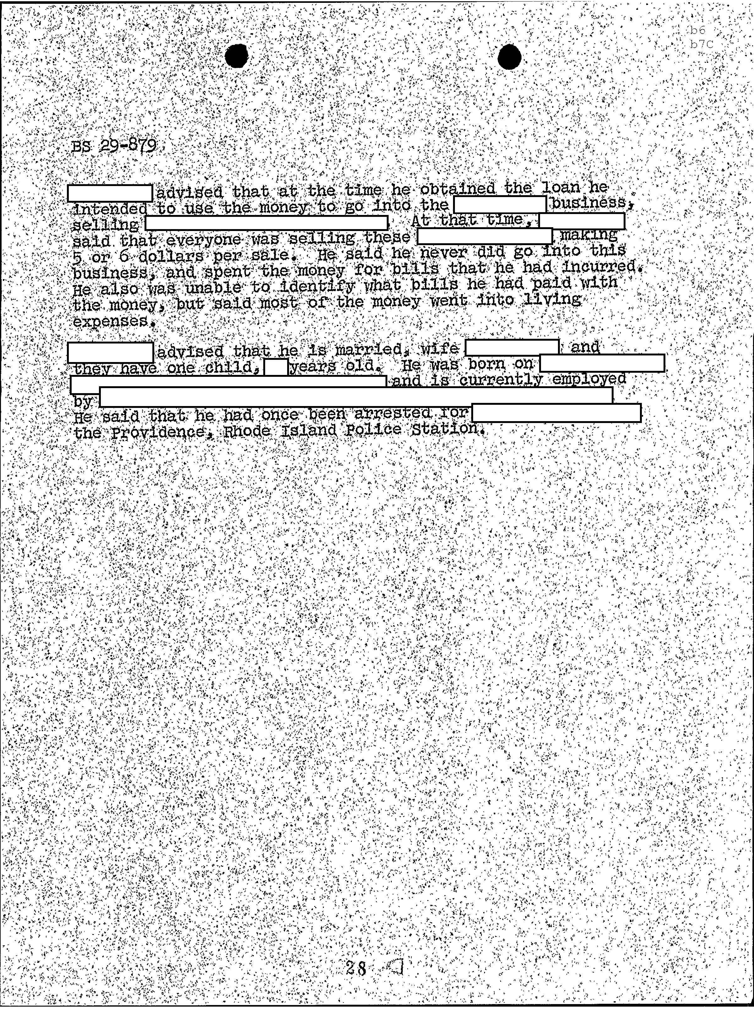 An FBI Teletype outlines that Patriarca’s girlfriend is separated from her husband and she is living in Johnston, RI.