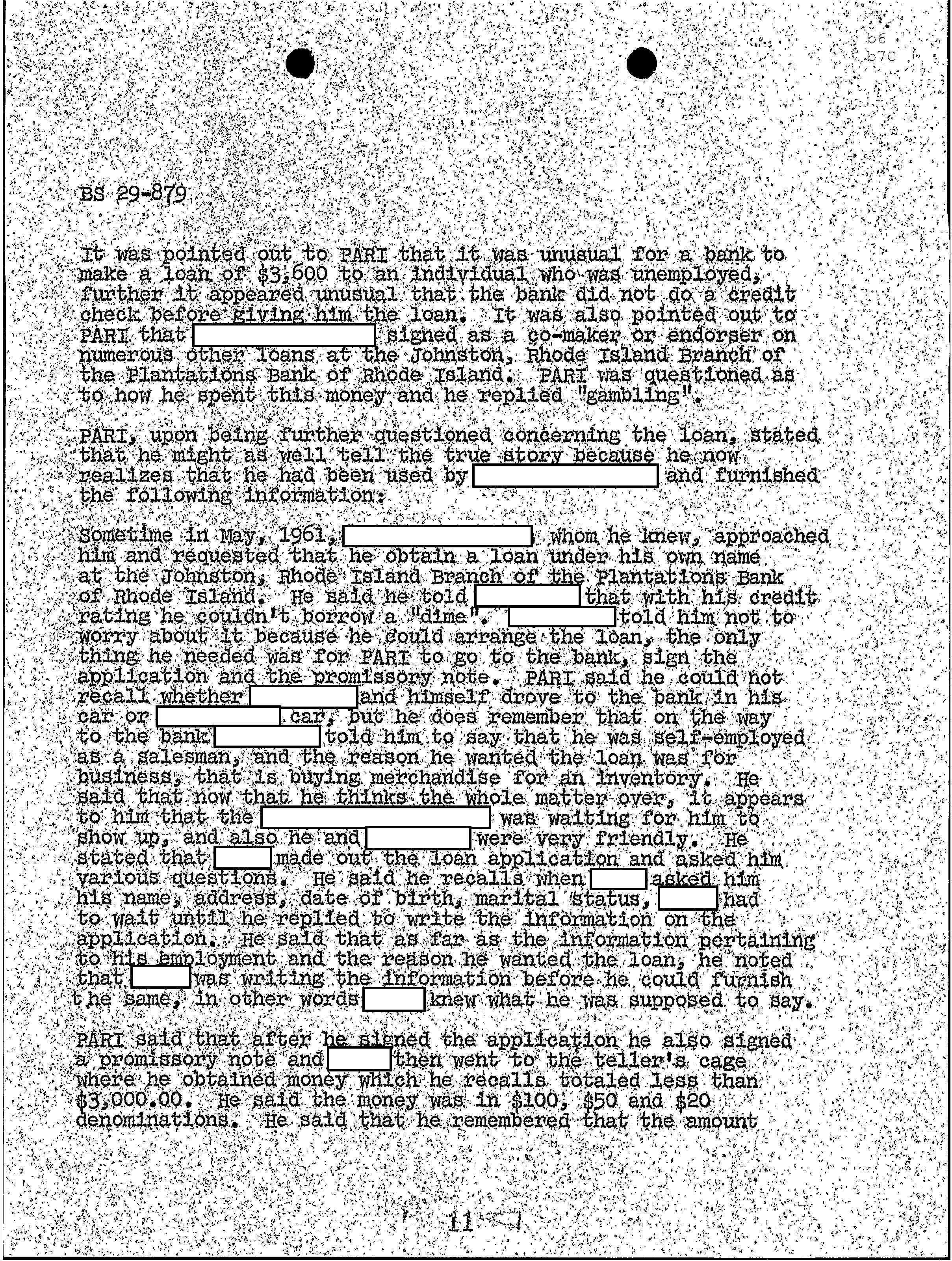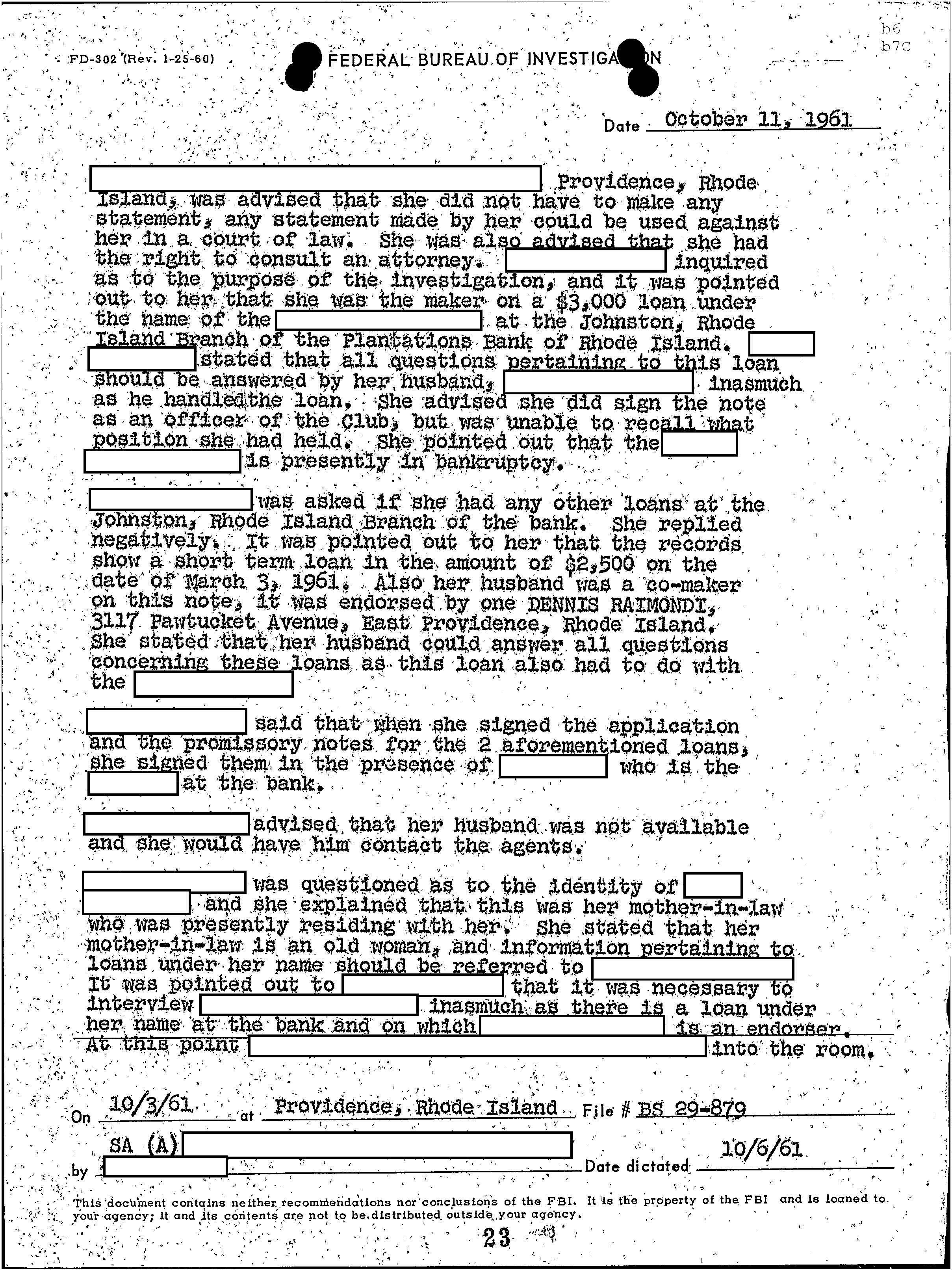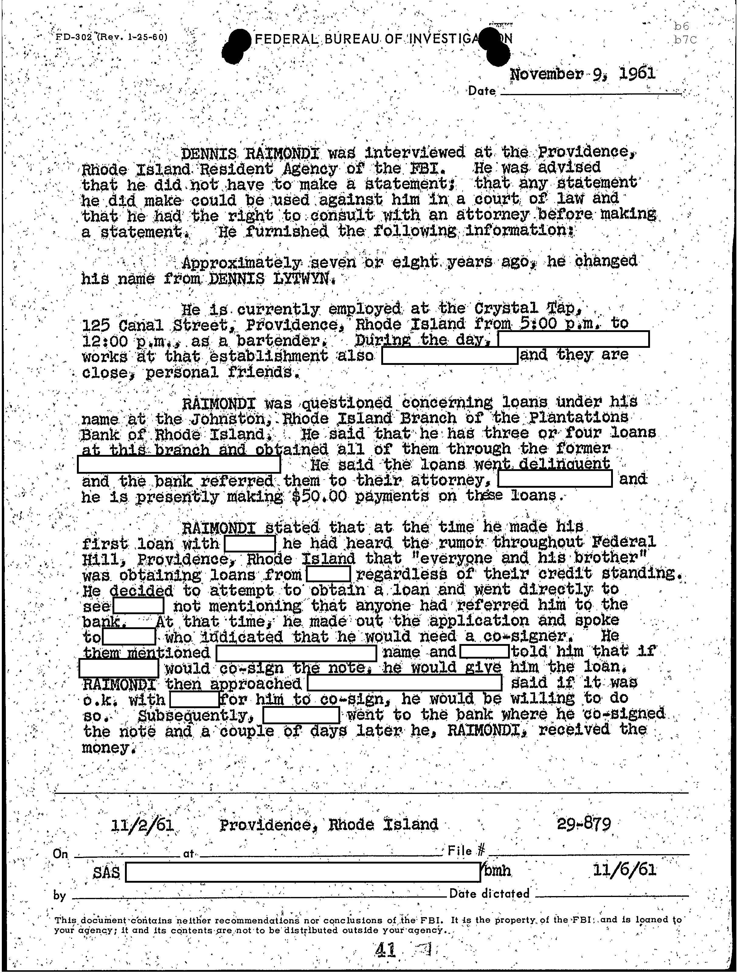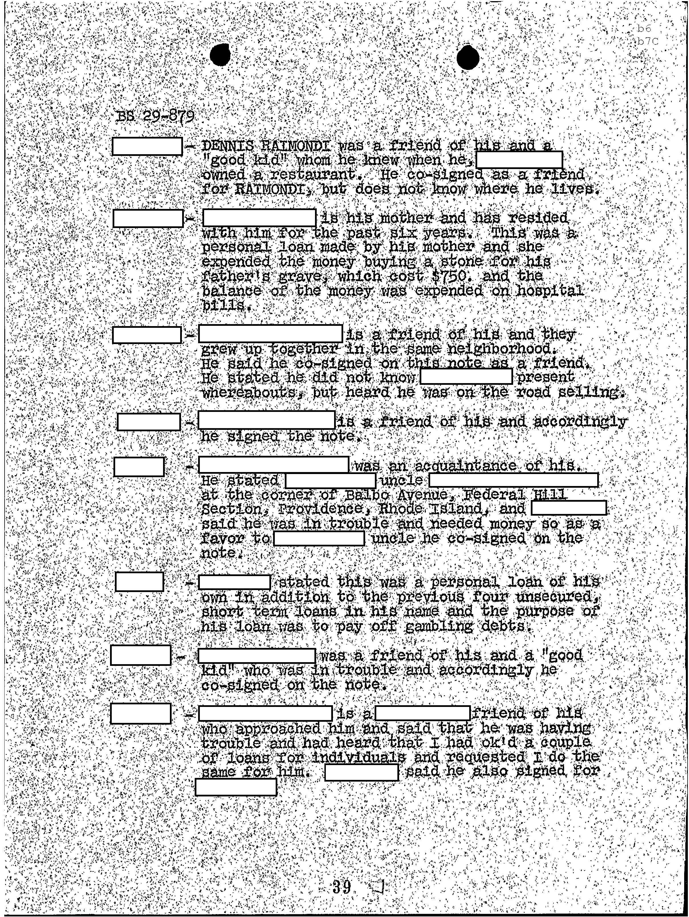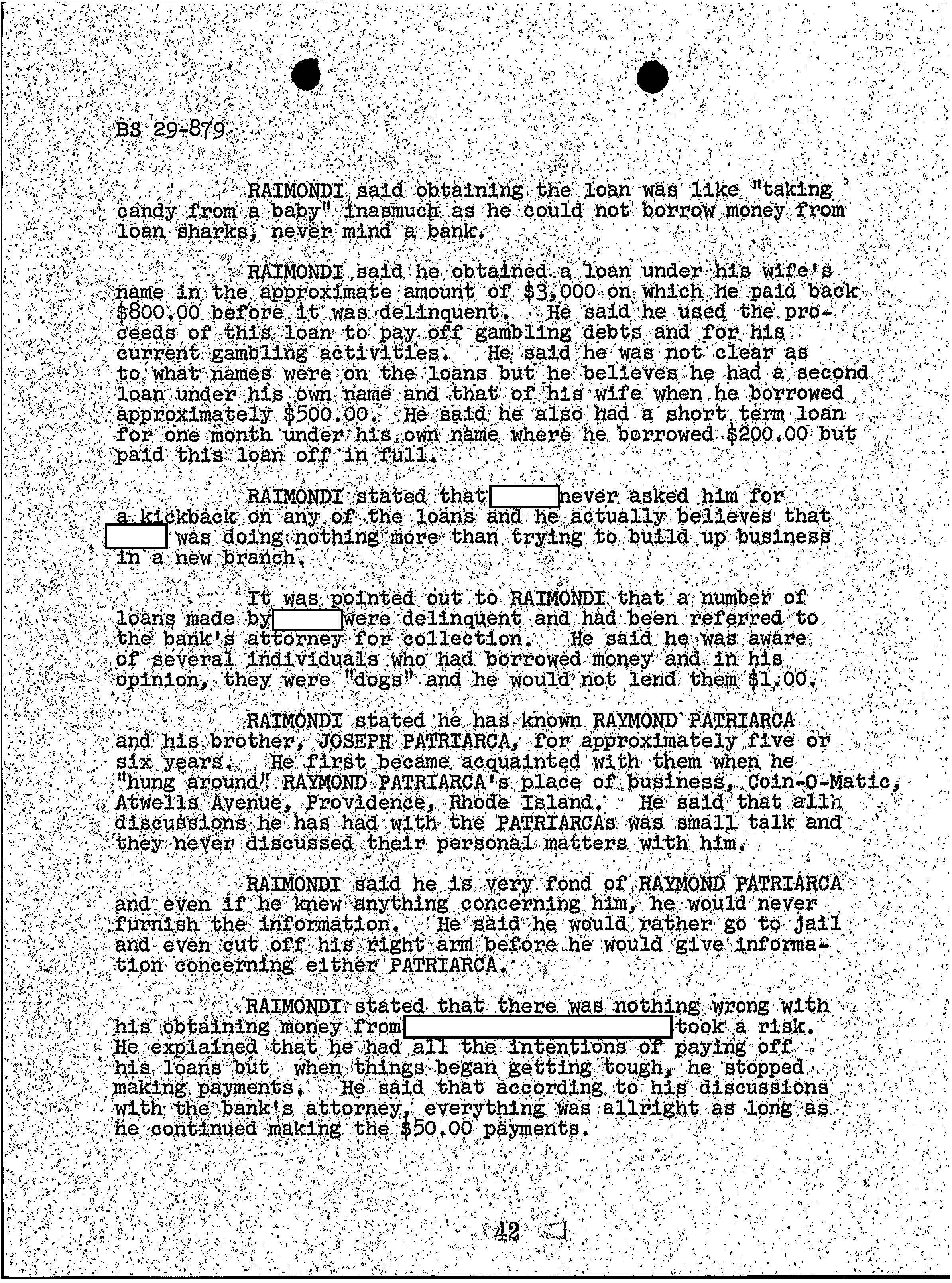 As the FBI investigated Raimondi regarding questionable loans. Raimondi said “he is very fond of Raymond Patriarca and even if he know anything concerning him, he would never furnish the information. He said he would rather go to jail and even cut off his right arm before he would give information concerning with Patriarca.”