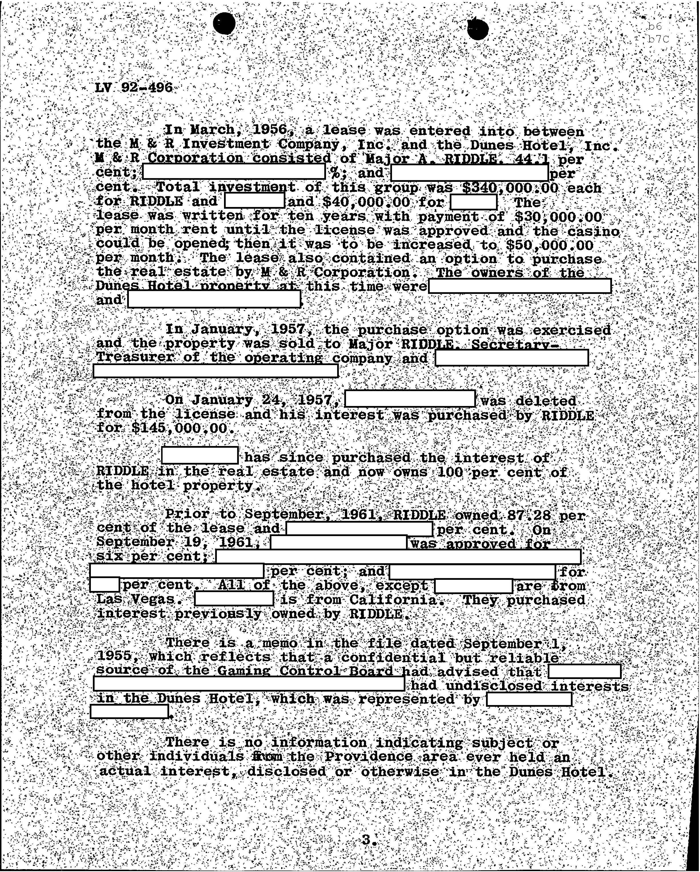 In March of 1956 a lease was entered into between the M&R Investment Company and the Dunes Hotel - the investment was led by Major A. Riddle. In 1957, Riddle exercised an option to by the Dunes in whole.