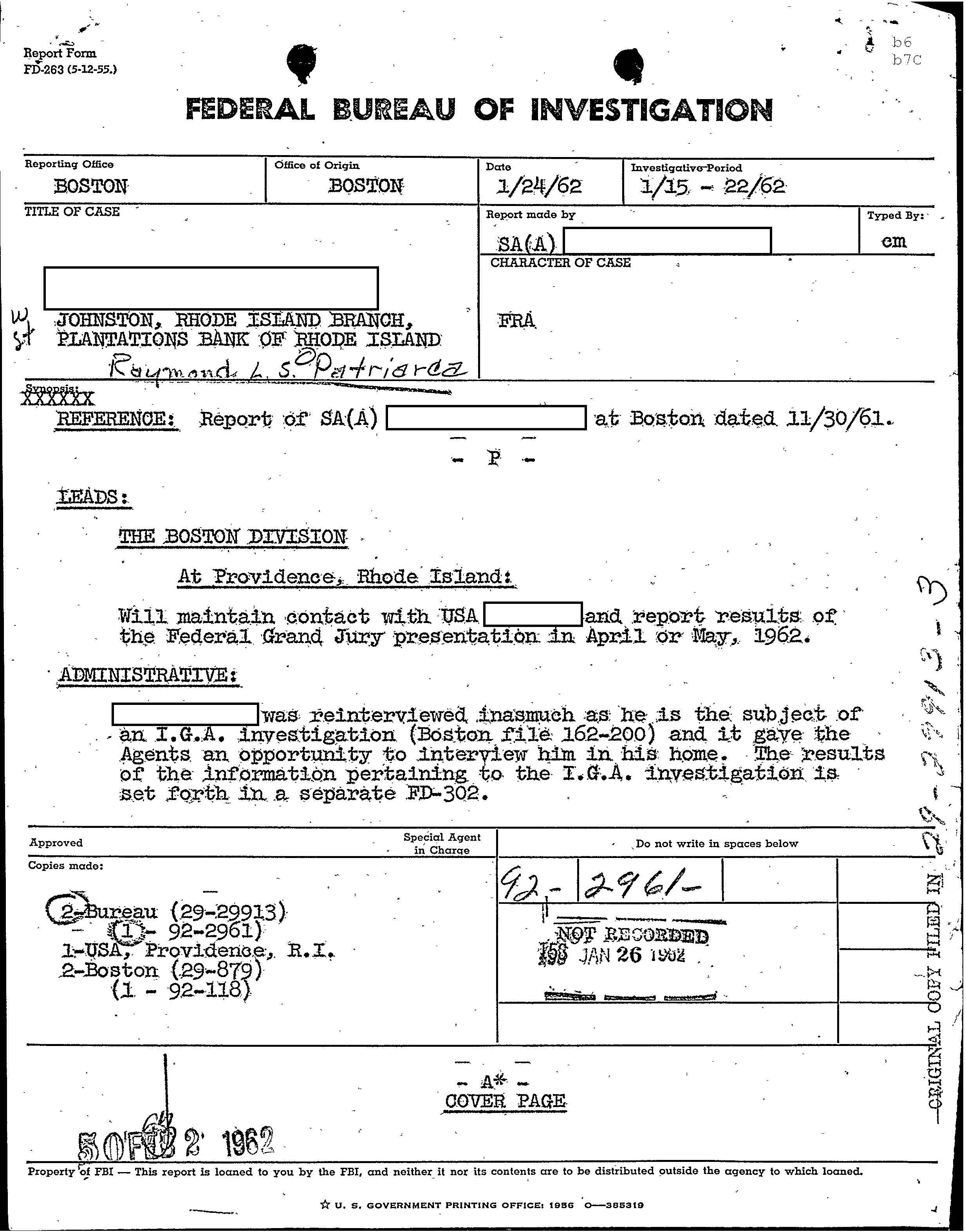 In the effort the defend the Providence Journal against the $1 Million libel suit brought by Raymond Patriarca against the paper, the paper’s attorney “is going to make an appointment with the Attorney General (Robert Kennedy) of the United States at Washington, D.C. for the purposes of having FBI files and any other files re subject made available to him in an effort to obtain substantial proof that subject (Patriarca) is a hoodlum and racketeer, and characterized in articles presented by the Providence Journal newspaper.”