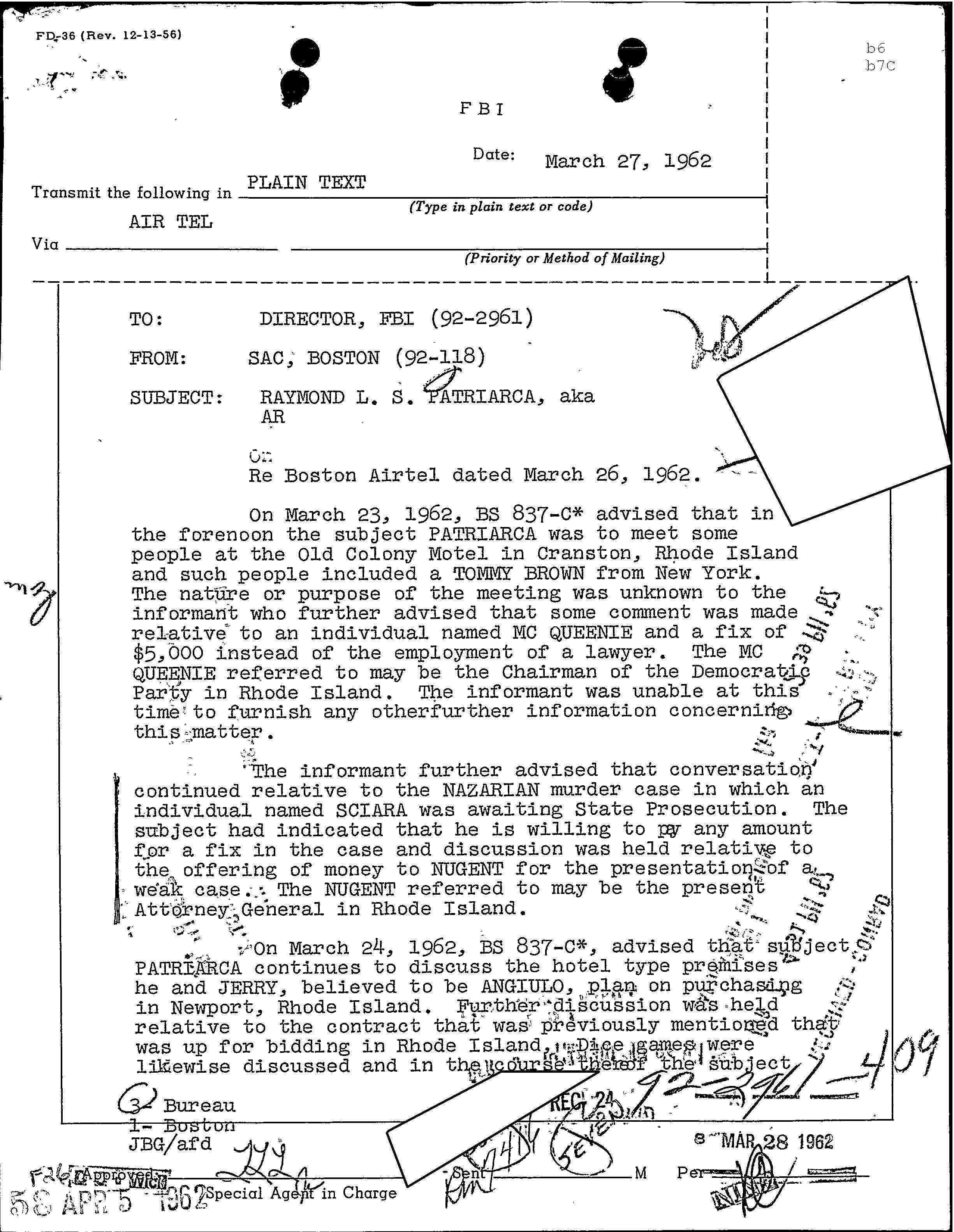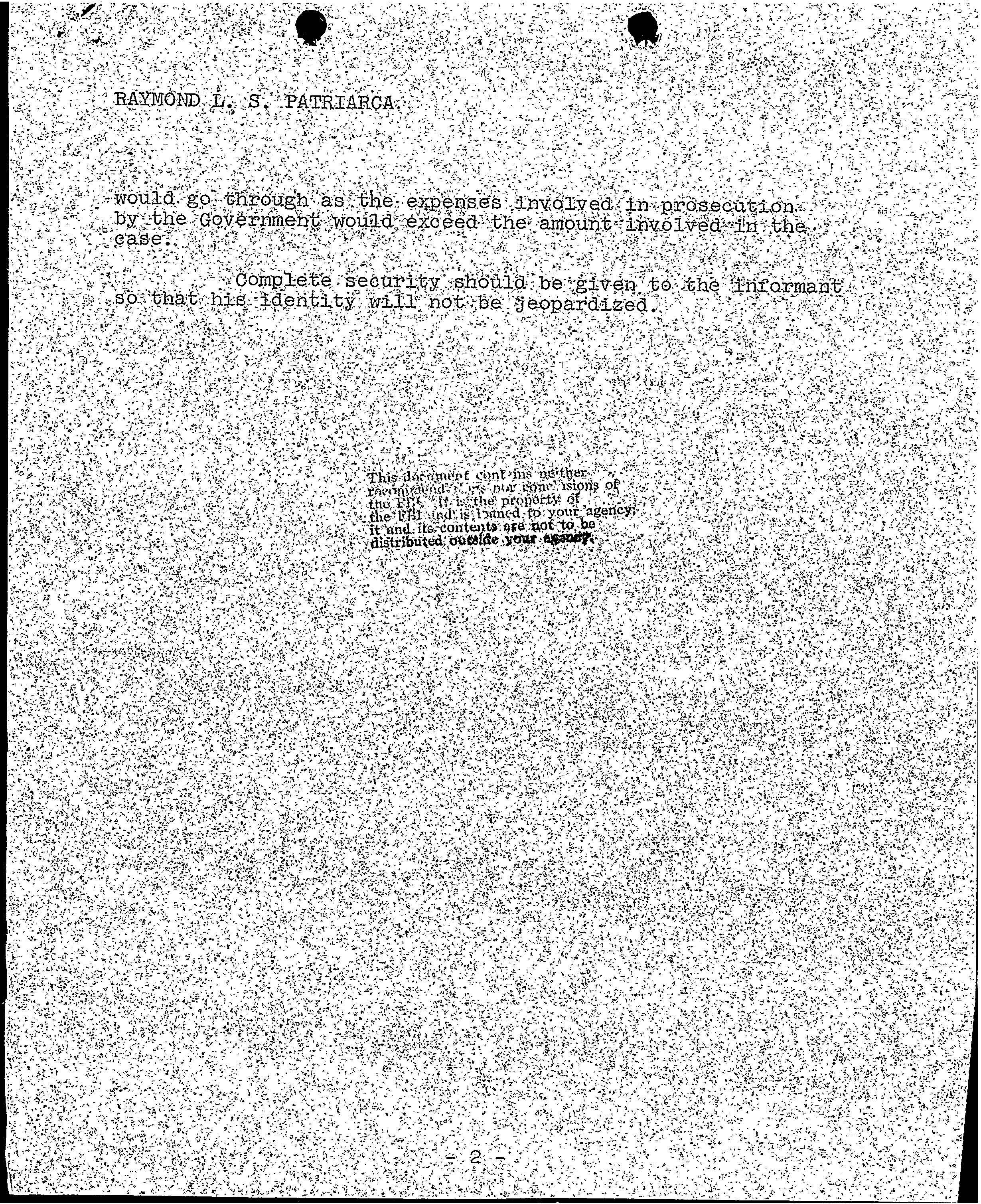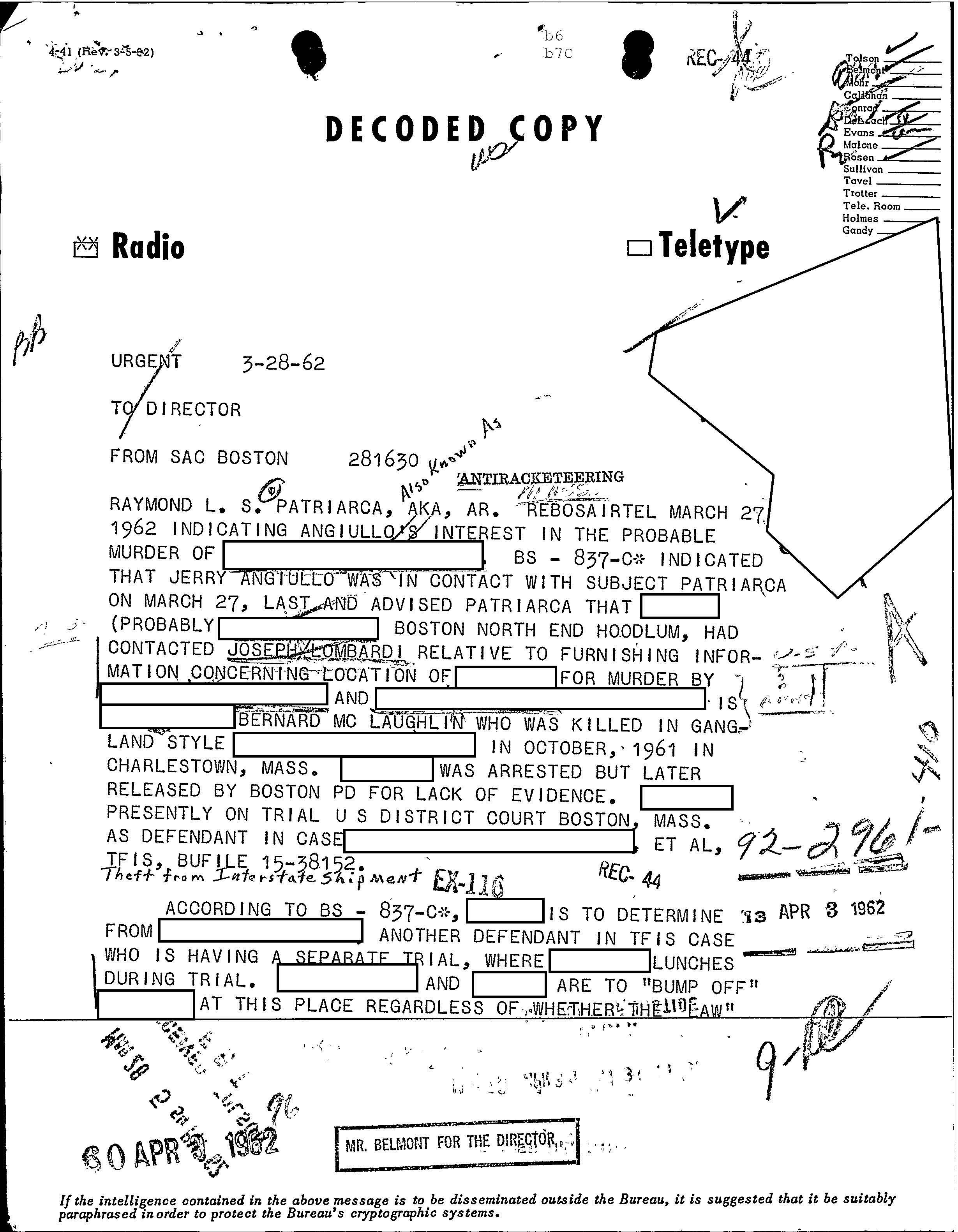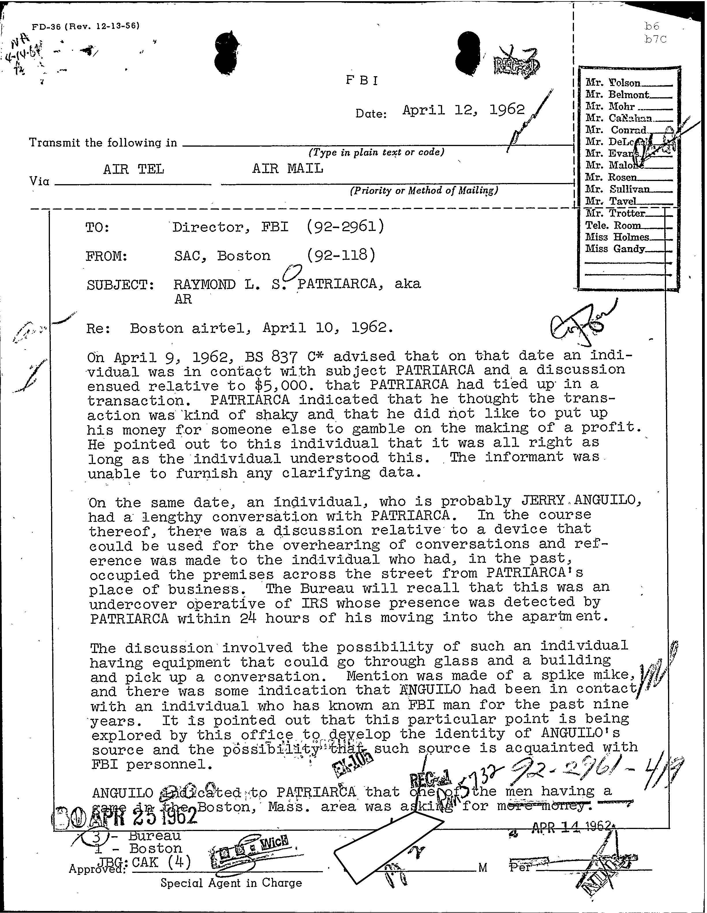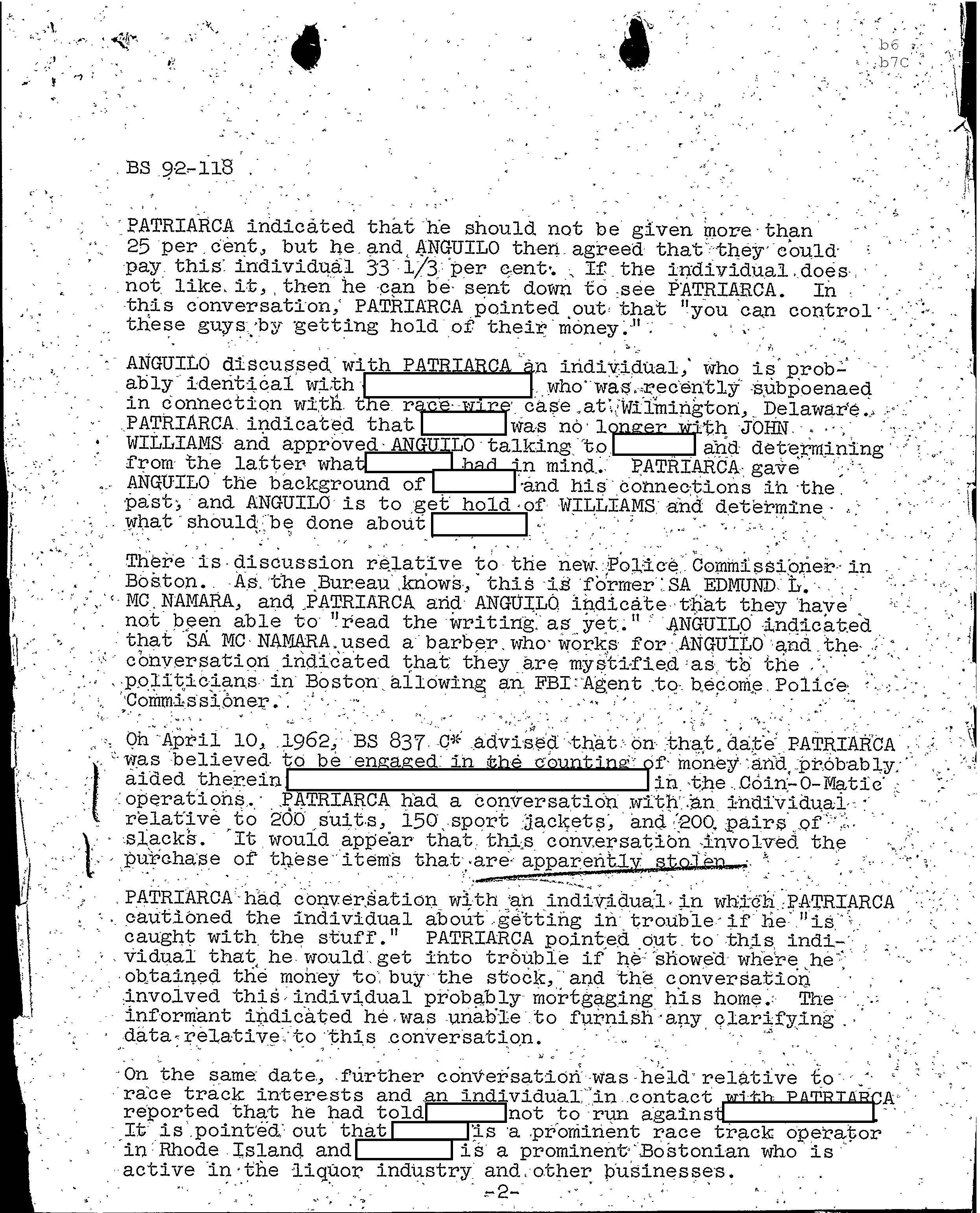 The FBI got information that, “Patriarca had a conversation with an individual relative to 200 suits, 150 sports jackets, and 200 pairs of slacks. It would appear that this conversation involved the purchase of these stolen items that are apparently stolen.”