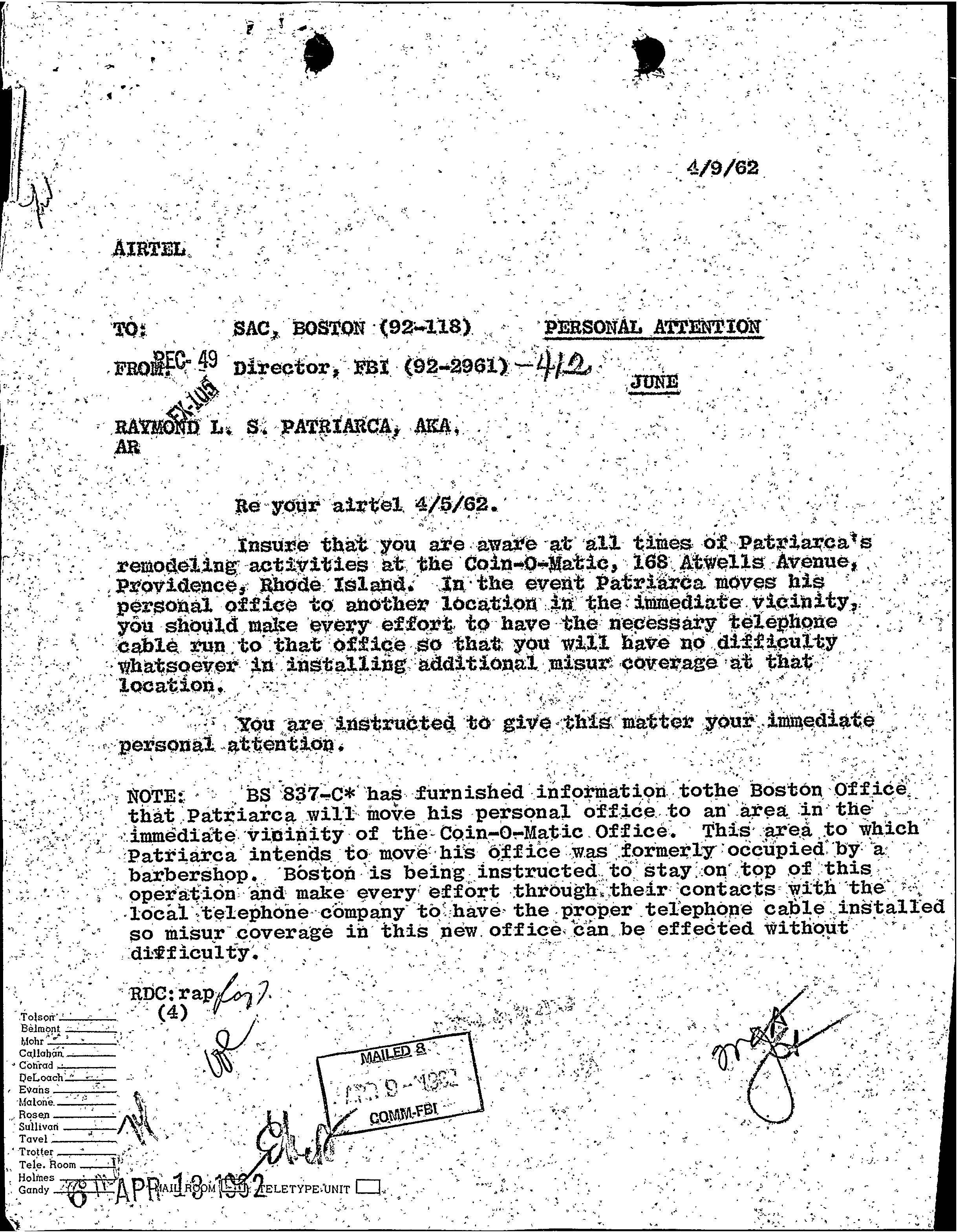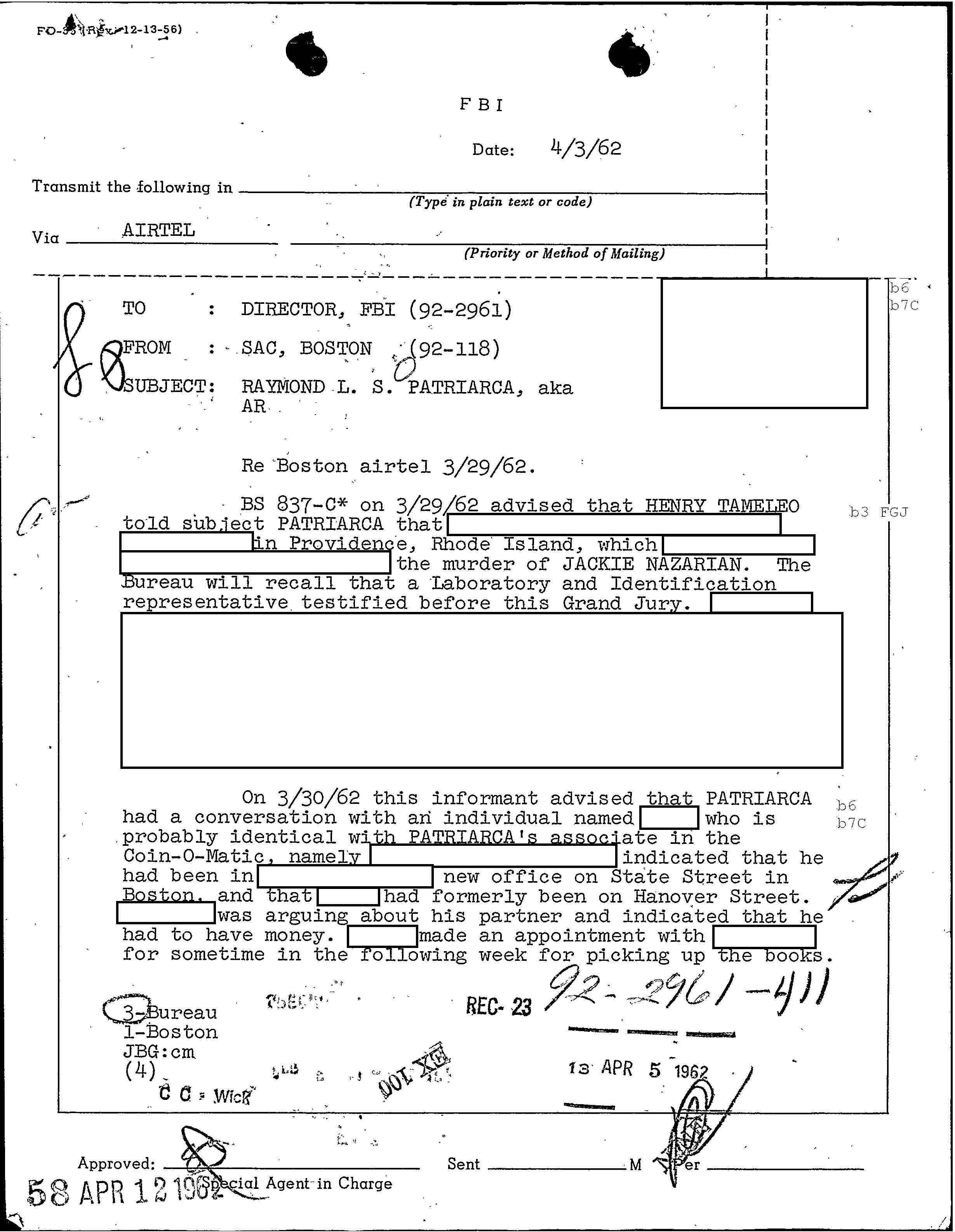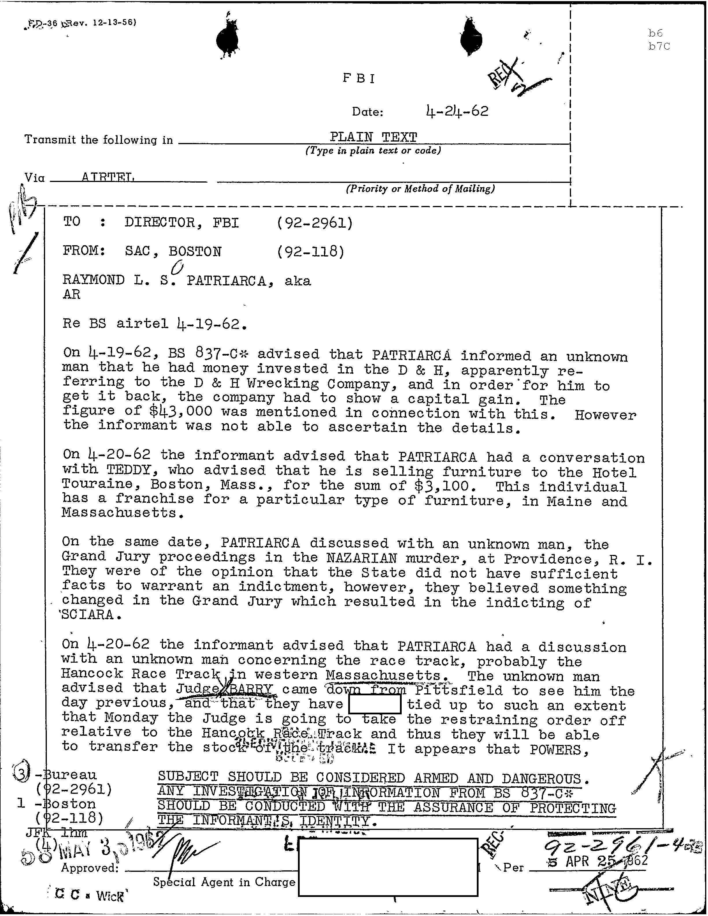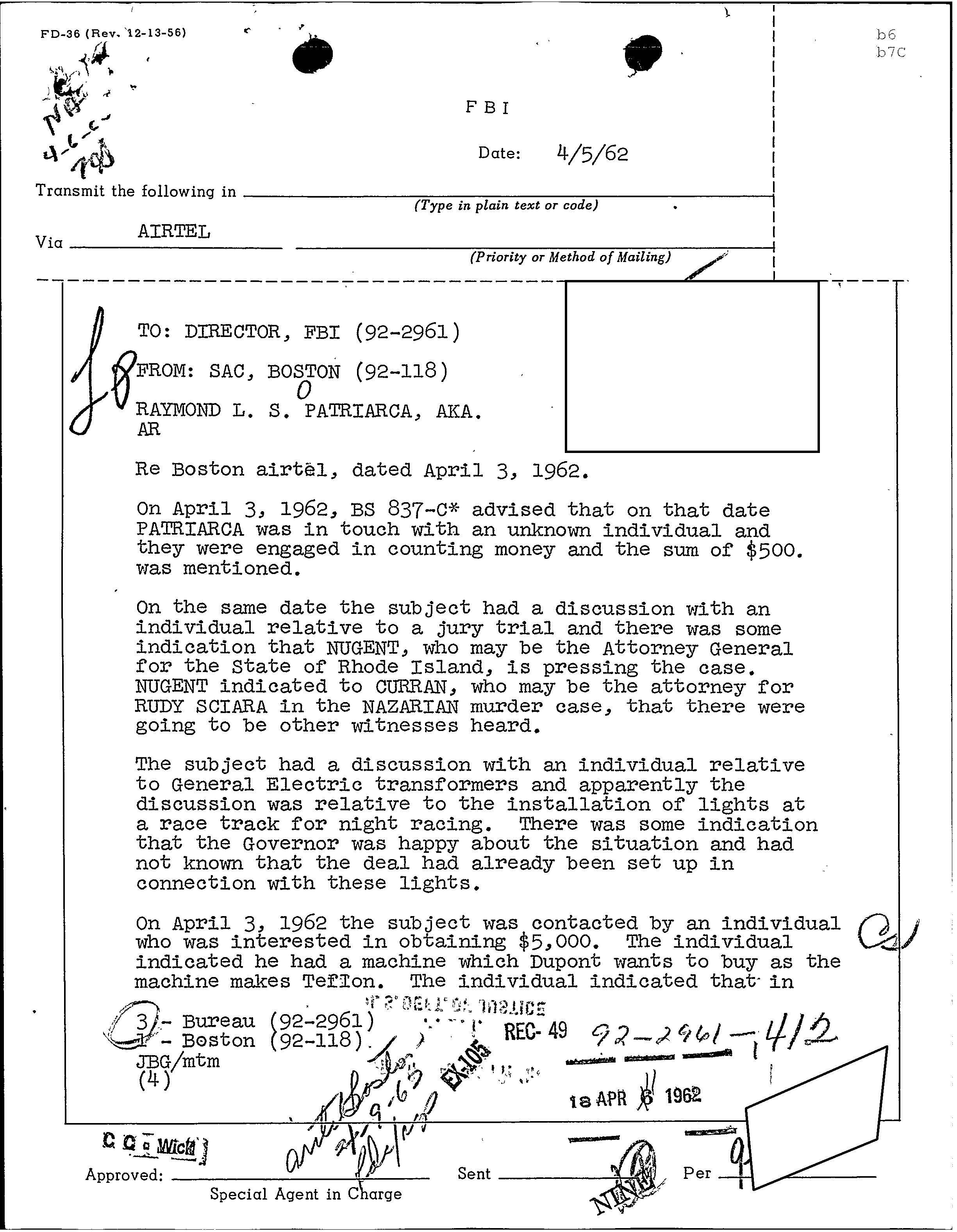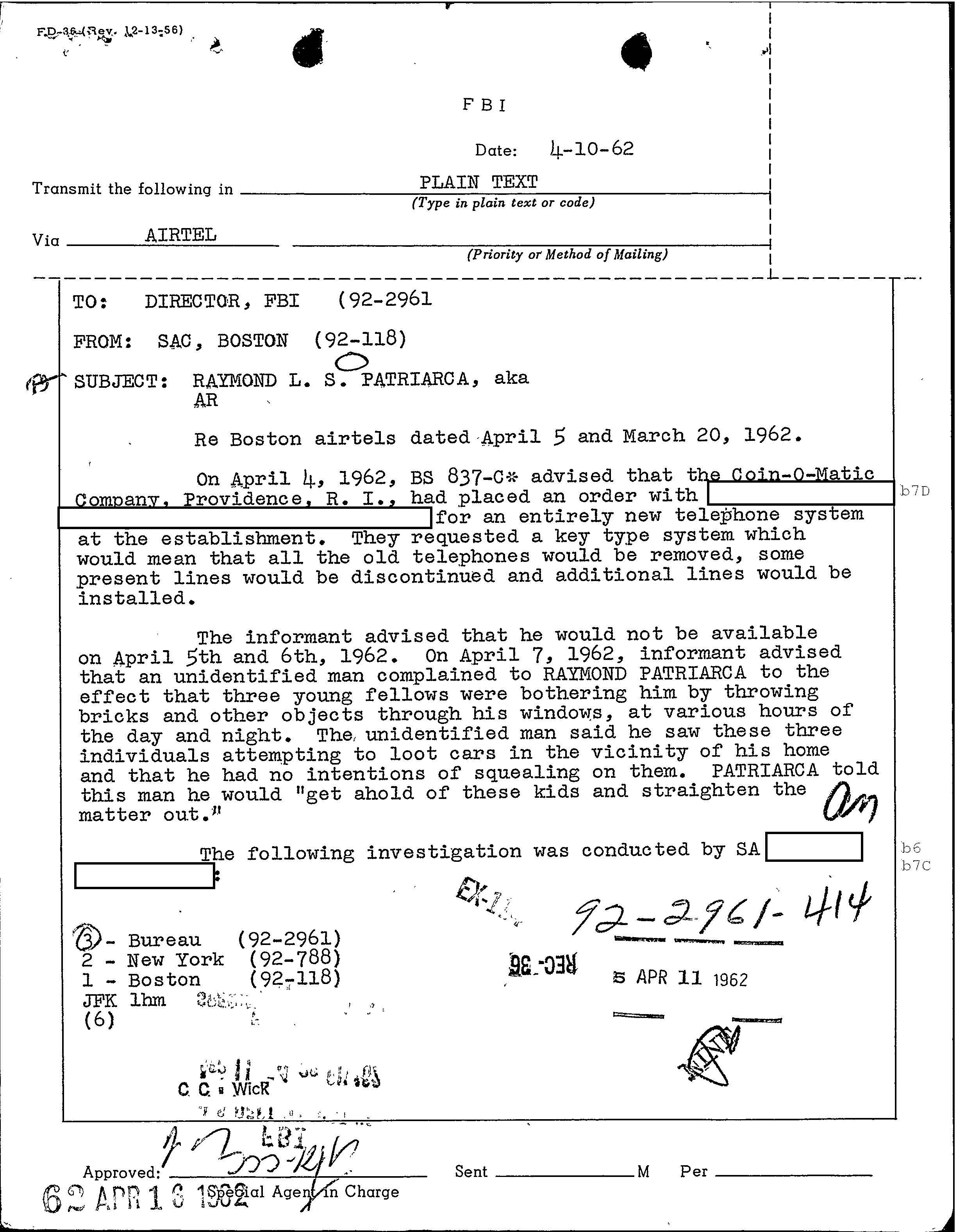 The FBI got information that, “Patriarca had a conversation with an individual relative to 200 suits, 150 sports jackets, and 200 pairs of slacks. It would appear that this conversation involved the purchase of these stolen items that are apparently stolen.”
