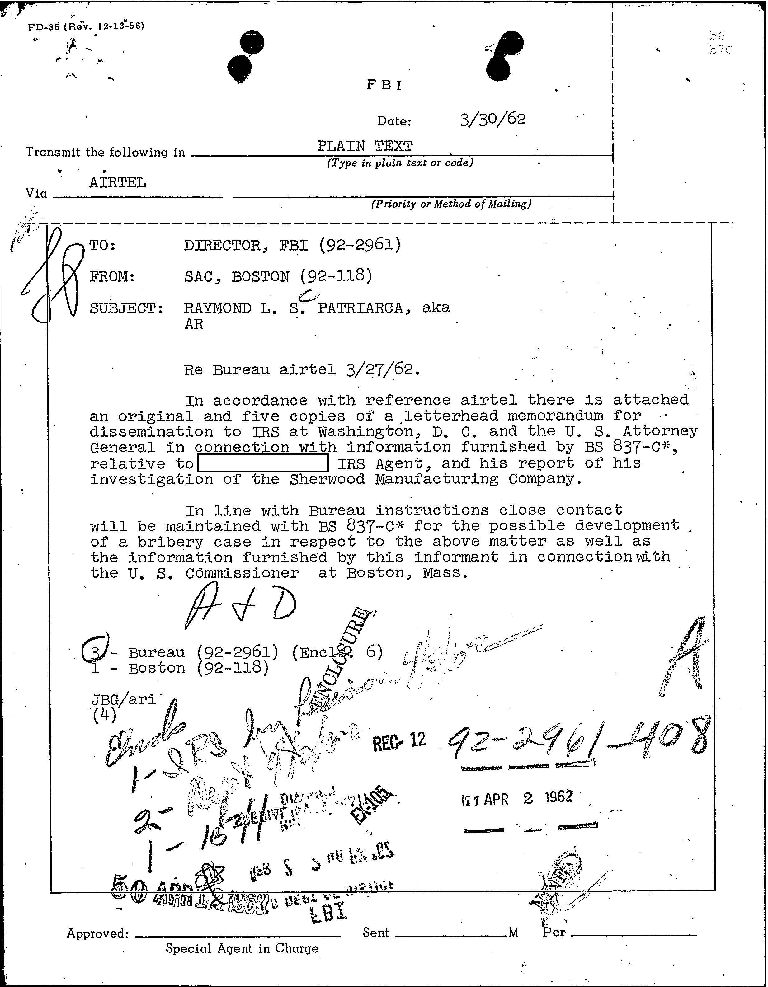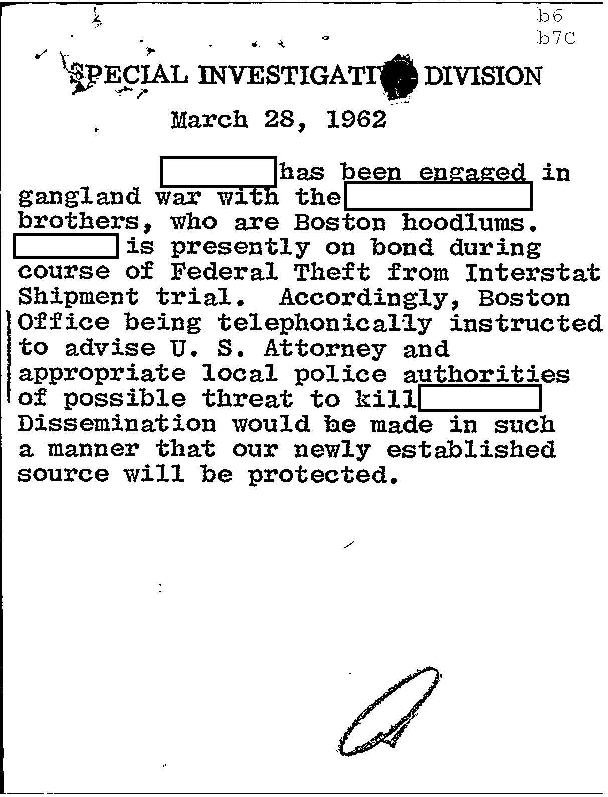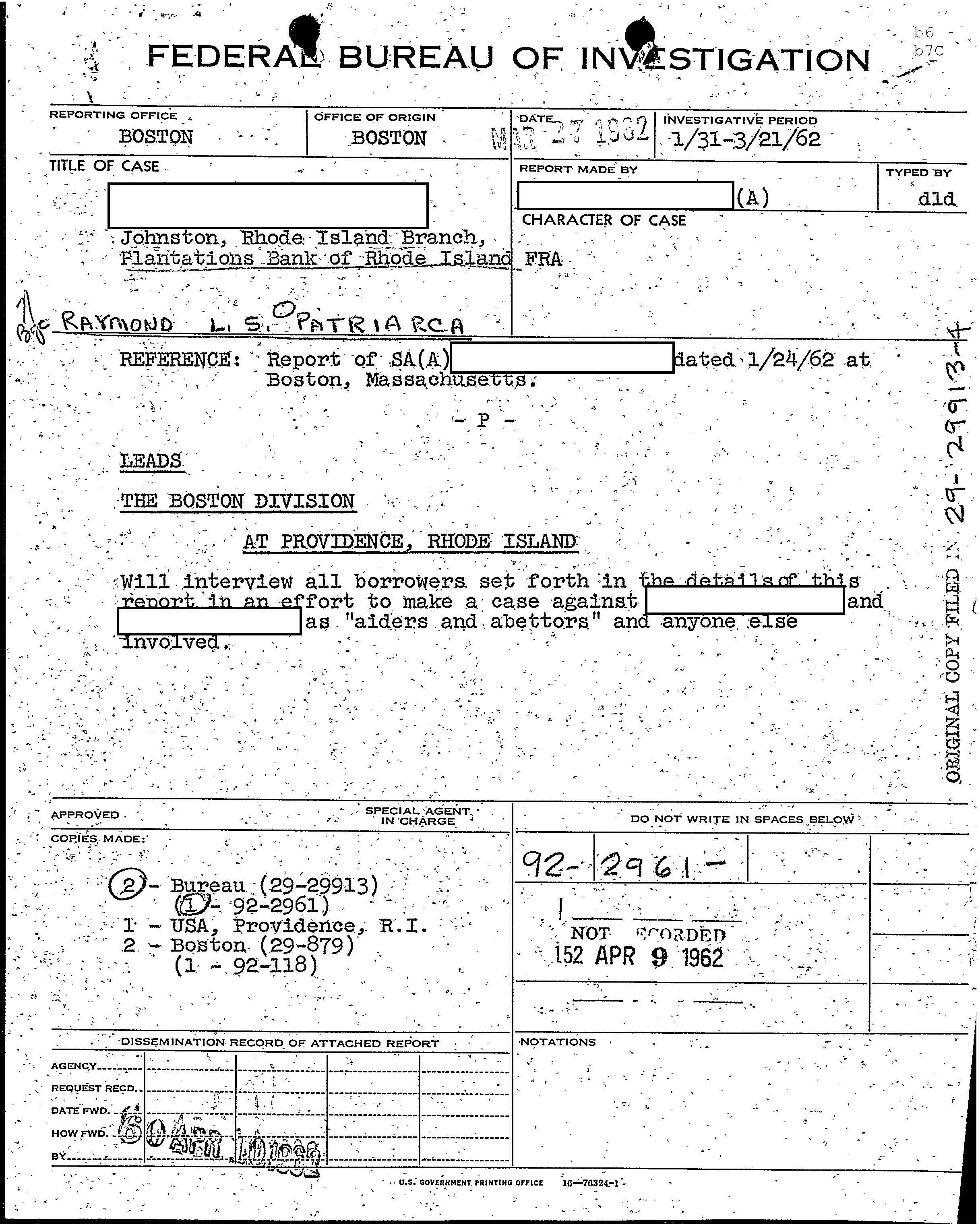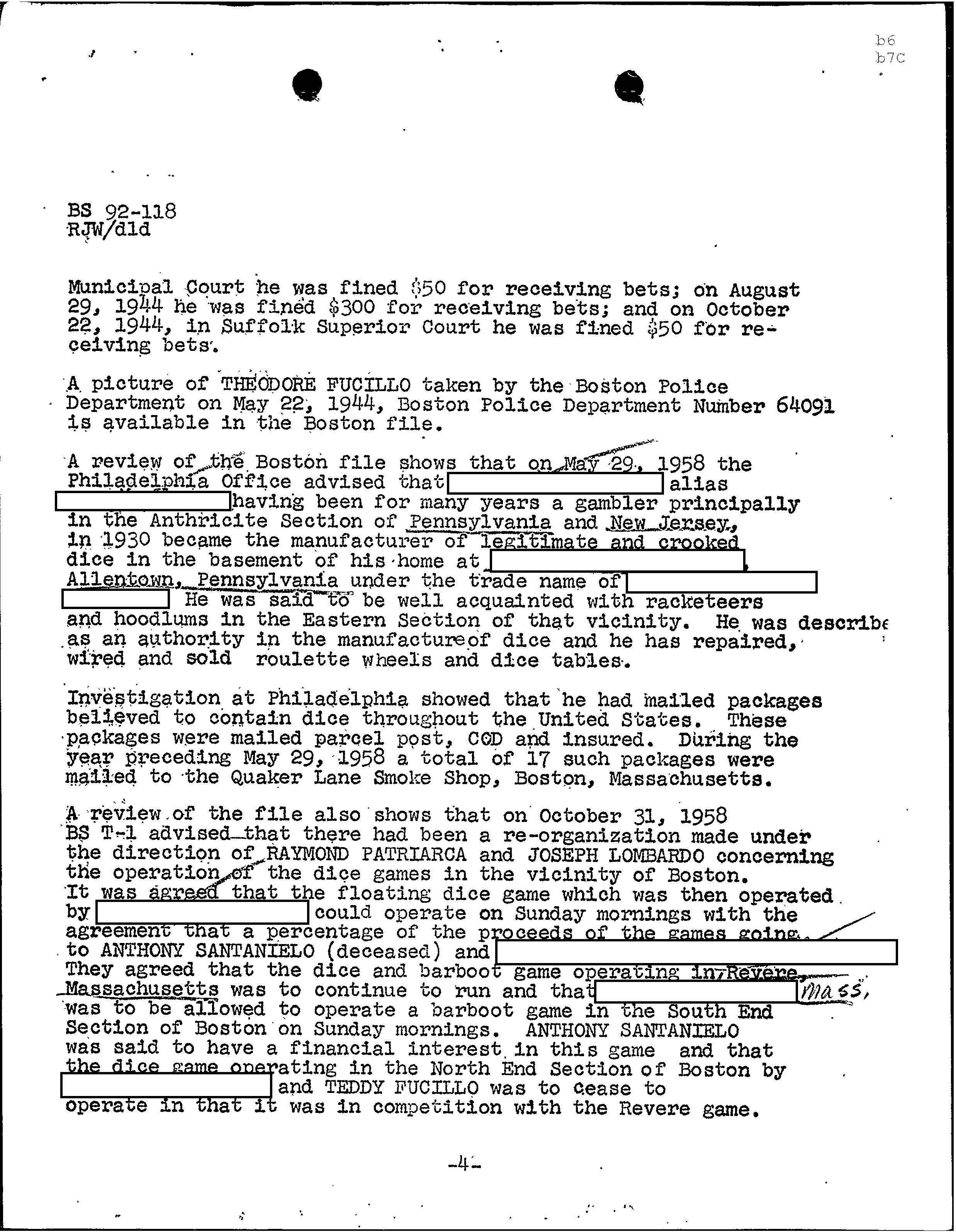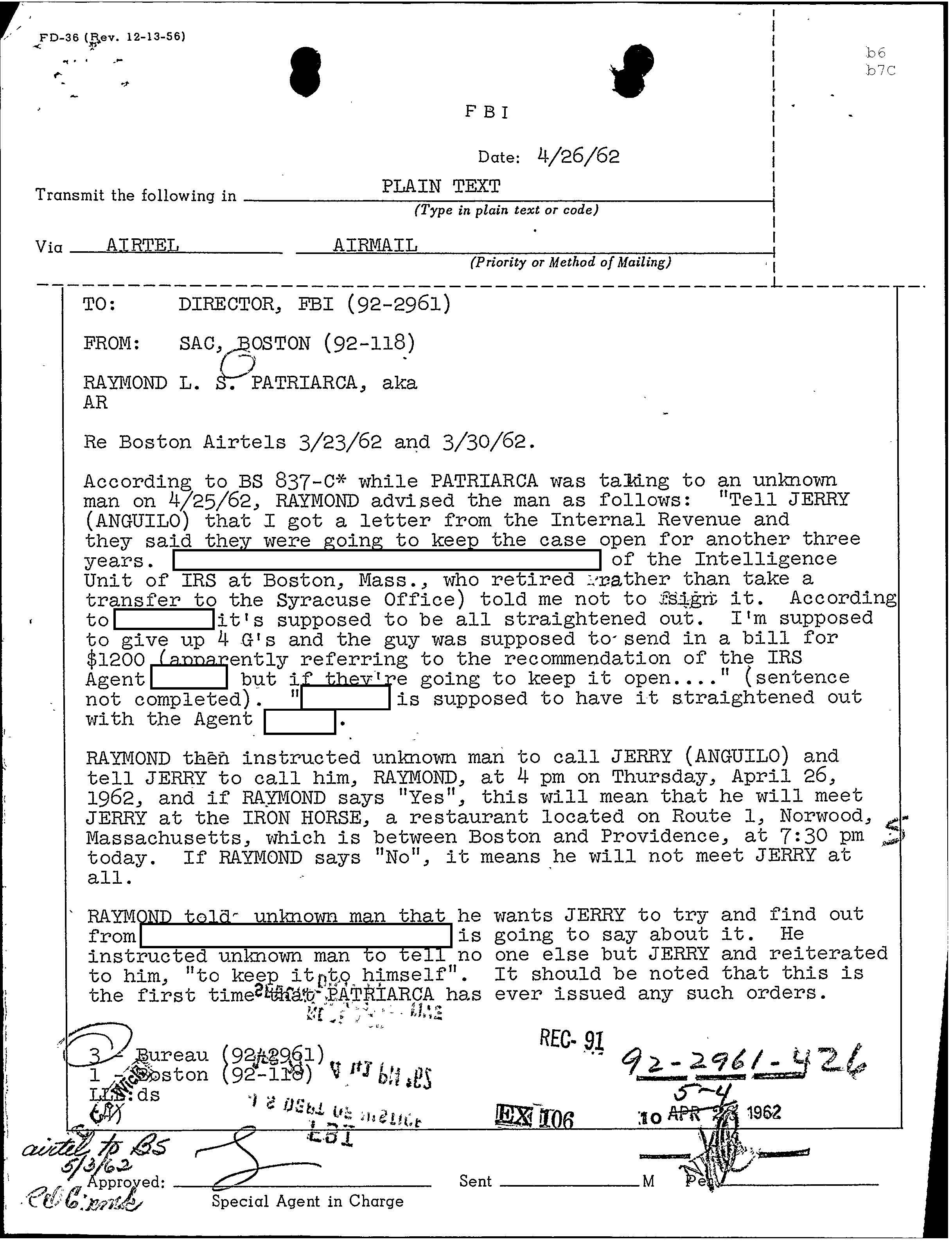 The FBI got information that, “Patriarca had a conversation with an individual relative to 200 suits, 150 sports jackets, and 200 pairs of slacks. It would appear that this conversation involved the purchase of these stolen items that are apparently stolen.”