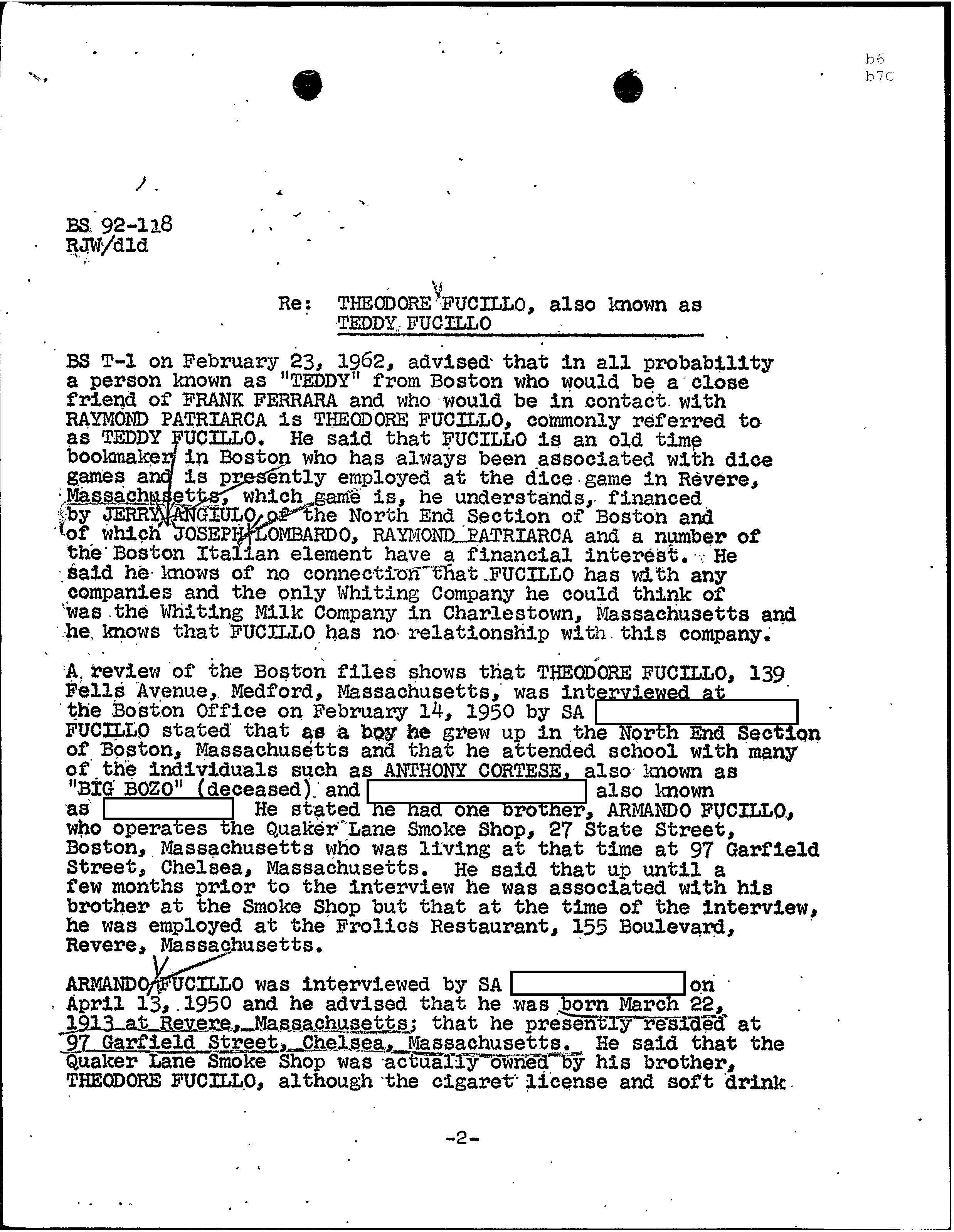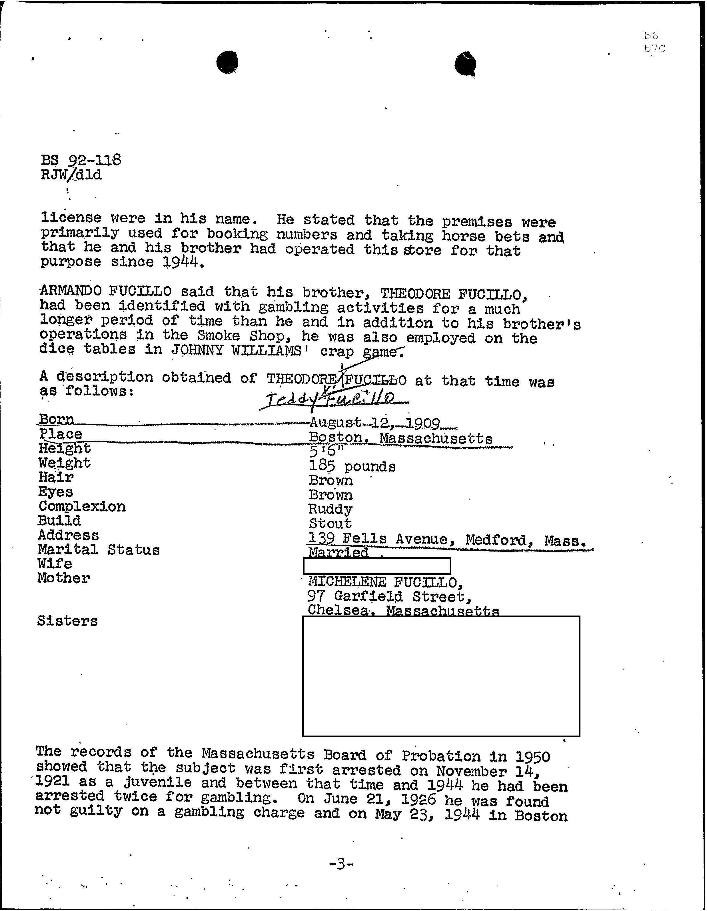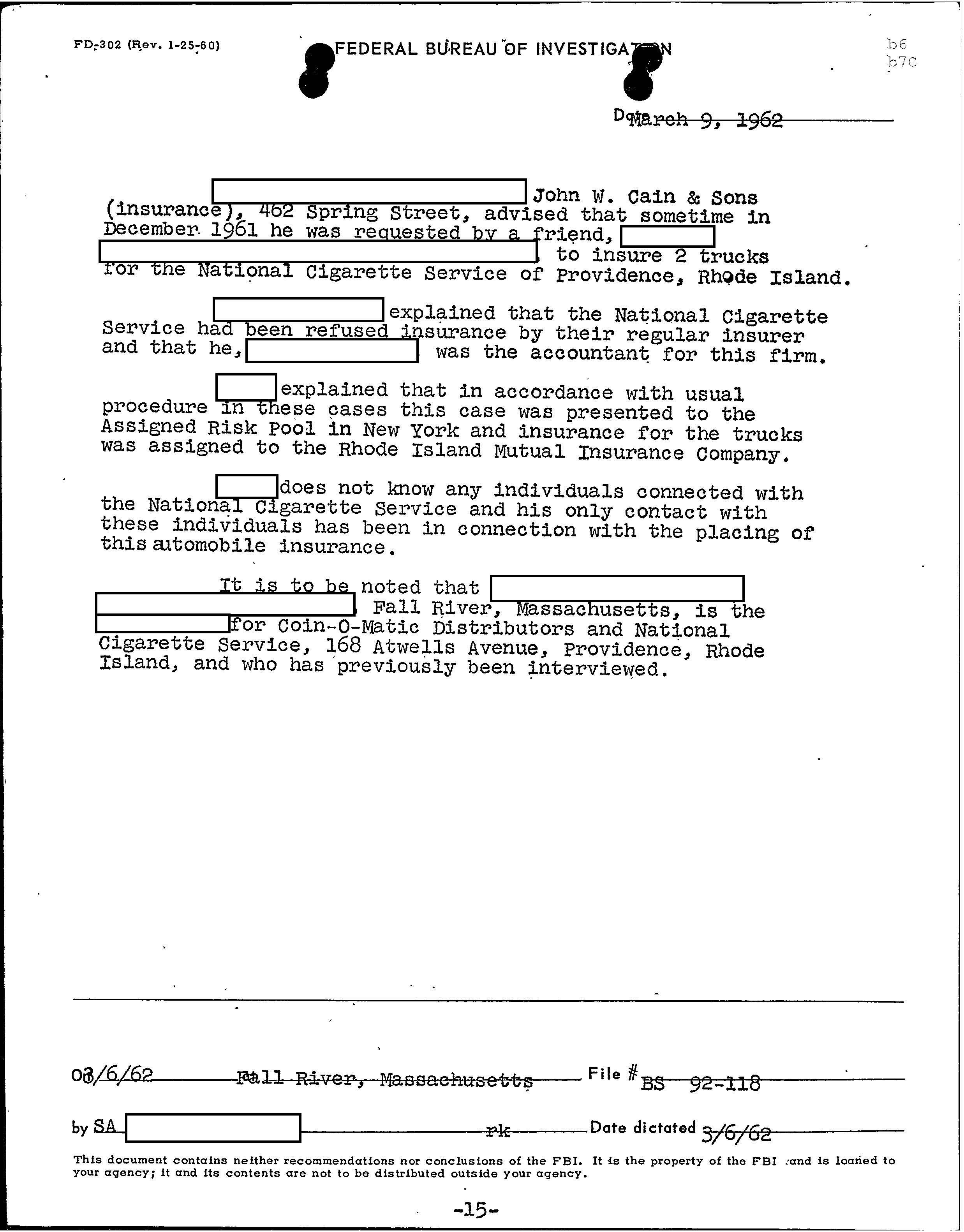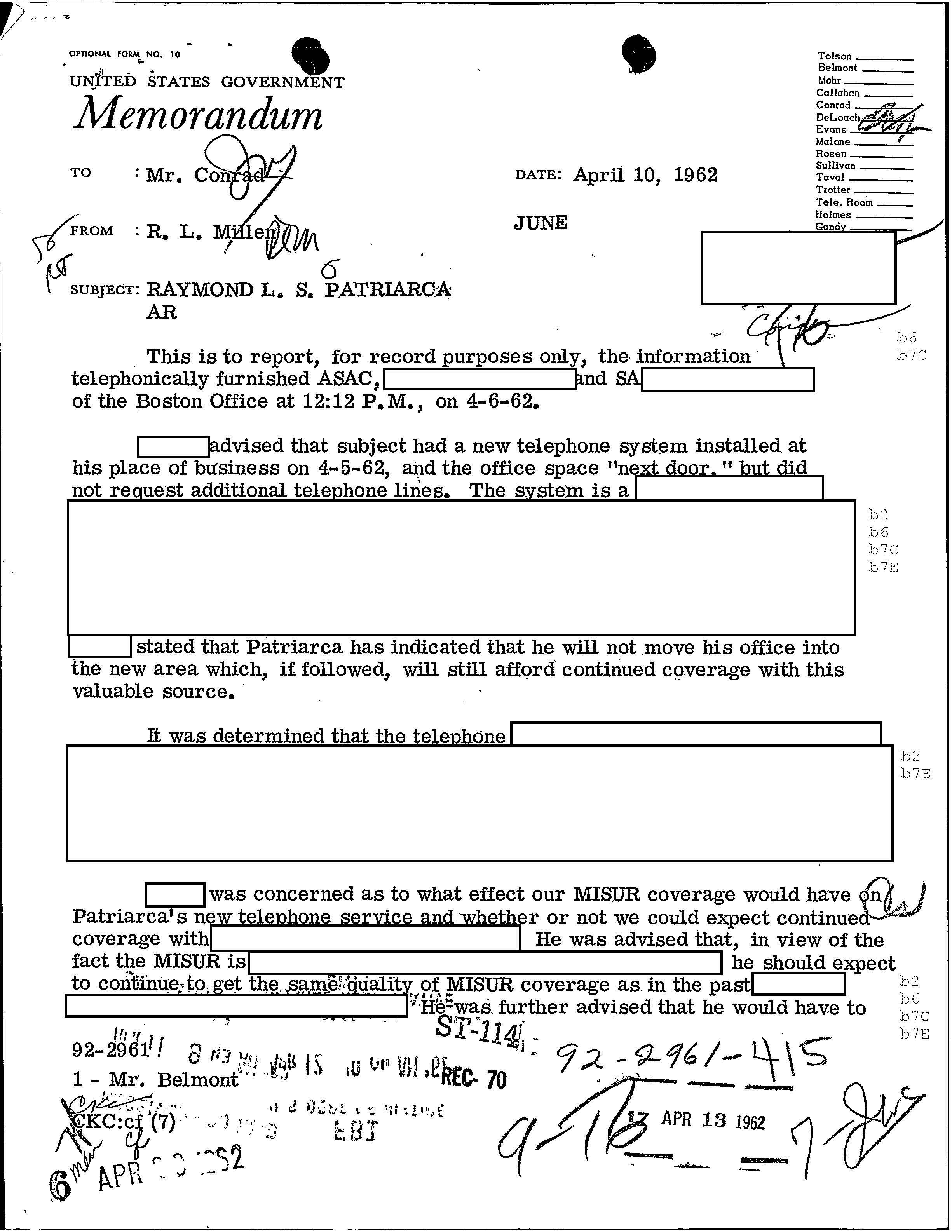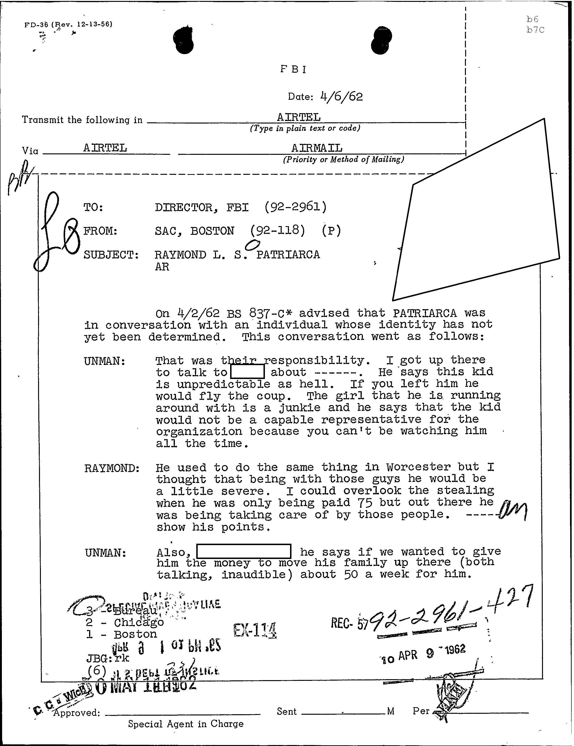 The FBI got information that, “Patriarca had a conversation with an individual relative to 200 suits, 150 sports jackets, and 200 pairs of slacks. It would appear that this conversation involved the purchase of these stolen items that are apparently stolen.”