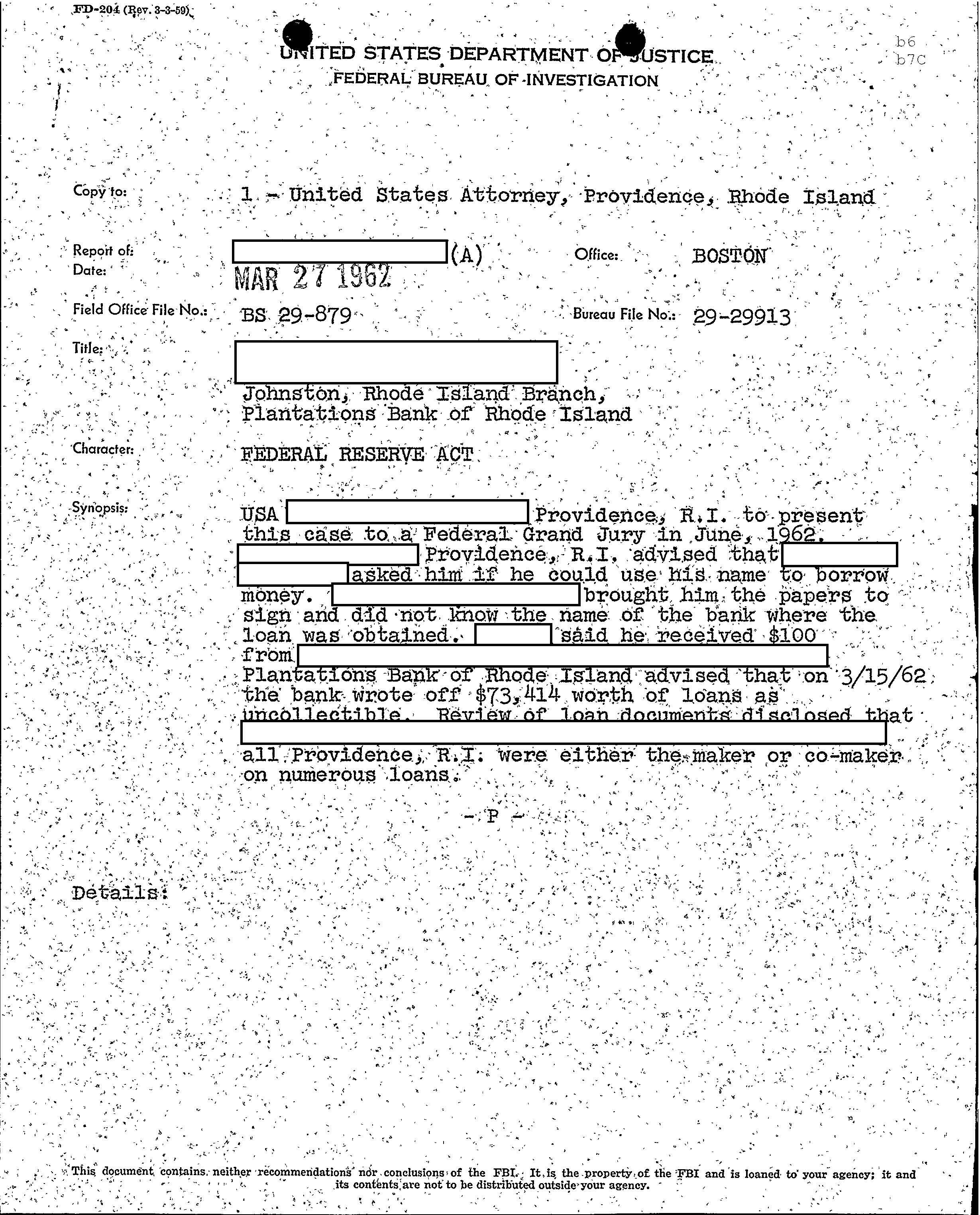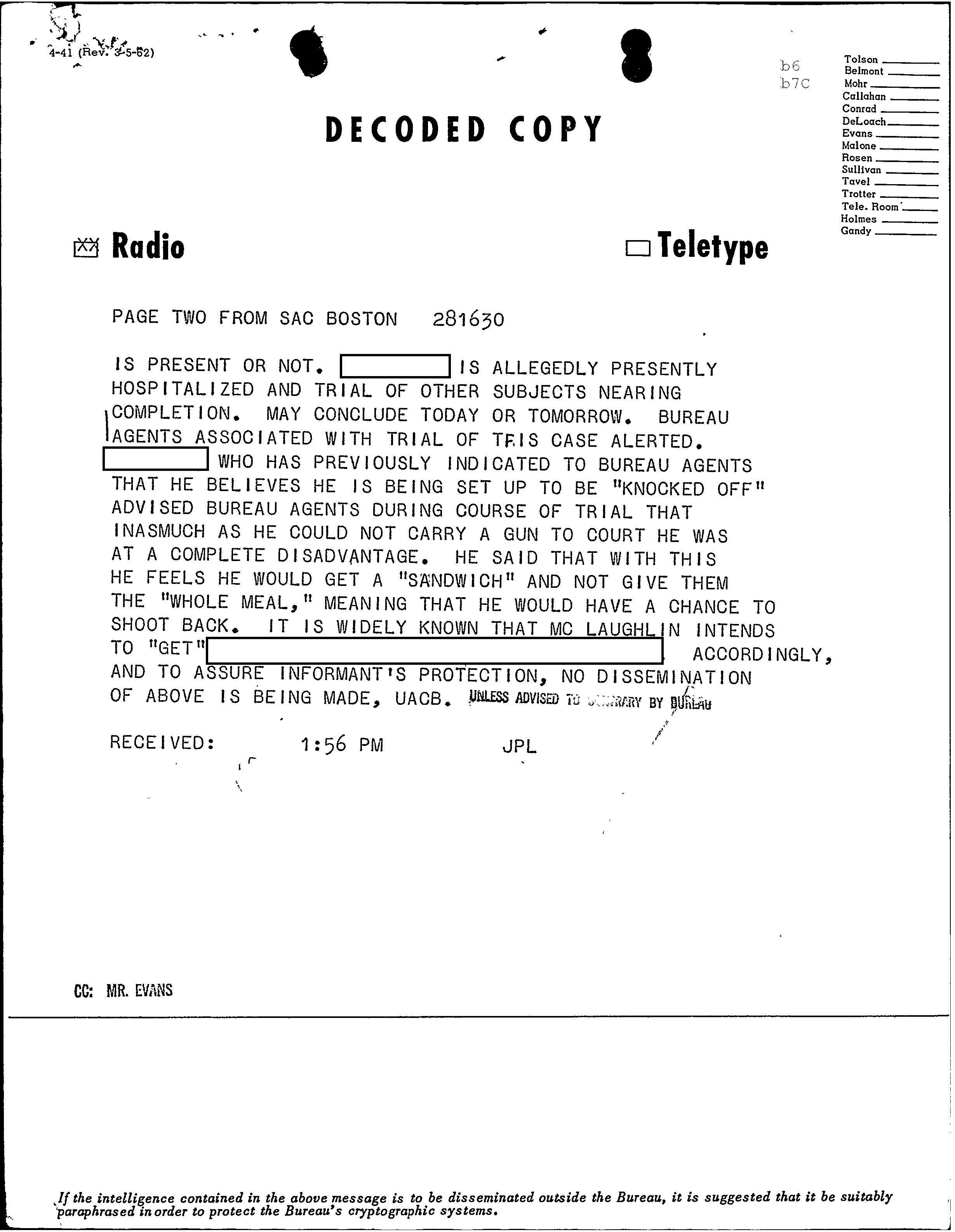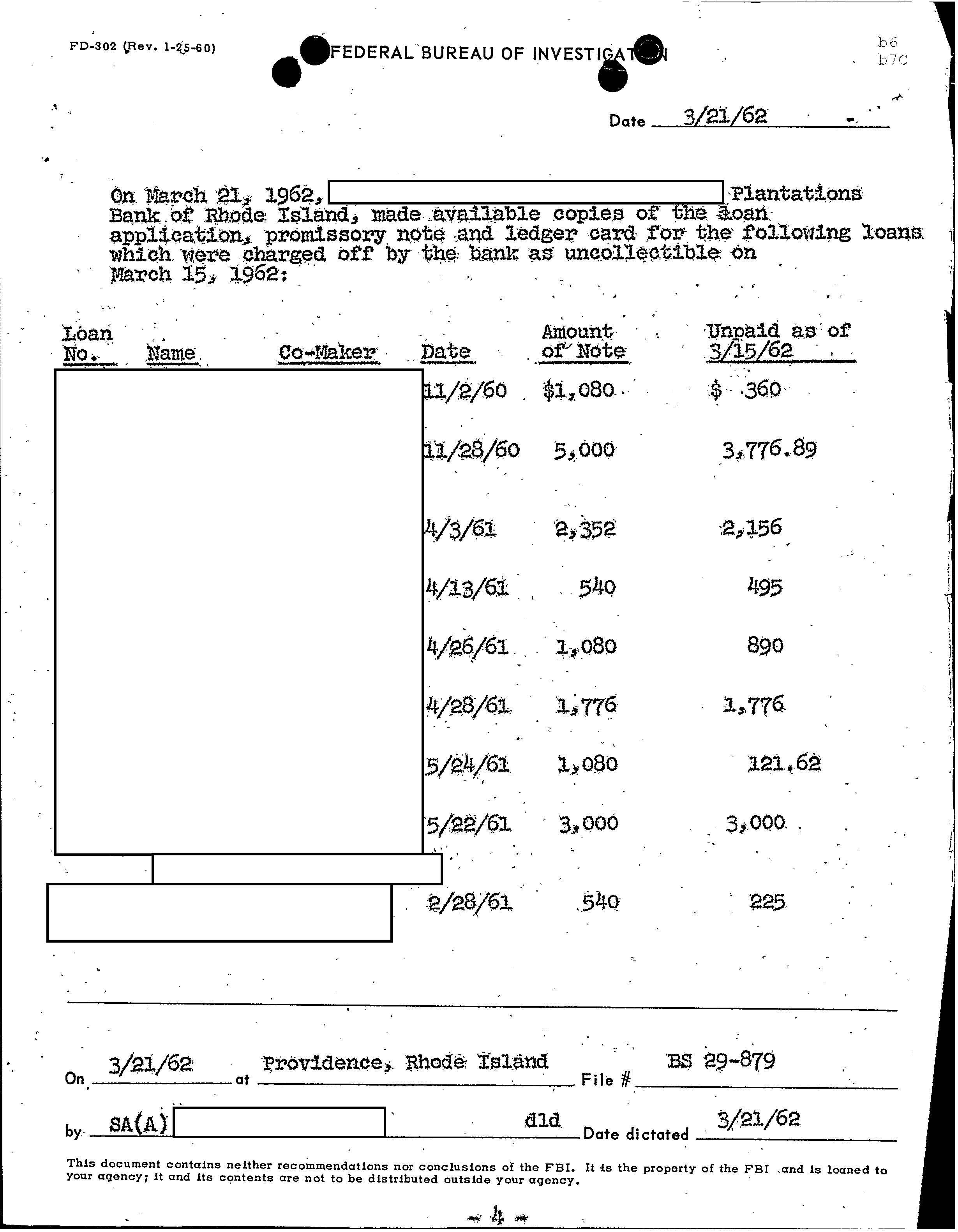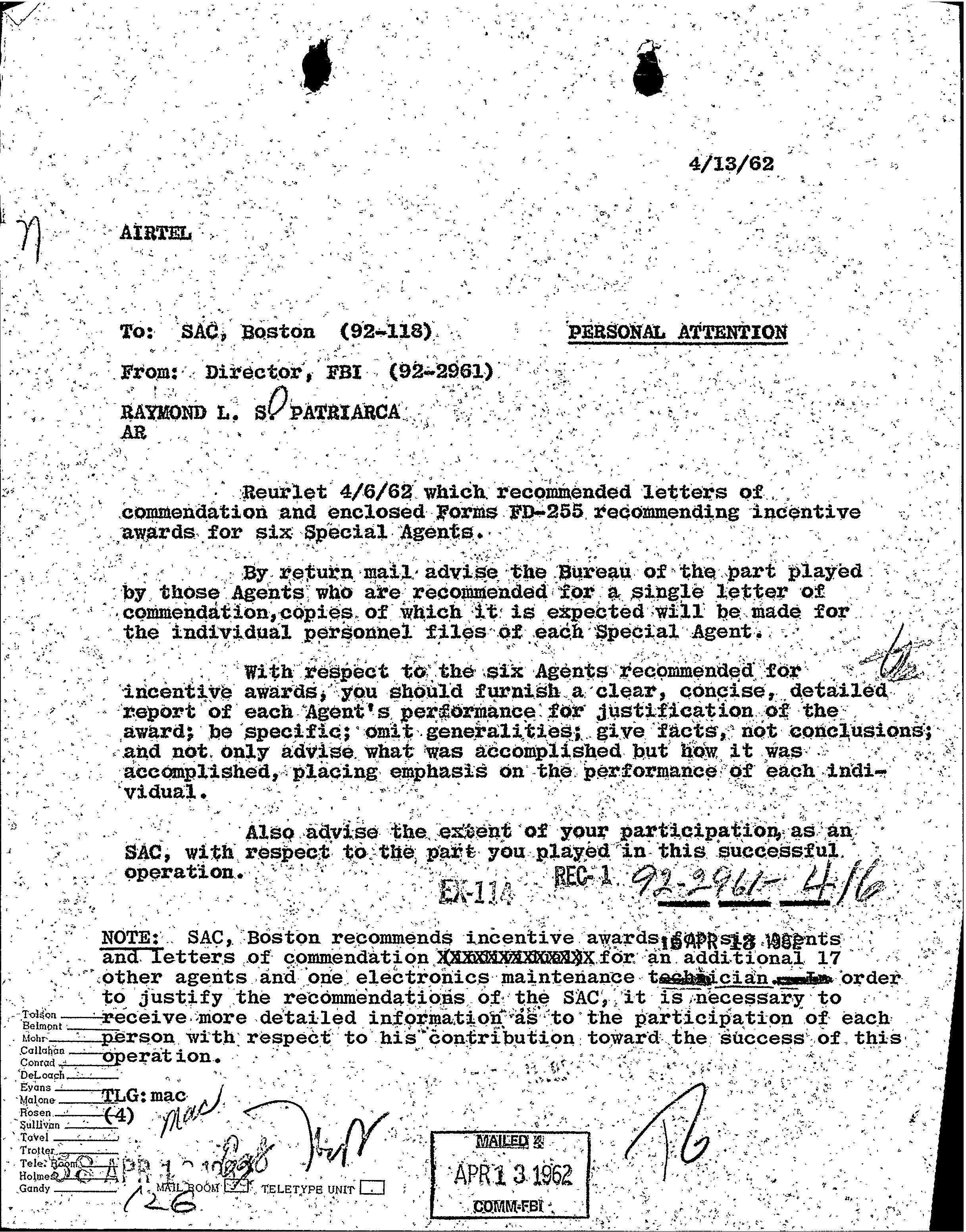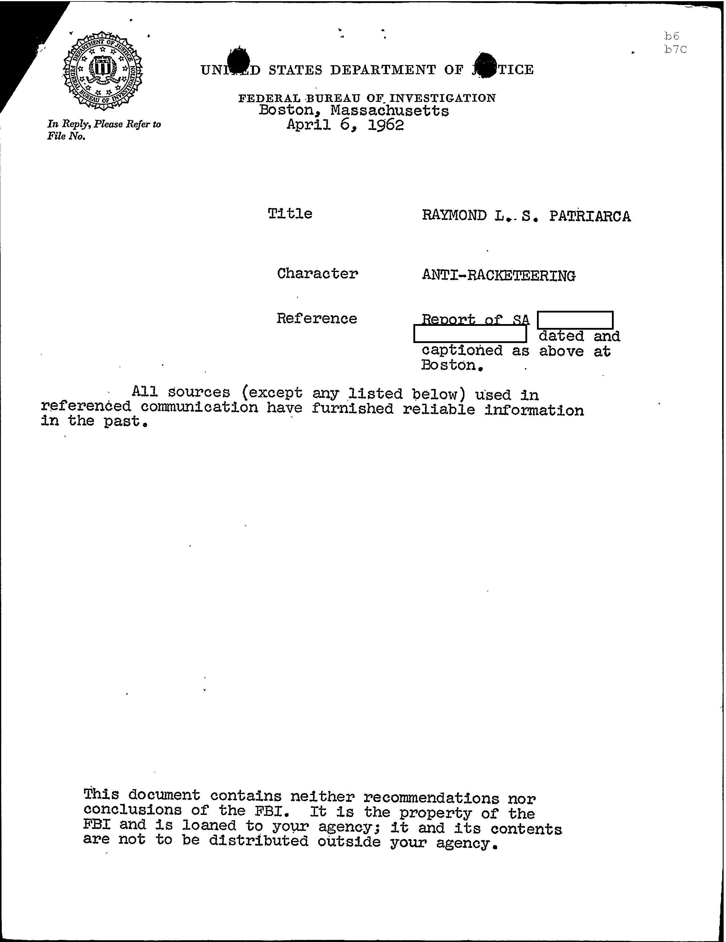 The FBI got information that, “Patriarca had a conversation with an individual relative to 200 suits, 150 sports jackets, and 200 pairs of slacks. It would appear that this conversation involved the purchase of these stolen items that are apparently stolen.”