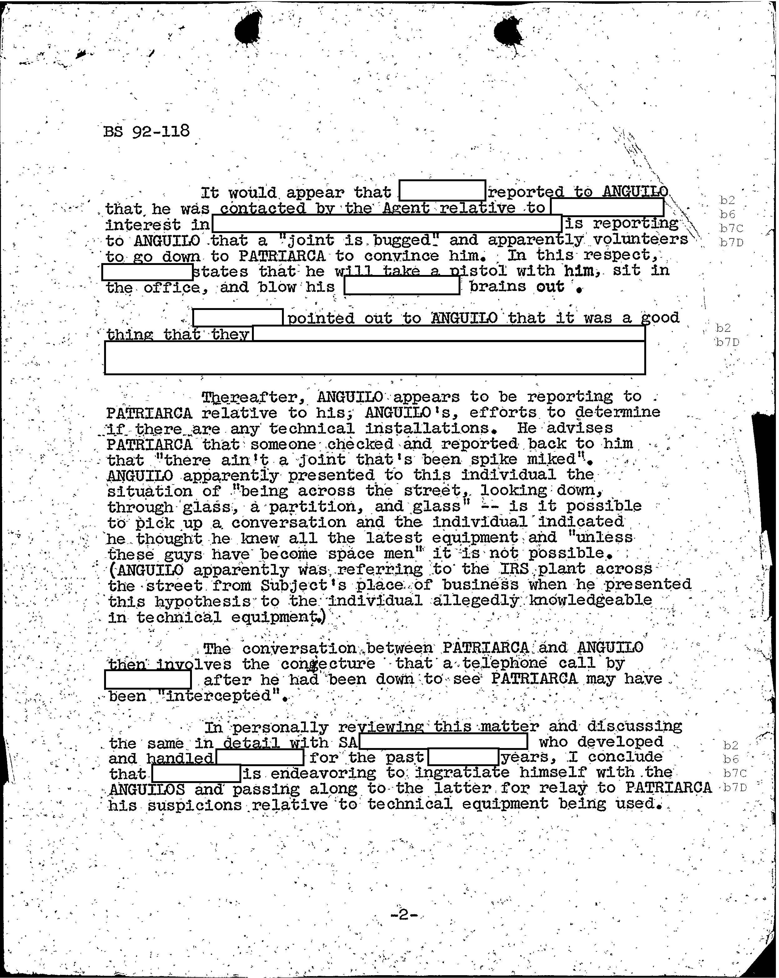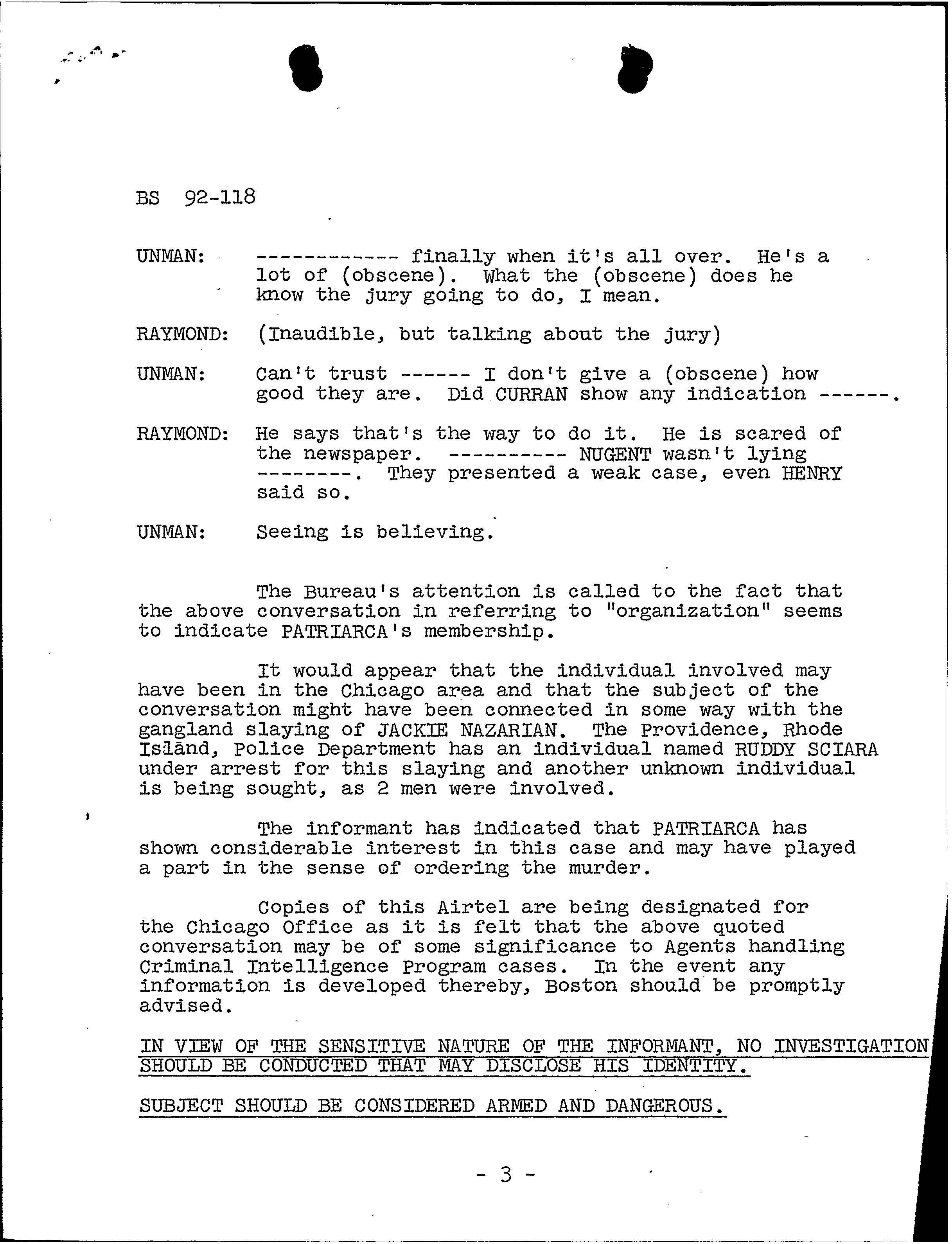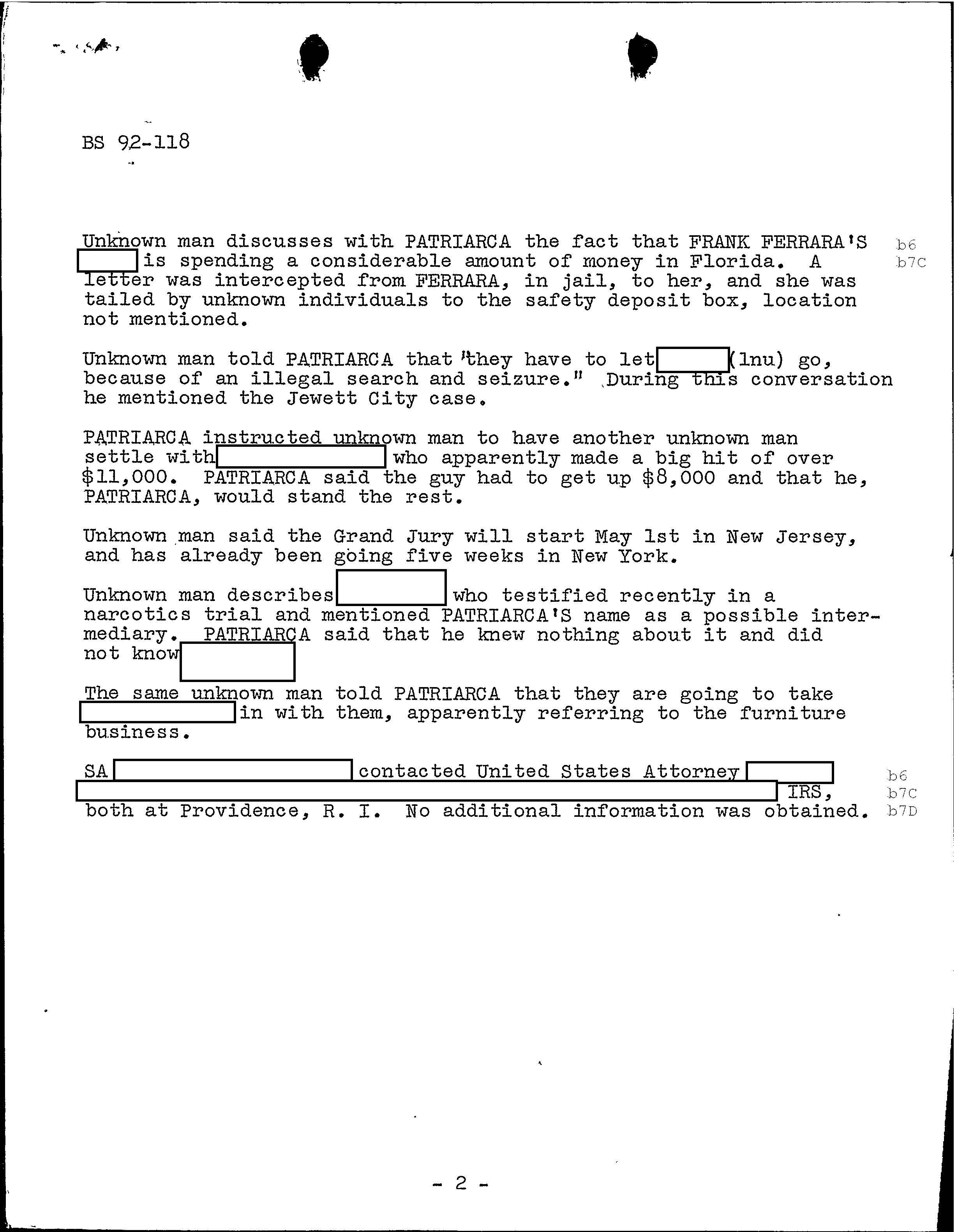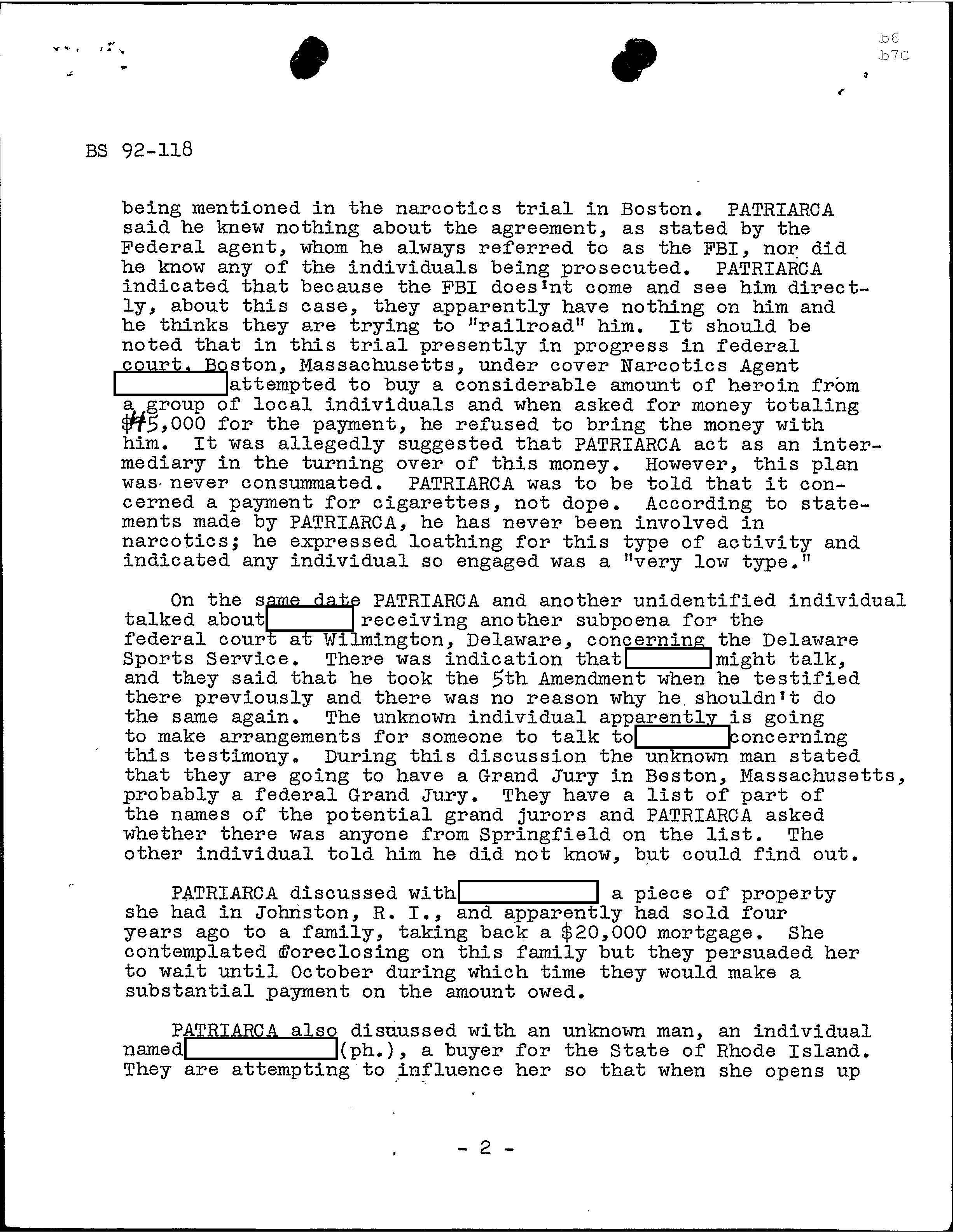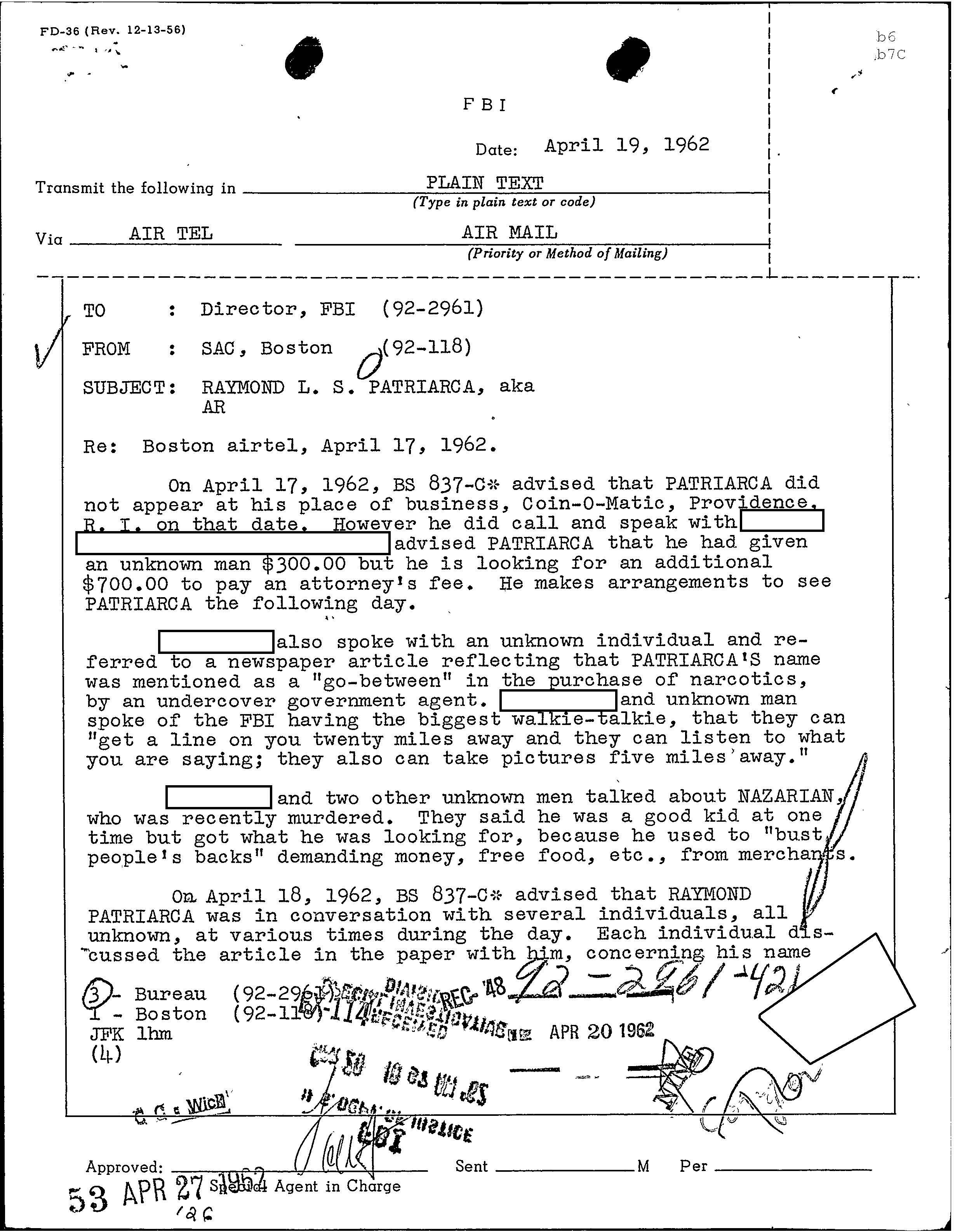 An individual mentioned a newspaper article, reflecting that Patriarca’s name was mentioned as a ‘go-between’ in the purchase of narcotics, by an undercover government agent. REDACTED and unknown man spoke of the FBI having the biggest walkie-talkie, that they can ‘get a line on you twenty miles away andy they can listen to what you are saying; they also can take pictures from five miles away.”