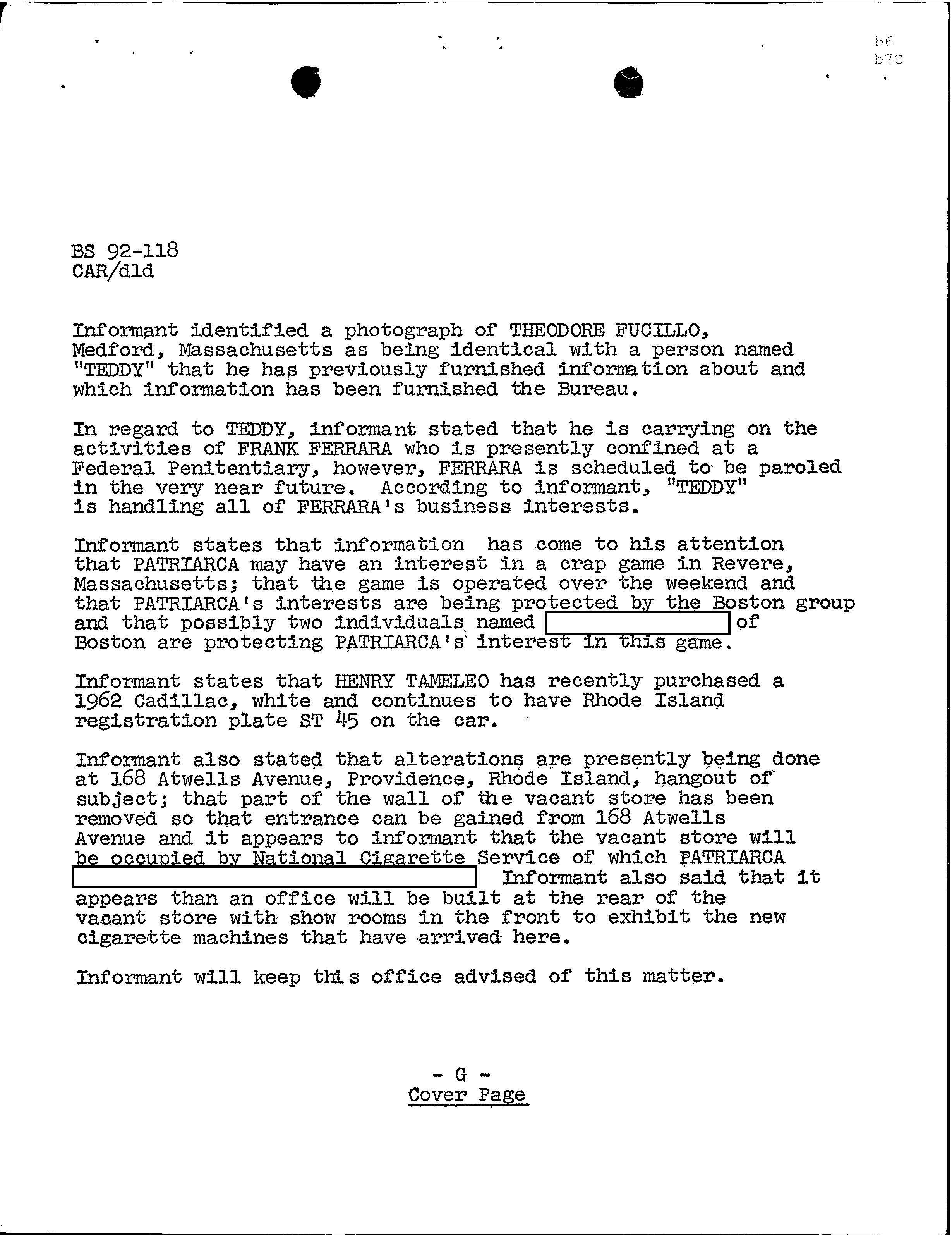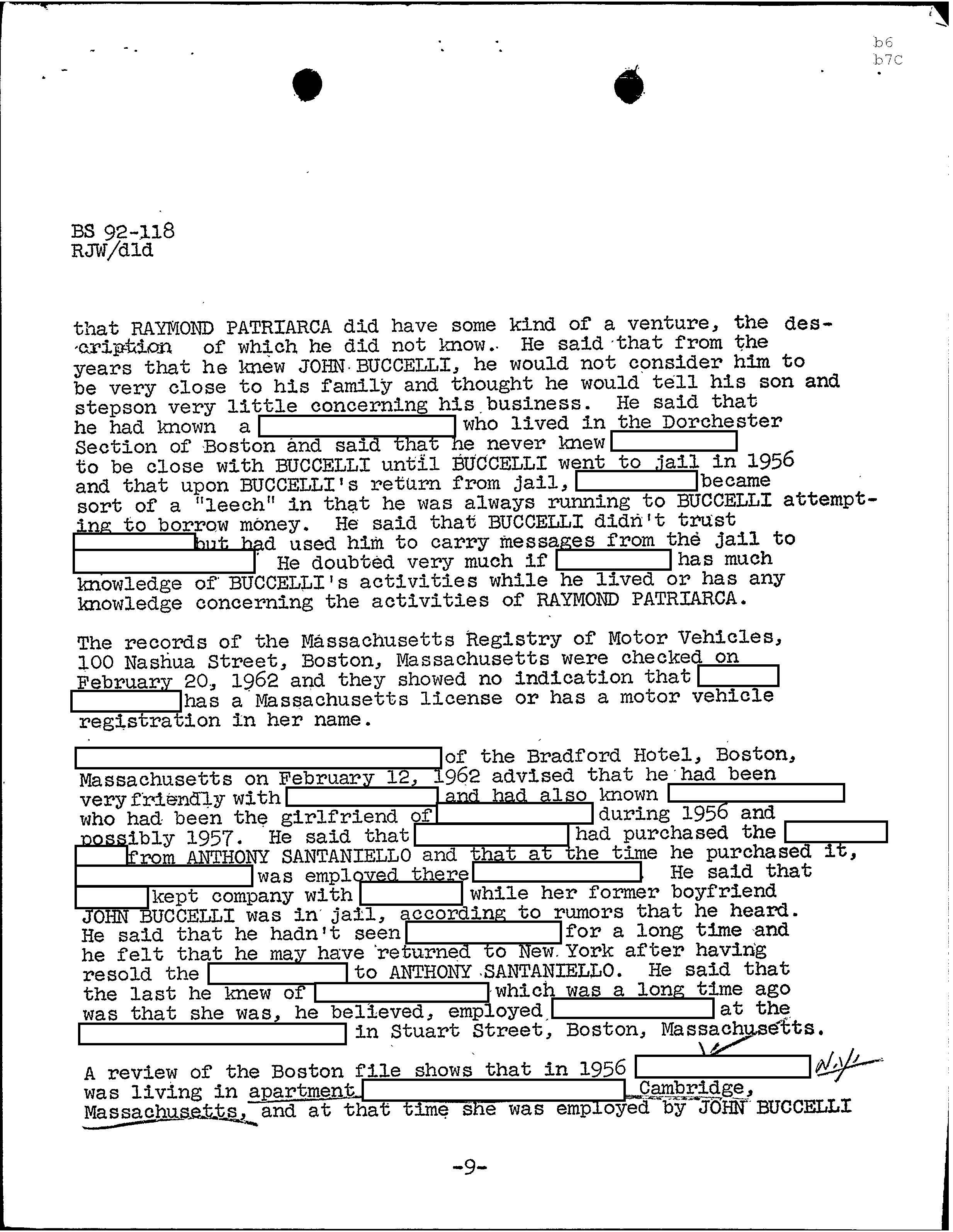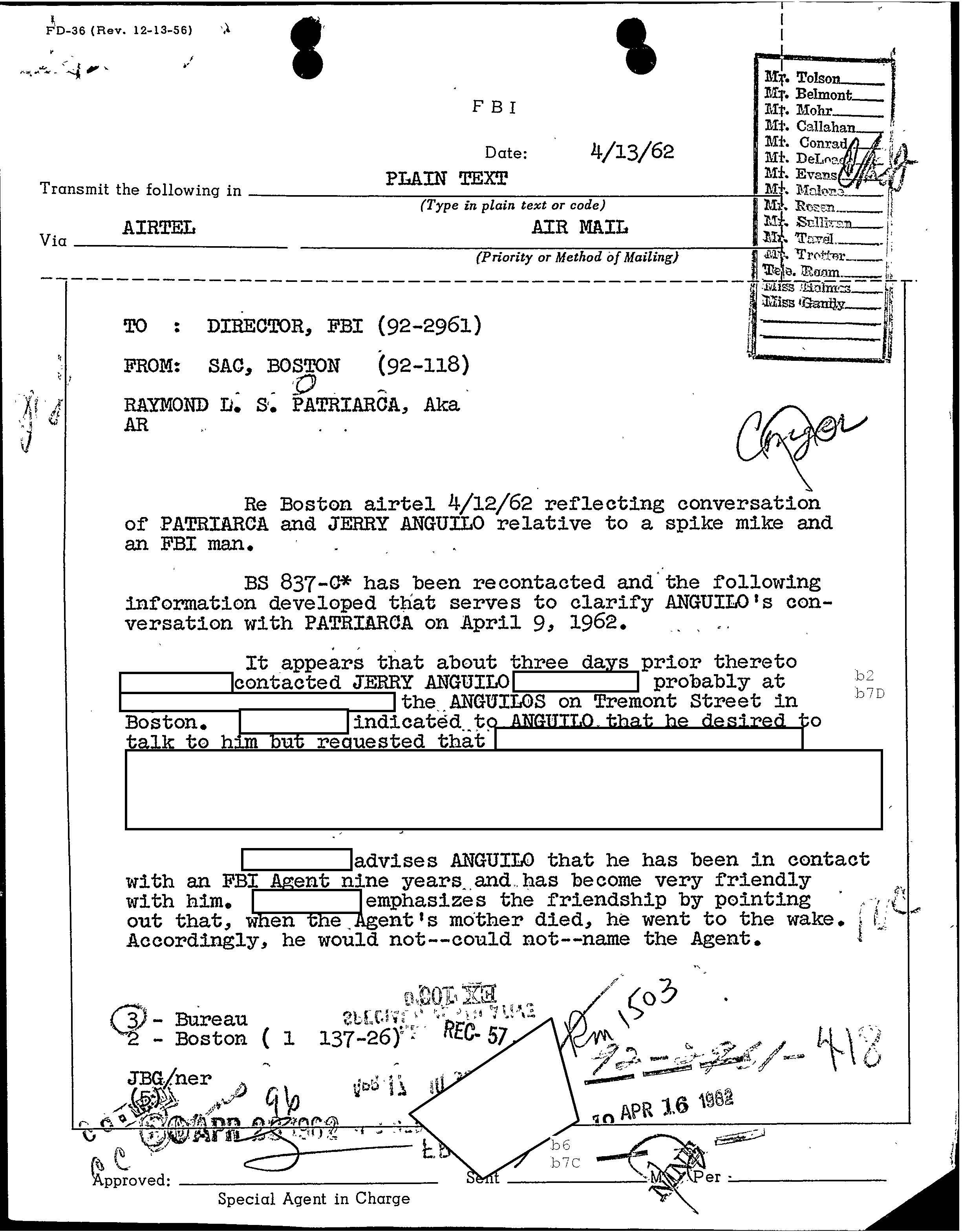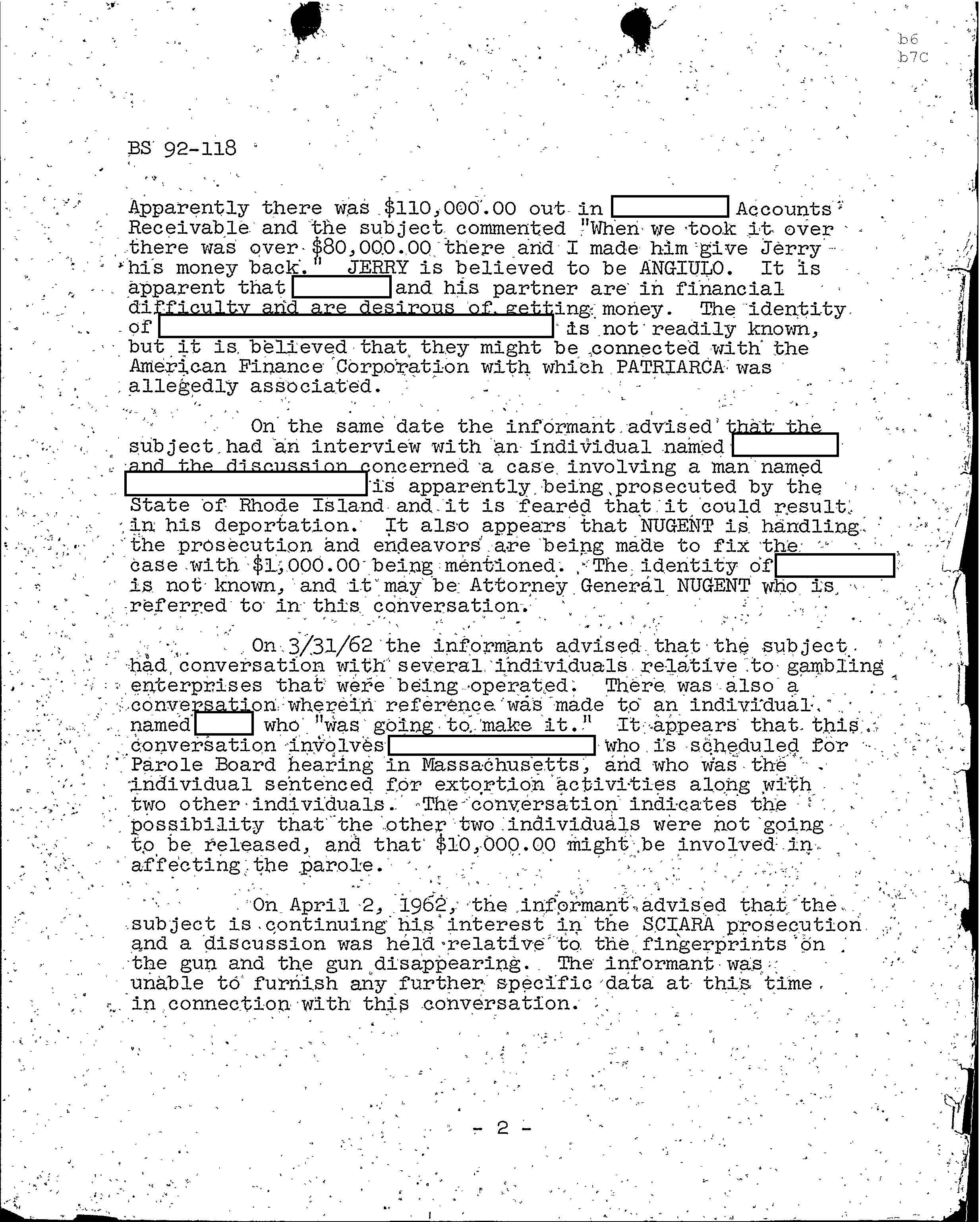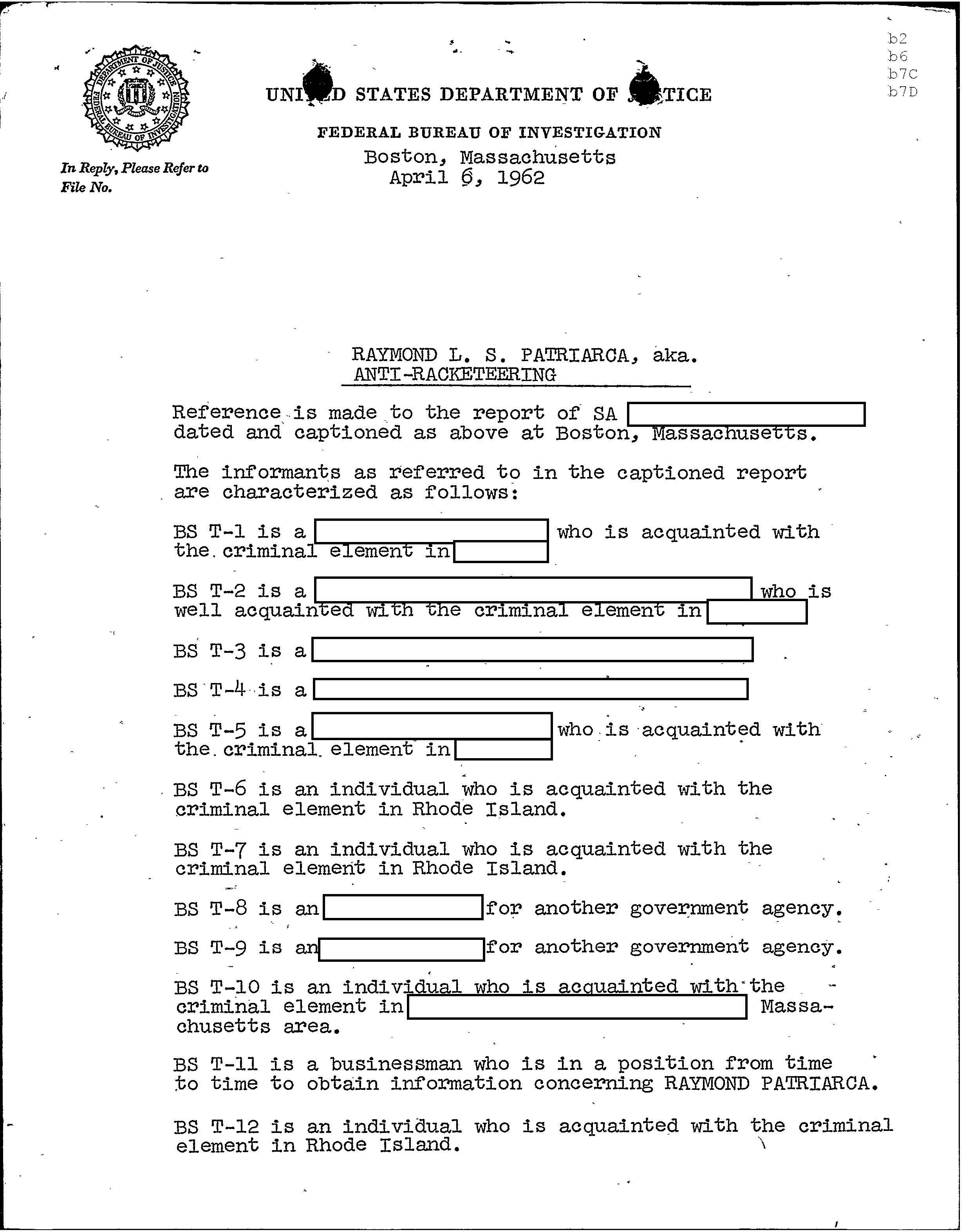 An individual mentioned a newspaper article, reflecting that Patriarca’s name was mentioned as a ‘go-between’ in the purchase of narcotics, by an undercover government agent. REDACTED and unknown man spoke of the FBI having the biggest walkie-talkie, that they can ‘get a line on you twenty miles away andy they can listen to what you are saying; they also can take pictures from five miles away.”