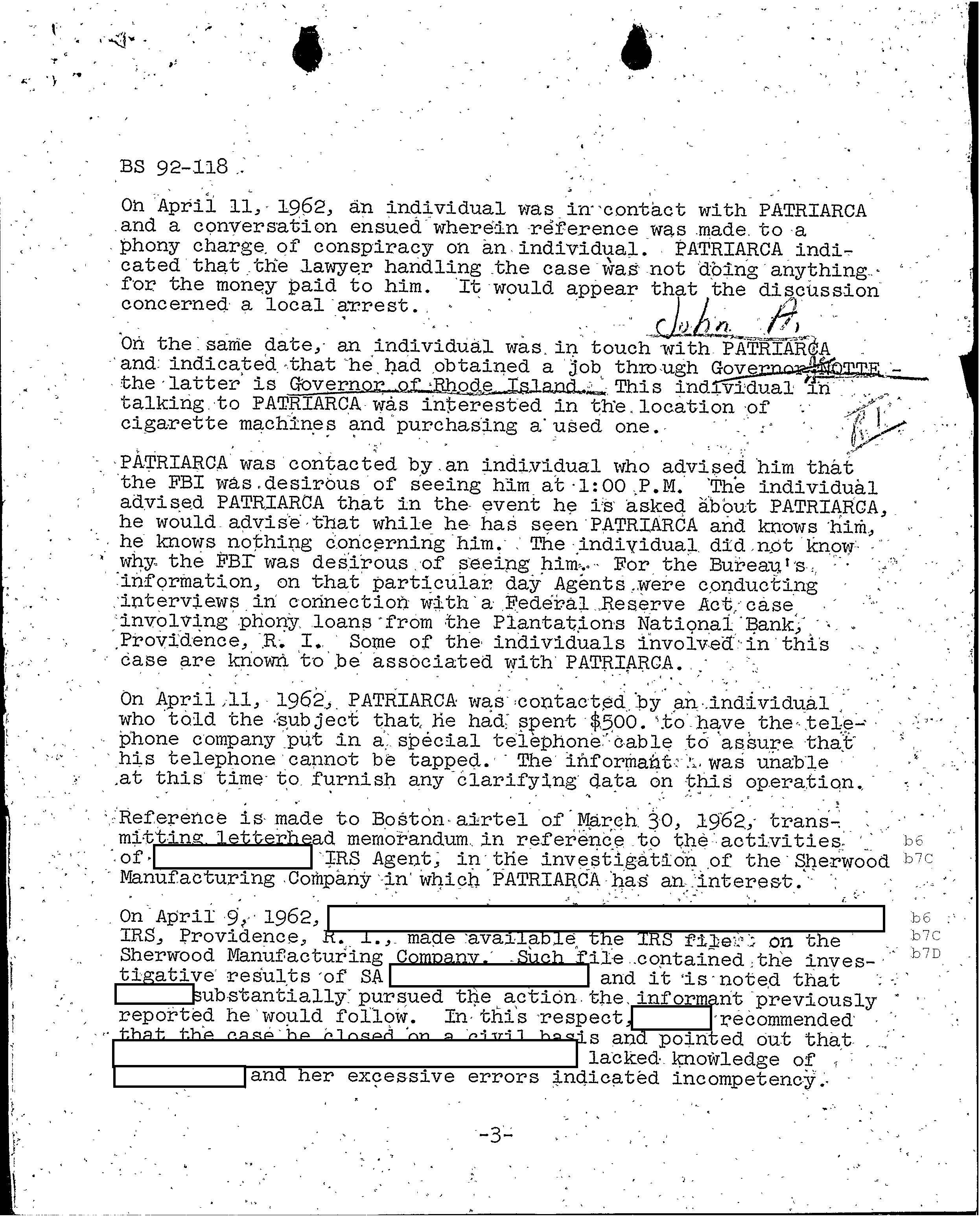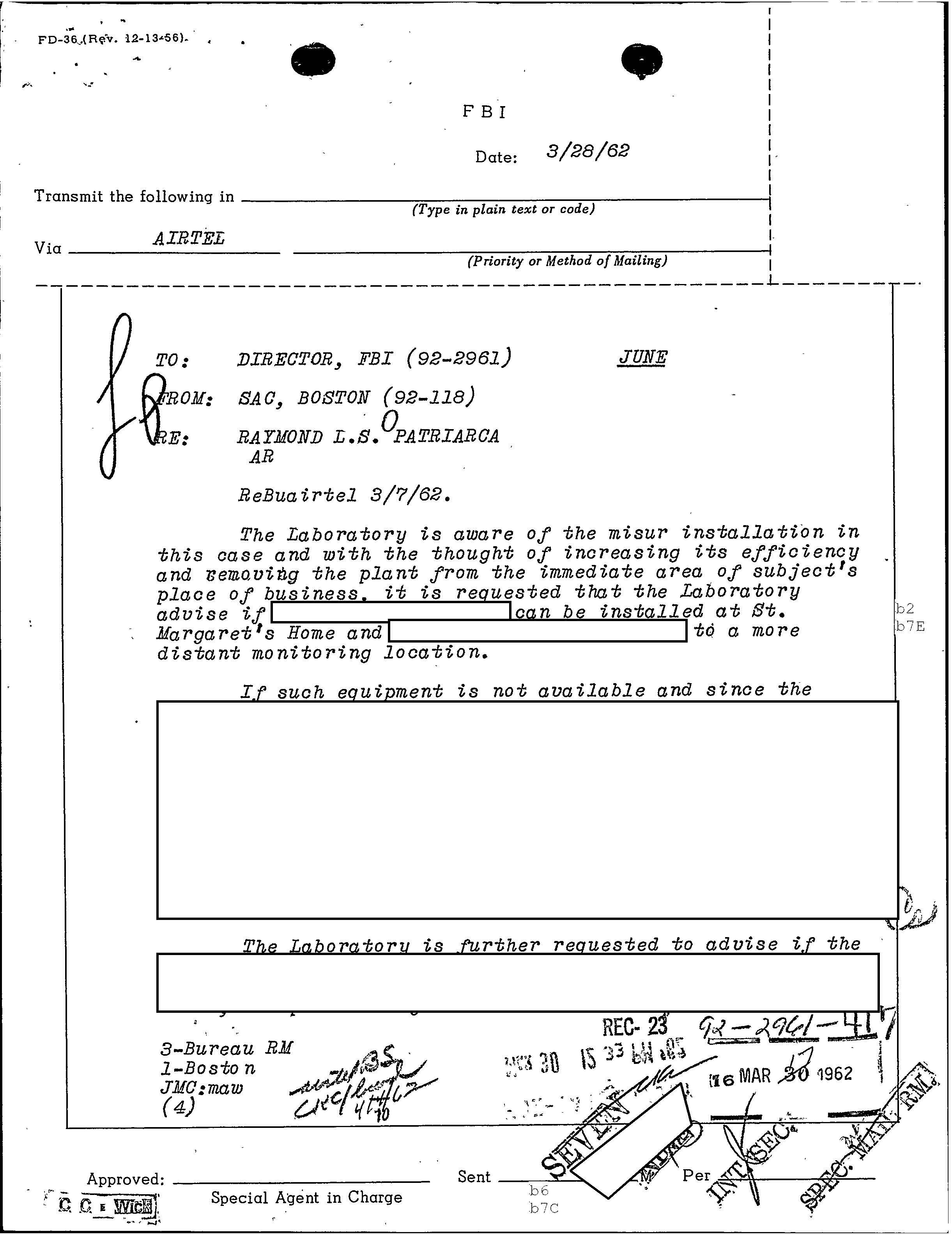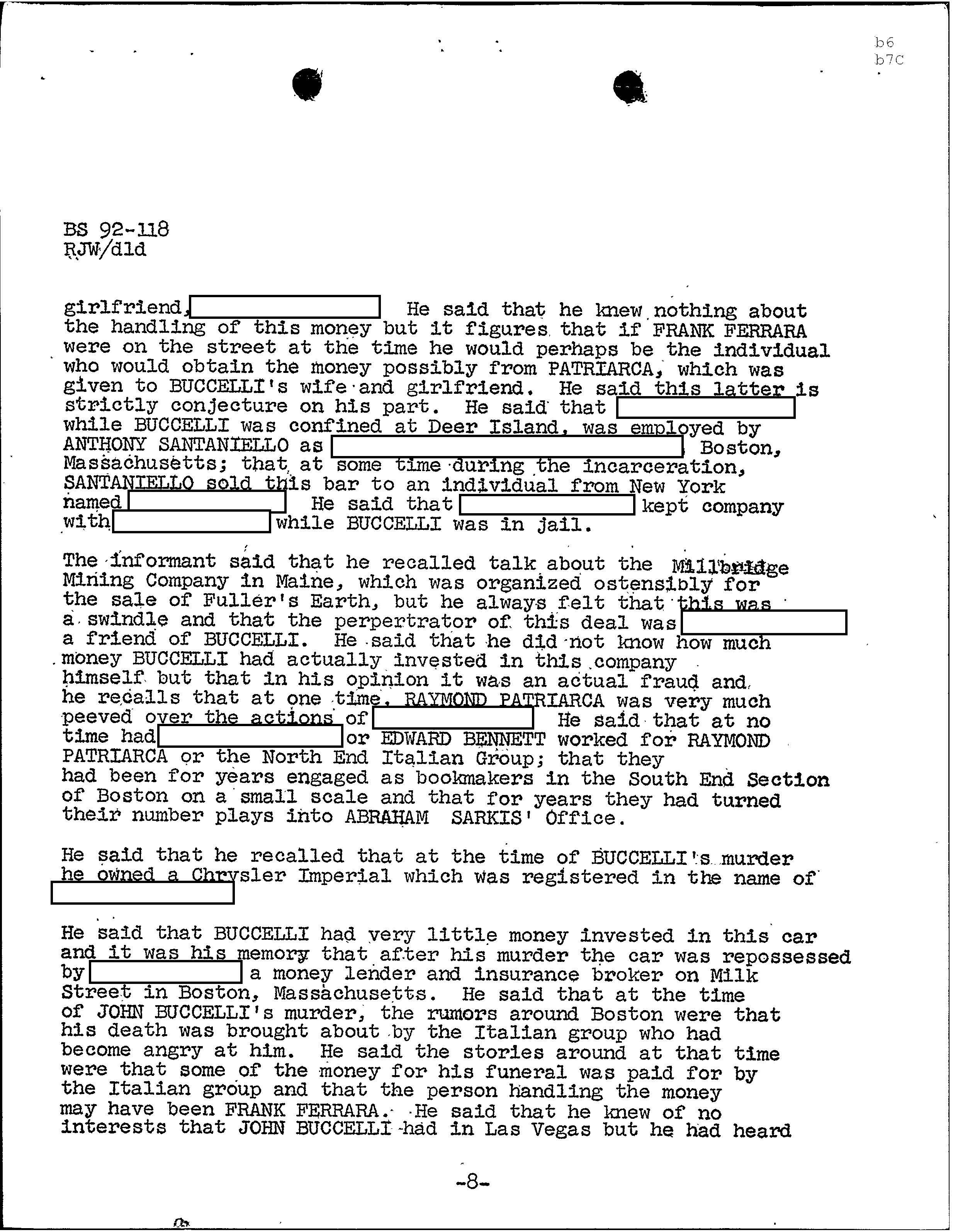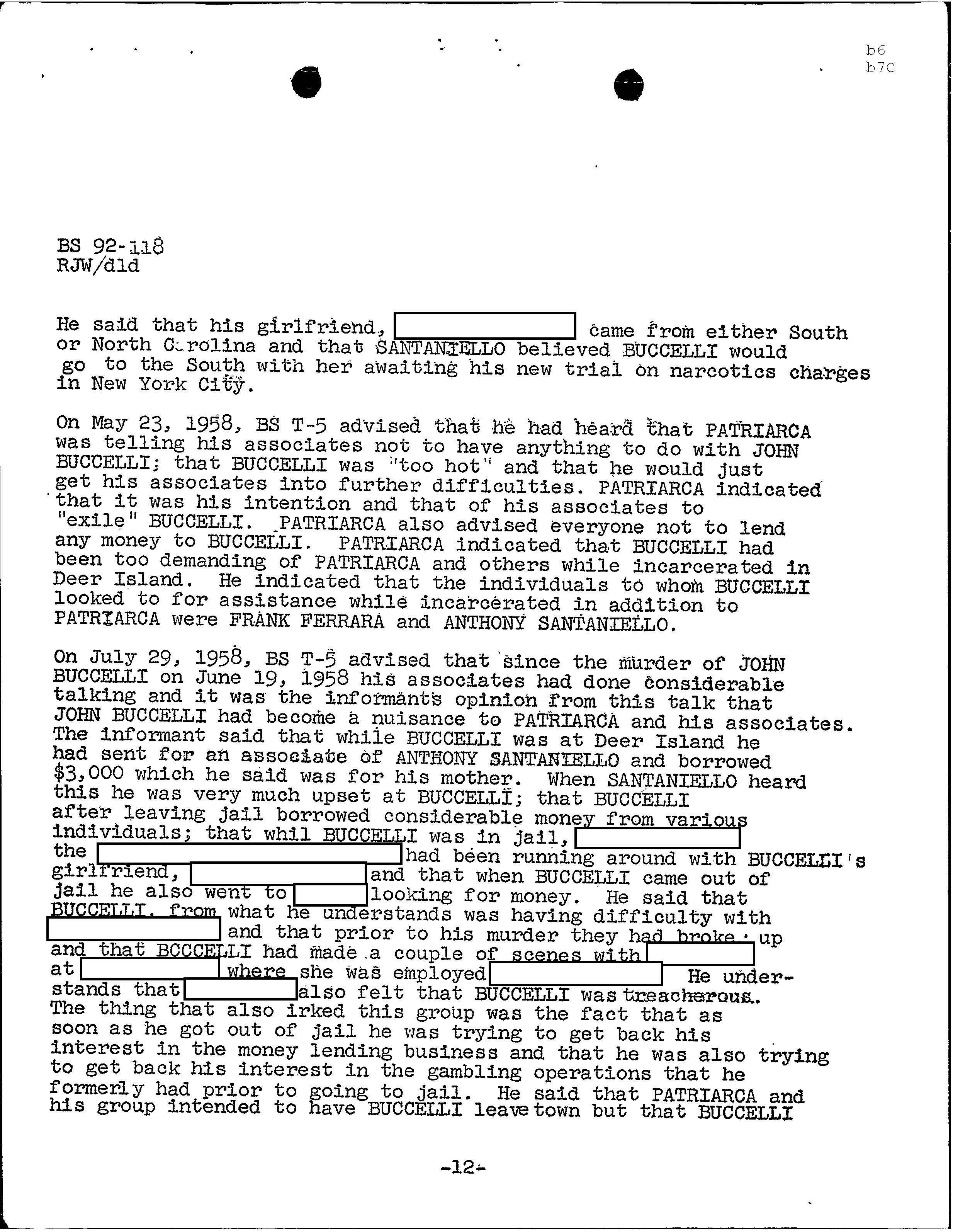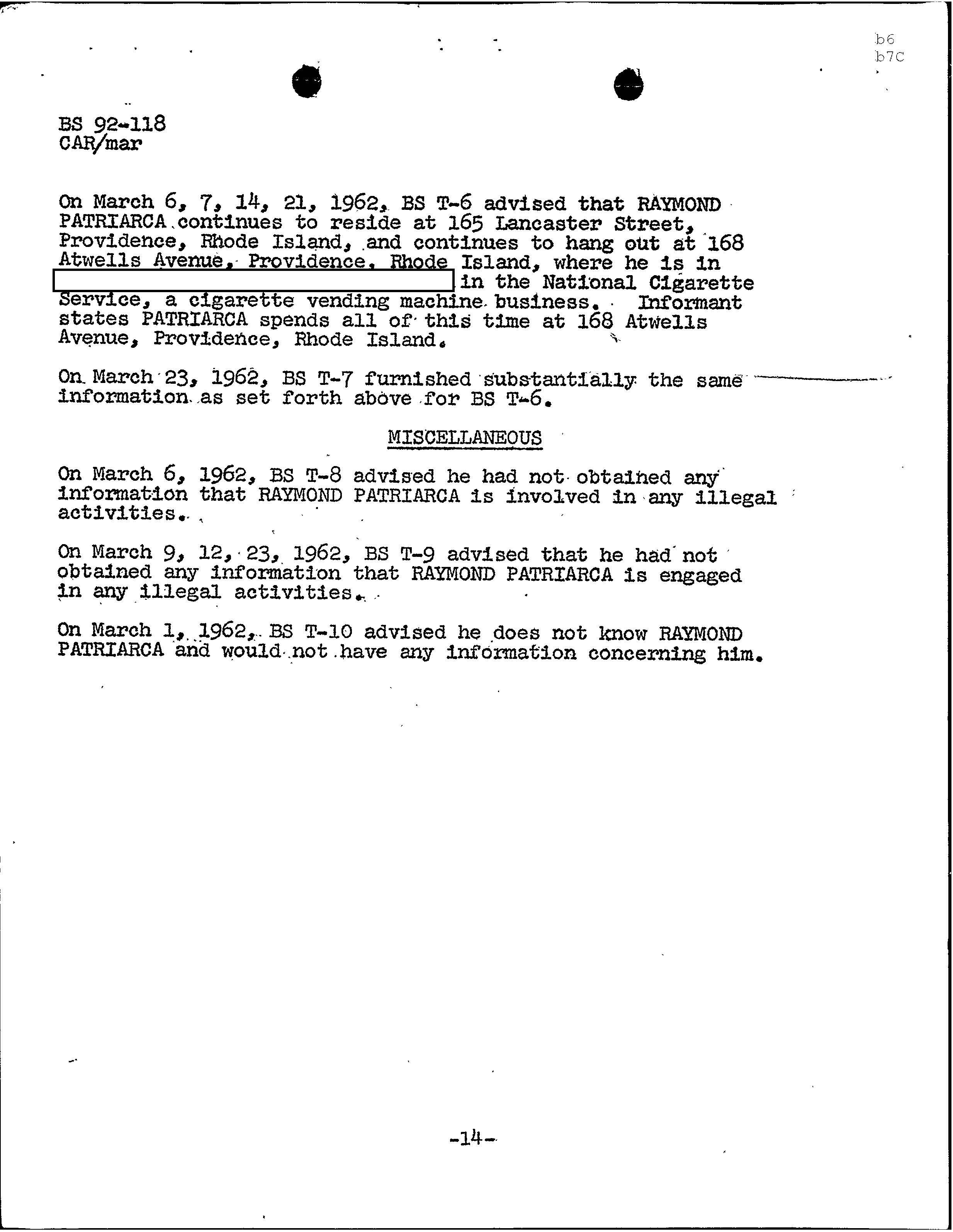 An individual mentioned a newspaper article, reflecting that Patriarca’s name was mentioned as a ‘go-between’ in the purchase of narcotics, by an undercover government agent. REDACTED and unknown man spoke of the FBI having the biggest walkie-talkie, that they can ‘get a line on you twenty miles away andy they can listen to what you are saying; they also can take pictures from five miles away.”