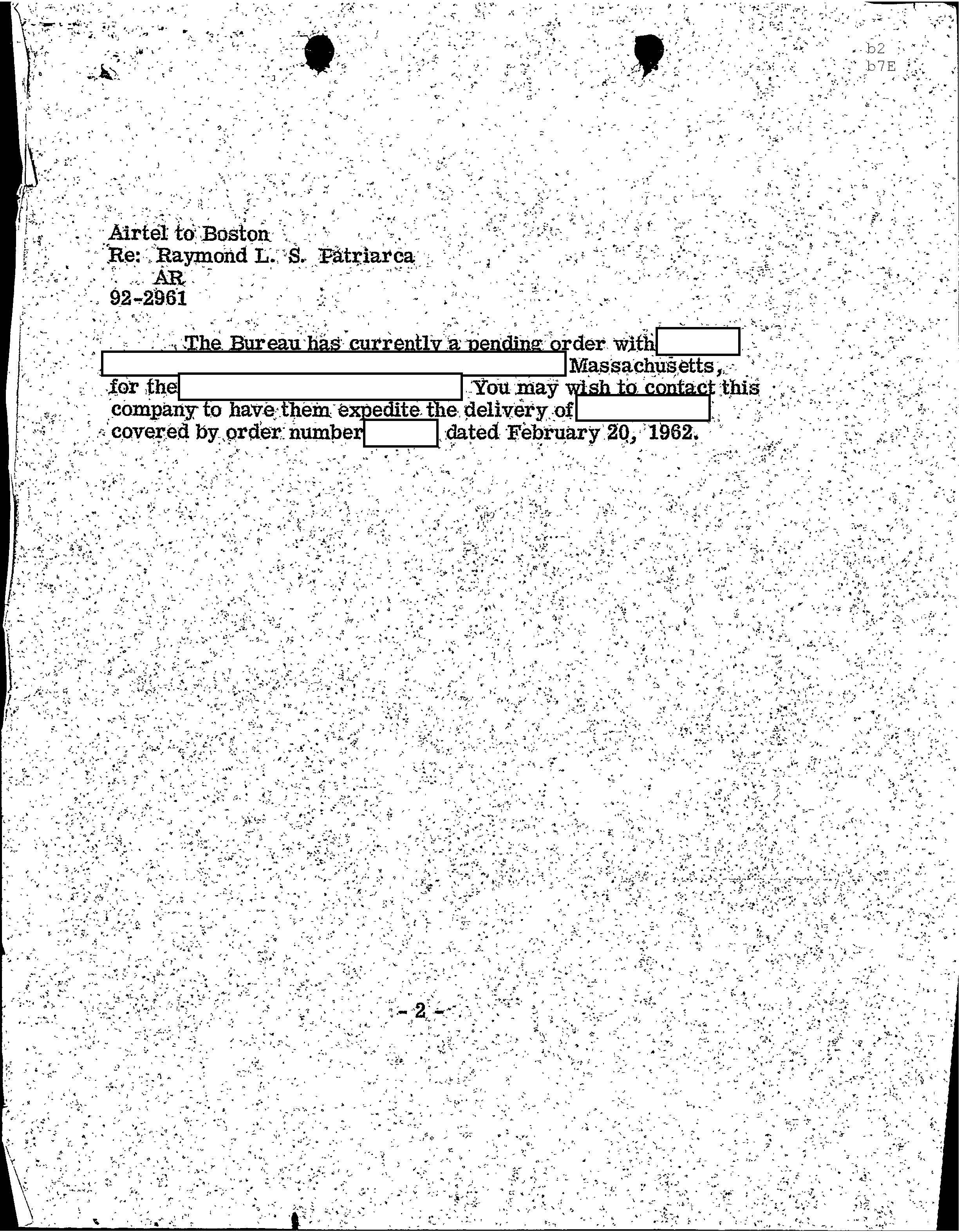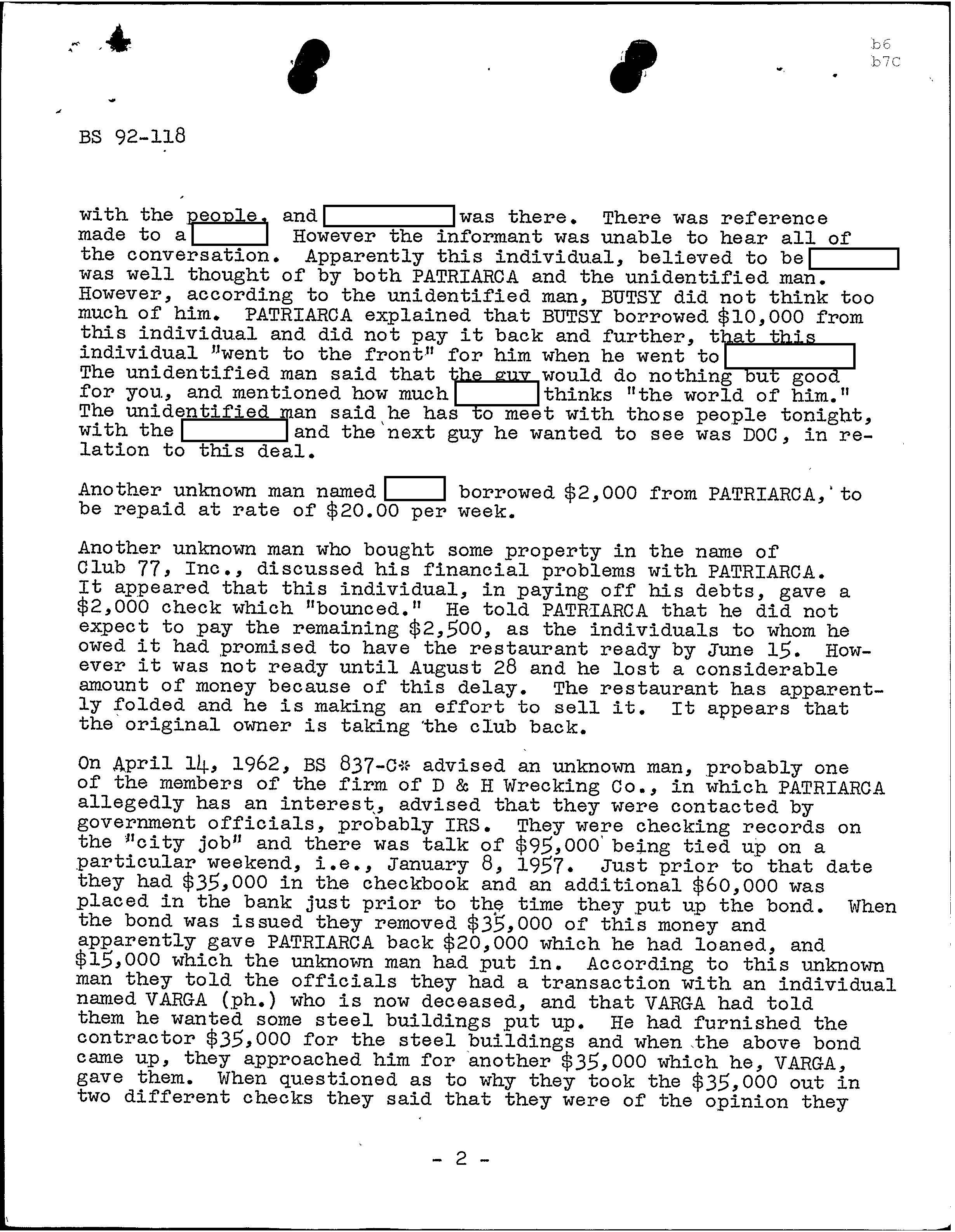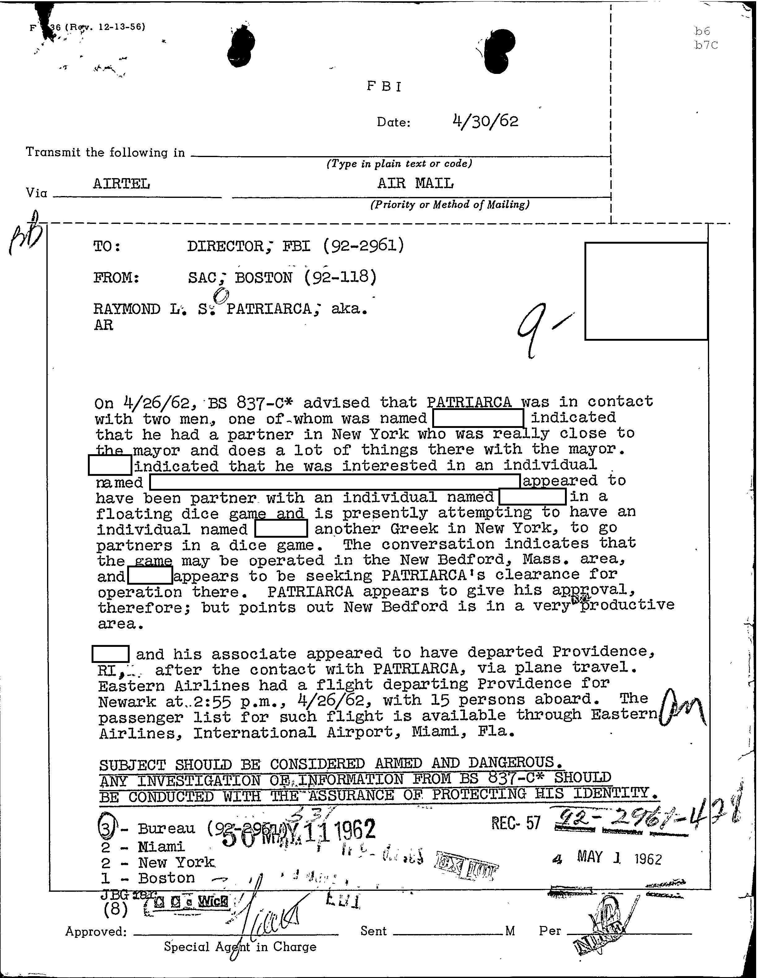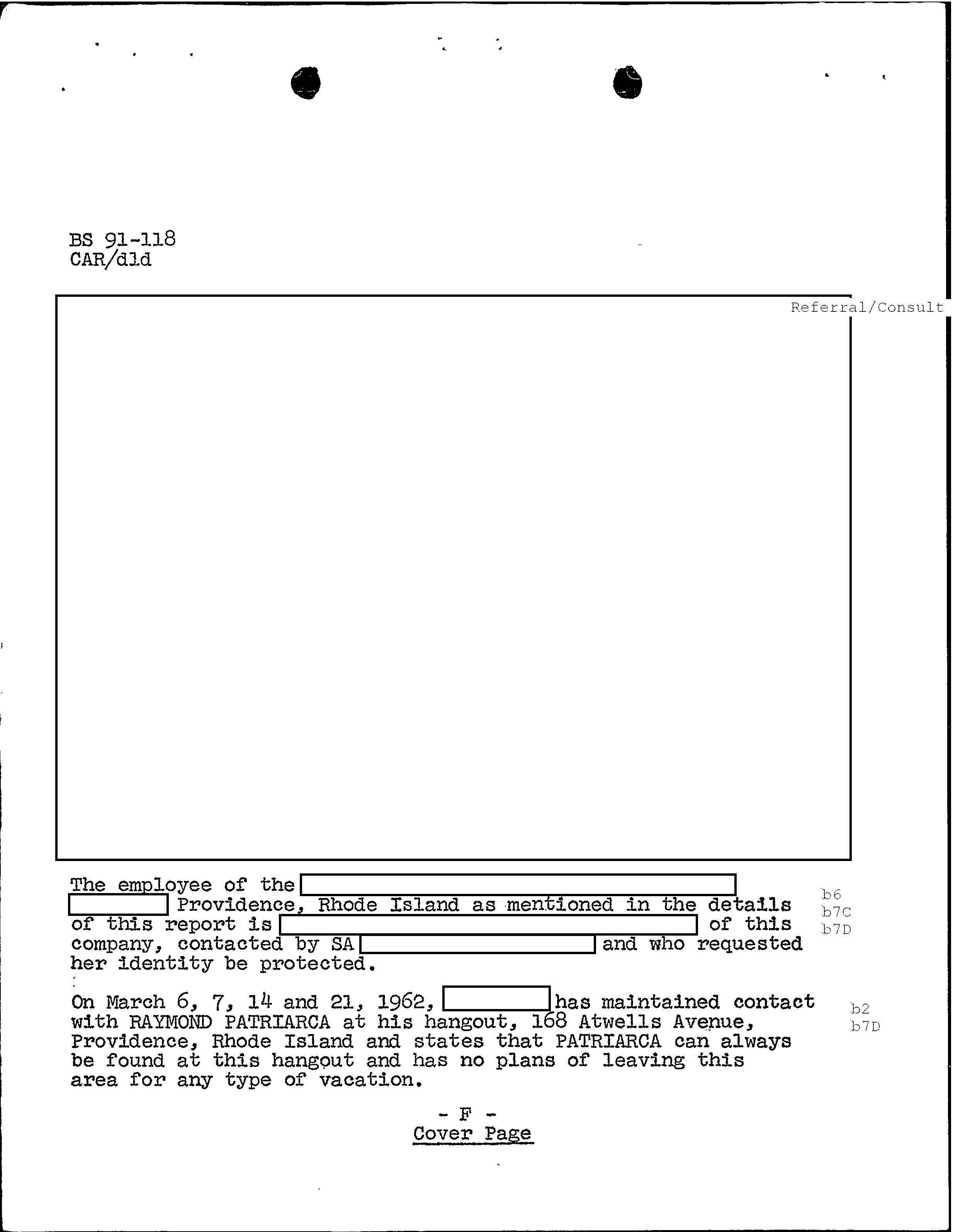 An individual mentioned a newspaper article, reflecting that Patriarca’s name was mentioned as a ‘go-between’ in the purchase of narcotics, by an undercover government agent. REDACTED and unknown man spoke of the FBI having the biggest walkie-talkie, that they can ‘get a line on you twenty miles away andy they can listen to what you are saying; they also can take pictures from five miles away.”
