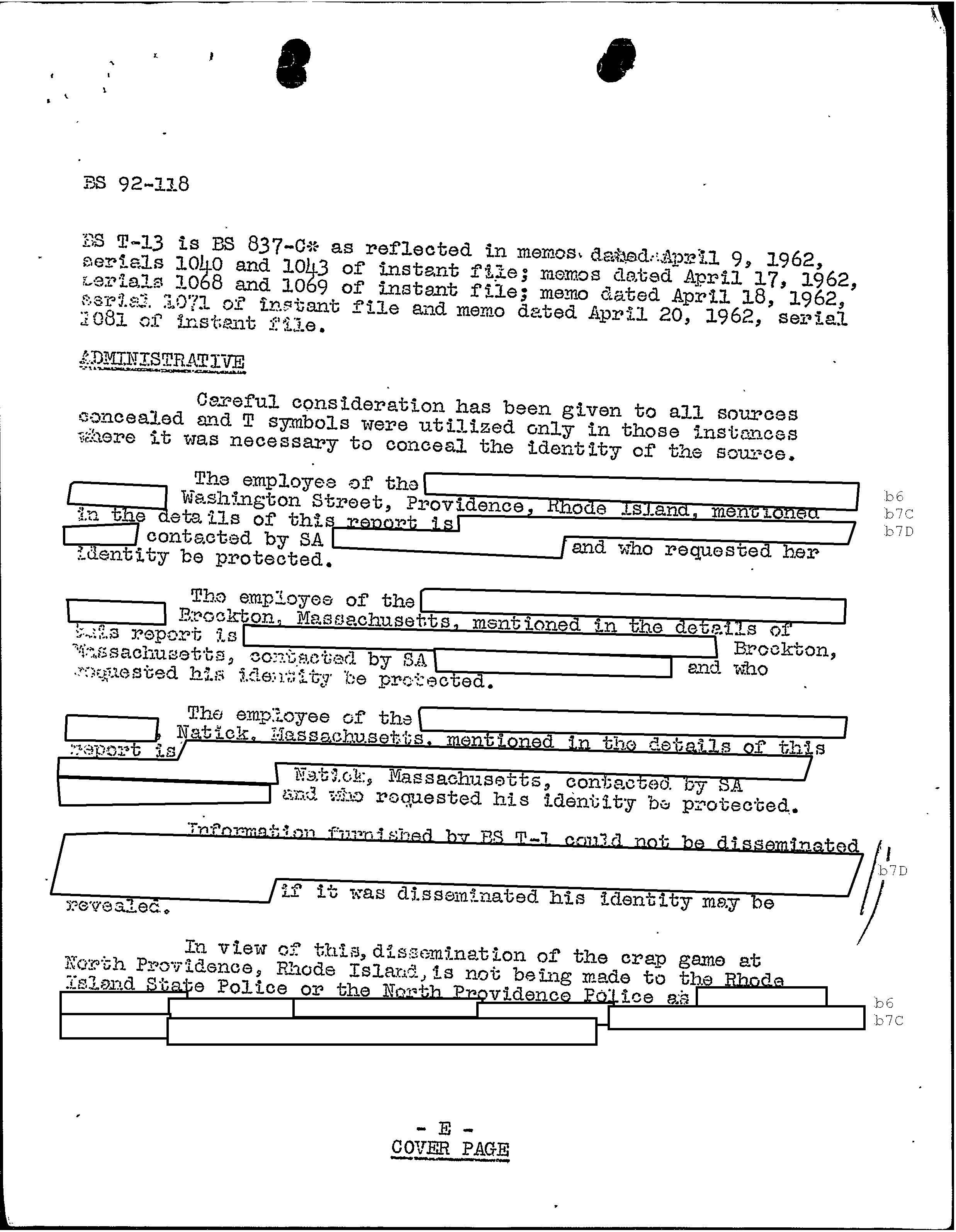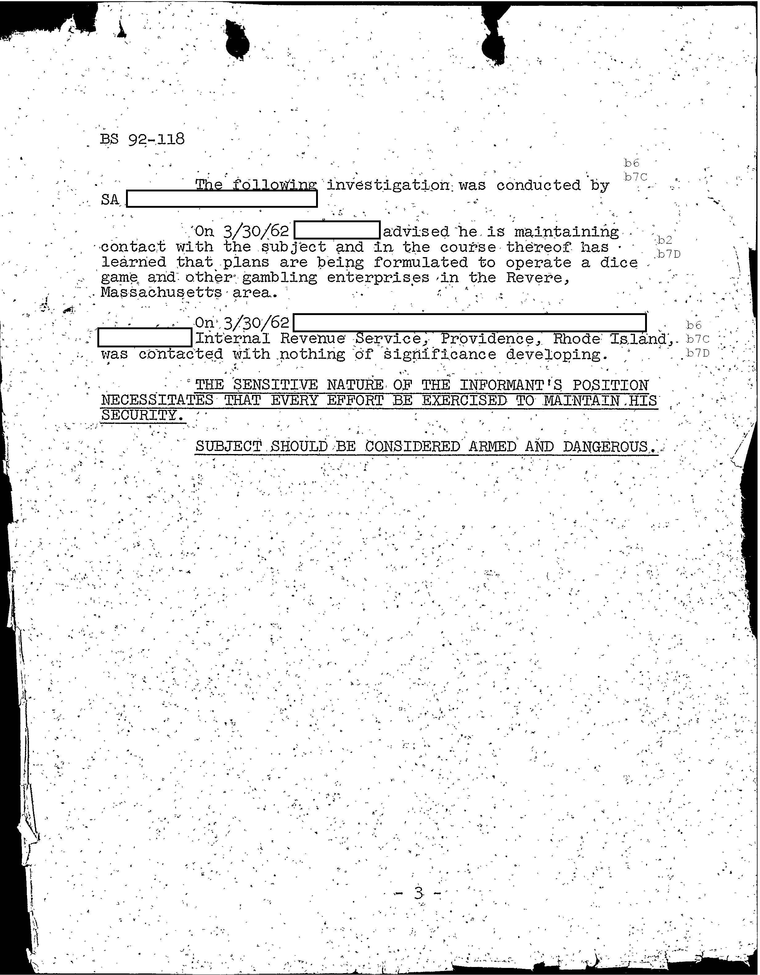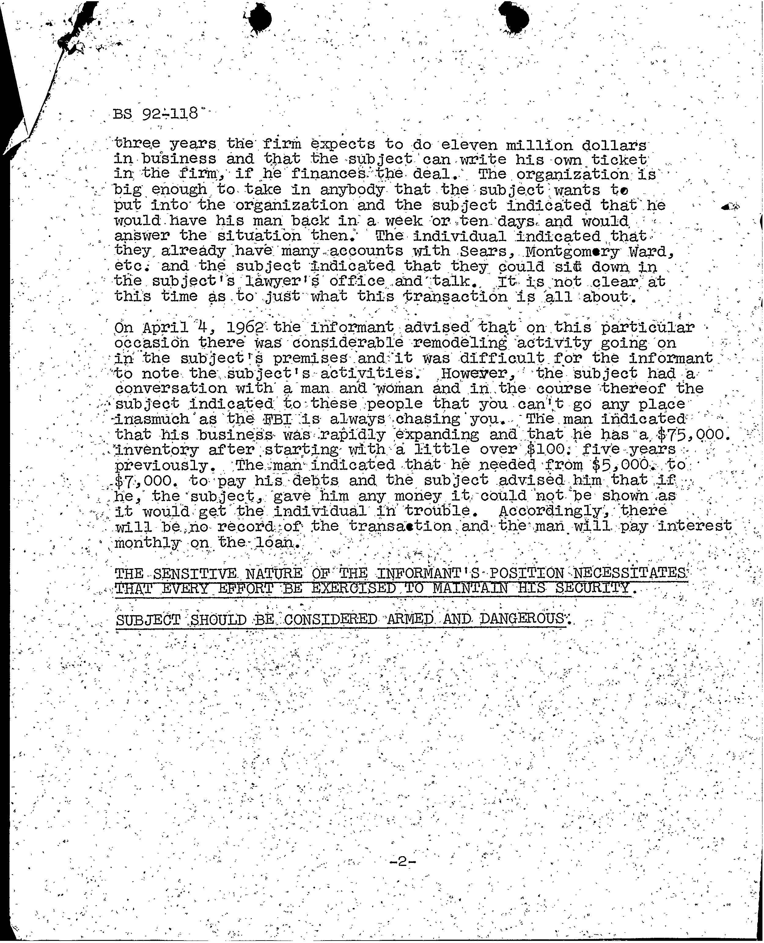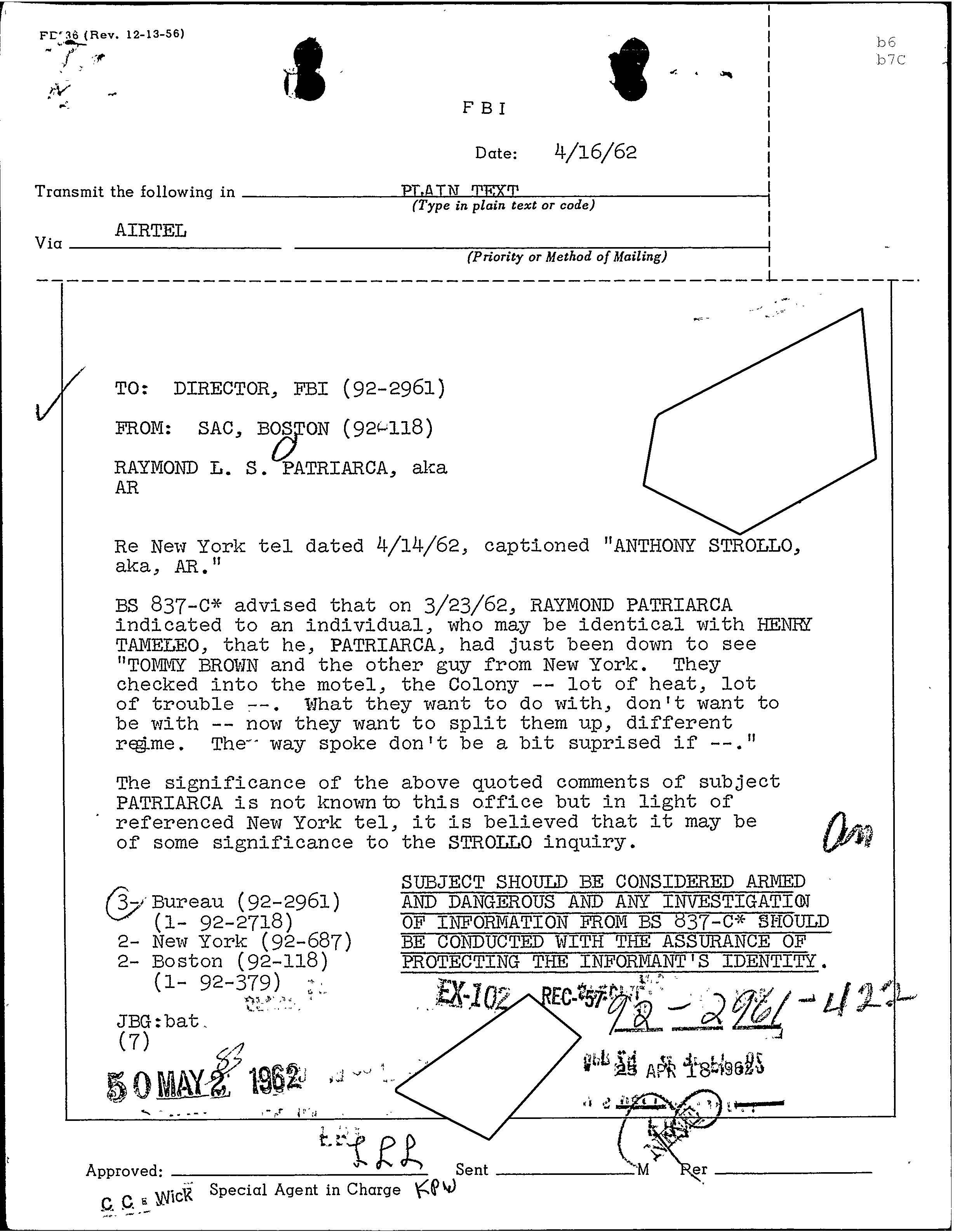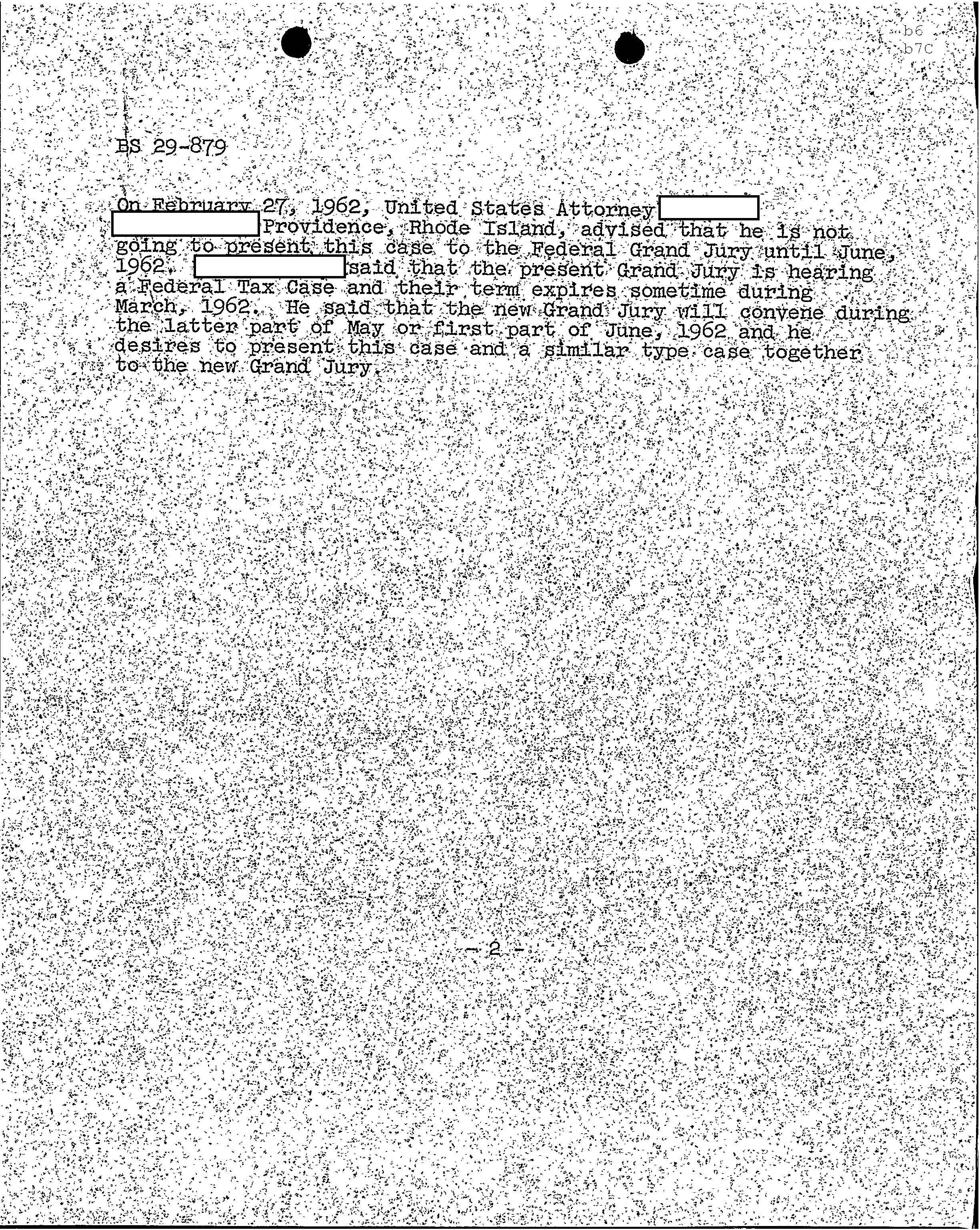An individual mentioned a newspaper article, reflecting that Patriarca’s name was mentioned as a ‘go-between’ in the purchase of narcotics, by an undercover government agent. REDACTED and unknown man spoke of the FBI having the biggest walkie-talkie, that they can ‘get a line on you twenty miles away andy they can listen to what you are saying; they also can take pictures from five miles away.”