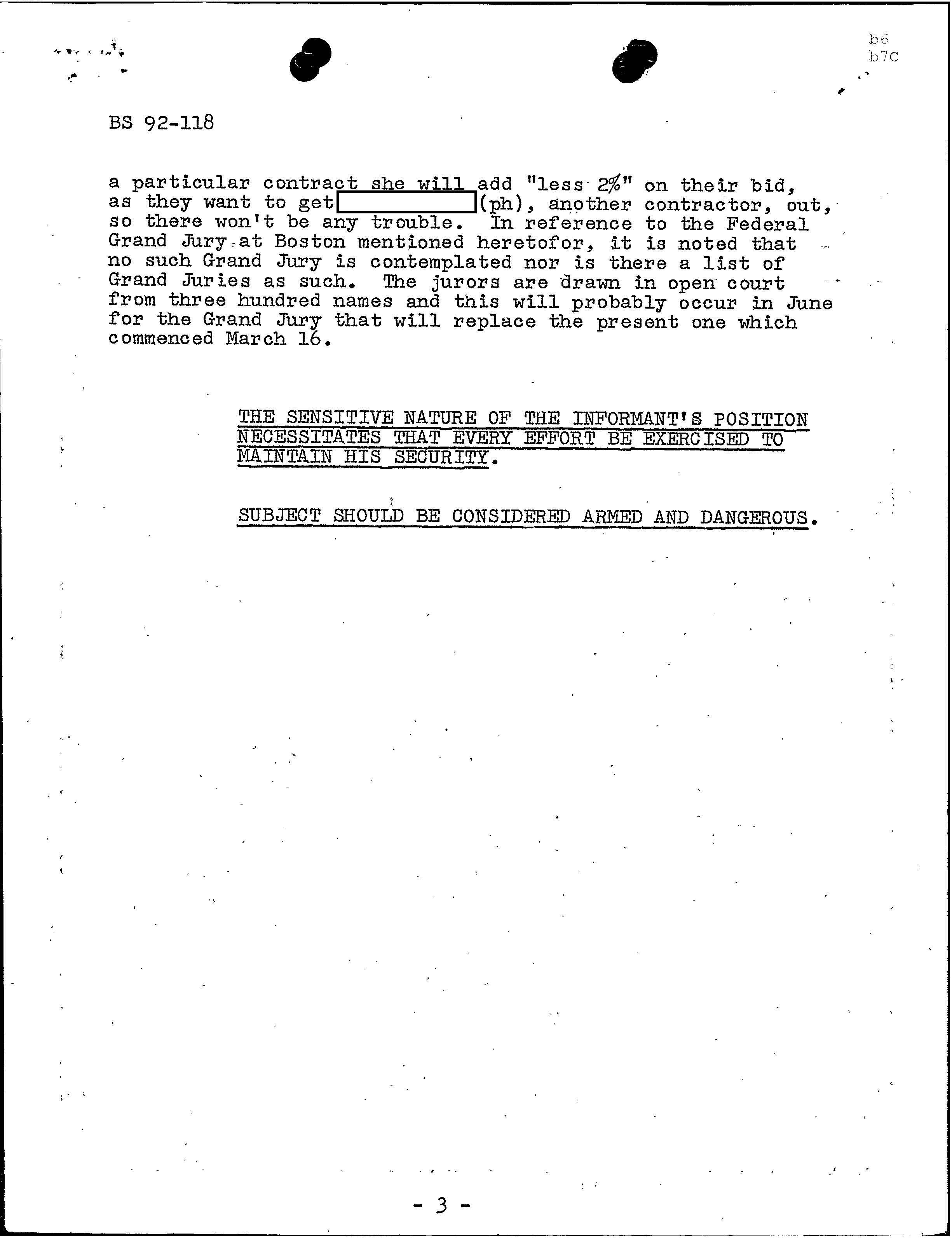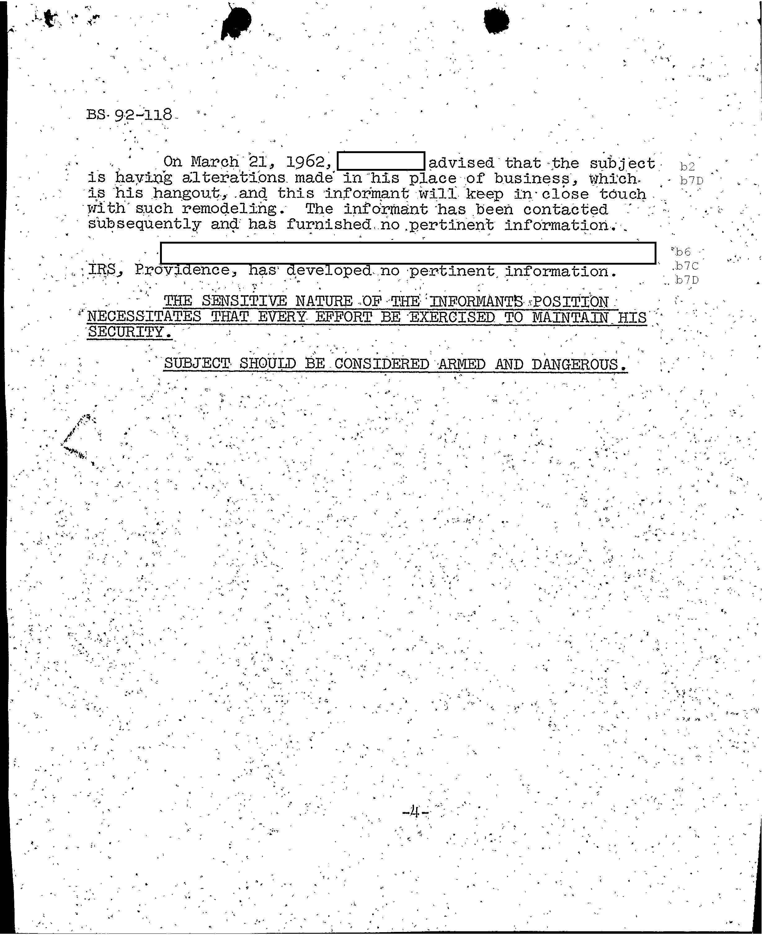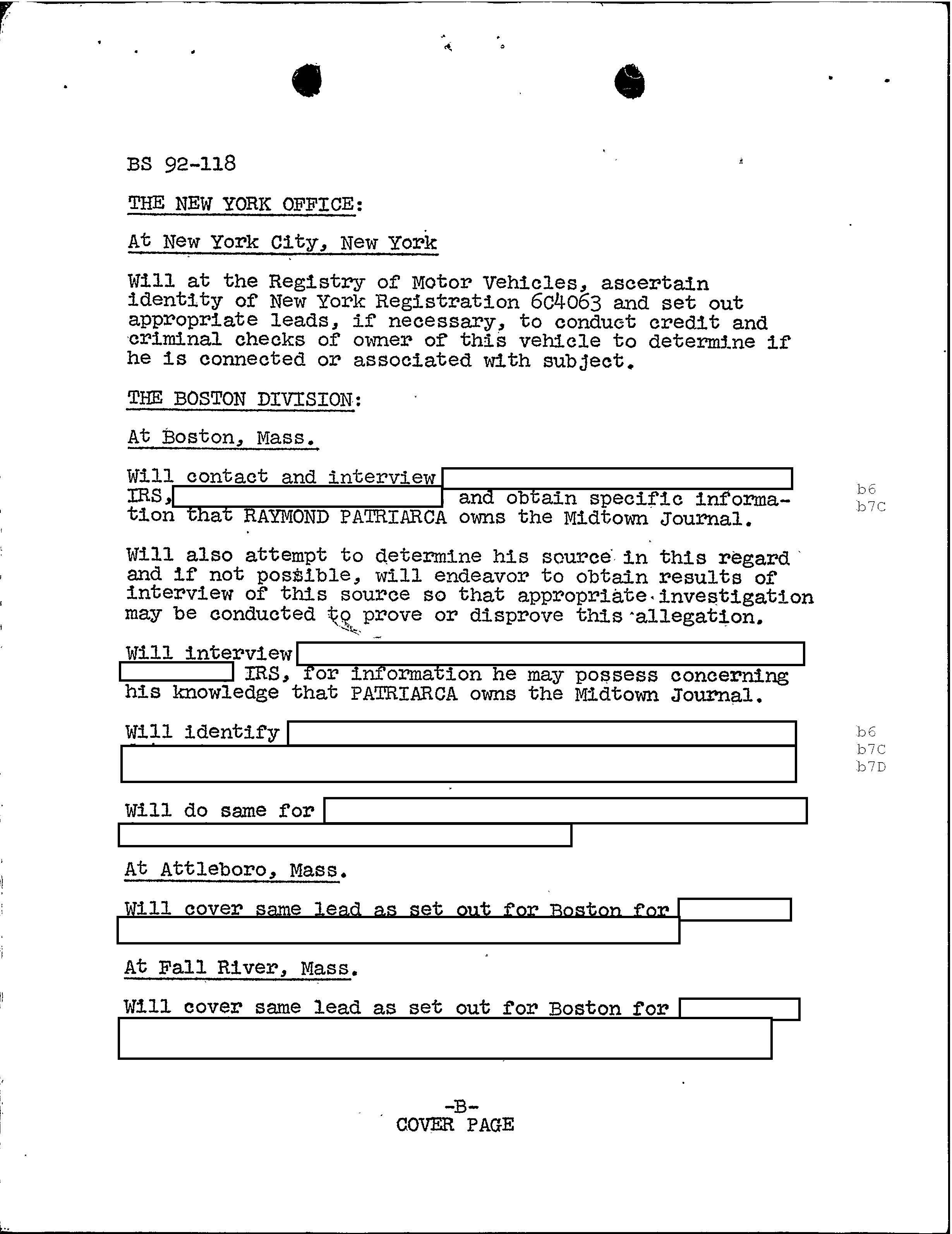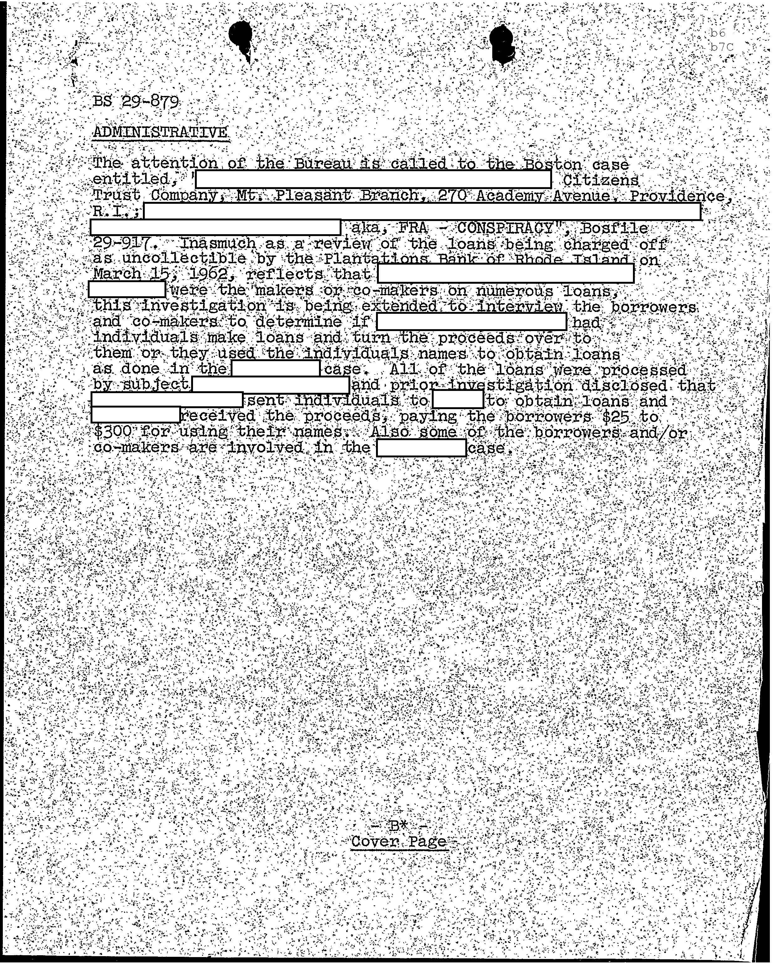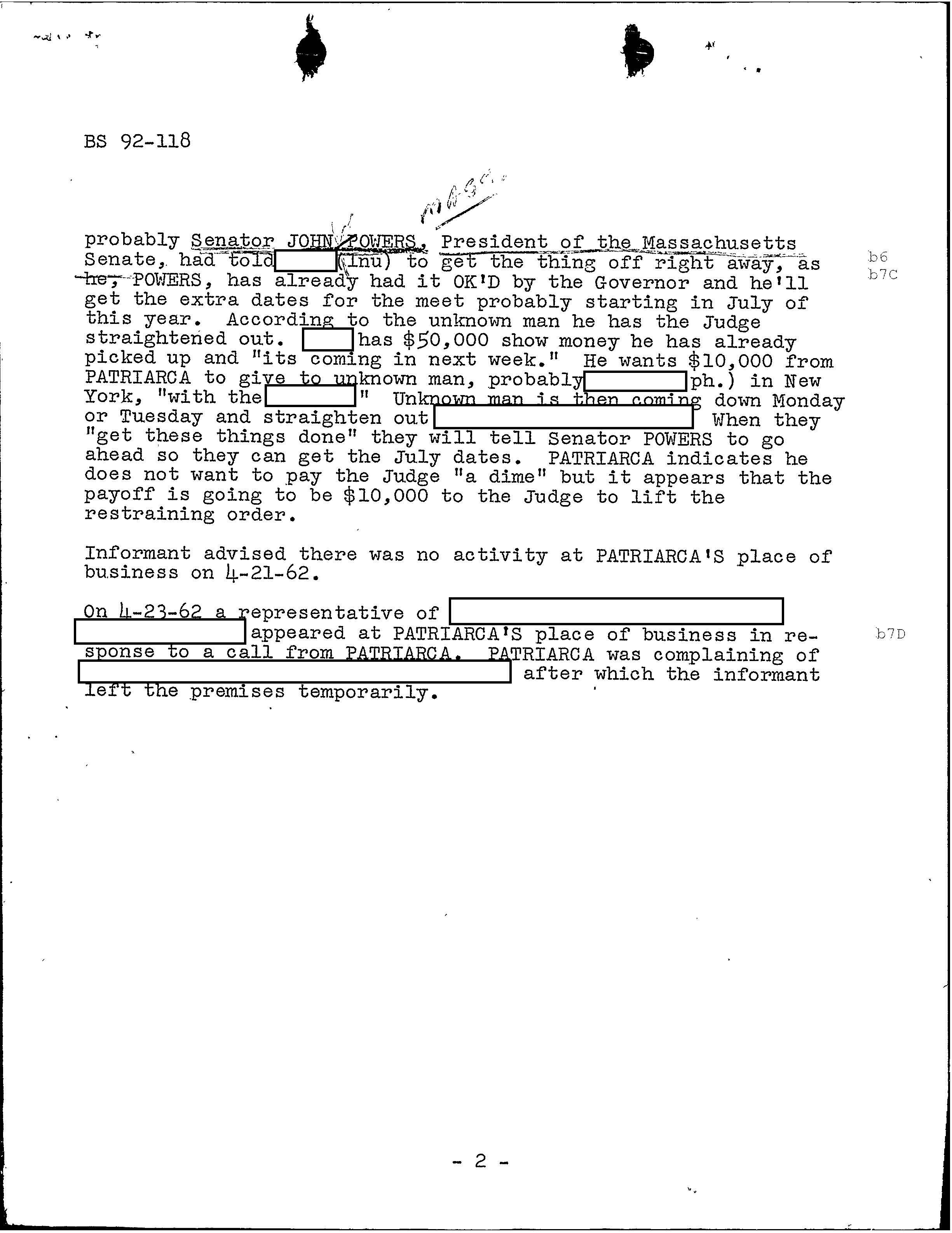 An individual mentioned a newspaper article, reflecting that Patriarca’s name was mentioned as a ‘go-between’ in the purchase of narcotics, by an undercover government agent. REDACTED and unknown man spoke of the FBI having the biggest walkie-talkie, that they can ‘get a line on you twenty miles away andy they can listen to what you are saying; they also can take pictures from five miles away.”
