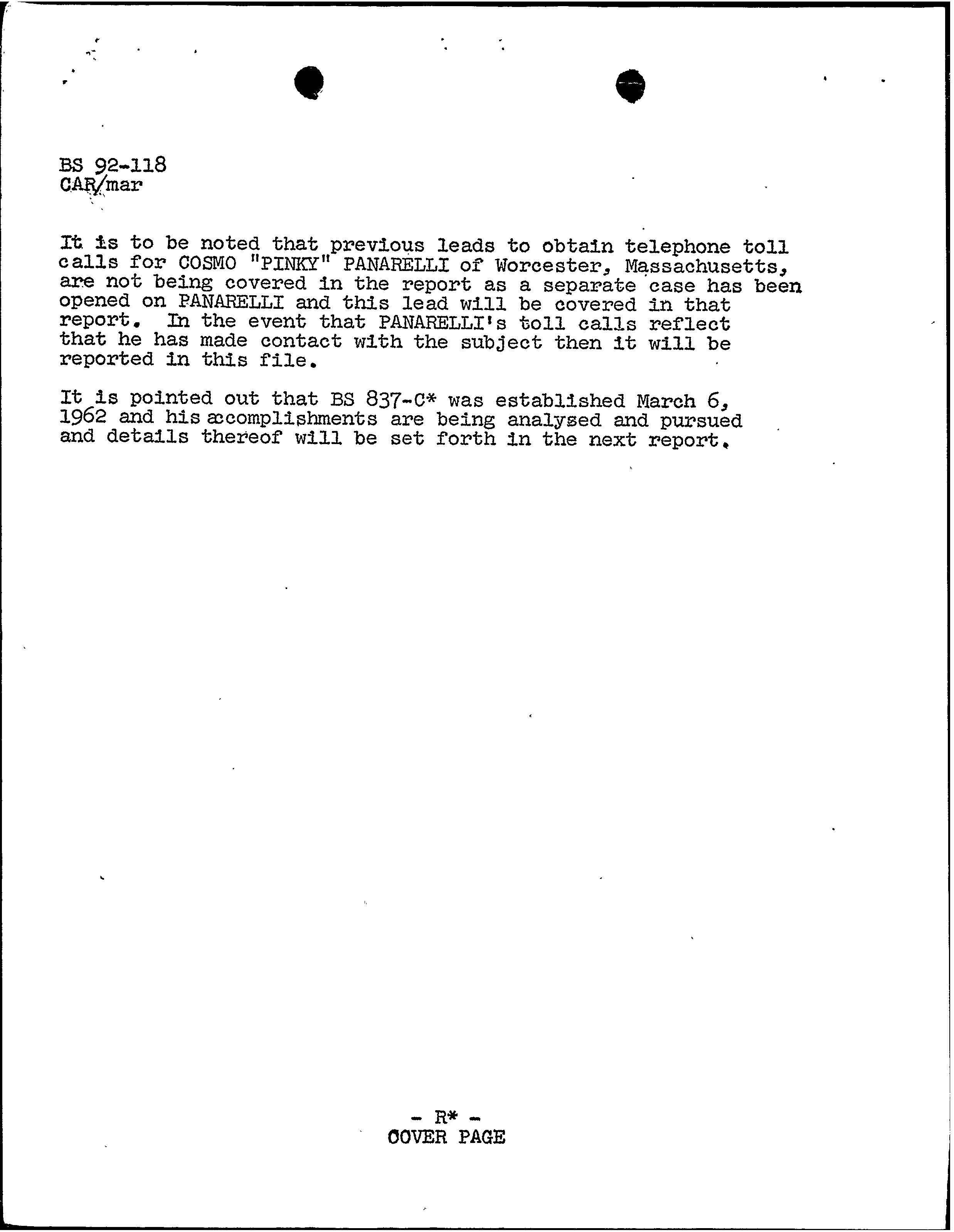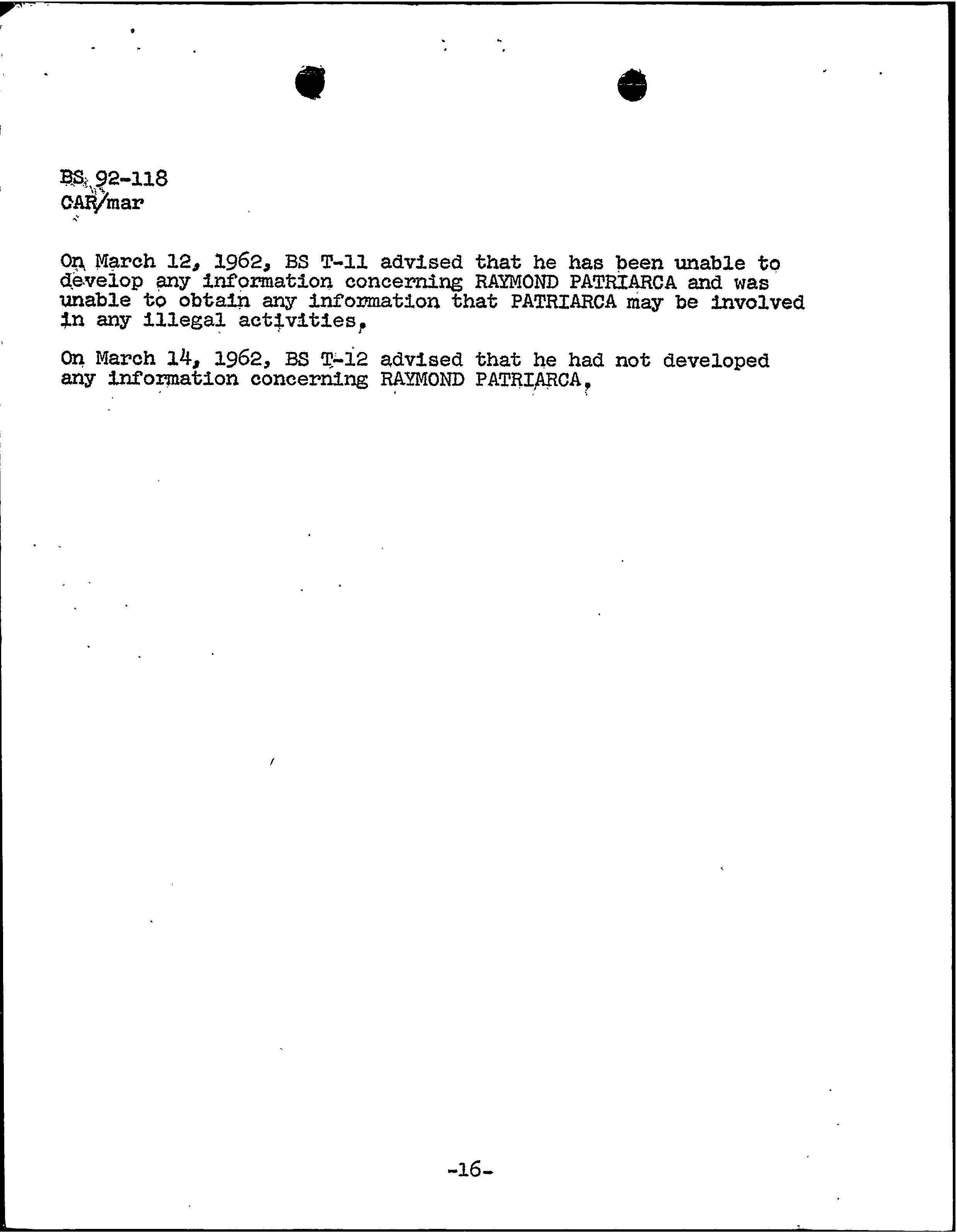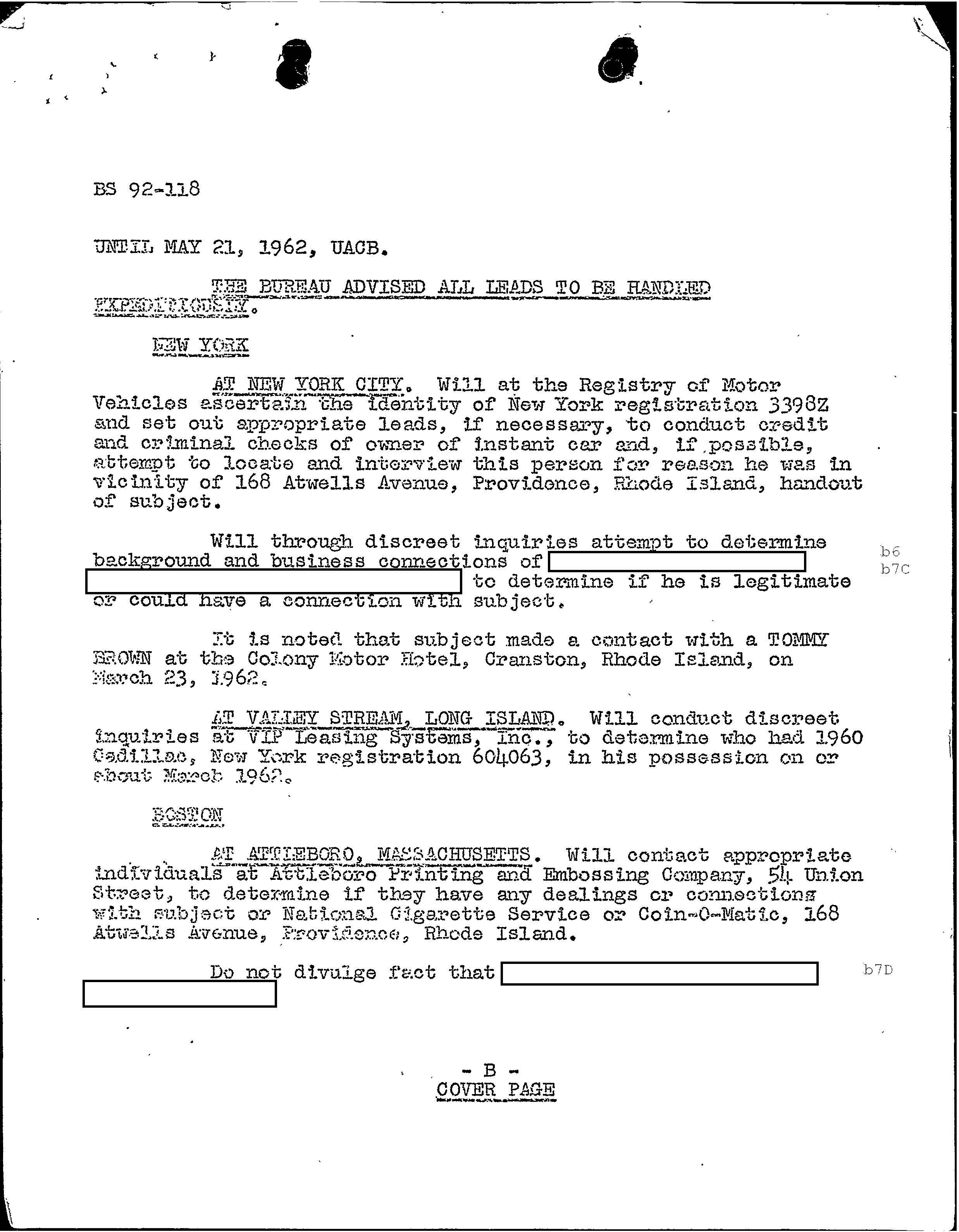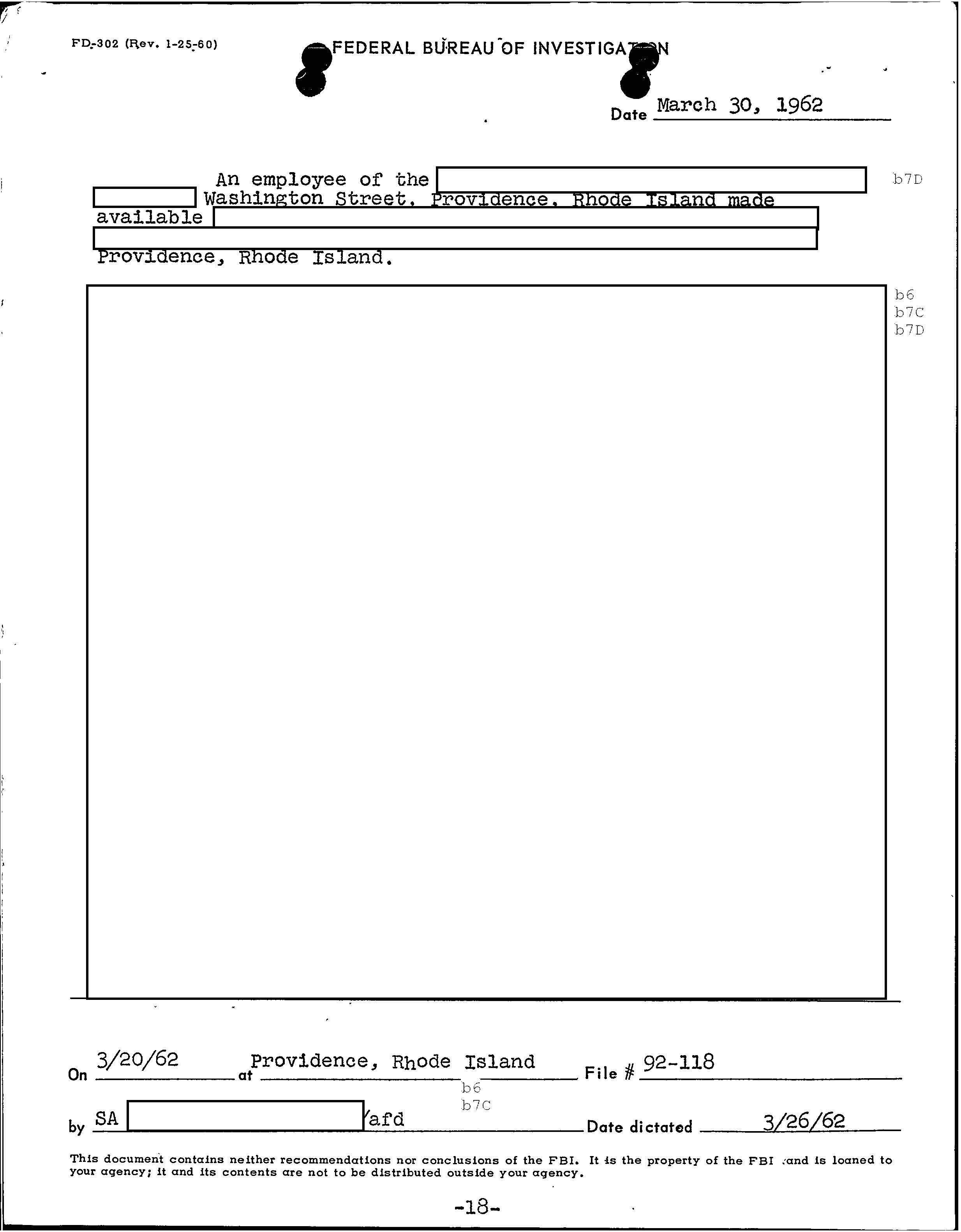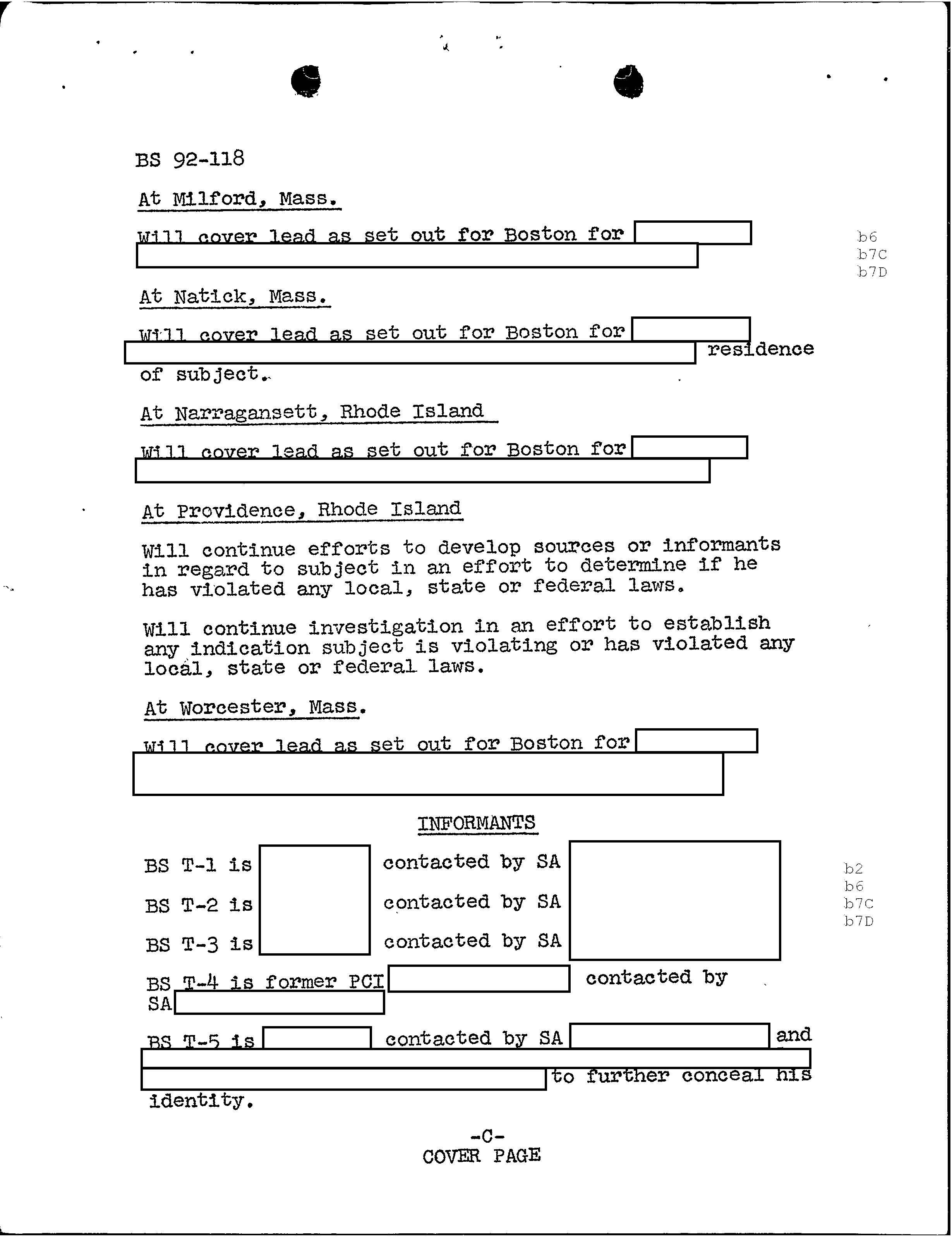 An individual mentioned a newspaper article, reflecting that Patriarca’s name was mentioned as a ‘go-between’ in the purchase of narcotics, by an undercover government agent. REDACTED and unknown man spoke of the FBI having the biggest walkie-talkie, that they can ‘get a line on you twenty miles away andy they can listen to what you are saying; they also can take pictures from five miles away.”
