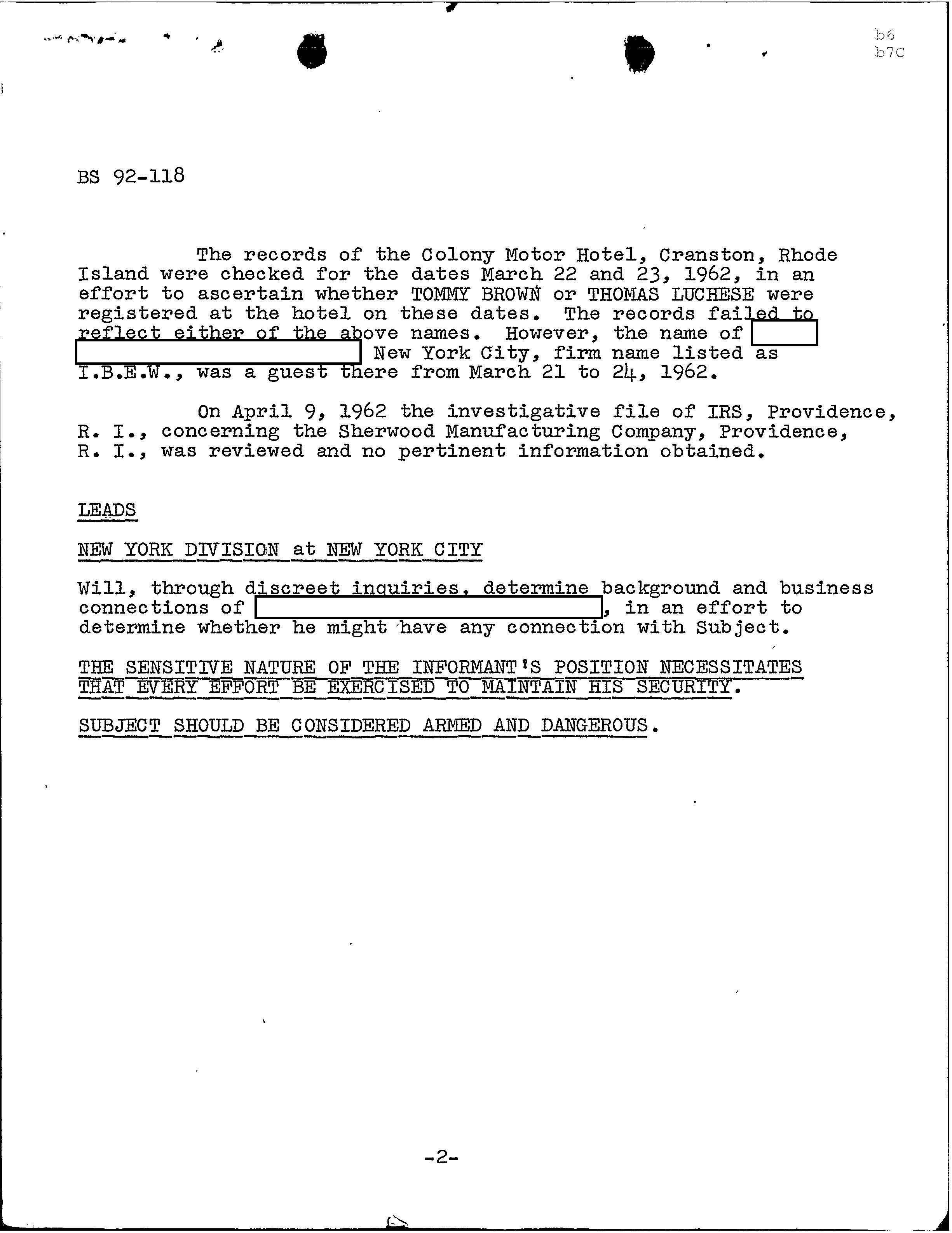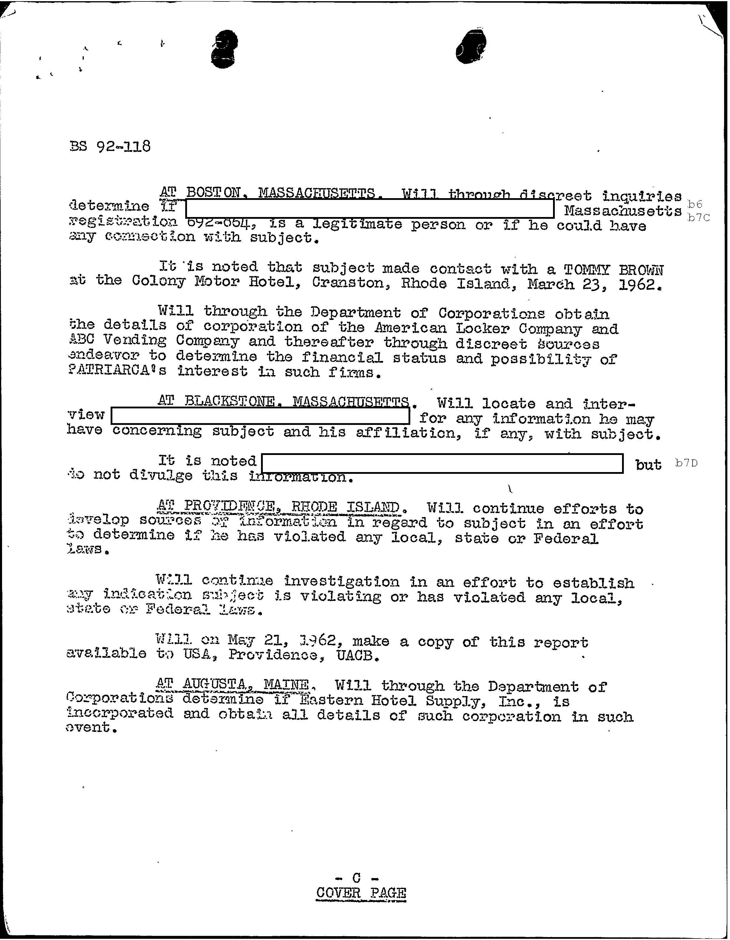 Patrairca to meet with some people at the Old Colony Motel in Cranston, RI and such people included a Tommy Brown from New York.