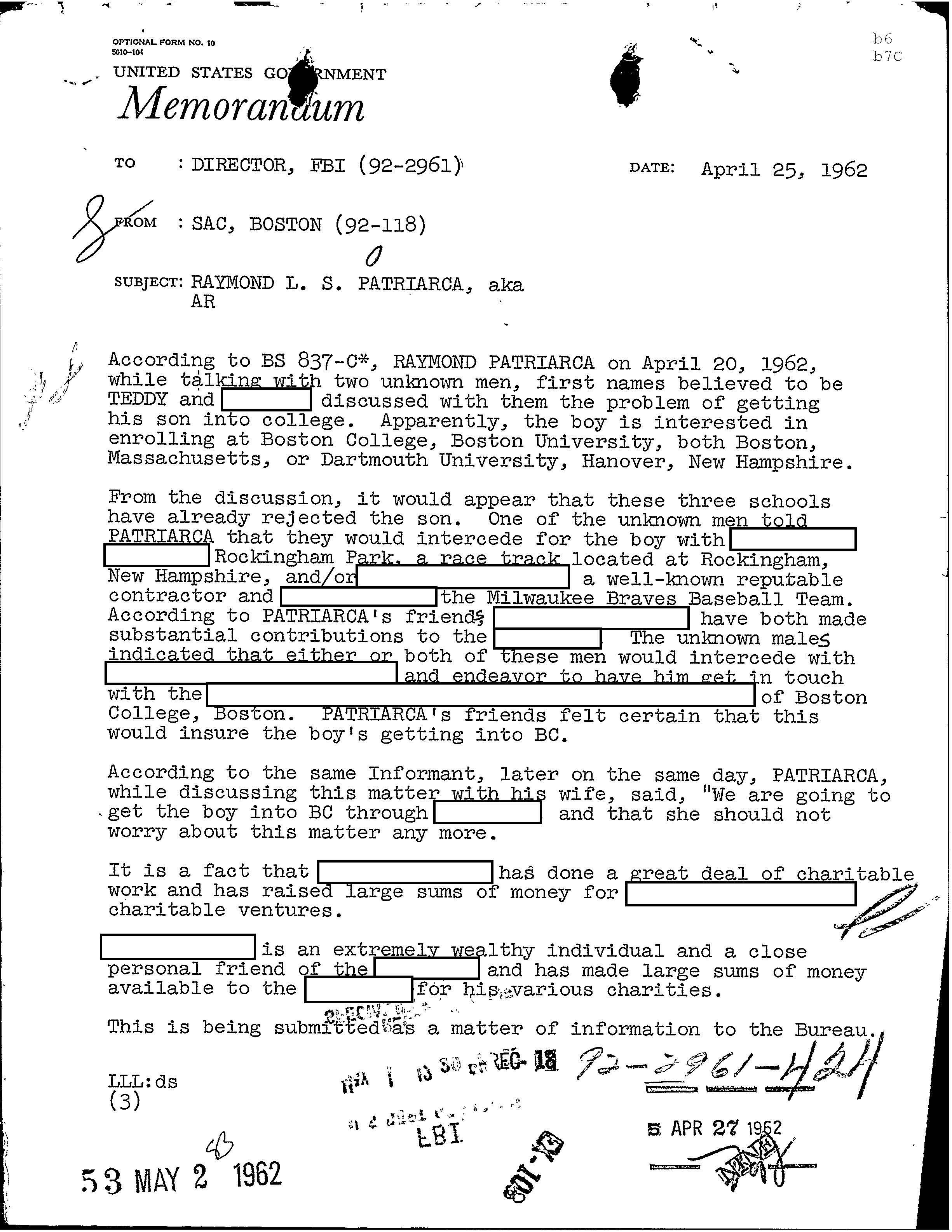 PAGE 84 Patriarca Help’s an Associate’s Son Get into Boston College