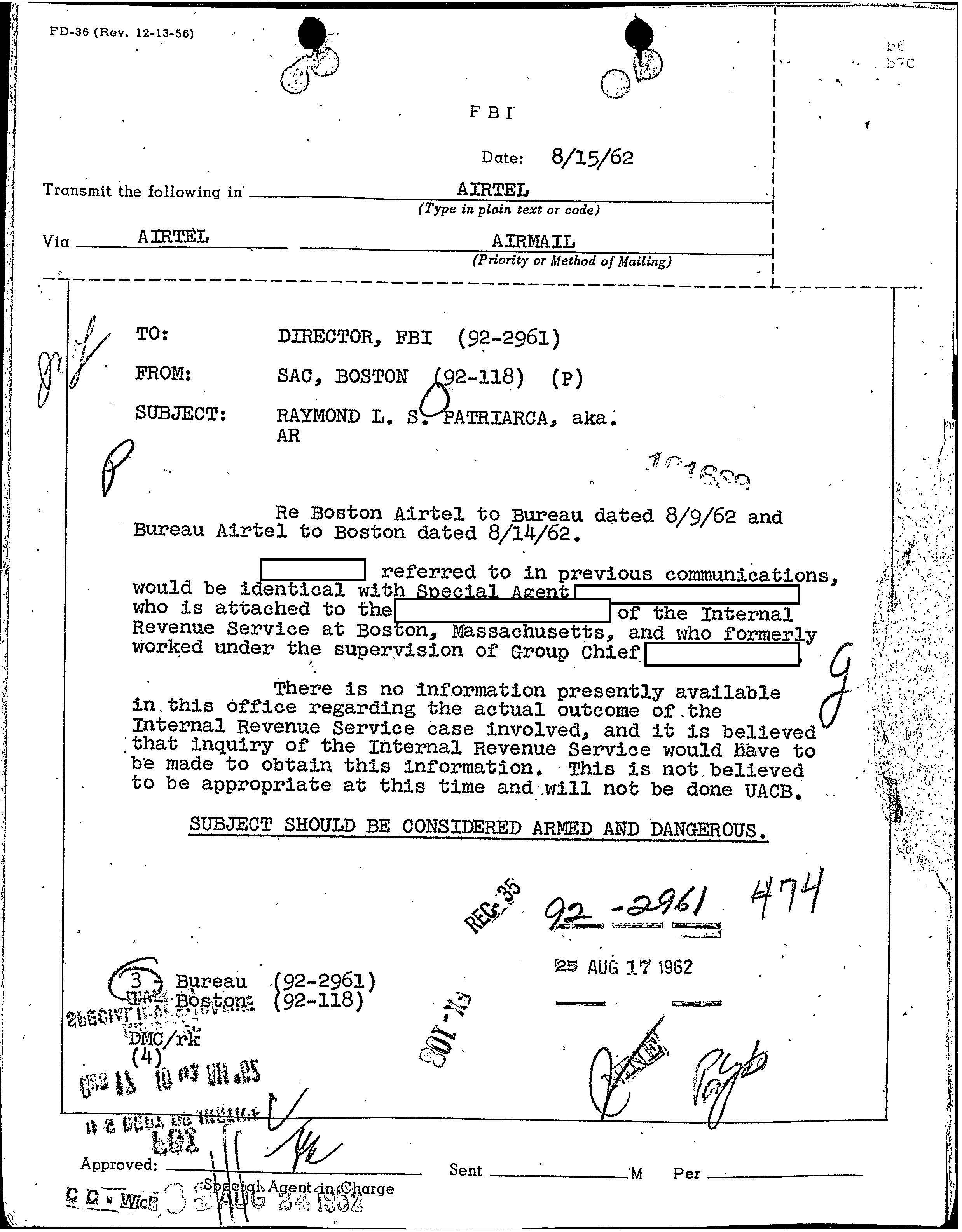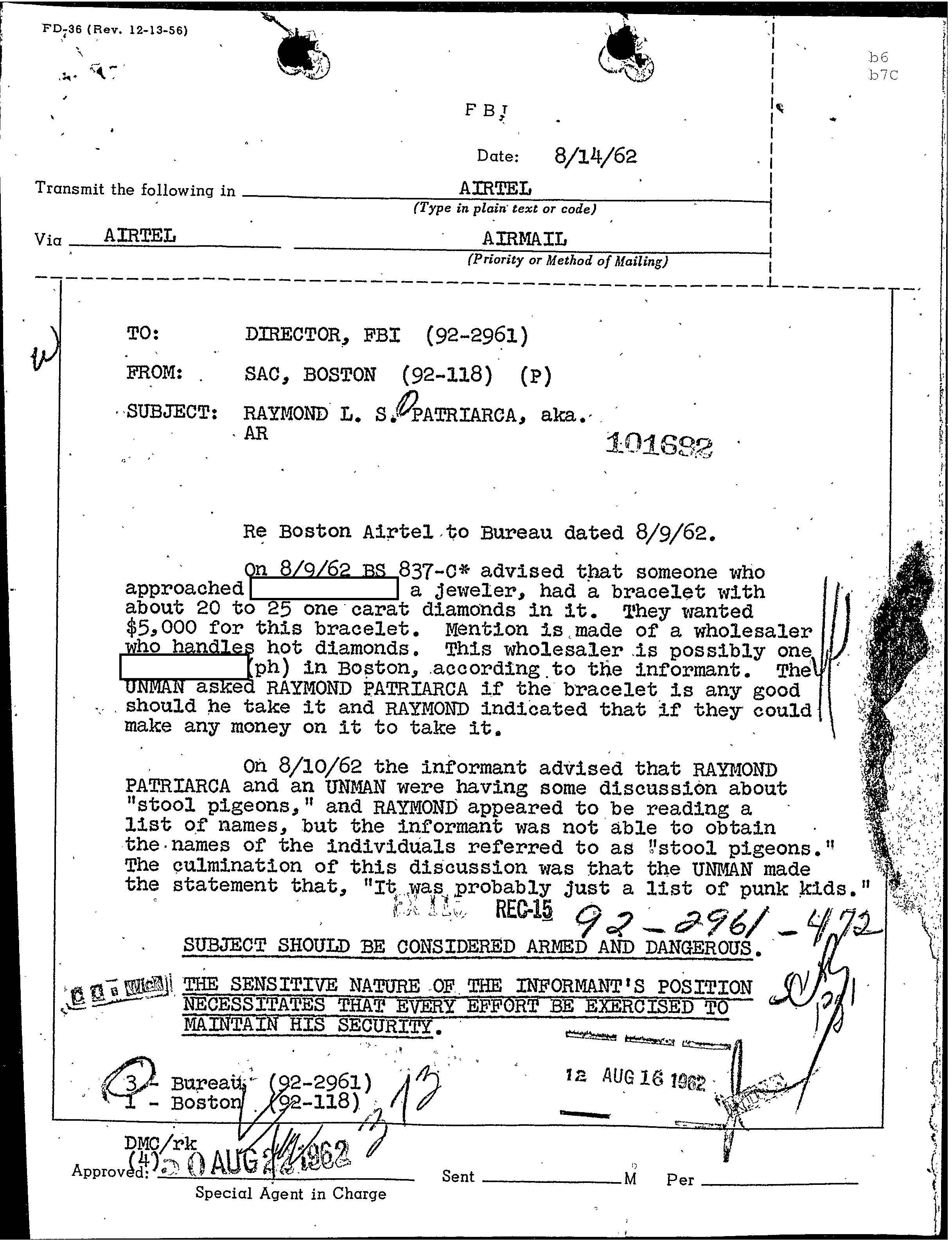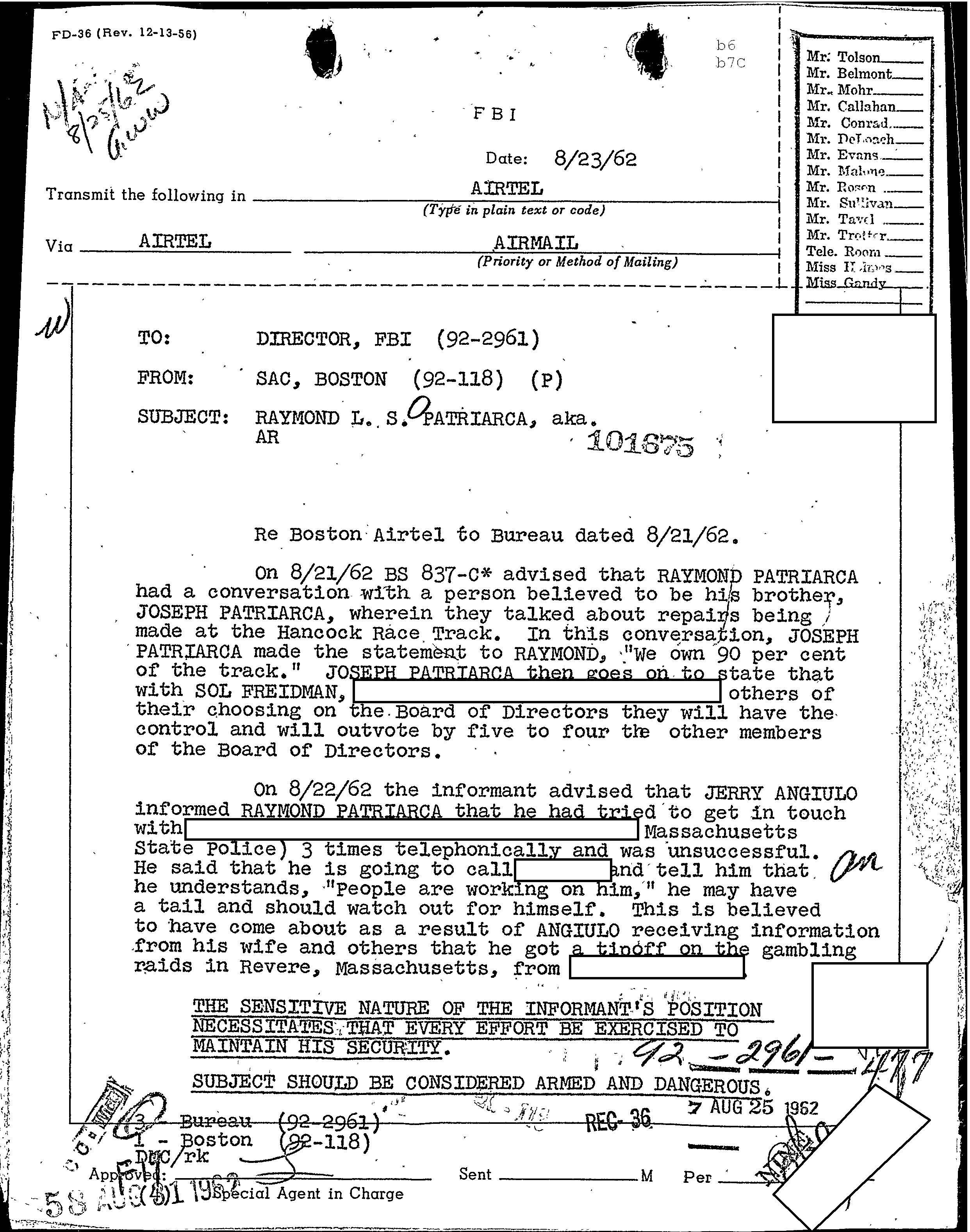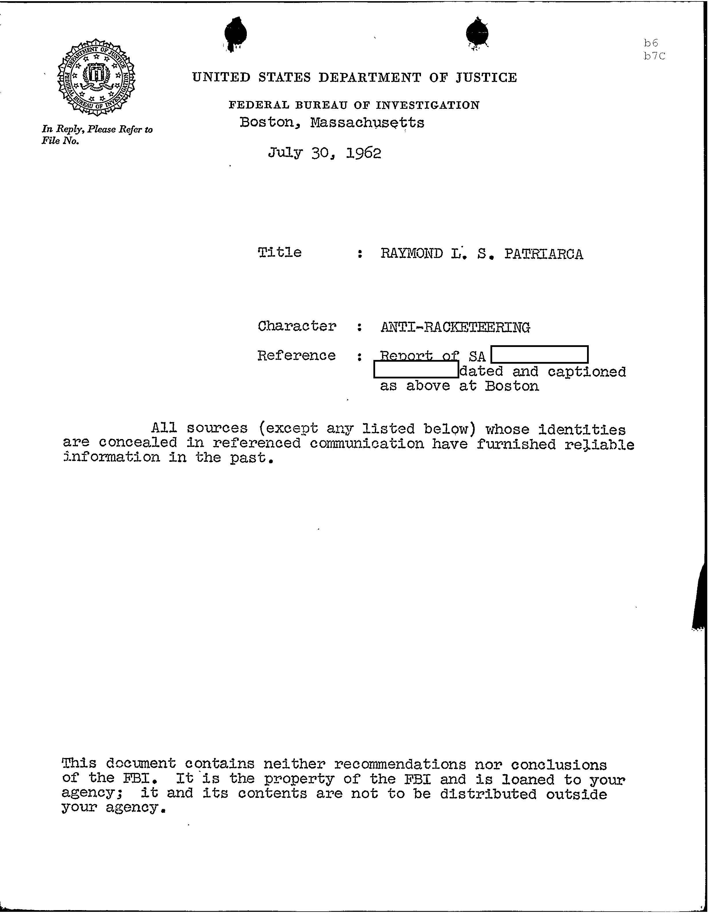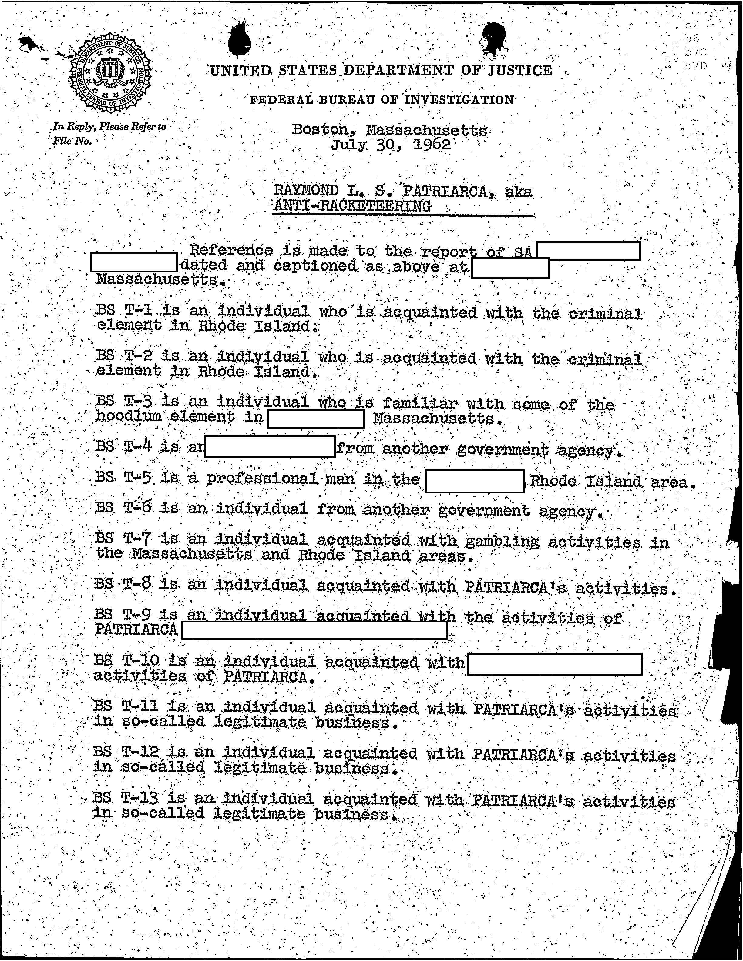 “Patriarca’s activities seem to concern gambling, attempt to corrupt officials and he furnishes general aid and counsel to assorted members of the underworld.”