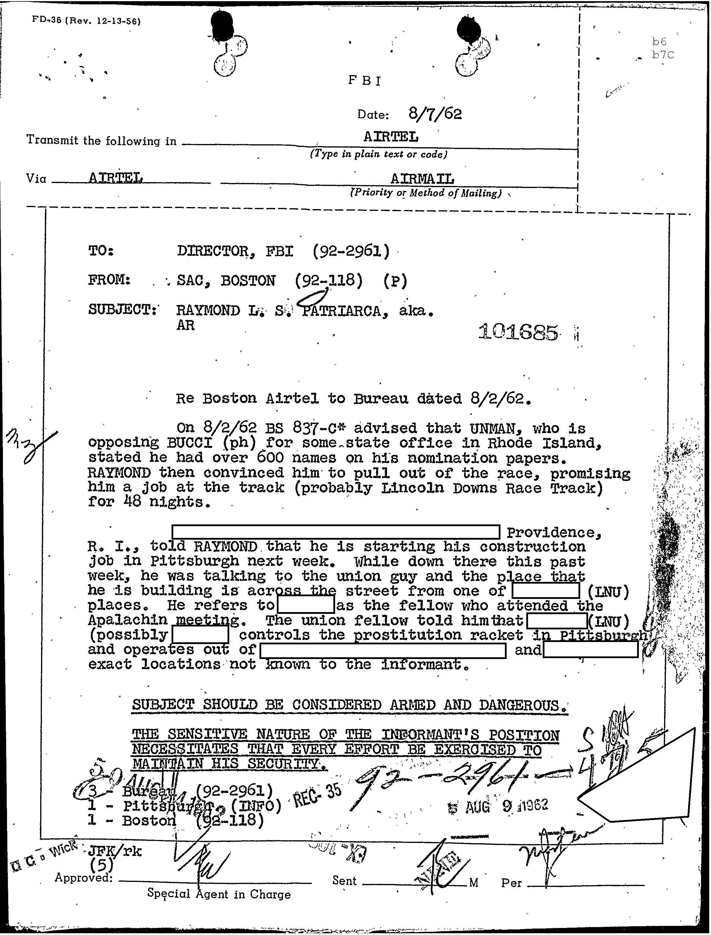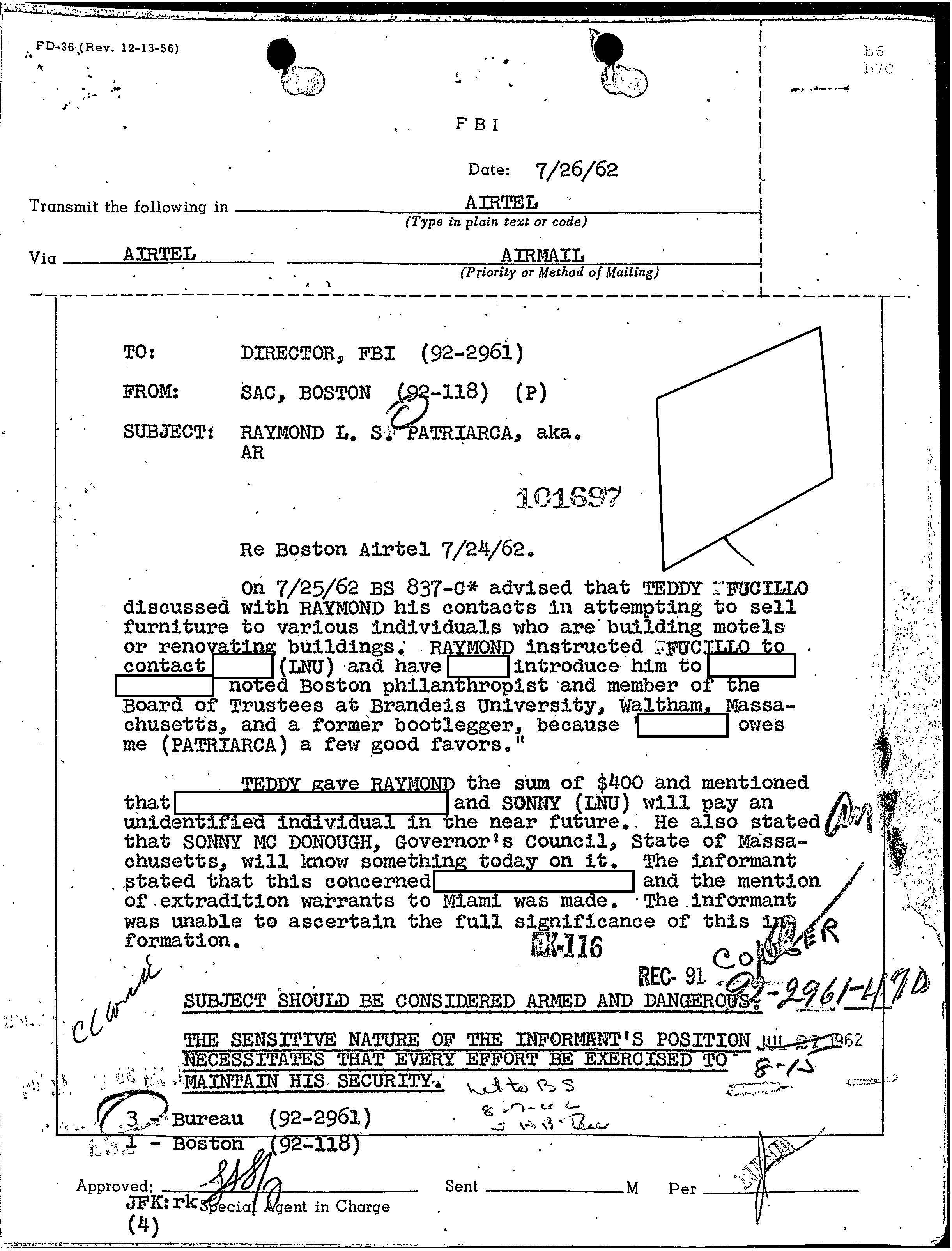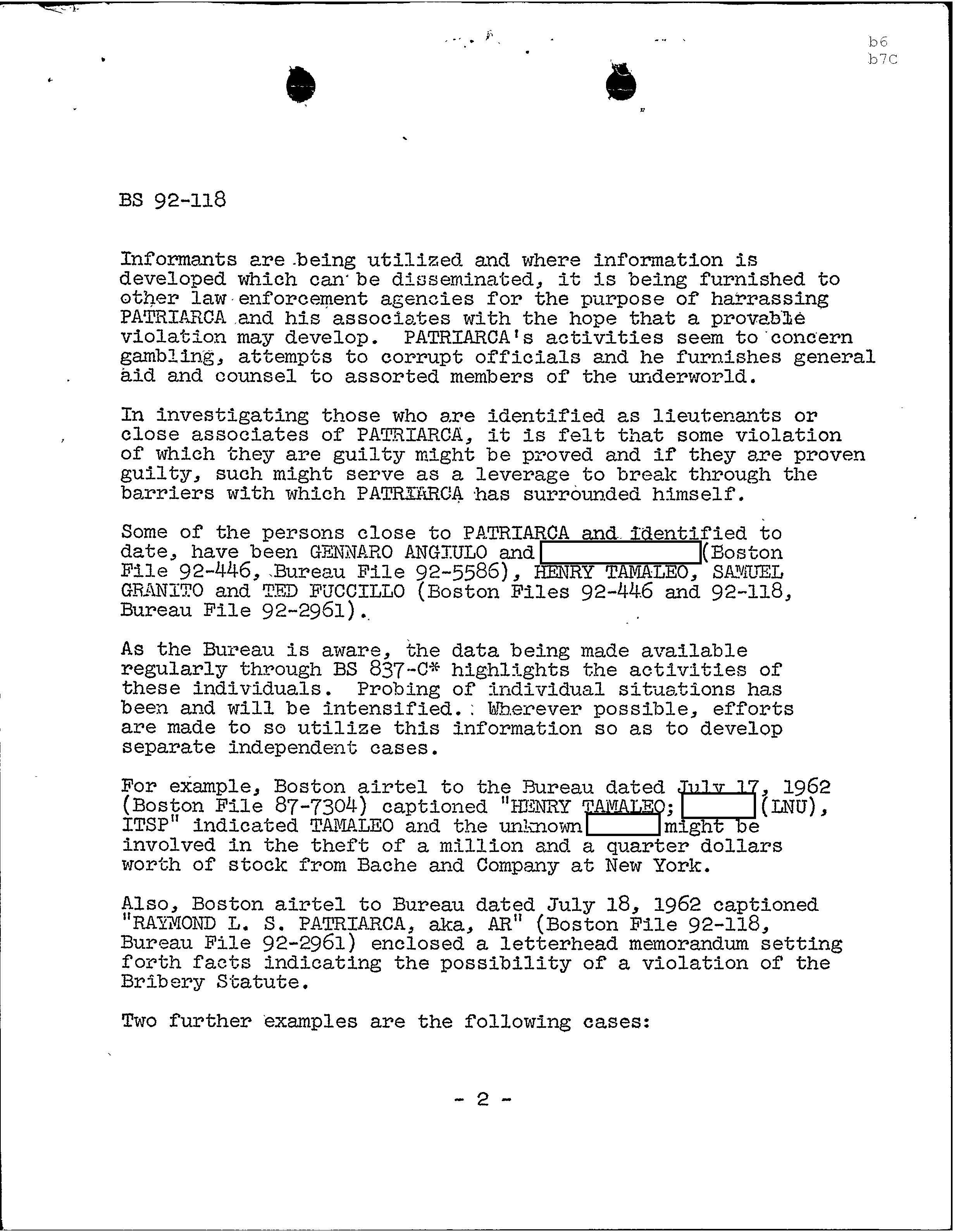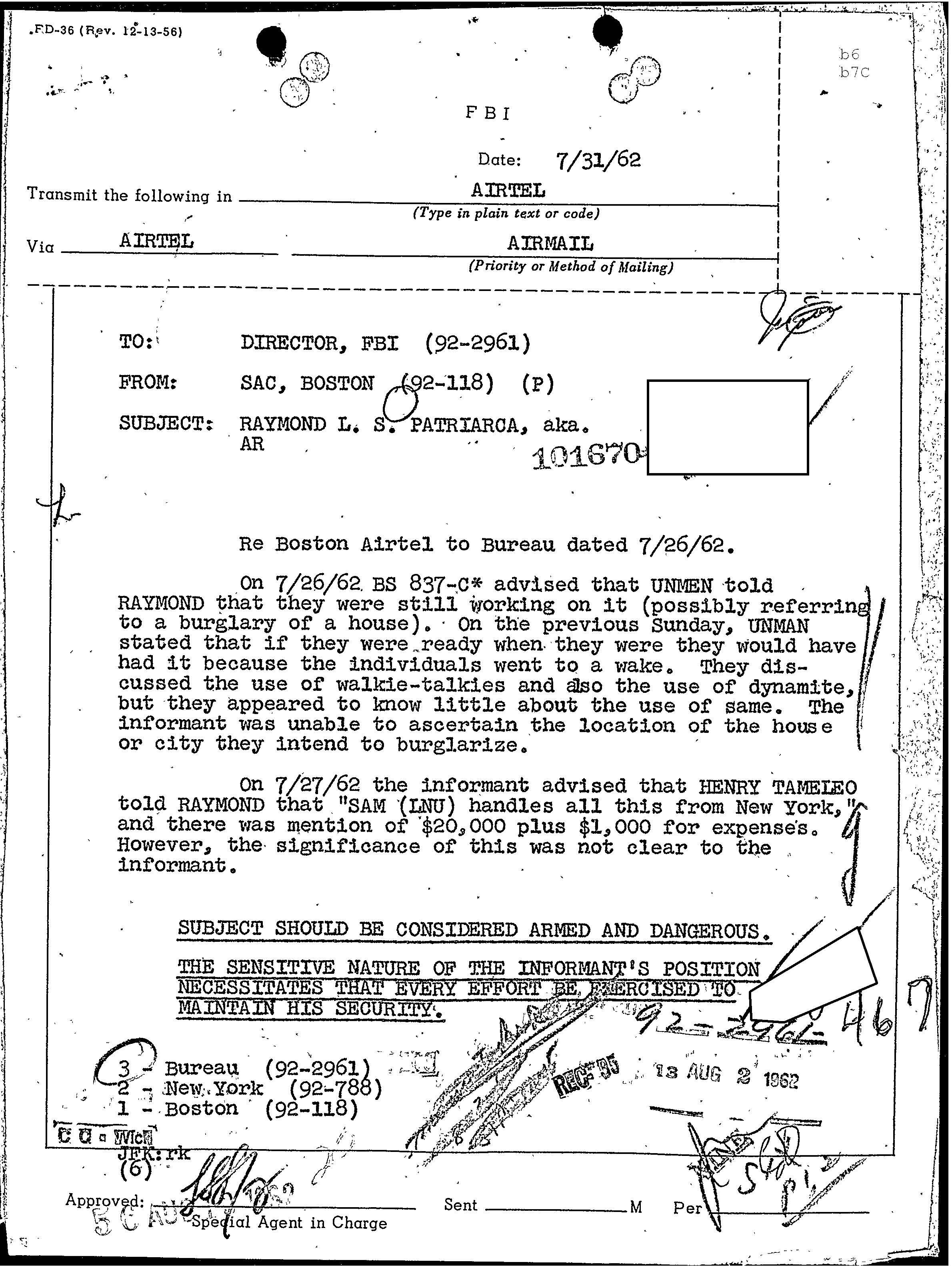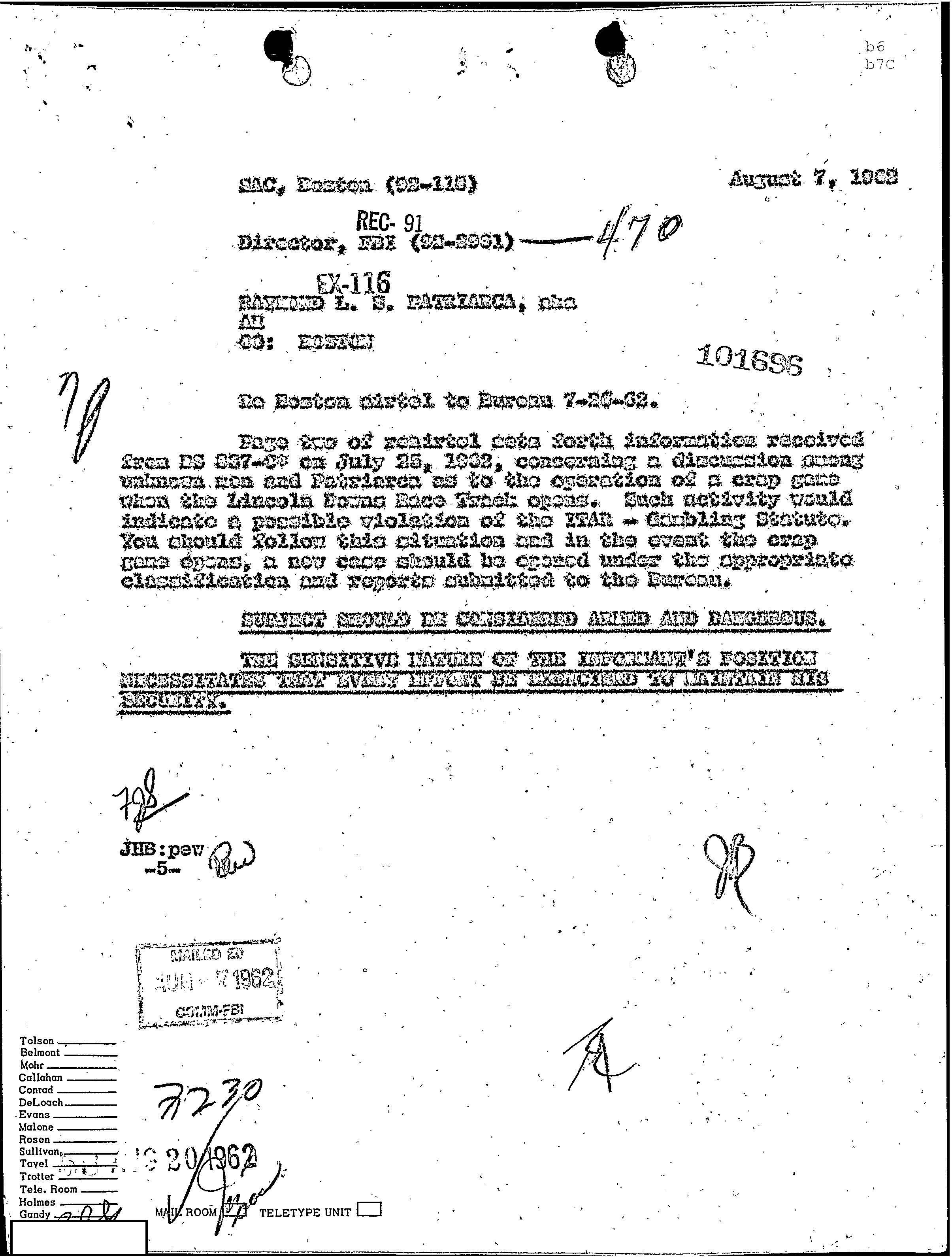 “Patriarca’s activities seem to concern gambling, attempt to corrupt officials and he furnishes general aid and counsel to assorted members of the underworld.”