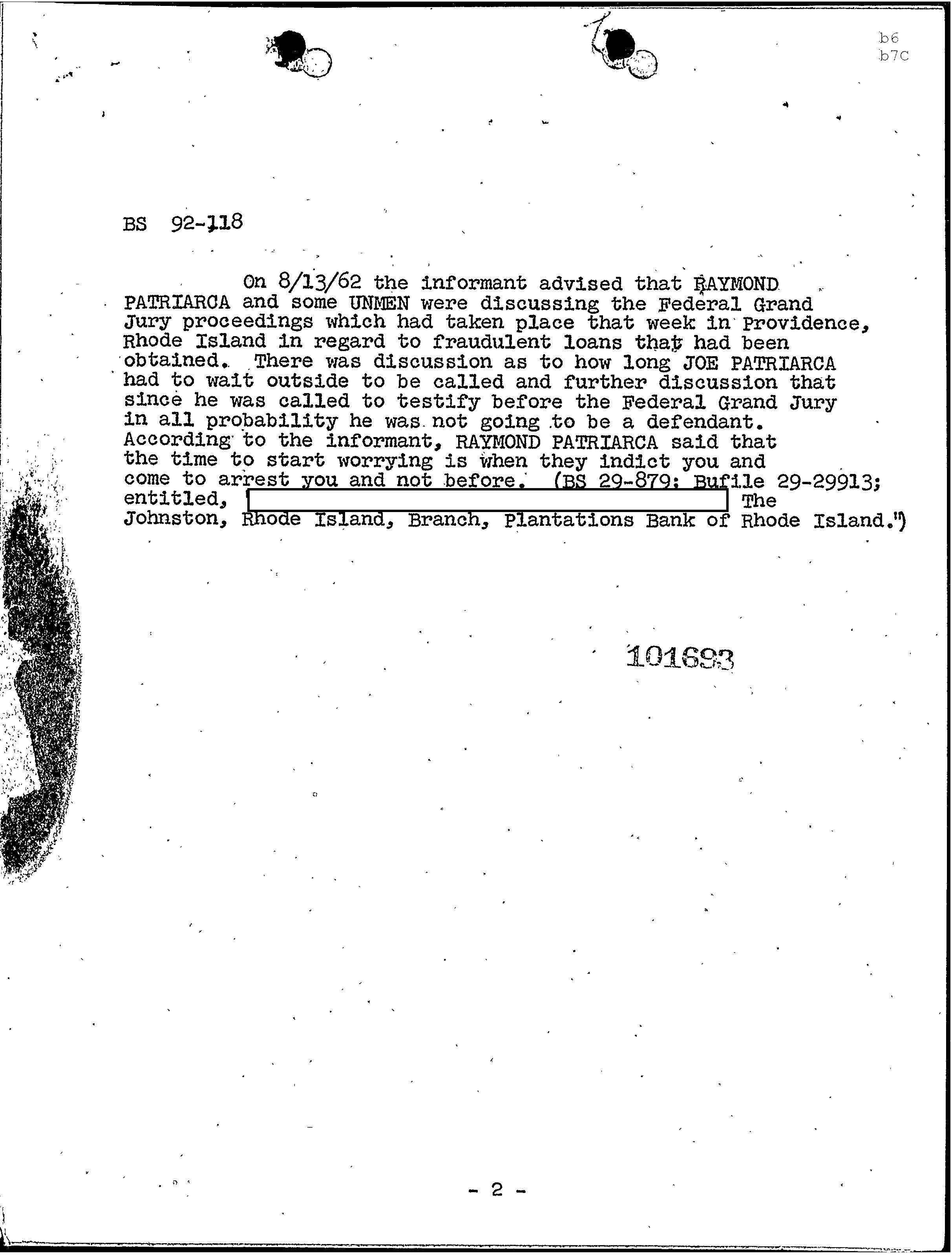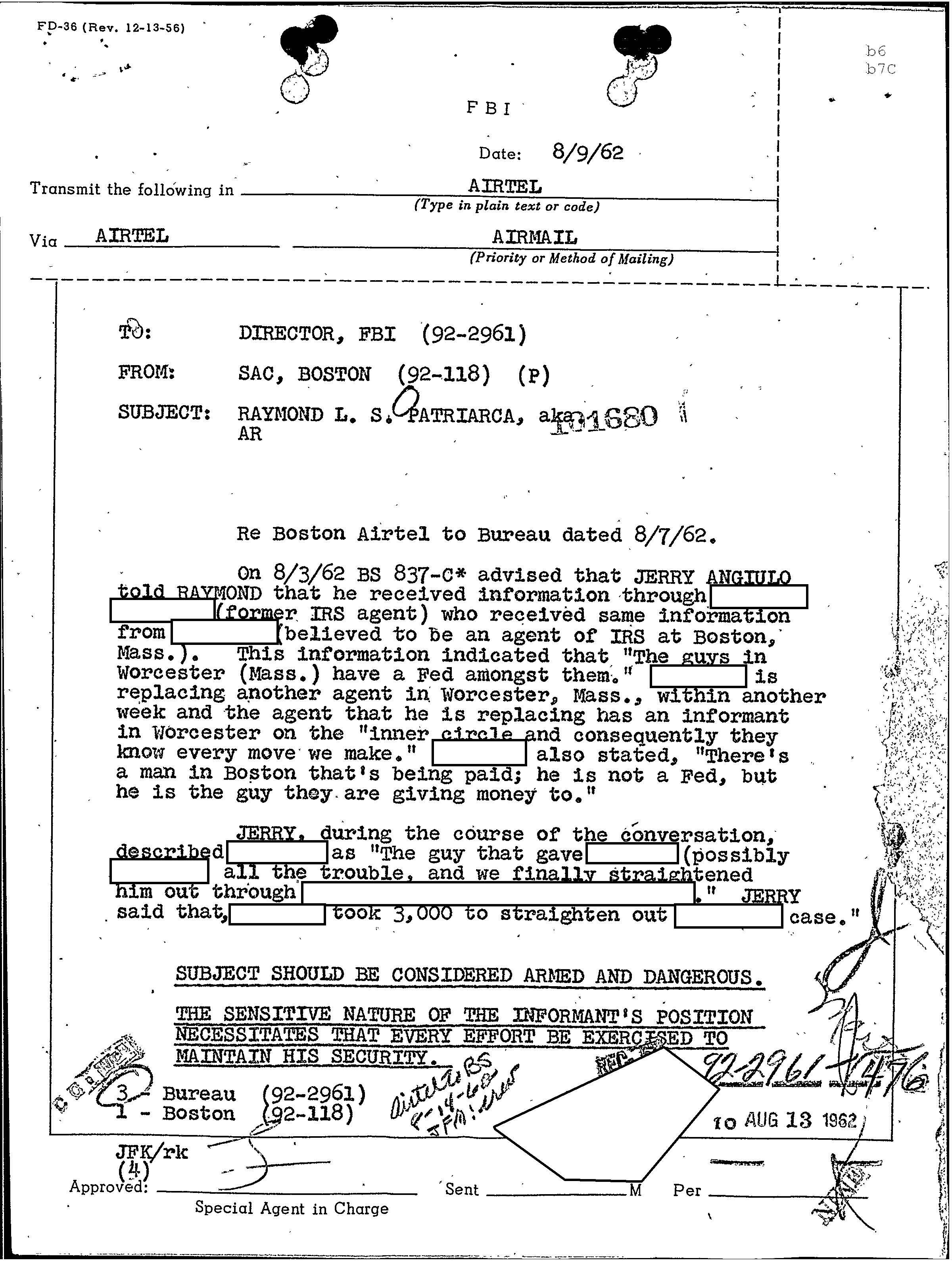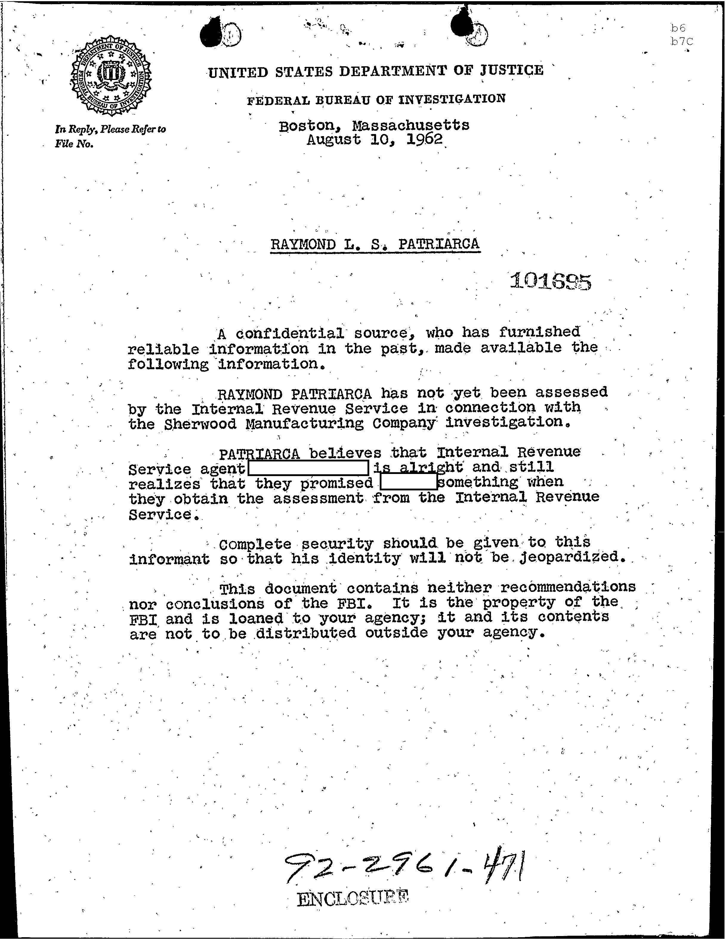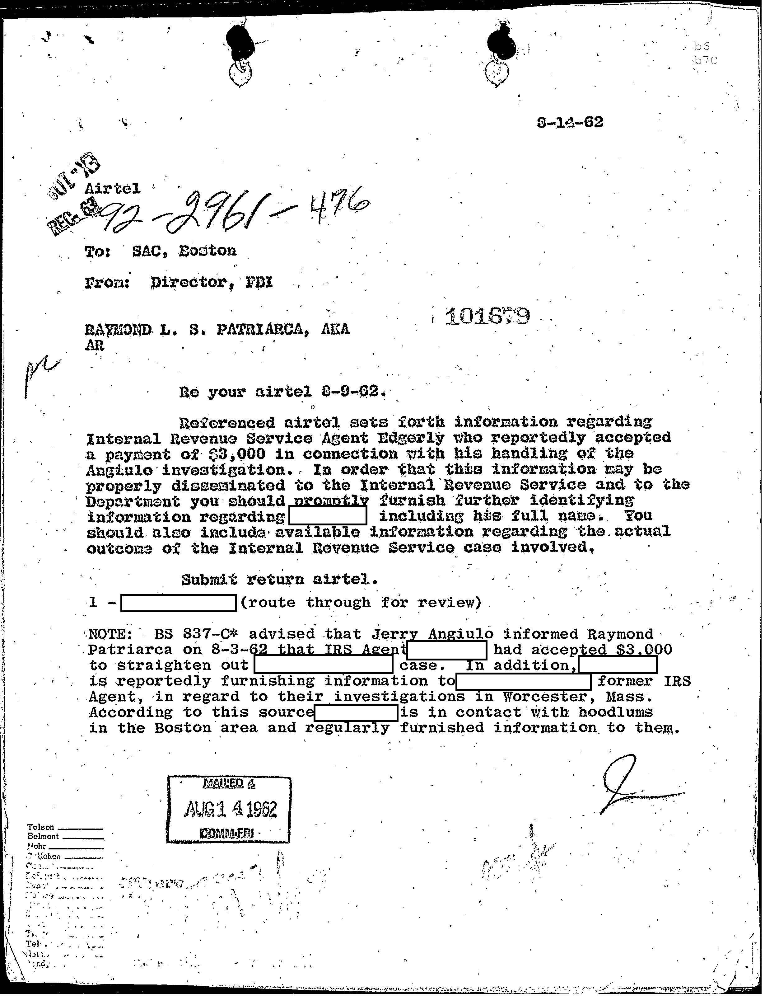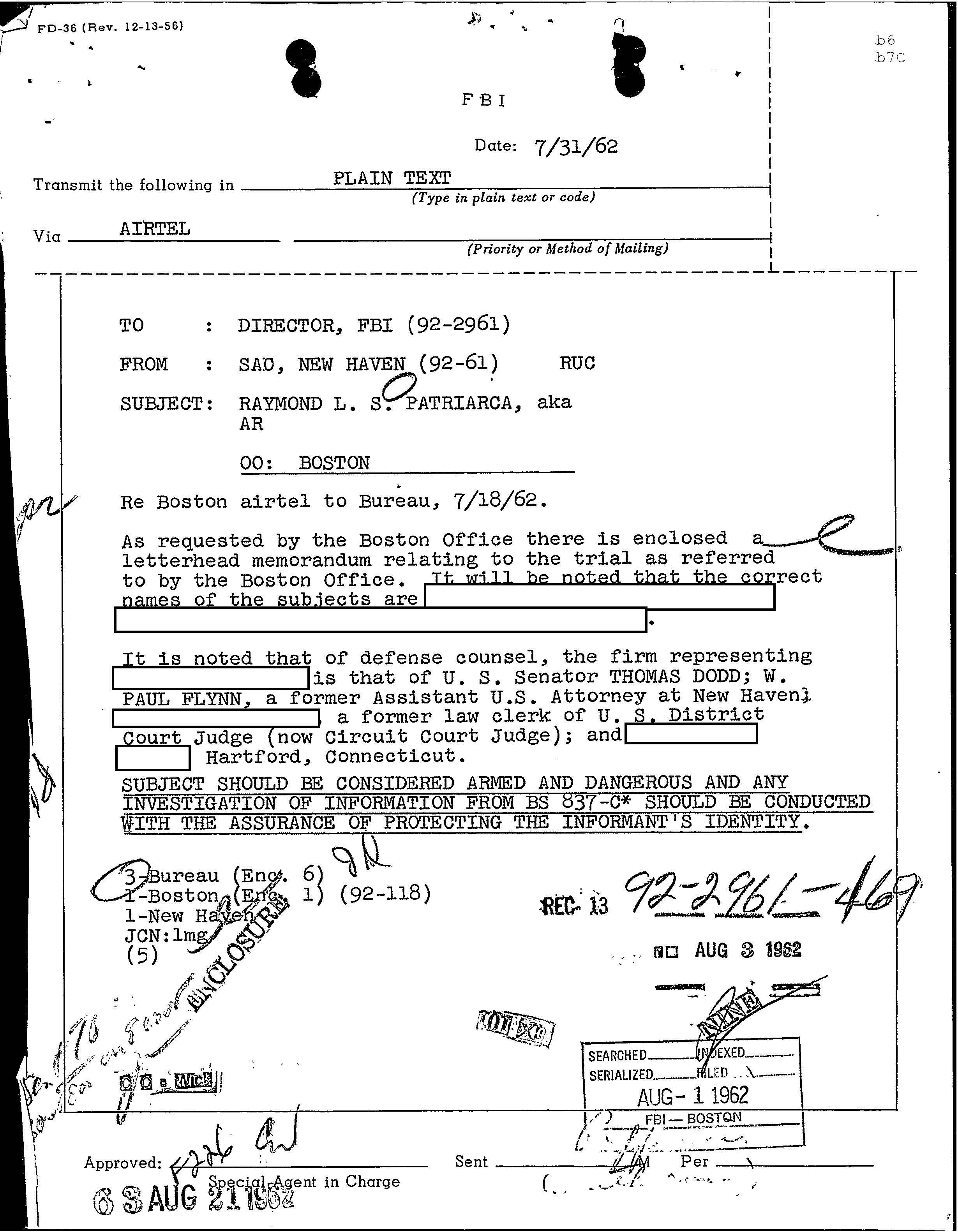 “Patriarca’s activities seem to concern gambling, attempt to corrupt officials and he furnishes general aid and counsel to assorted members of the underworld.”