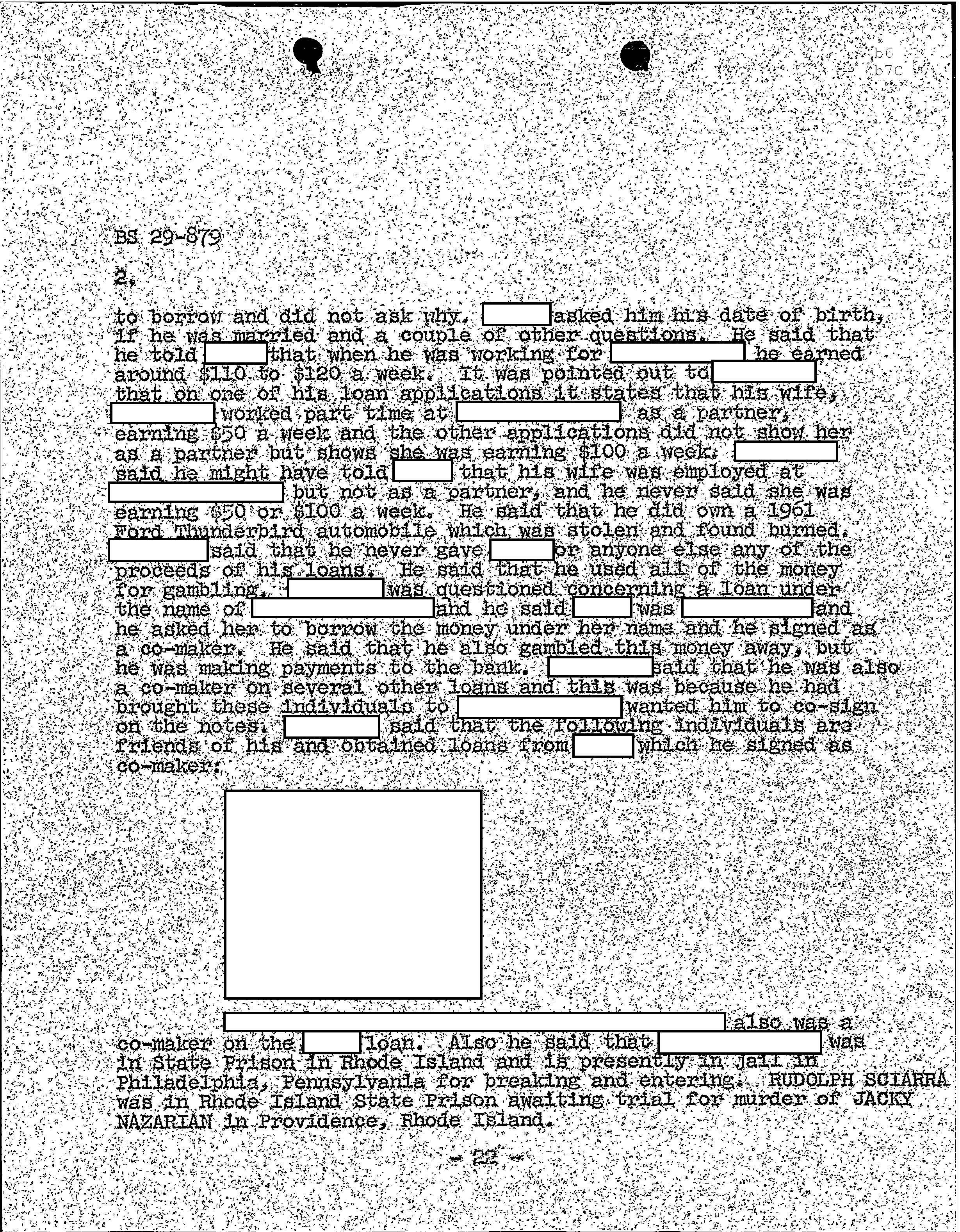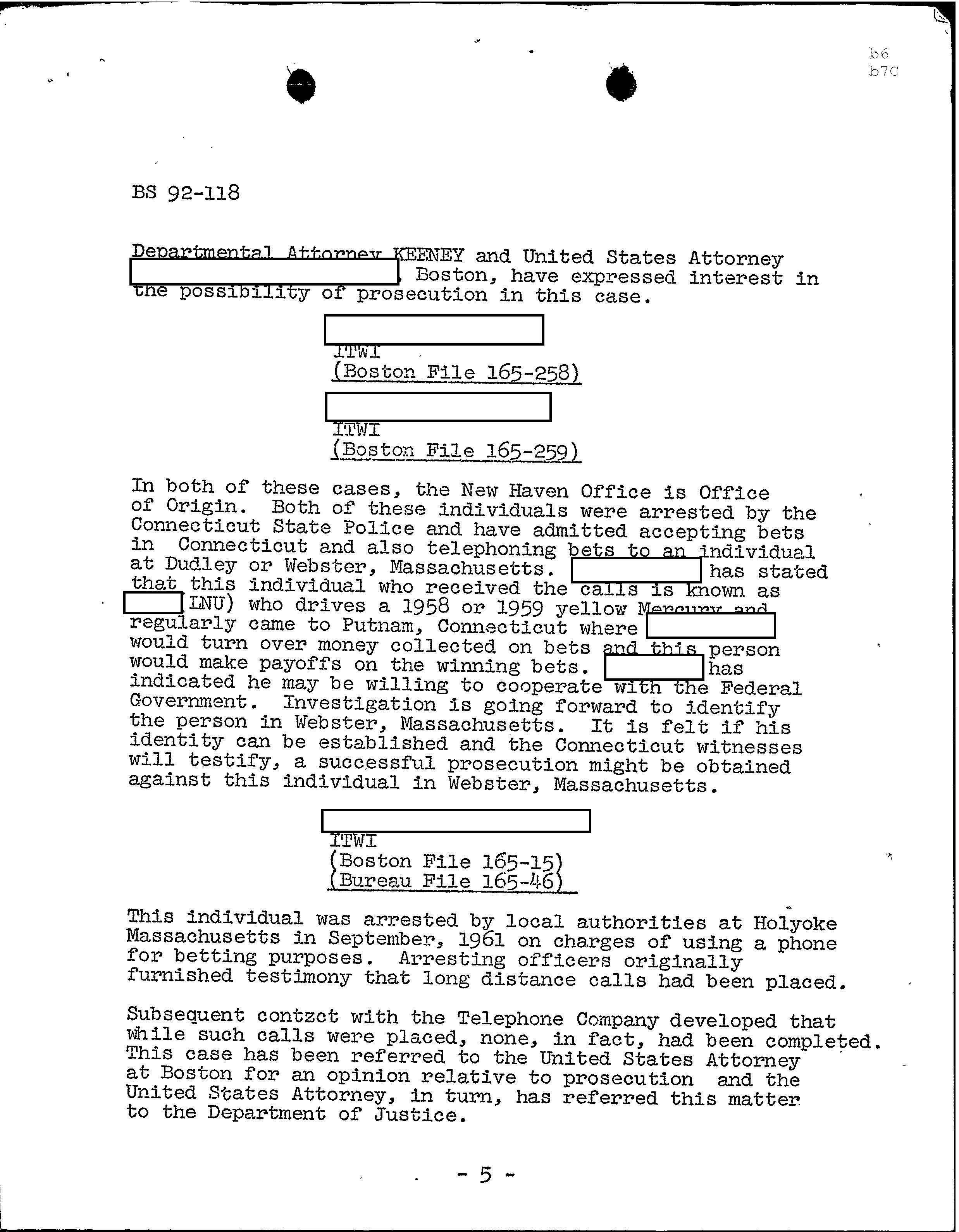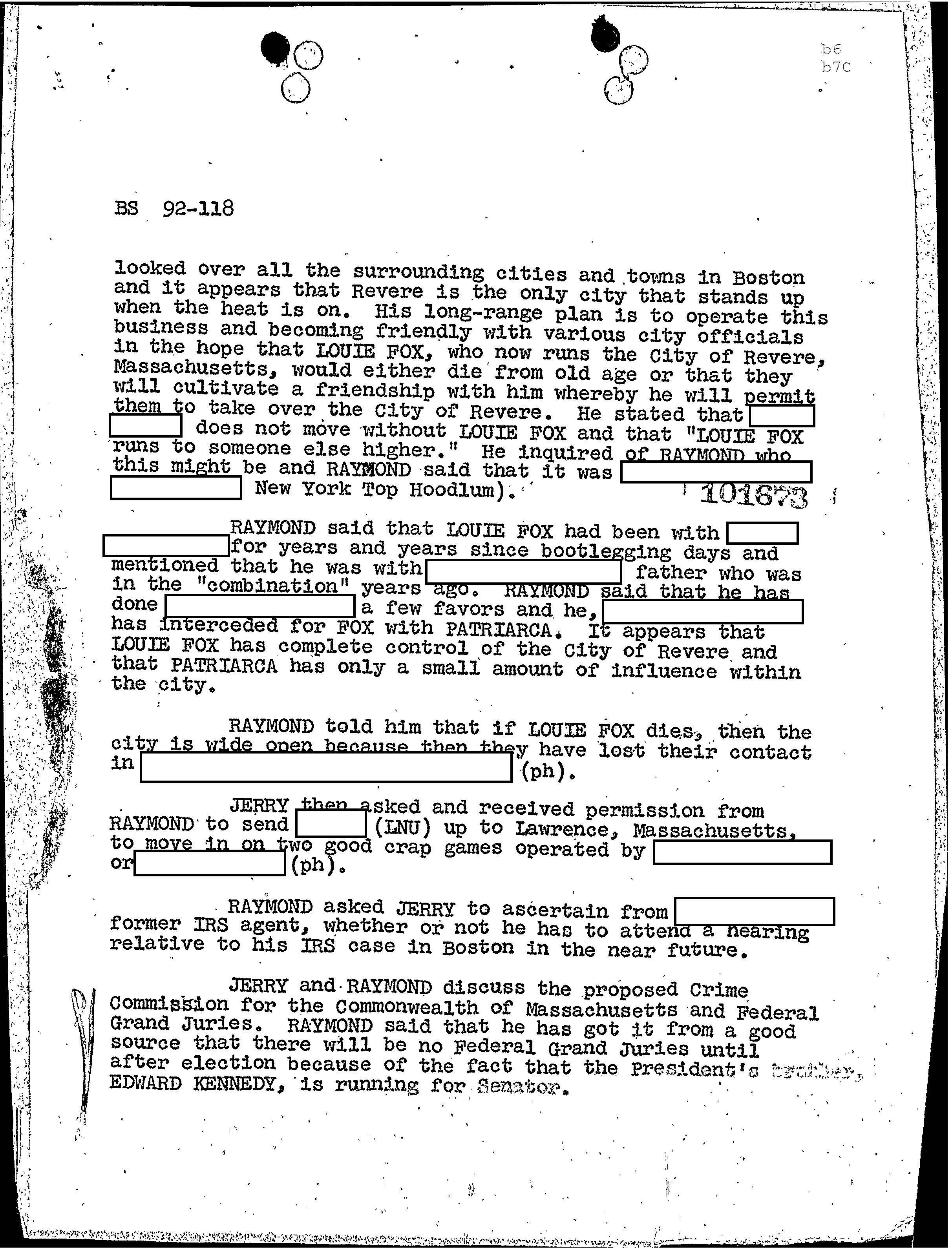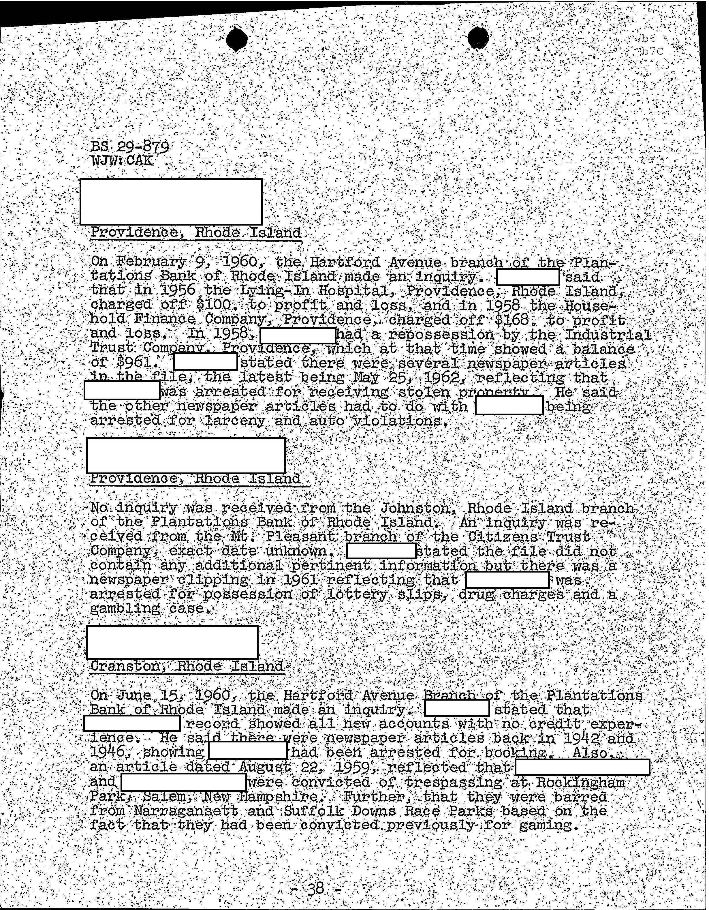 On Page 54, the documents unveil, “In this connection, on July 27, 1962, the Federal Grant Jury at Boston returned indictments against seven individuals on charges of conspiracy to defraud the government and evading gambling excise taxes.”