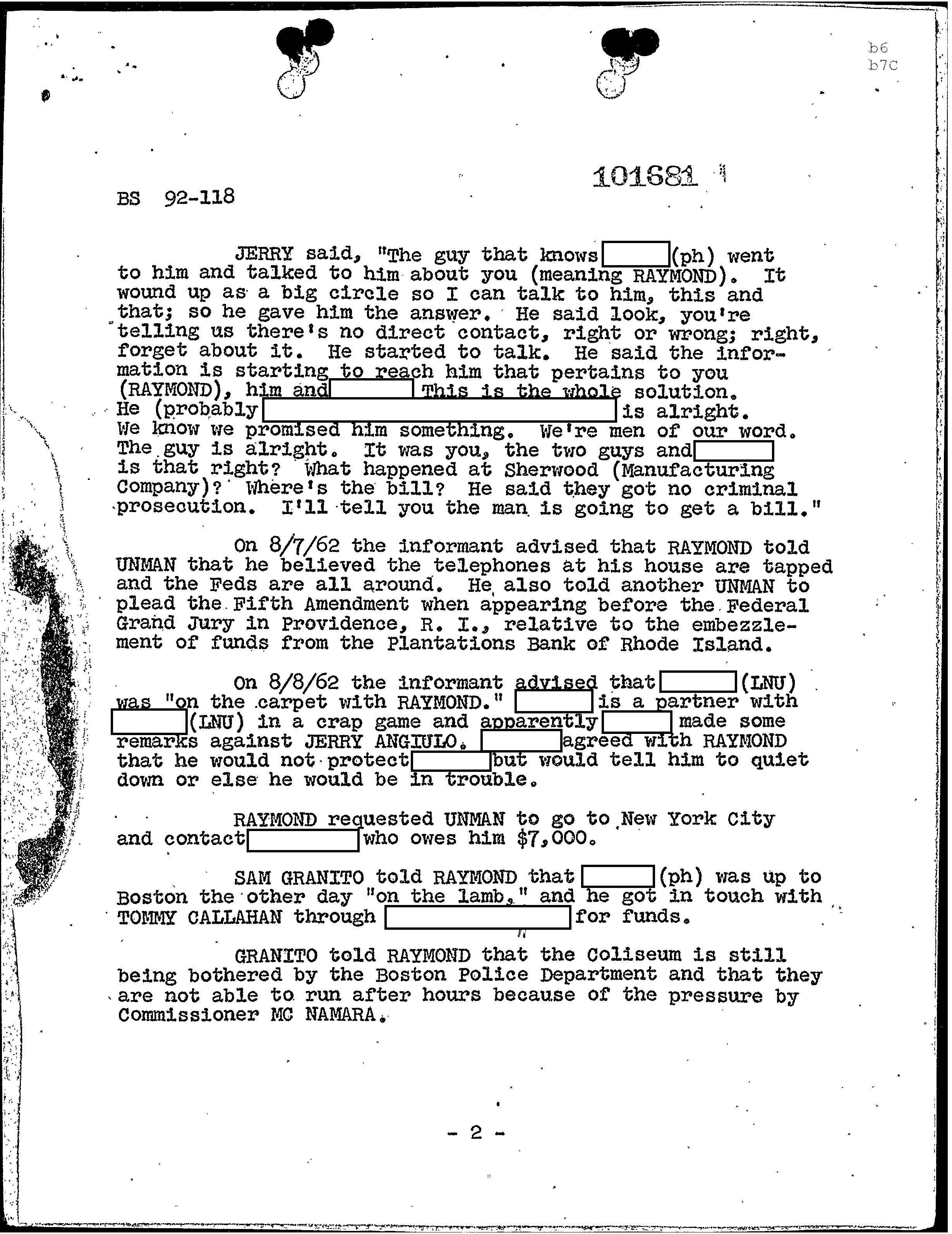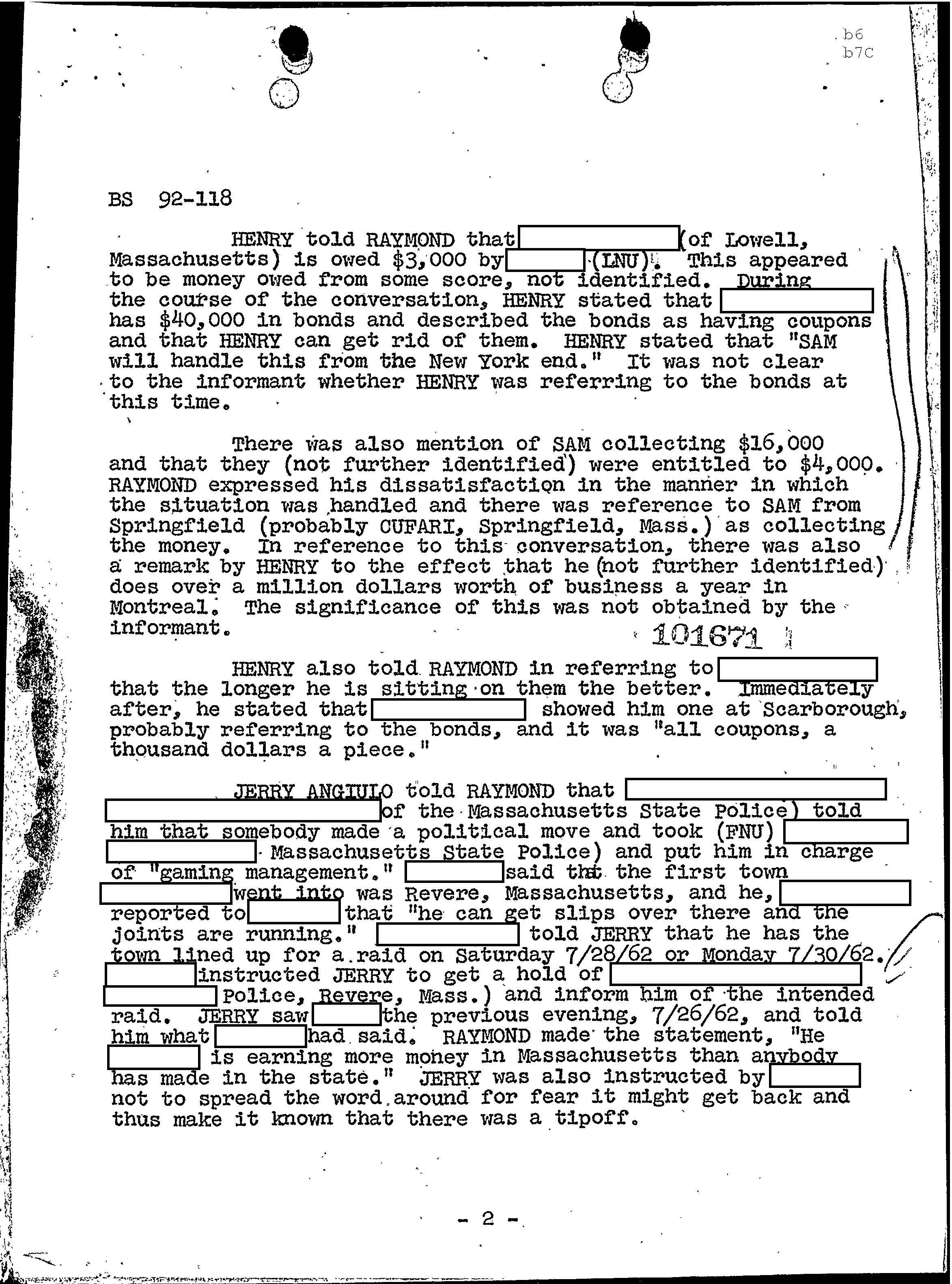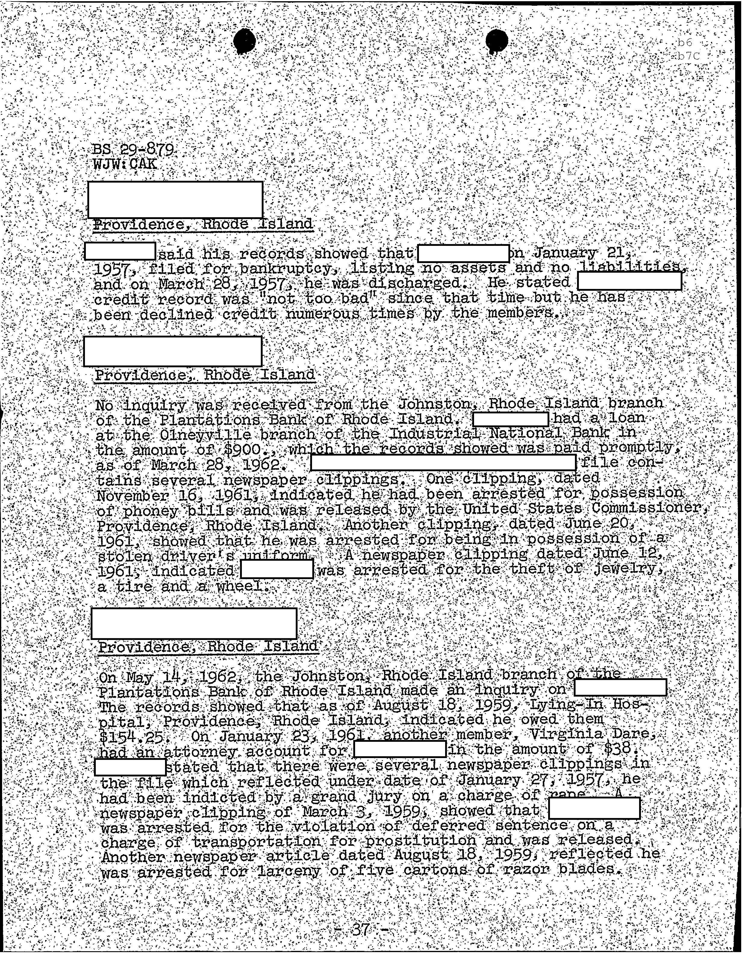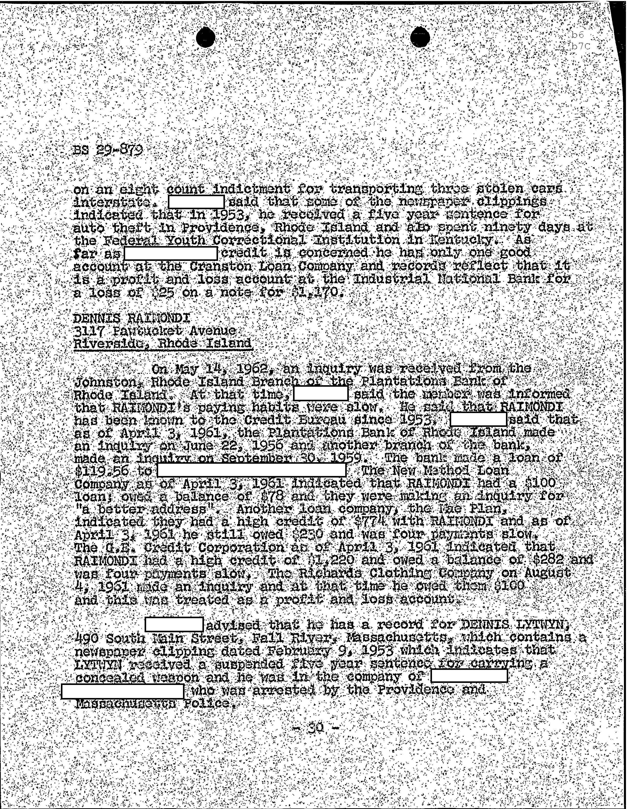 On Page 54, the documents unveil, “In this connection, on July 27, 1962, the Federal Grant Jury at Boston returned indictments against seven individuals on charges of conspiracy to defraud the government and evading gambling excise taxes.”