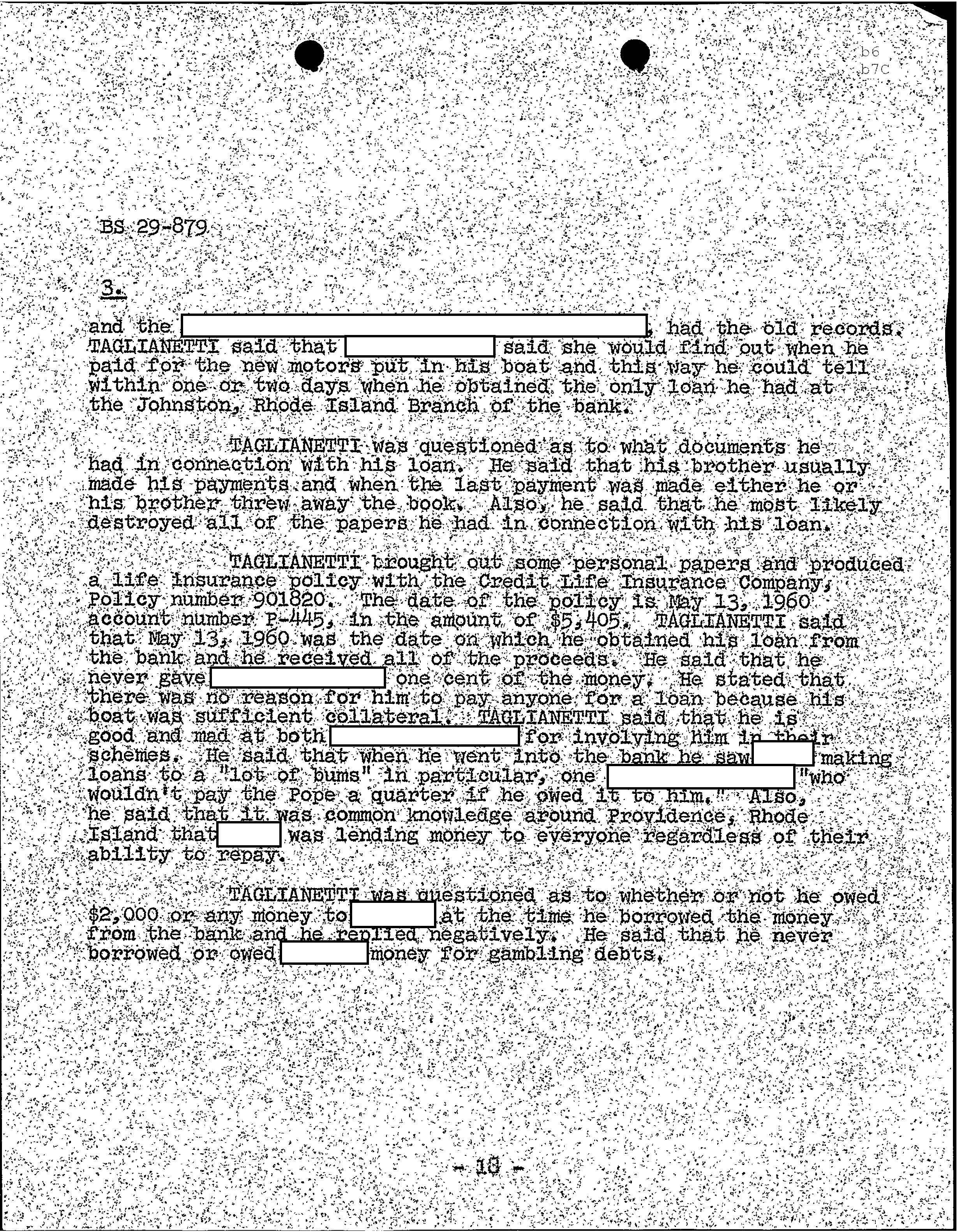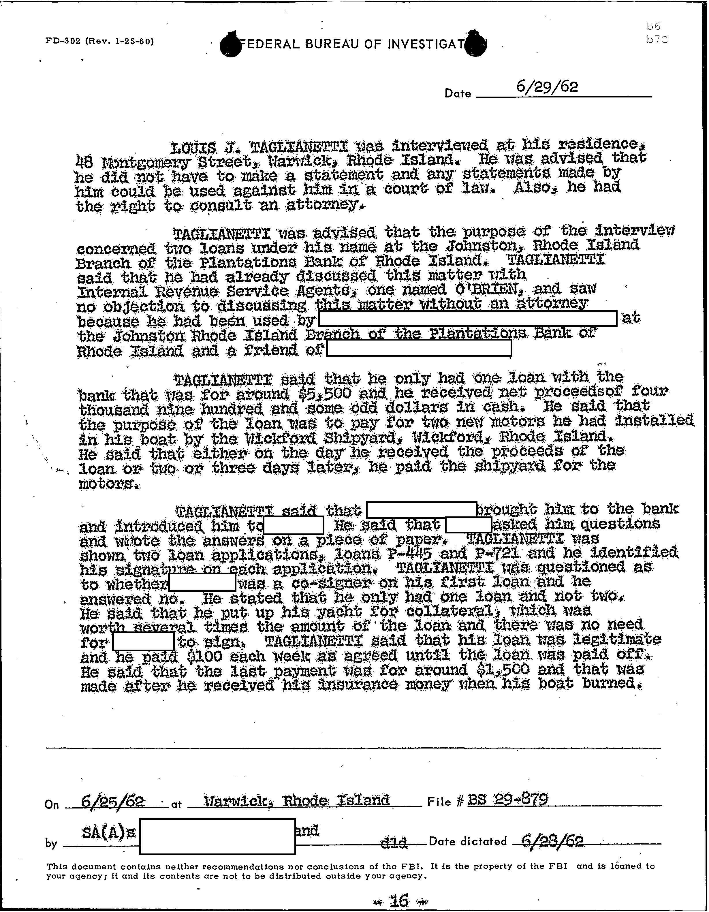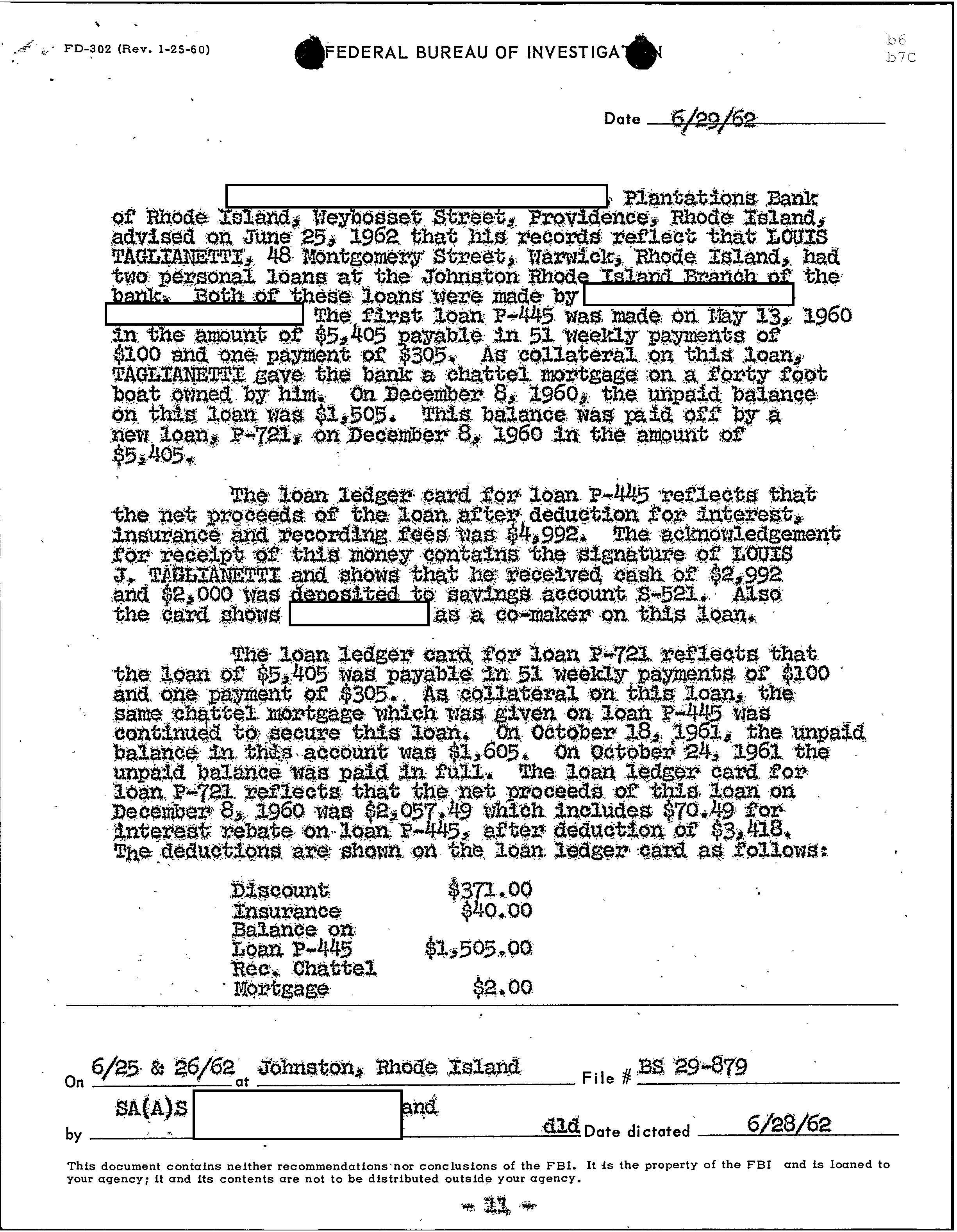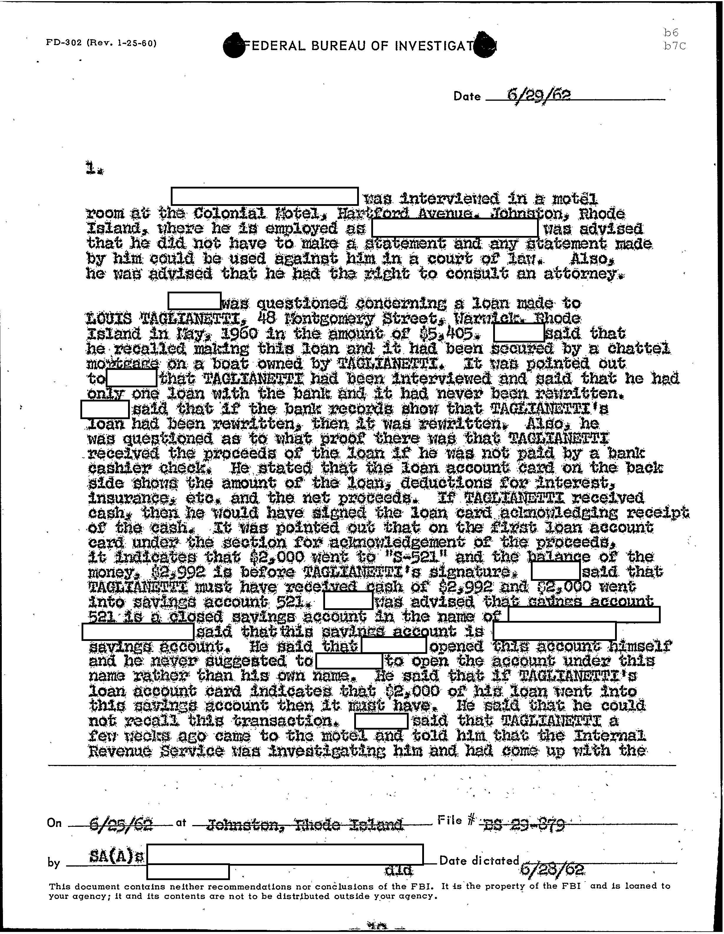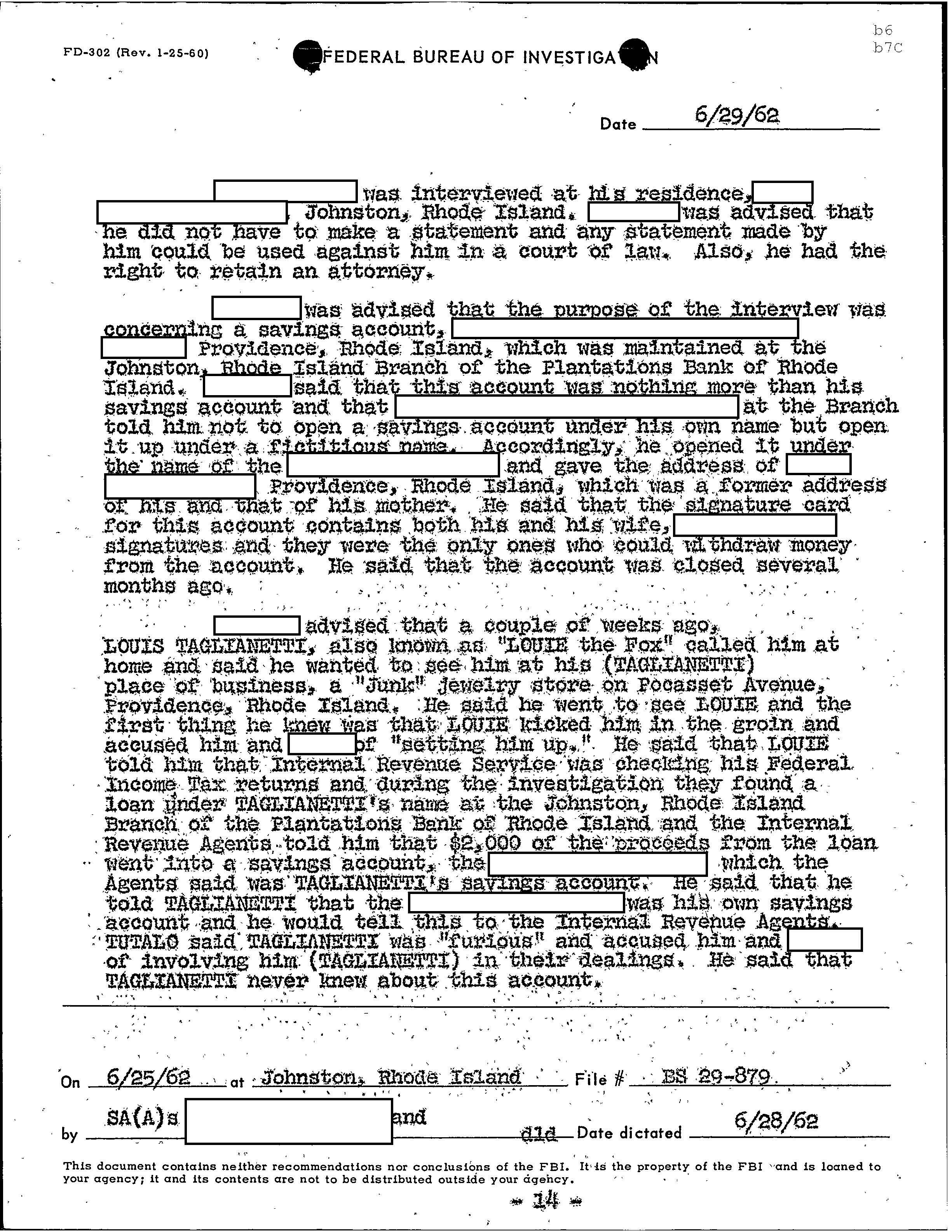 According to FBI document Louie the Fox’s violence was more extensive. “REDACTED advised that a couple of weeks ago, Louis Taglianetti, also known as “LOUIE the Fox” called him at home and said he wanted to see him at his place of business, a “Junk” jewelry store on Pocasset Avenue, Providence, Rhode Island. He said he went to see LOUIE and the first thing he knew was that LOUIE kicked him in the groin and accused him and REDACTED of “setting him up.”