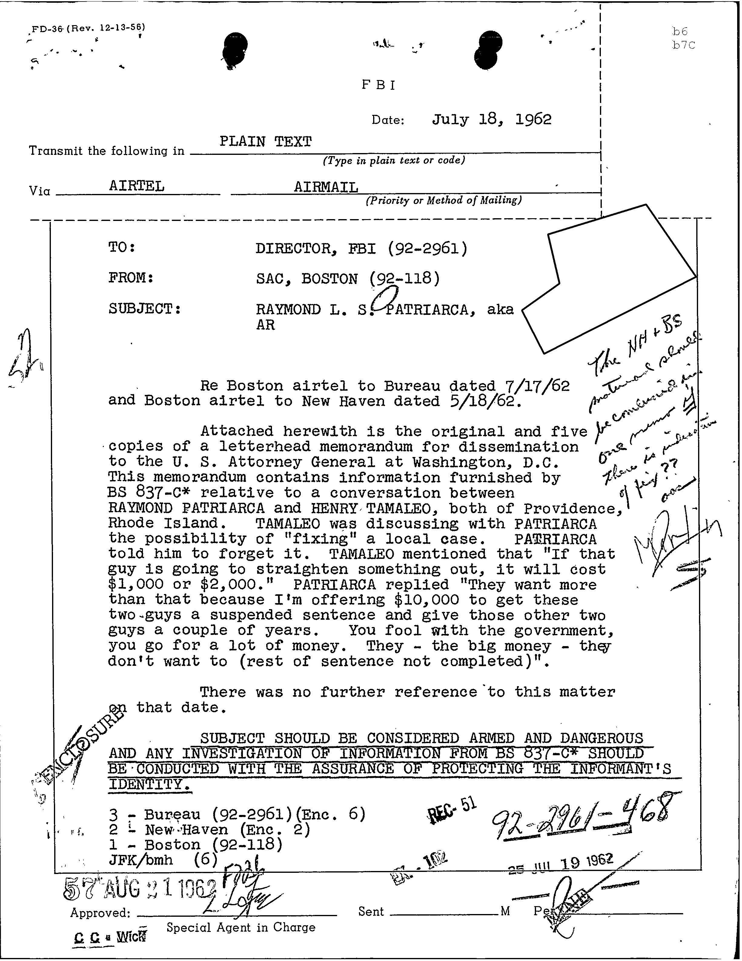 “Recently, PATRIARCA was in touch with [Henry] TAMALEO and told him that he offered several thousand dollars to obtain suspended sentences for some unknown individuals and also to obtain a sentence of a couple of years for others. PATRIARCA indicated that when you deal with the government it costs a lot of money.”