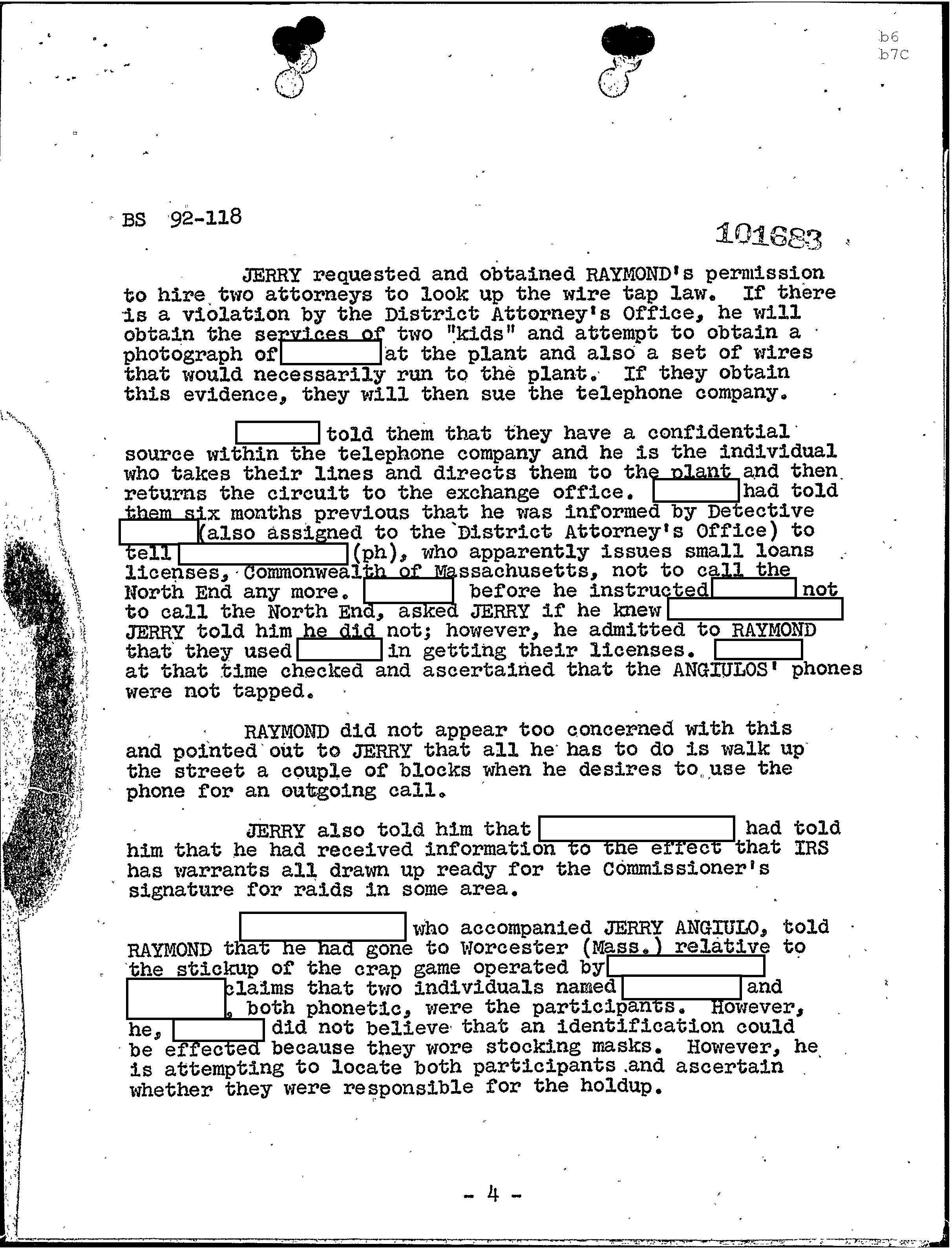 An informant updates Patriarca that they are still working on the burglary of a house. “They discussed the use of walkie-talkies and also the use of dynamite, but they appeared to know little about the use of the same.”