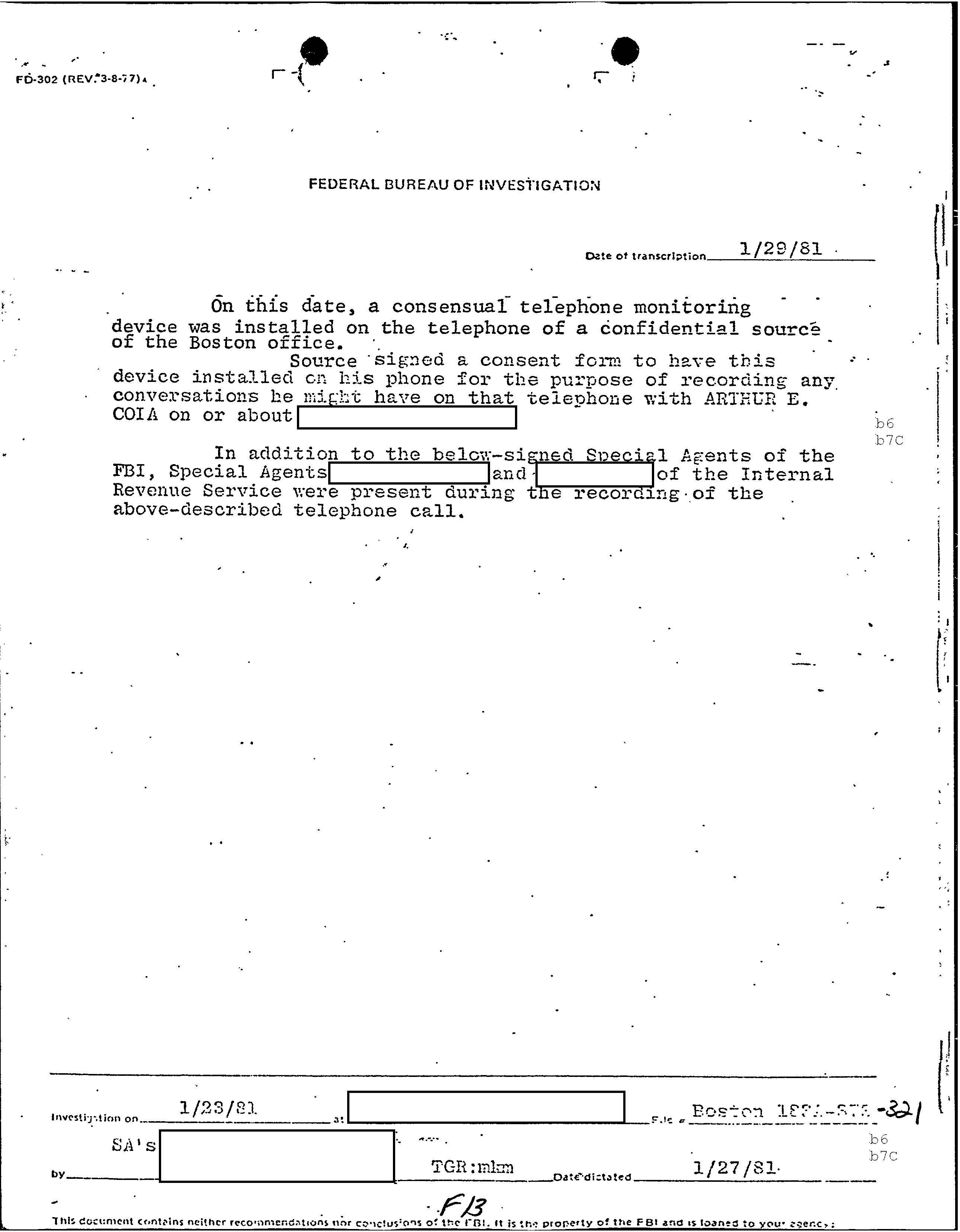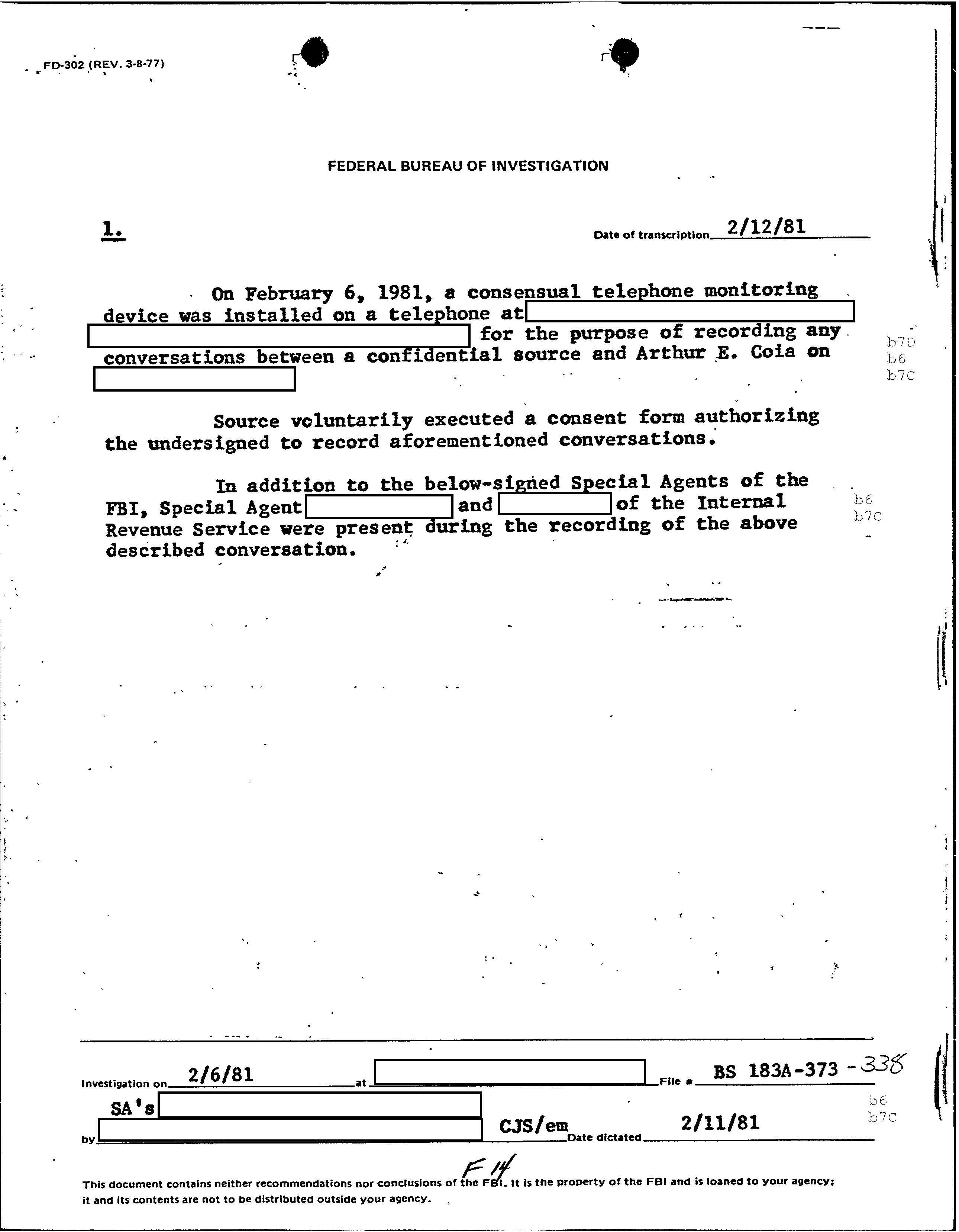PAGE 57 FBI wire a source to tape COIA in his office. “REDACTED had a Nagra body recorder and transmitter affixed to person.”
