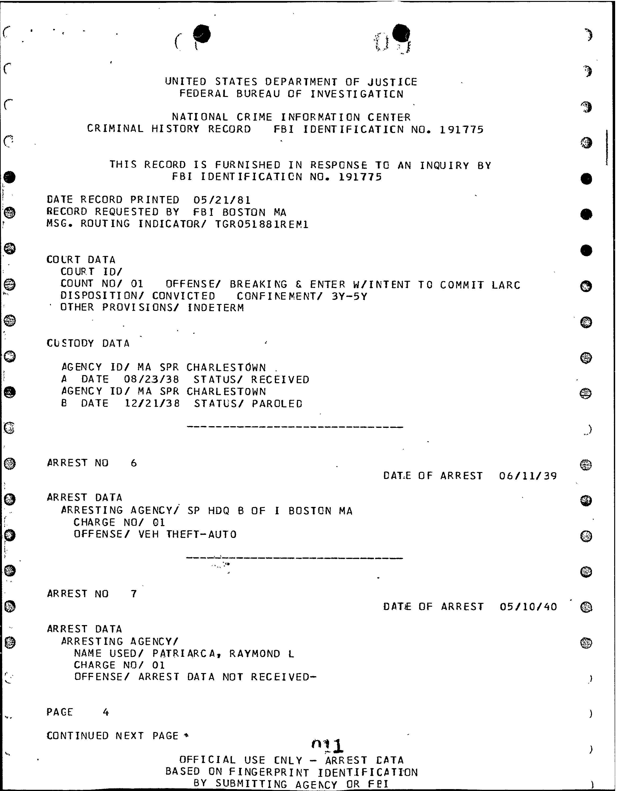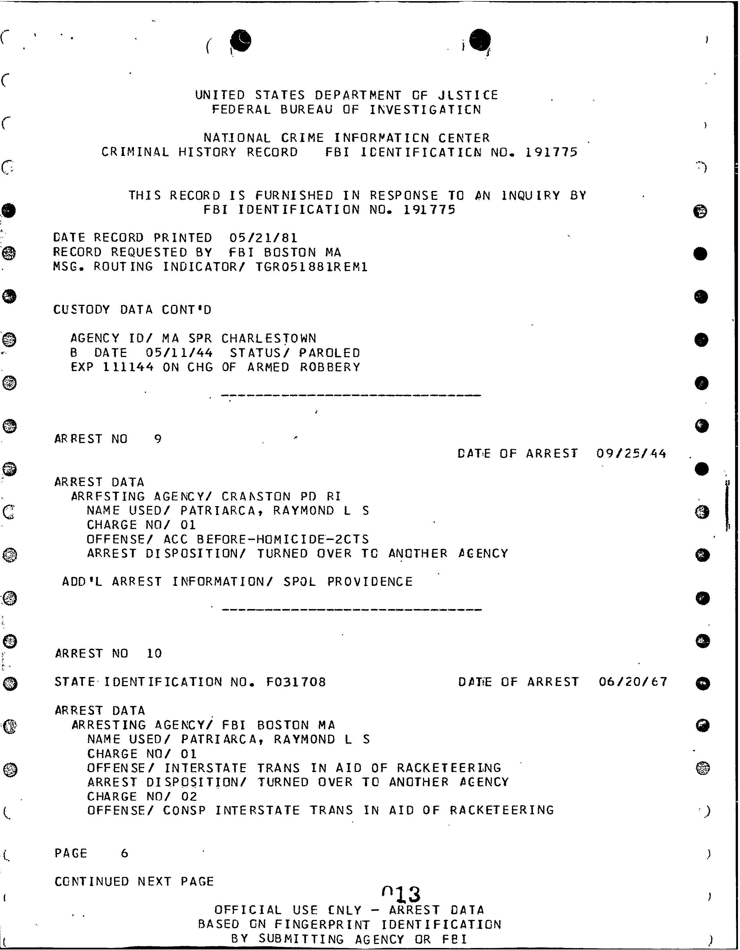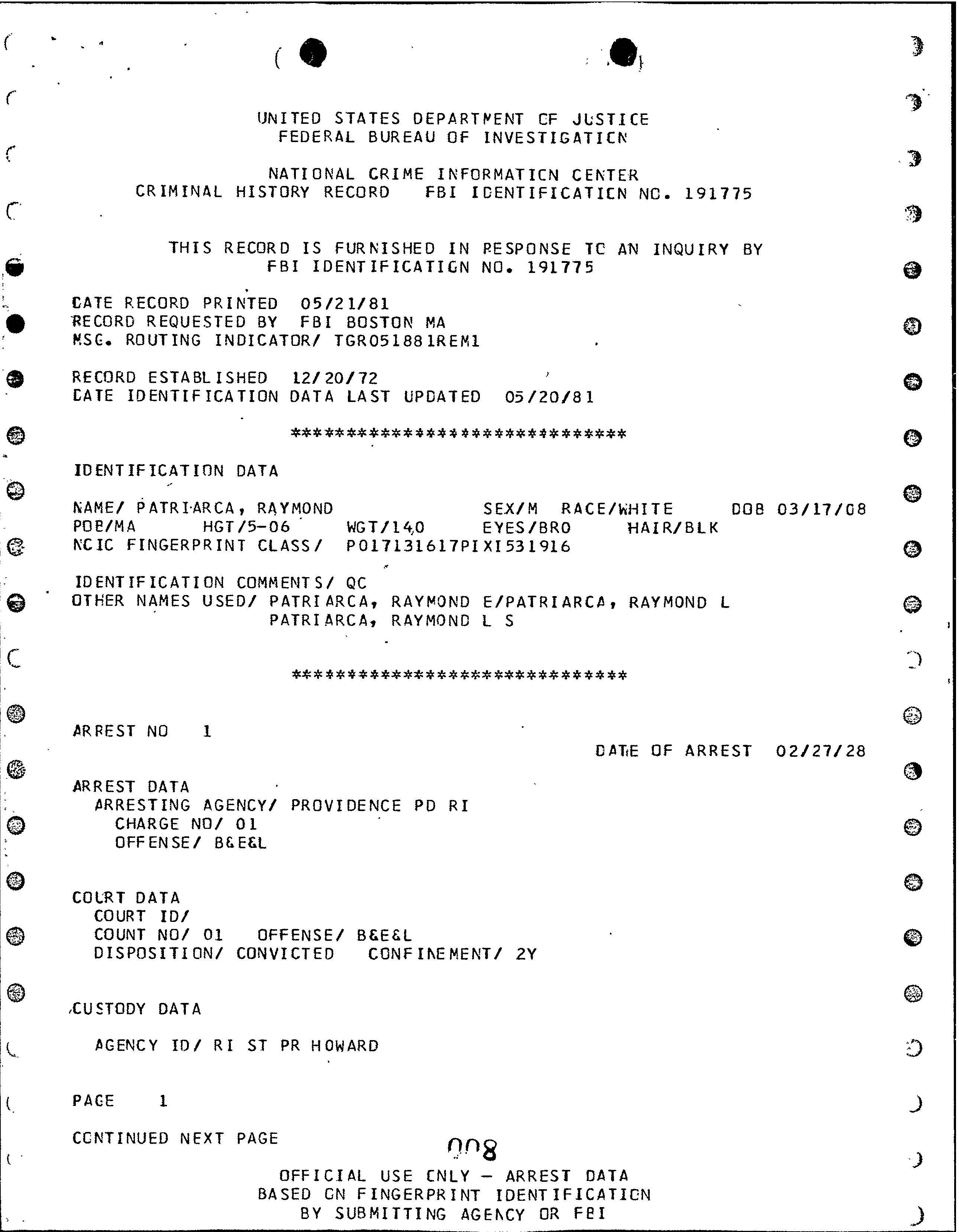 PAGE 78 to 84 Raymond Patriarca’s Criminal Record