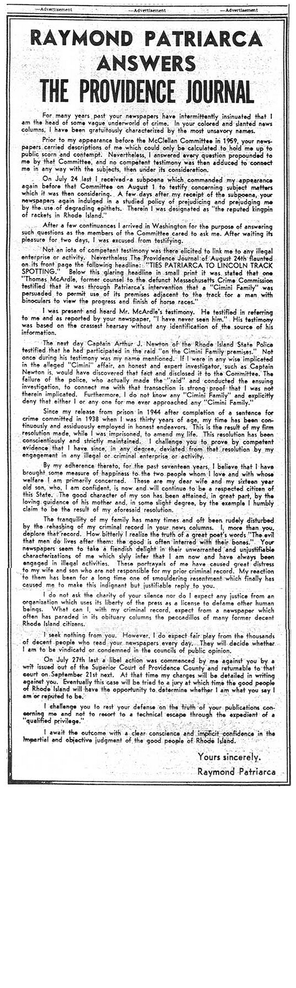 The FBI review the ad that Patriarca took out in the Providence Journal criticizing the newspaper. (see below)