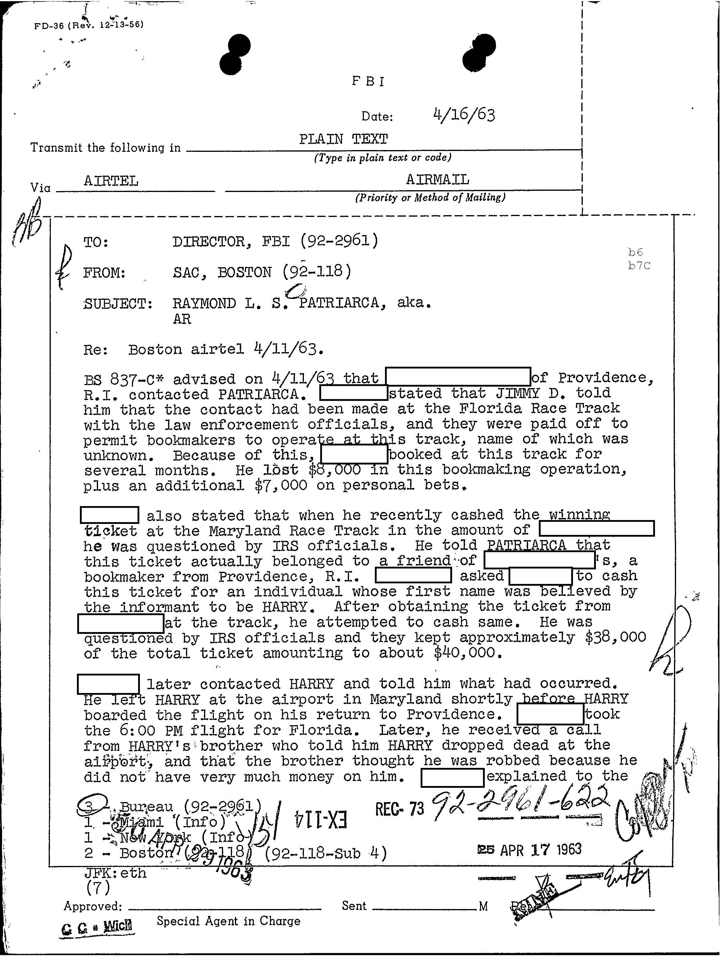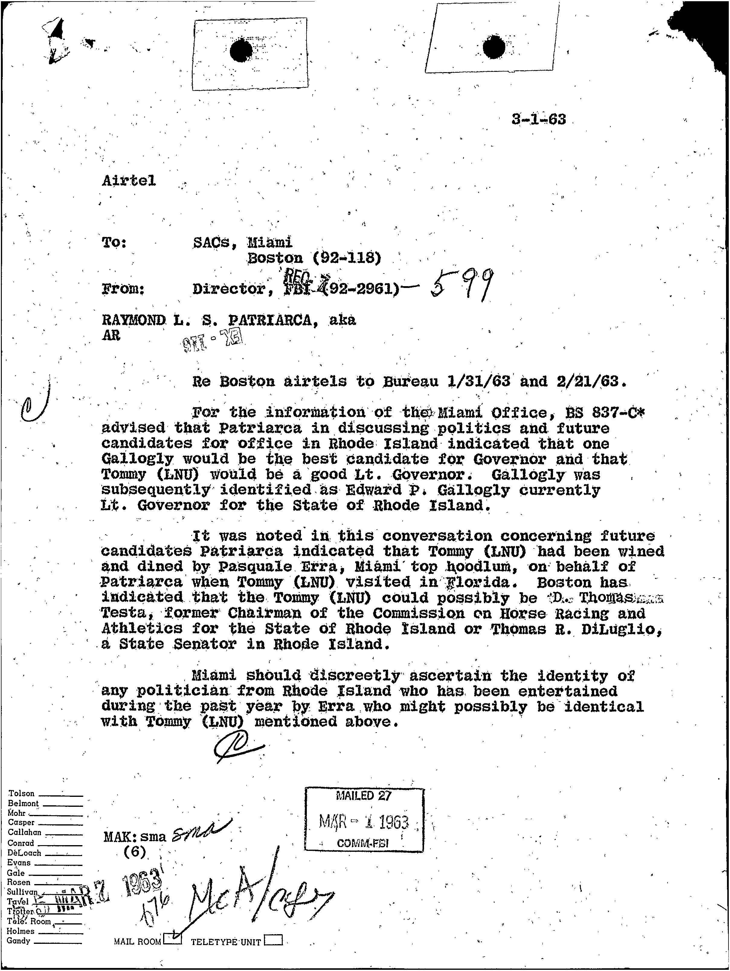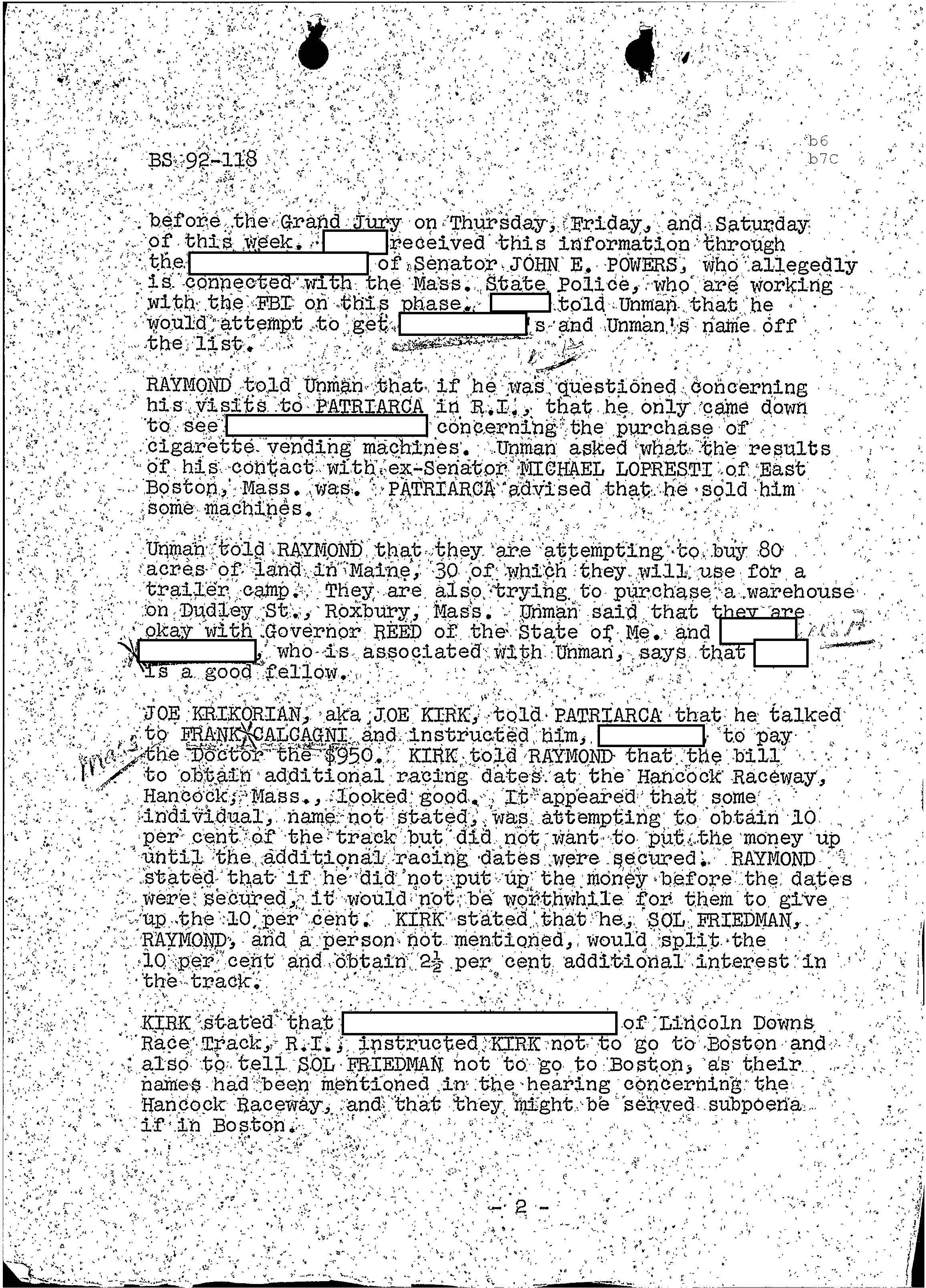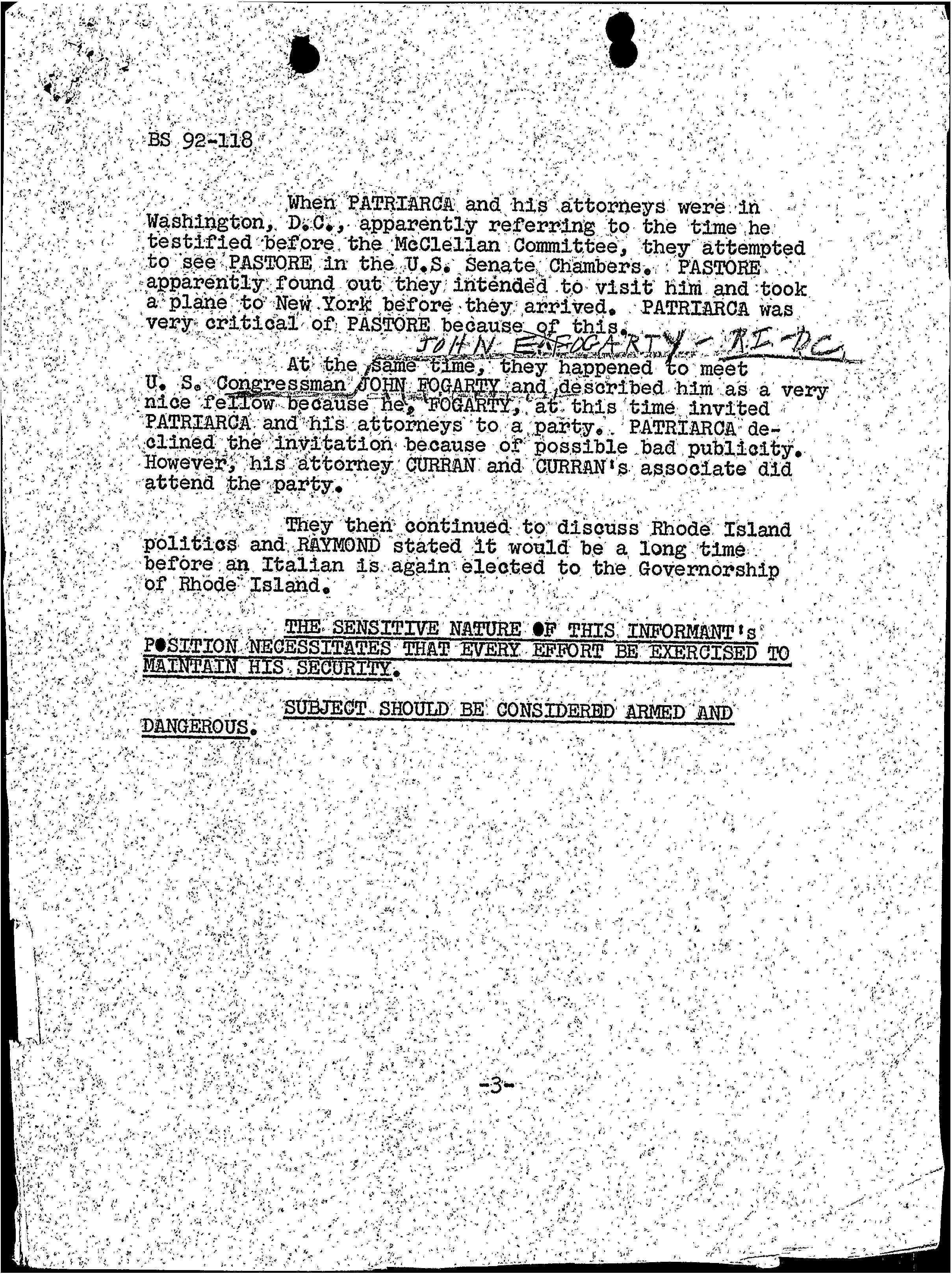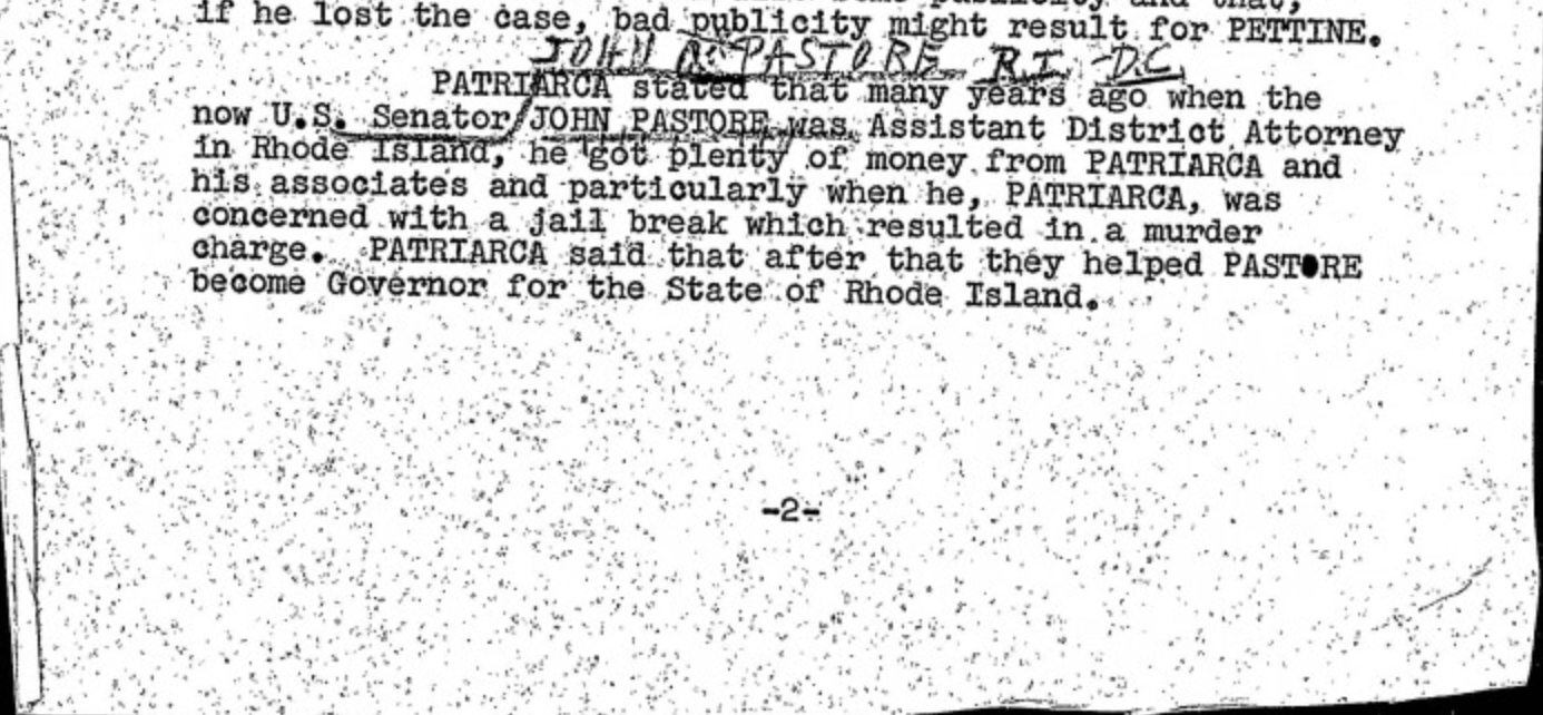 “PATRIARCA stated that many years ago when the now U.S. Senator JOHN PASTORE was Assistant District Attorney in Rhode Island, he got plenty of money from PATRIARCA and his associates and particularly when he, PATRIARCA was concerned with a jail break which resulted in a murder charge. PATRIARCA said that after that they helped PASTORE become Governor for the State of Rhode Island.”
