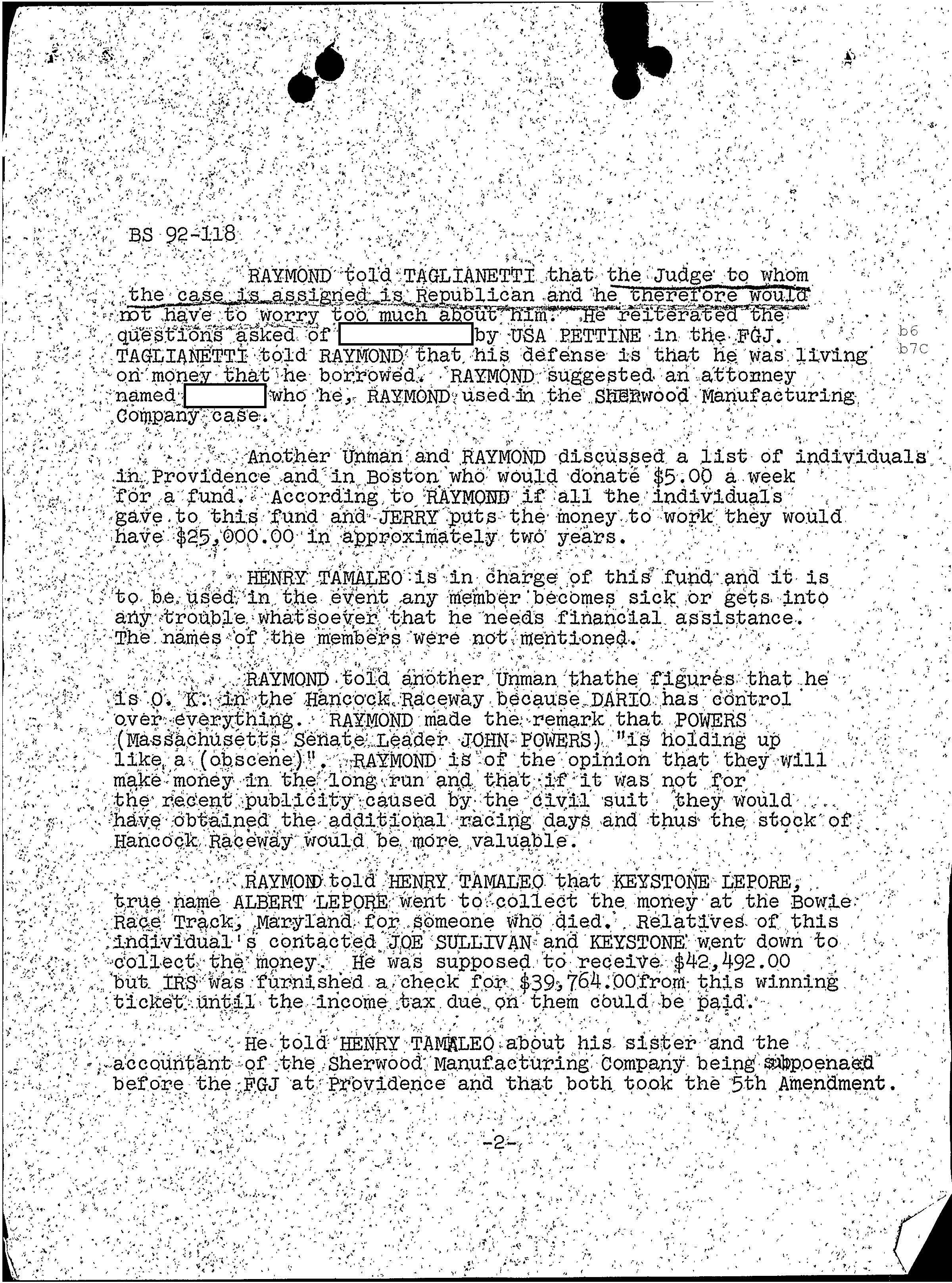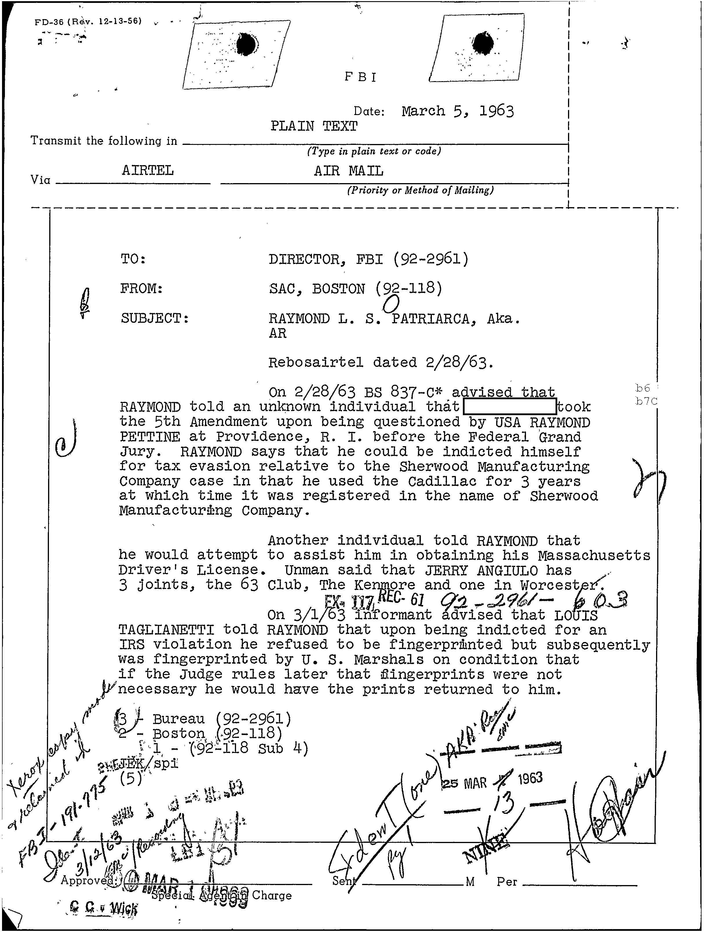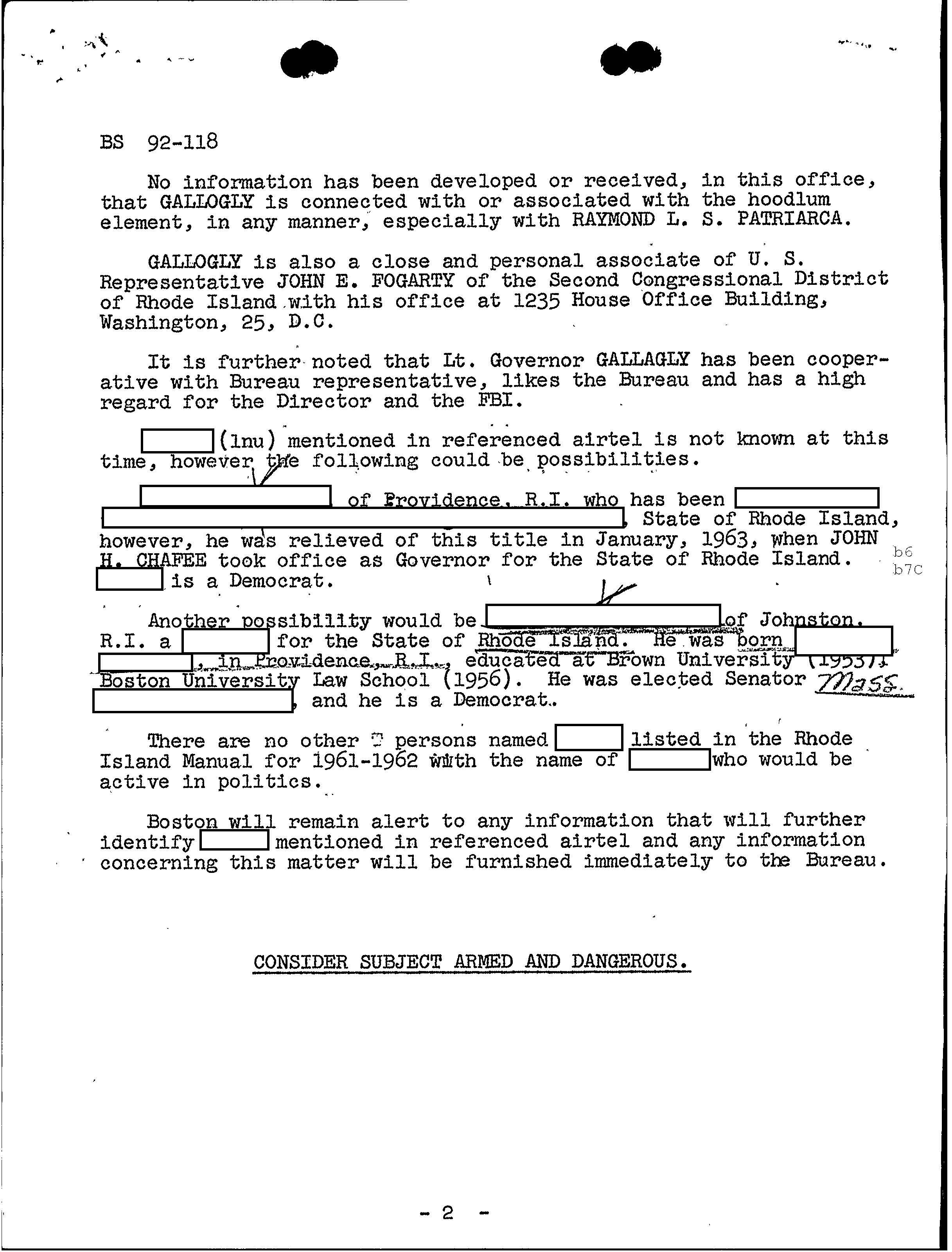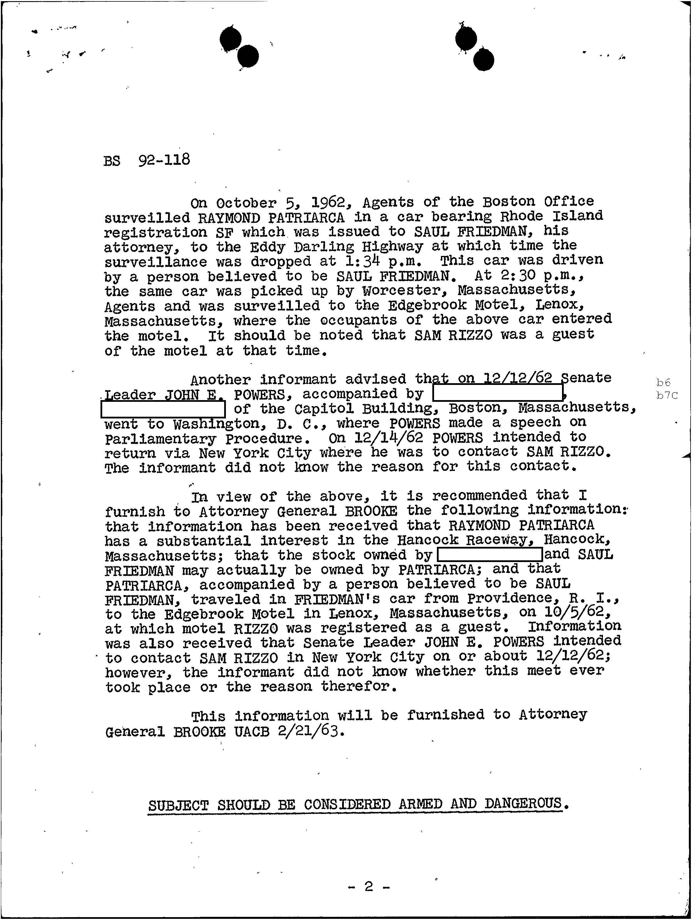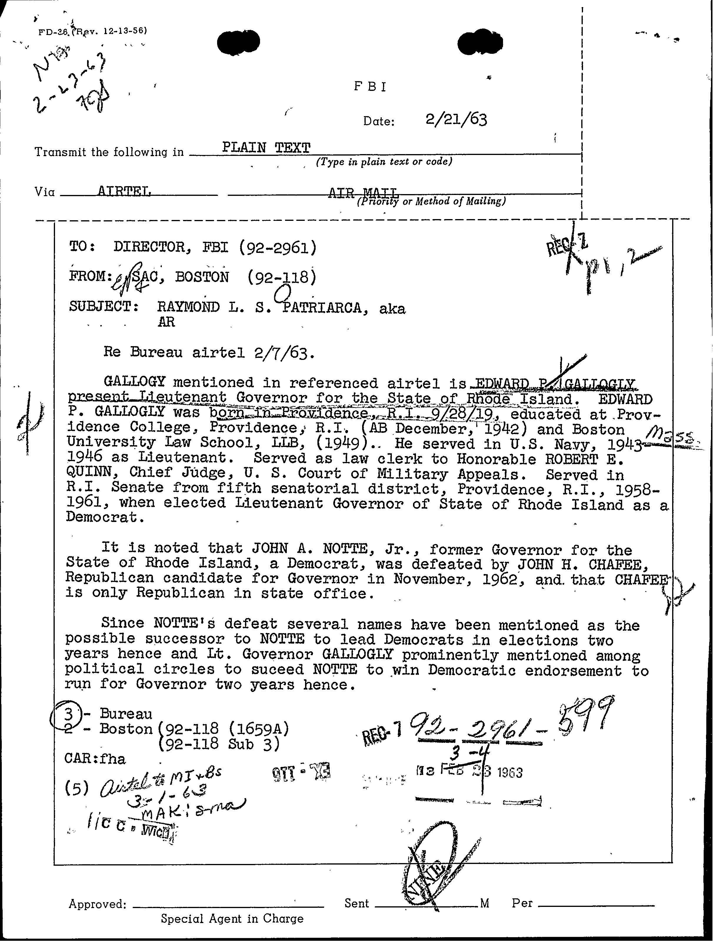 “PATRIARCA stated that many years ago when the now U.S. Senator JOHN PASTORE was Assistant District Attorney in Rhode Island, he got plenty of money from PATRIARCA and his associates and particularly when he, PATRIARCA was concerned with a jail break which resulted in a murder charge. PATRIARCA said that after that they helped PASTORE become Governor for the State of Rhode Island.”