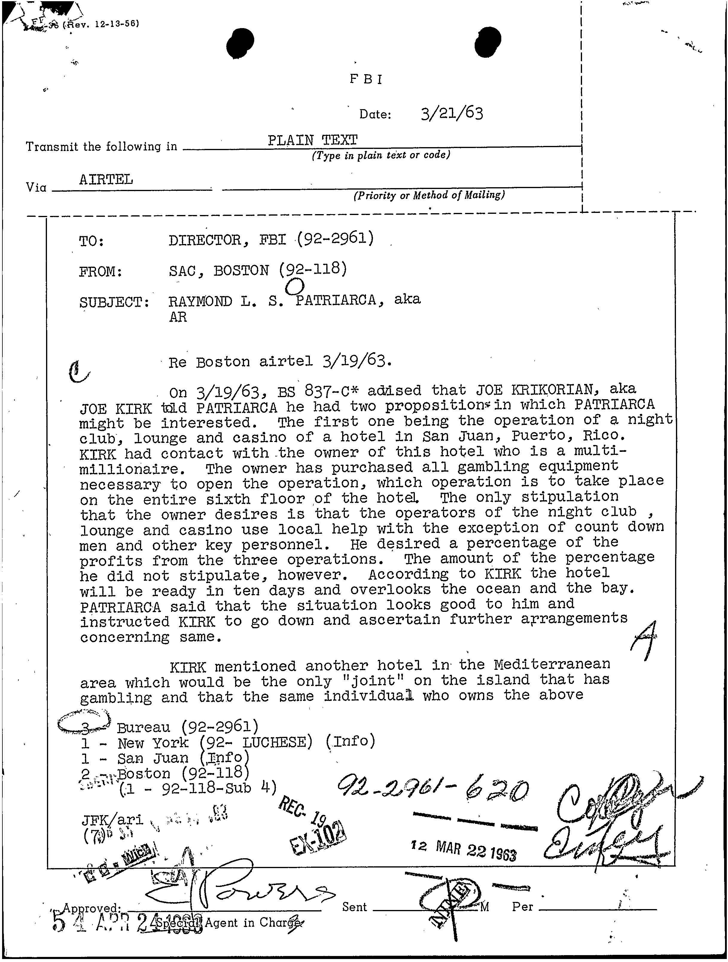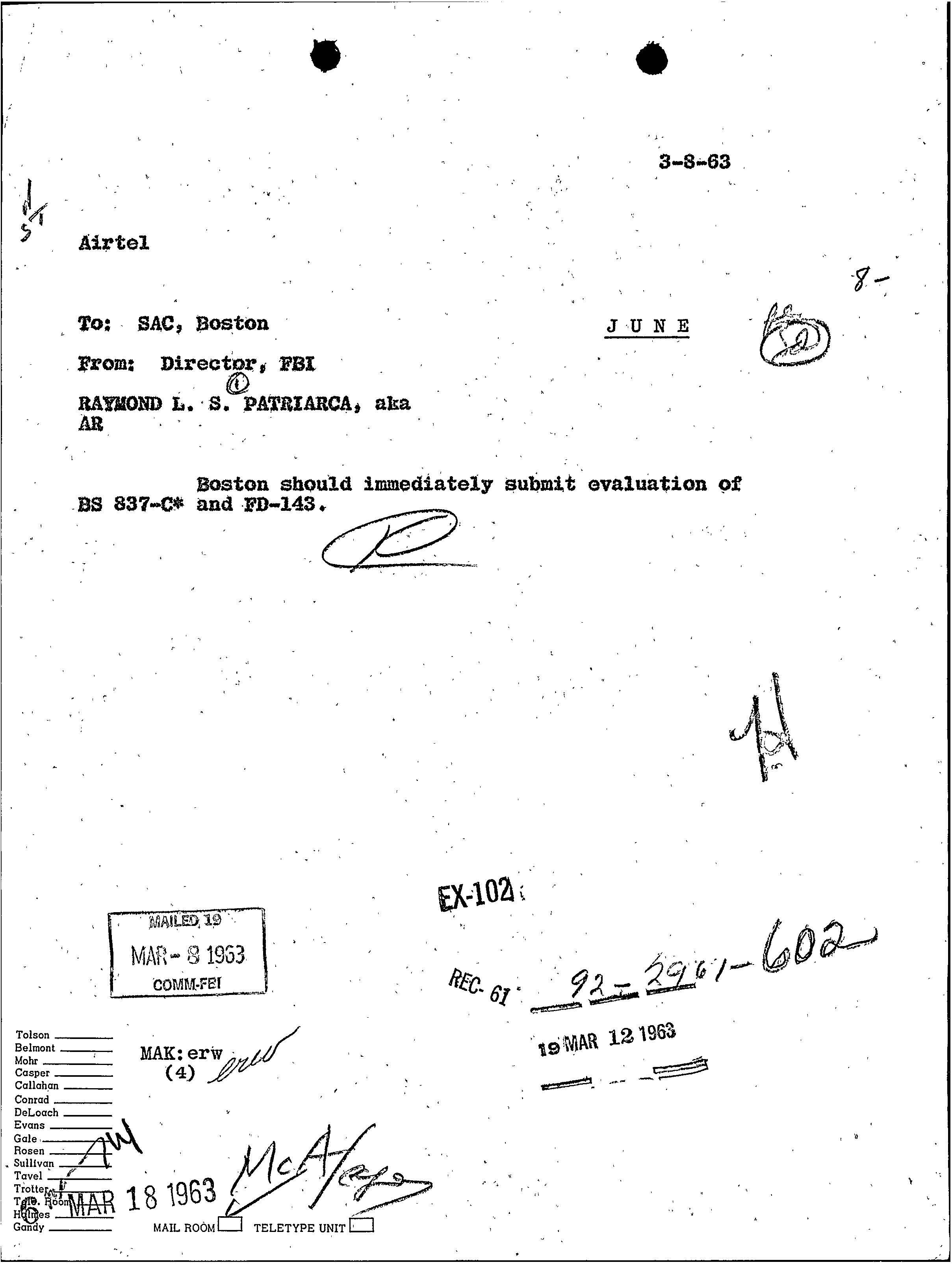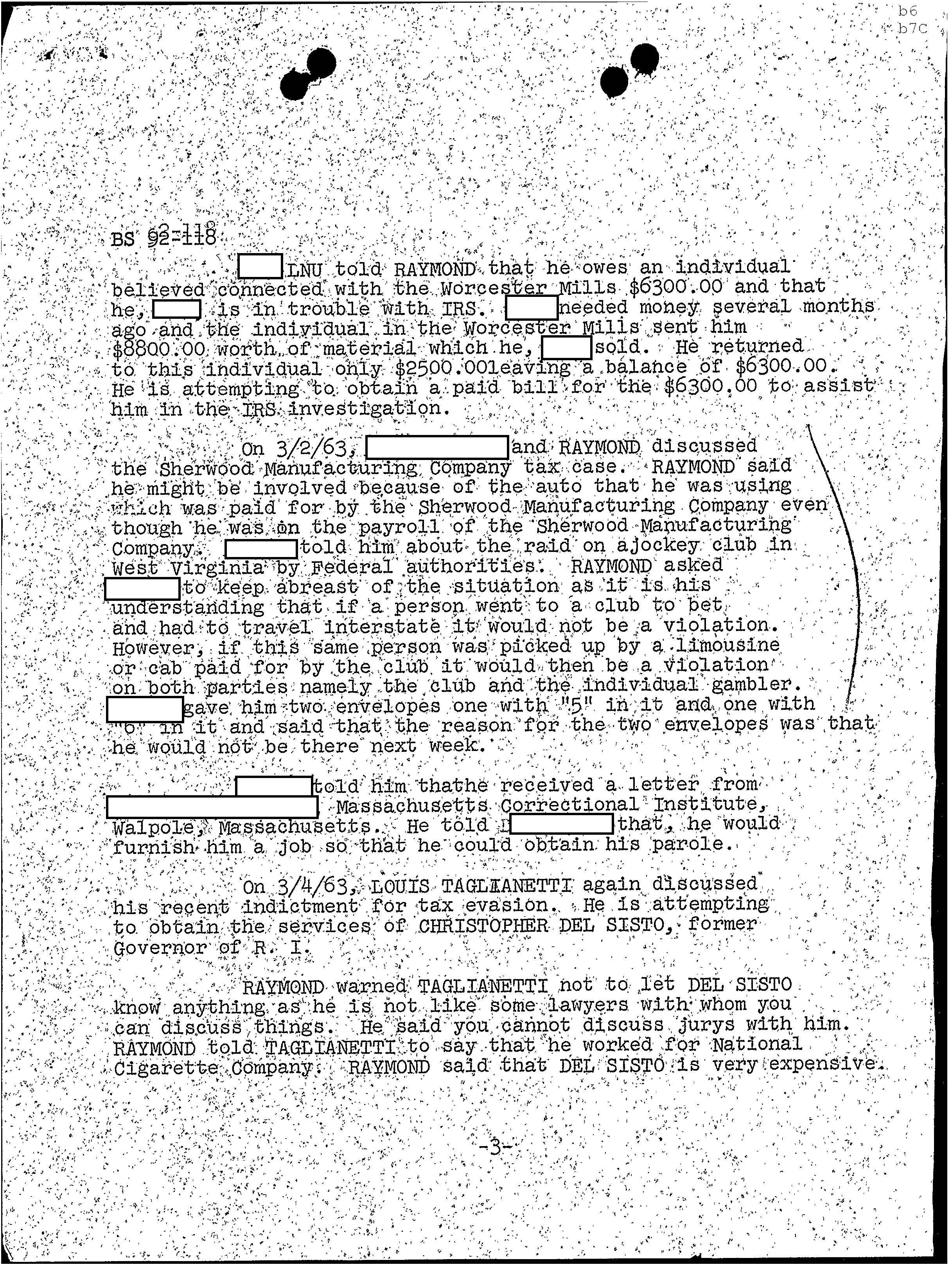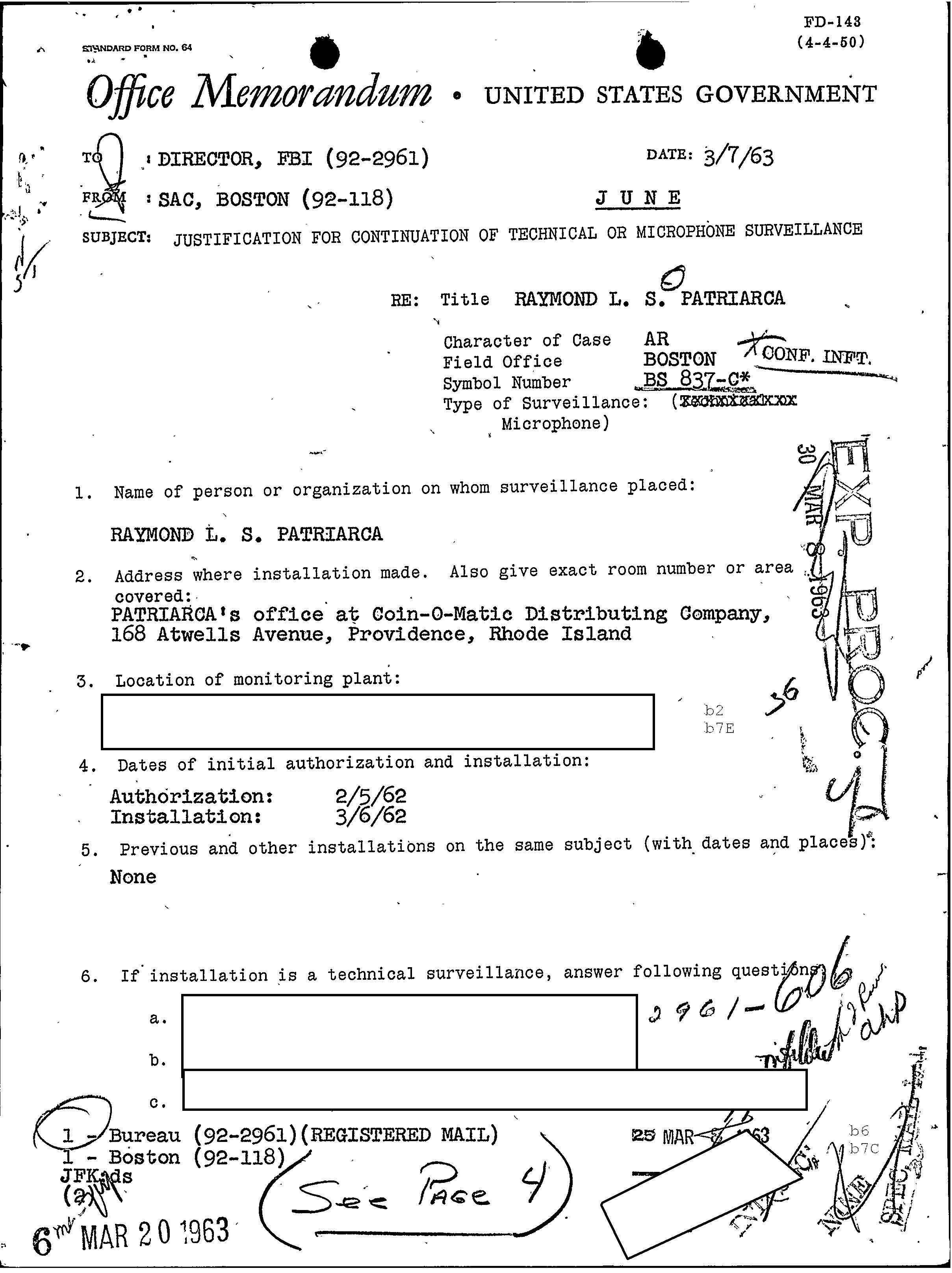 “PATRIARCA stated that many years ago when the now U.S. Senator JOHN PASTORE was Assistant District Attorney in Rhode Island, he got plenty of money from PATRIARCA and his associates and particularly when he, PATRIARCA was concerned with a jail break which resulted in a murder charge. PATRIARCA said that after that they helped PASTORE become Governor for the State of Rhode Island.”