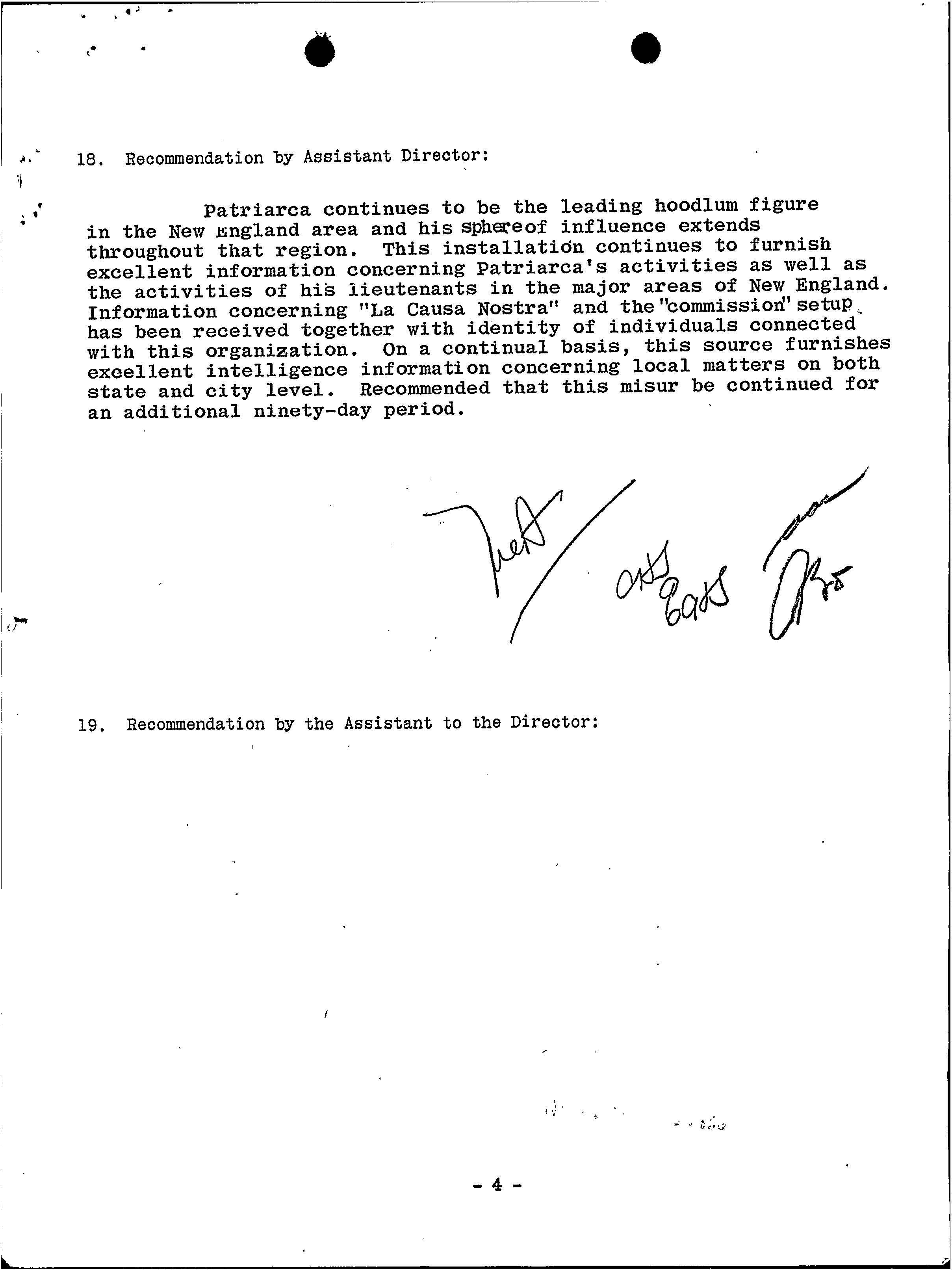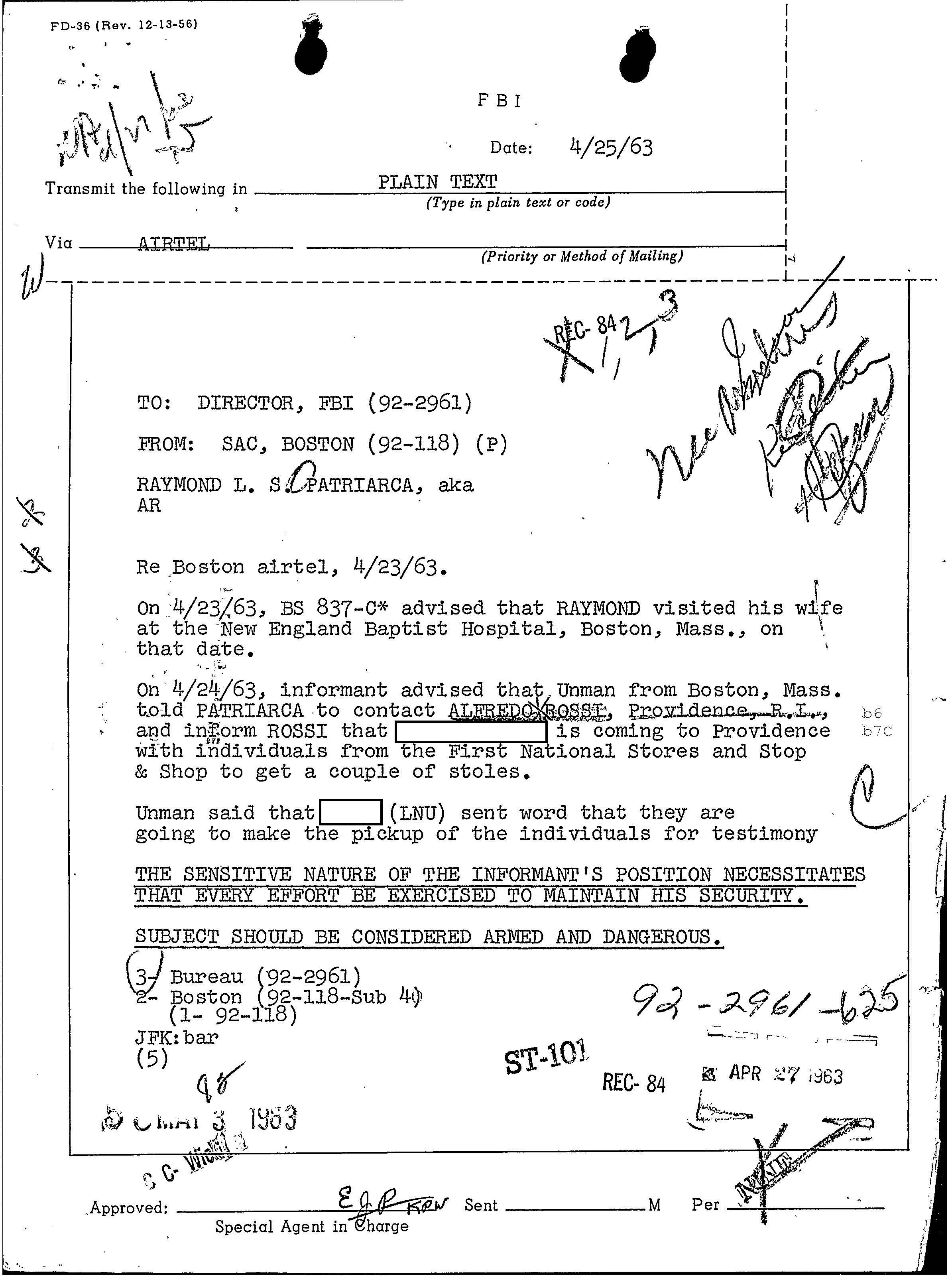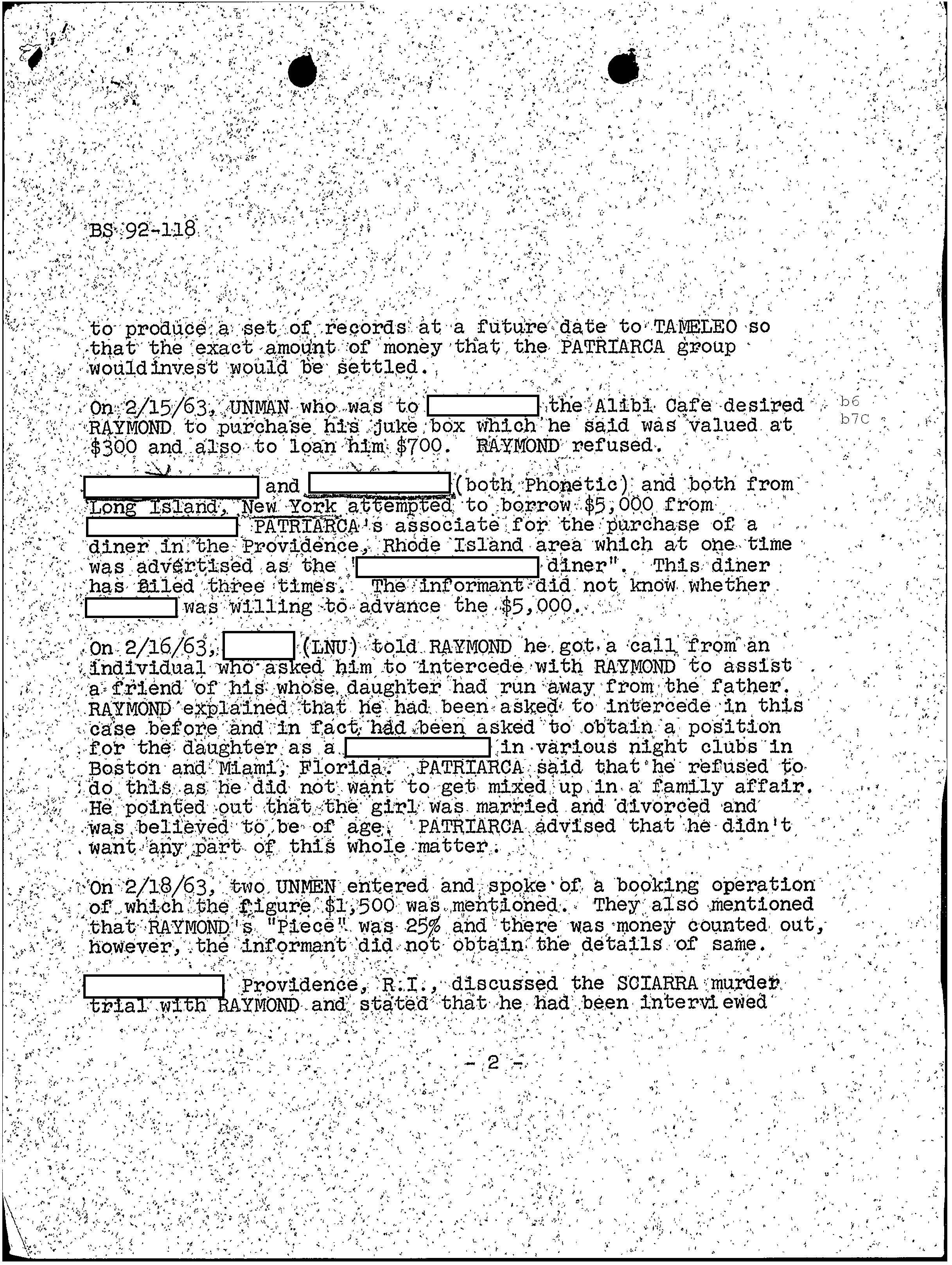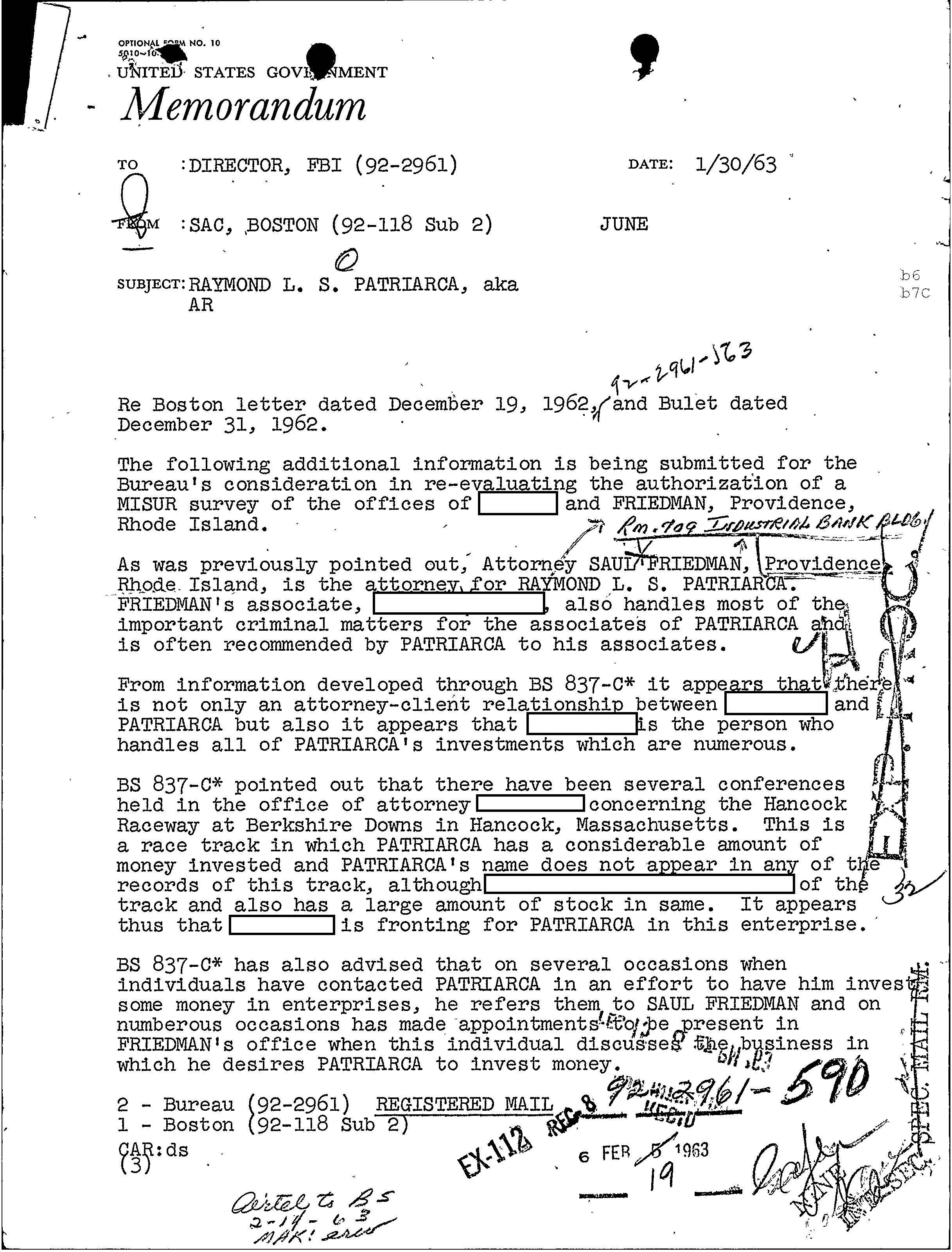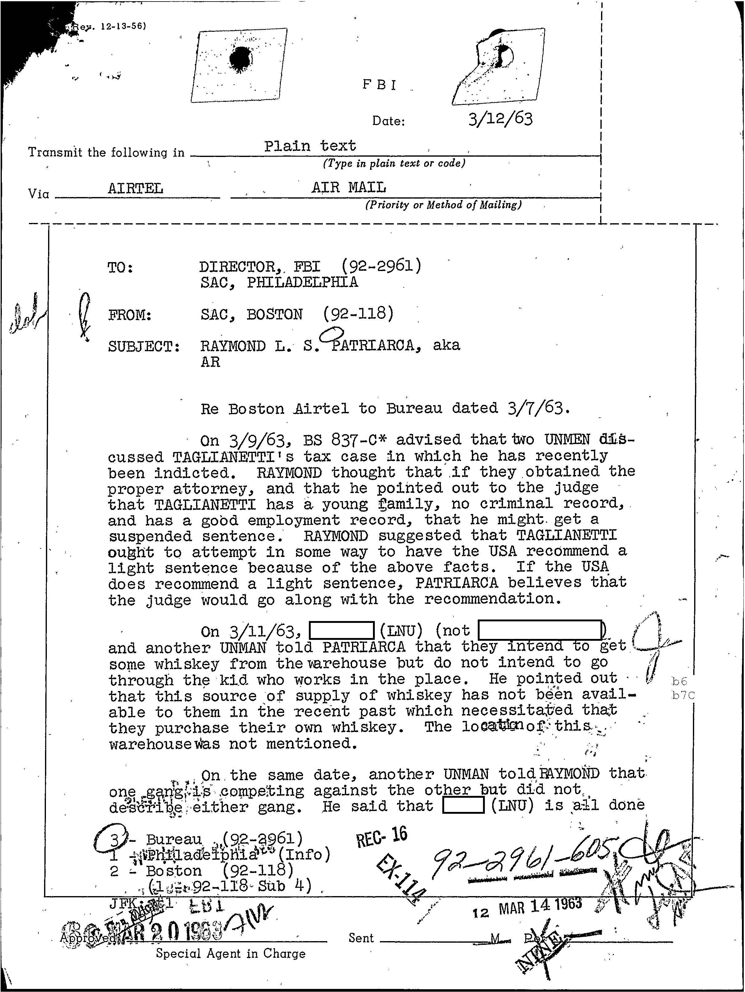 “PATRIARCA stated that many years ago when the now U.S. Senator JOHN PASTORE was Assistant District Attorney in Rhode Island, he got plenty of money from PATRIARCA and his associates and particularly when he, PATRIARCA was concerned with a jail break which resulted in a murder charge. PATRIARCA said that after that they helped PASTORE become Governor for the State of Rhode Island.”