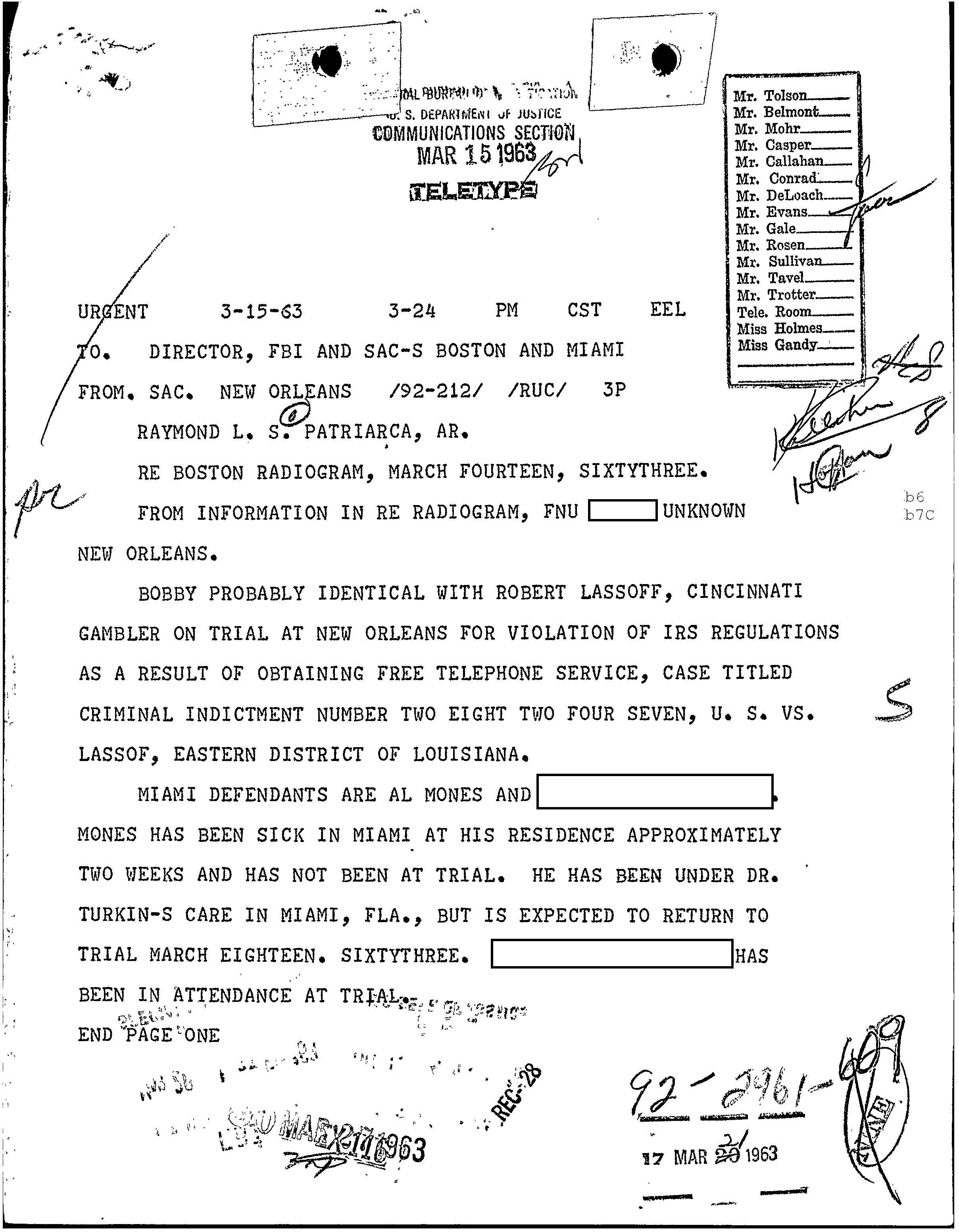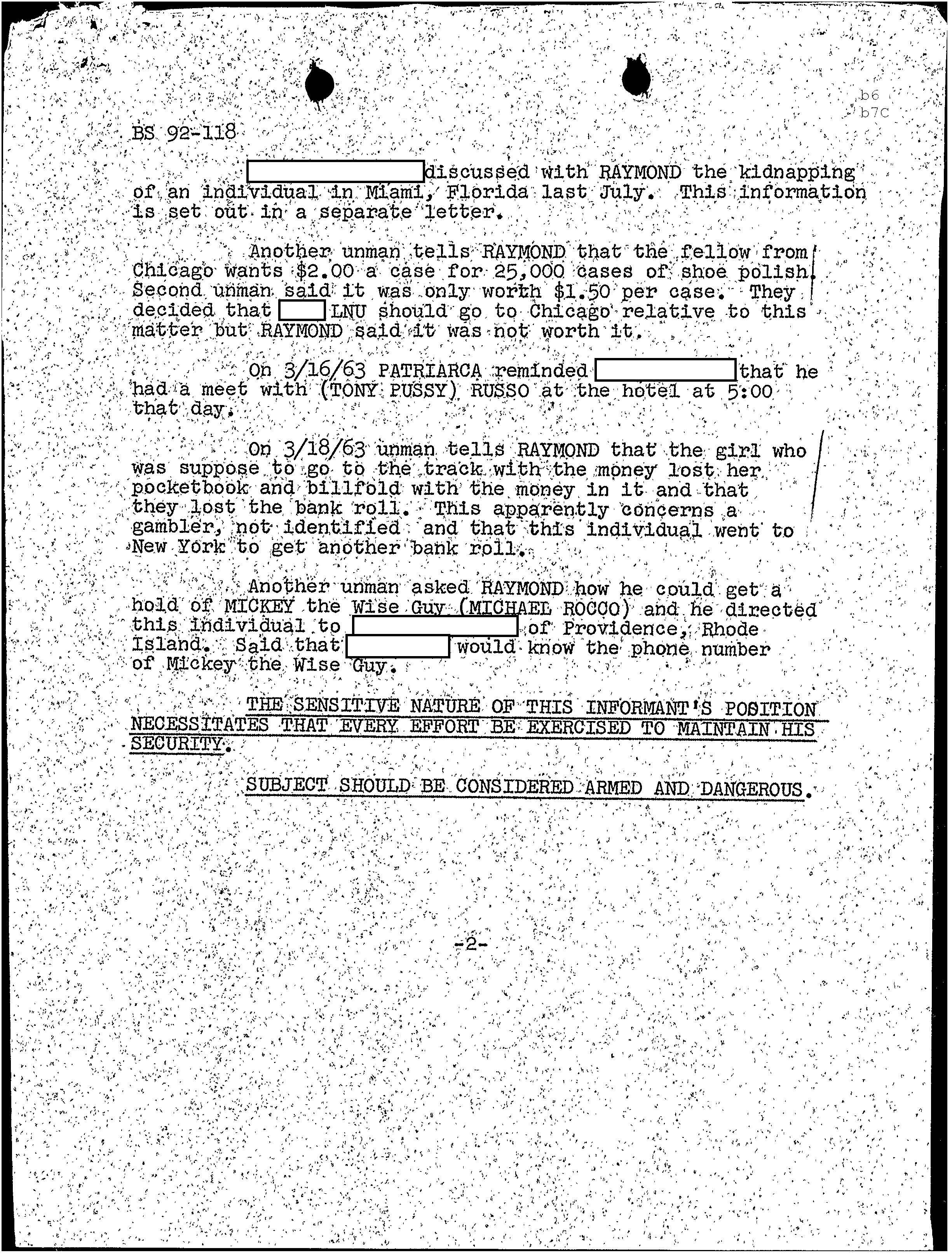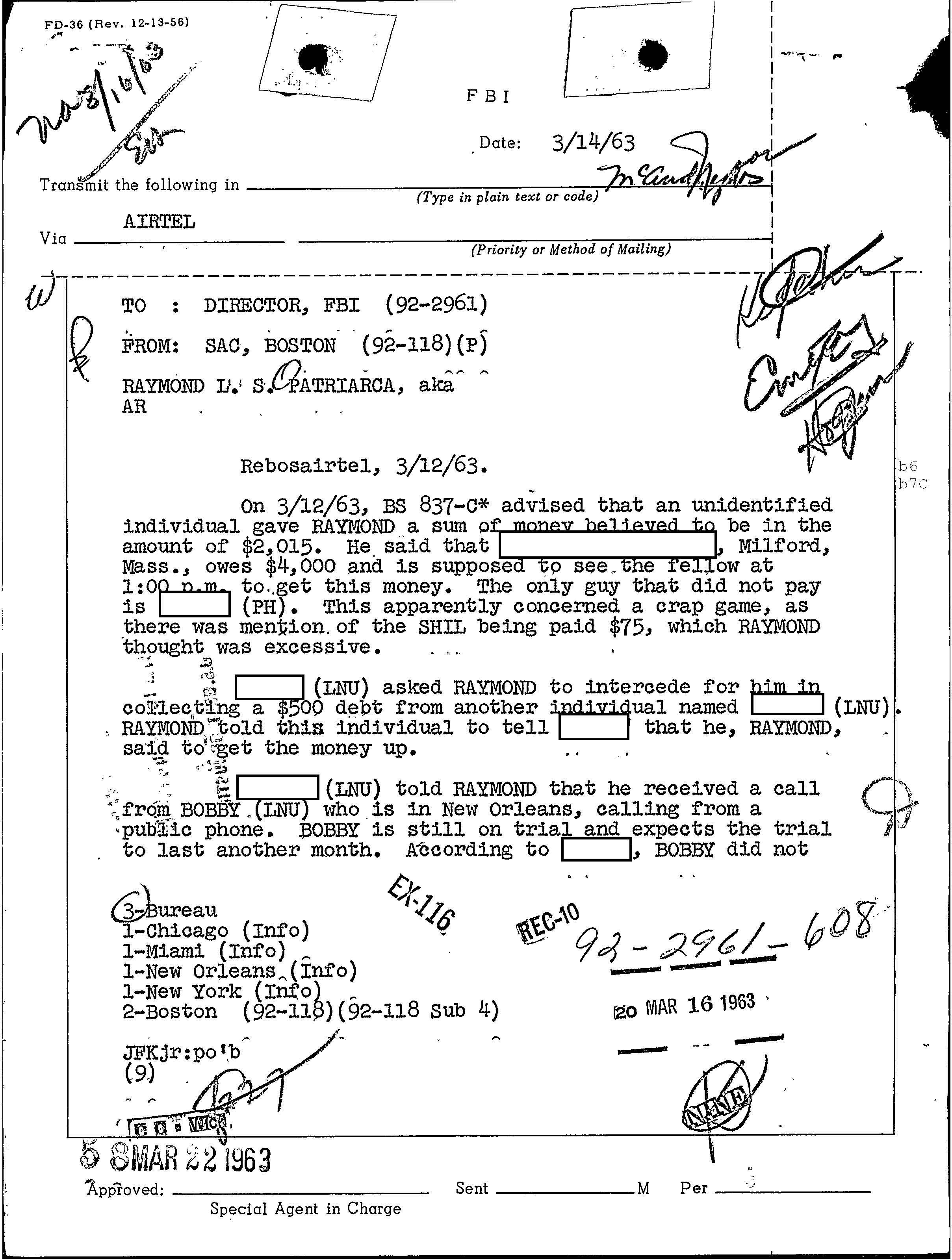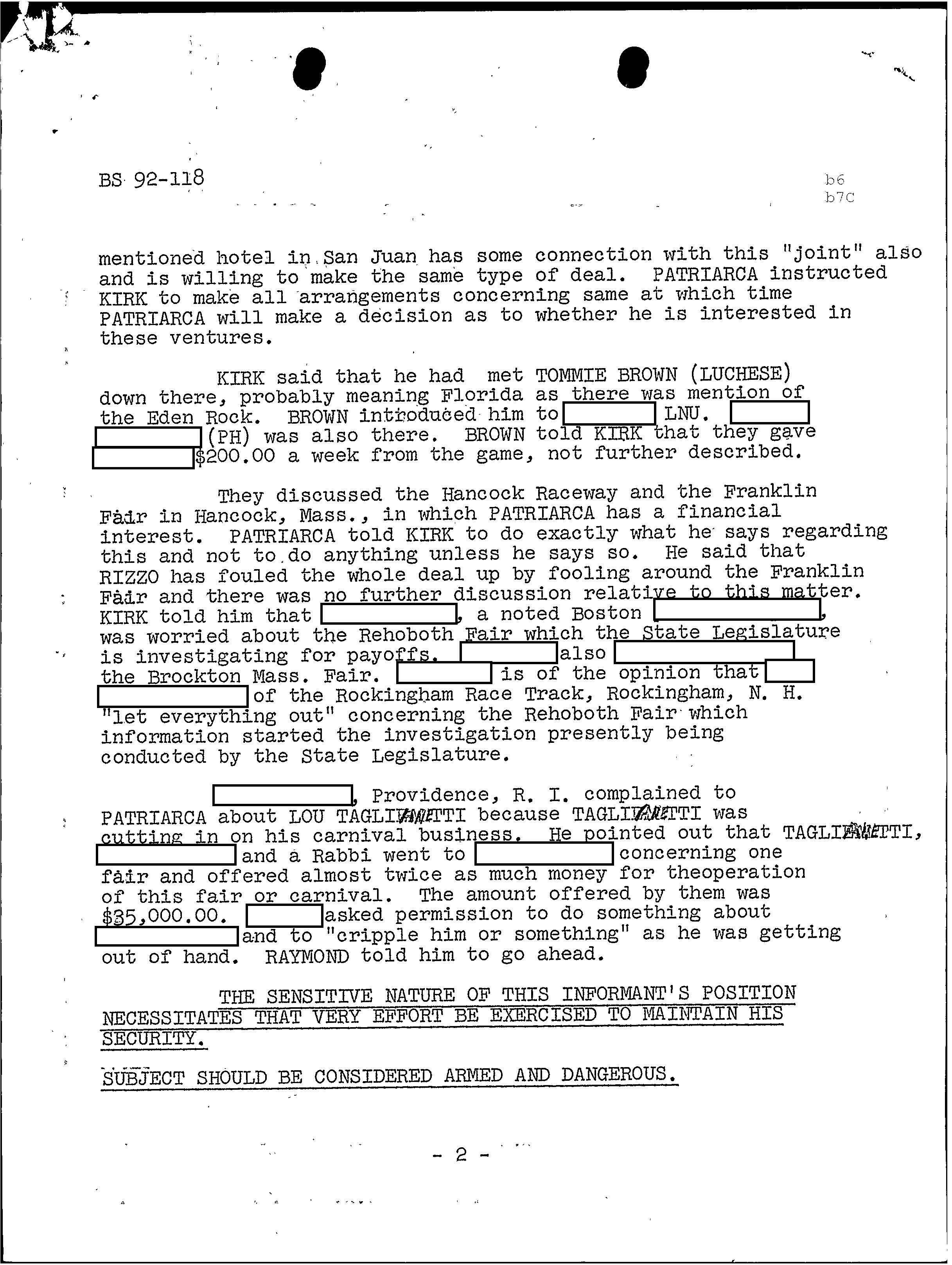“PATRIARCA stated that many years ago when the now U.S. Senator JOHN PASTORE was Assistant District Attorney in Rhode Island, he got plenty of money from PATRIARCA and his associates and particularly when he, PATRIARCA was concerned with a jail break which resulted in a murder charge. PATRIARCA said that after that they helped PASTORE become Governor for the State of Rhode Island.”