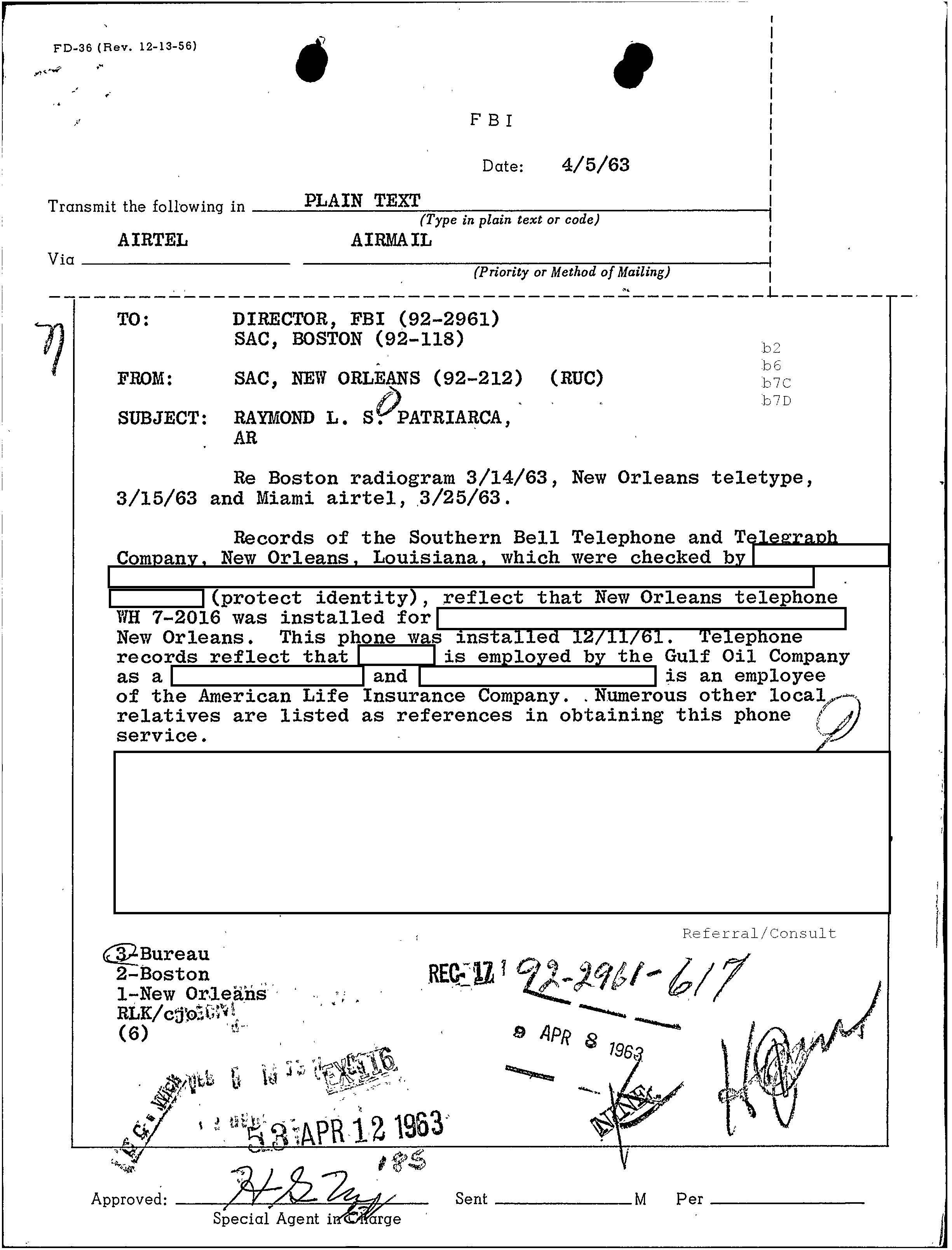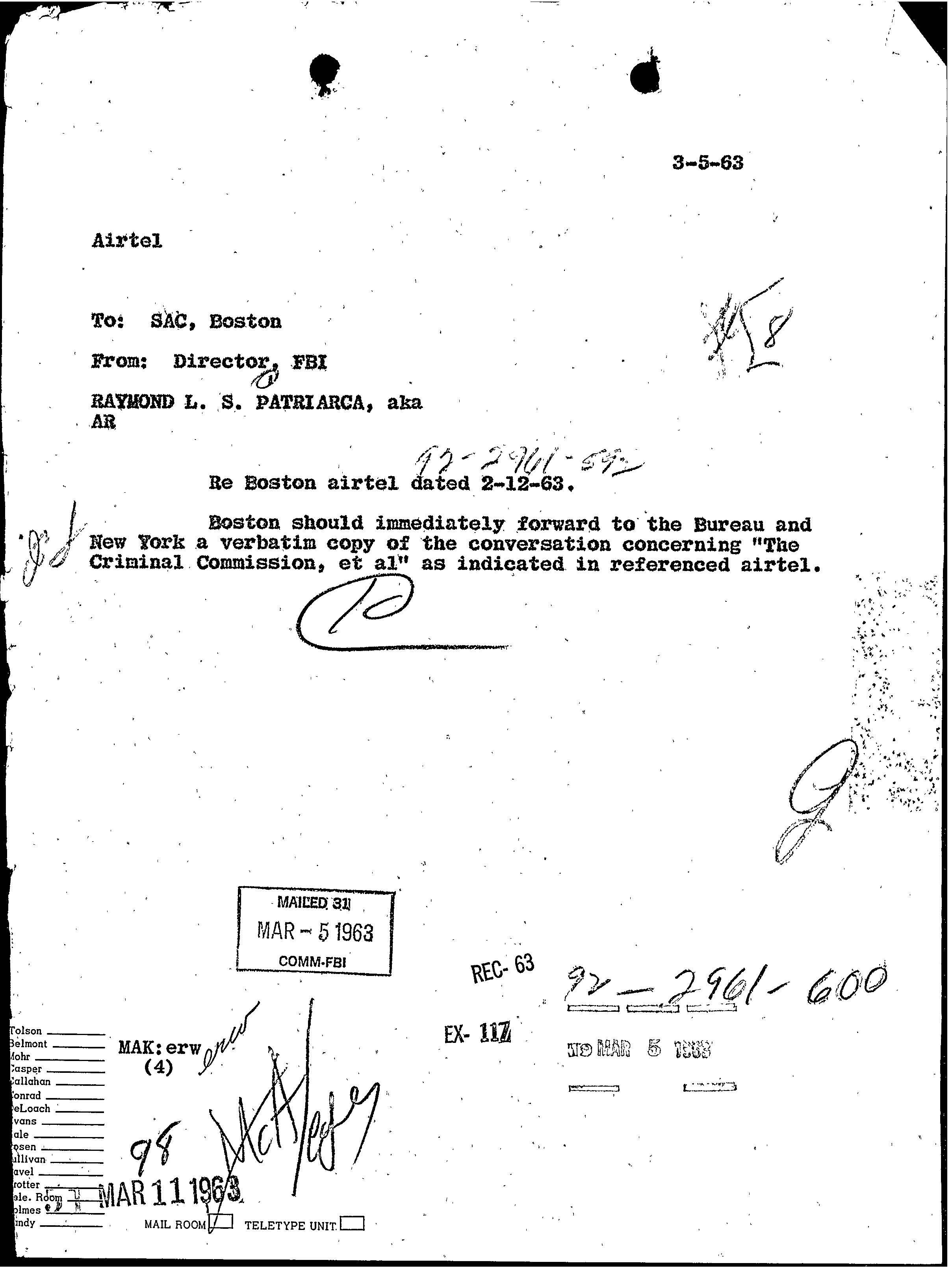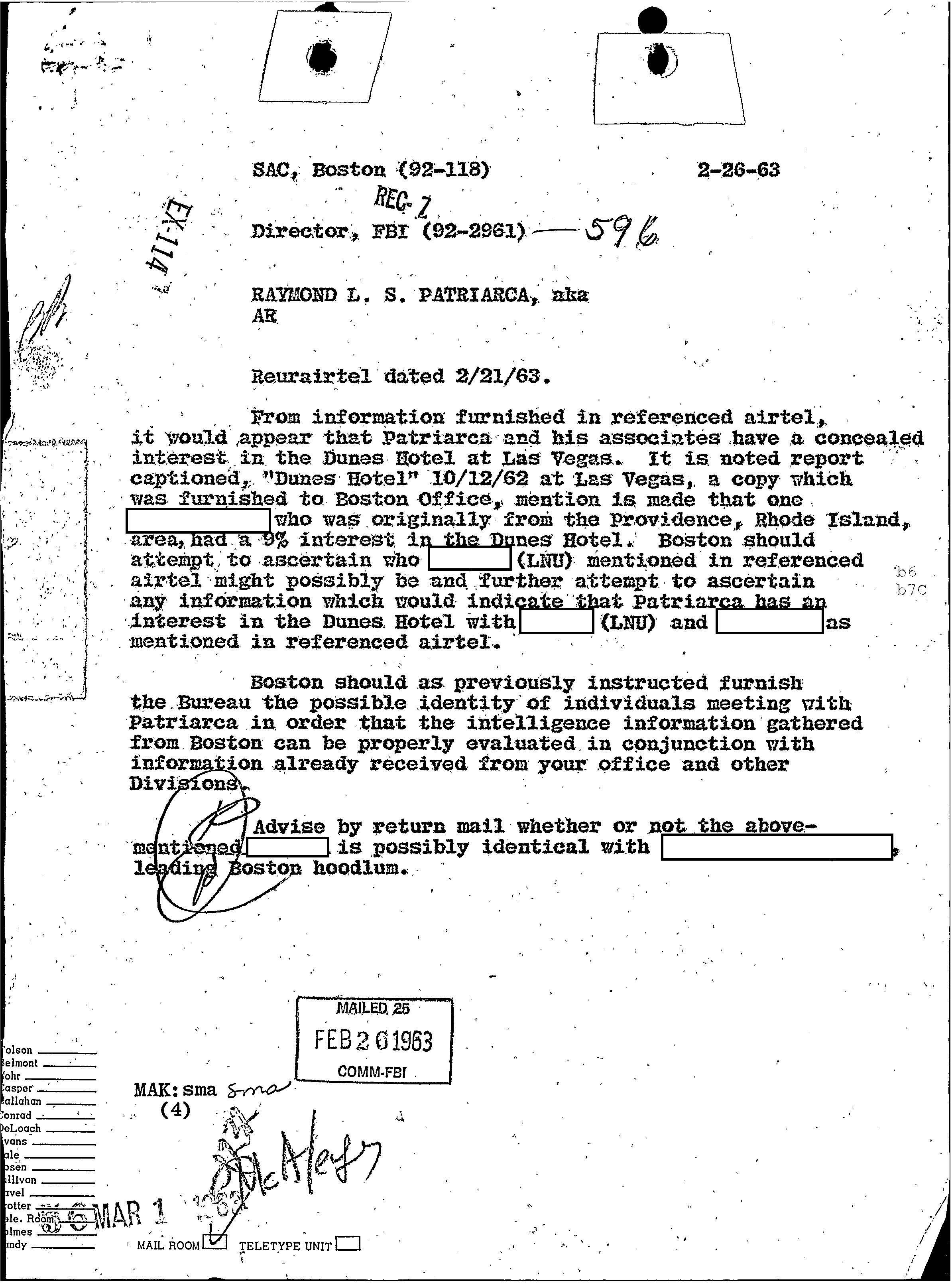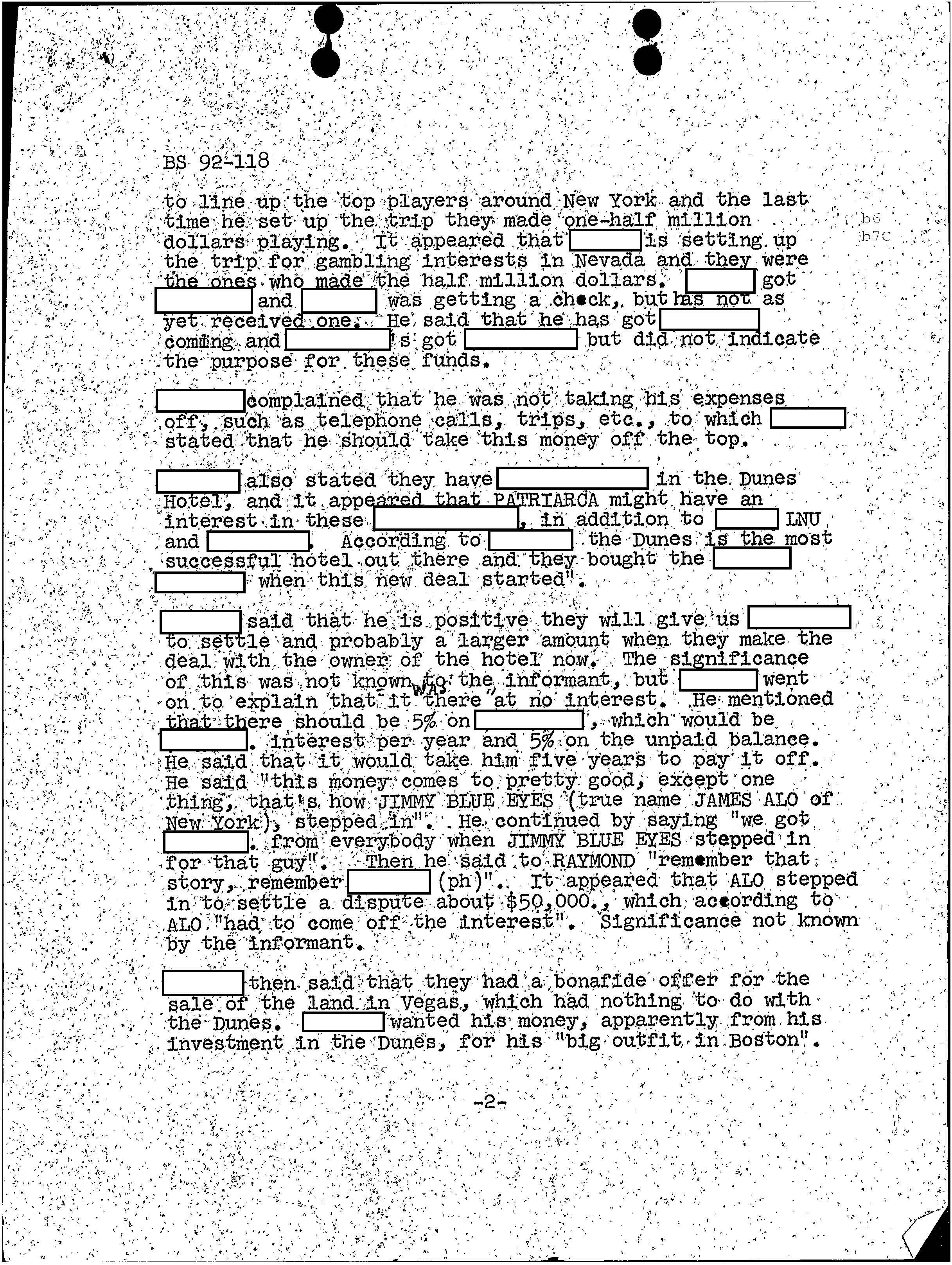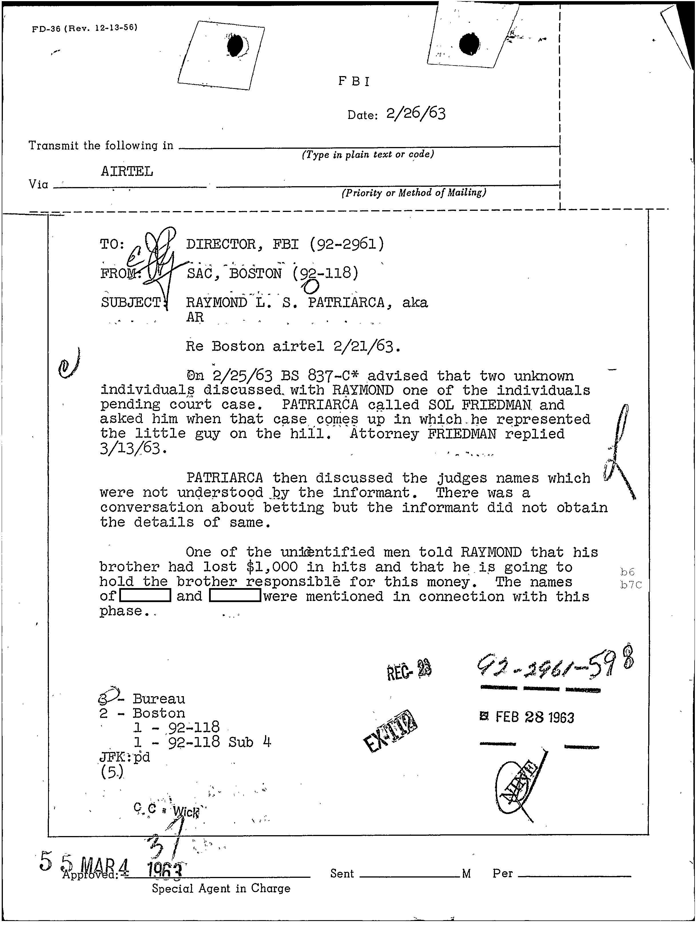 “PATRIARCA stated that many years ago when the now U.S. Senator JOHN PASTORE was Assistant District Attorney in Rhode Island, he got plenty of money from PATRIARCA and his associates and particularly when he, PATRIARCA was concerned with a jail break which resulted in a murder charge. PATRIARCA said that after that they helped PASTORE become Governor for the State of Rhode Island.”